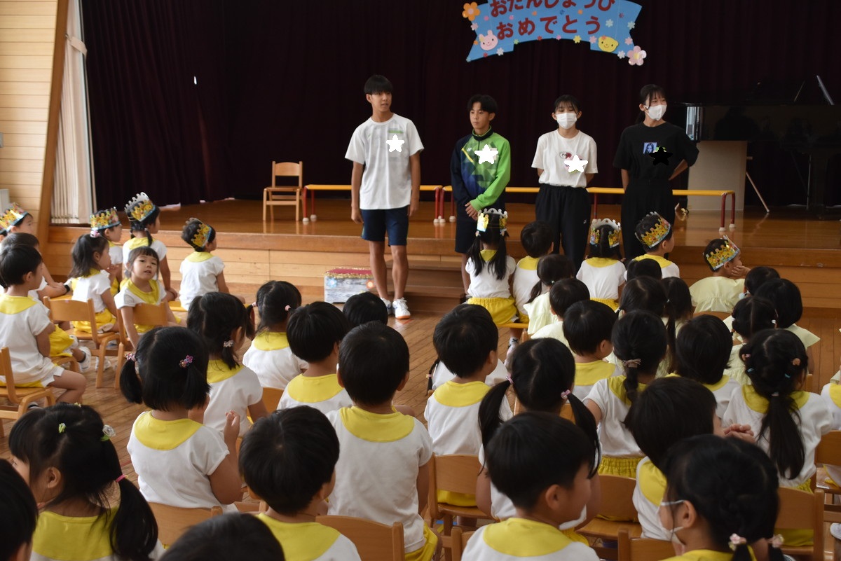 9月に入ってたくさんの学生さんが来ていました。毎年9月は実習生や職場体験の学生さんのラッシュの時期。あるクラスは大人の数がぐ~んと増えるのです。本日、誕生会の前に子どもたちの前で自己紹介をしていただきました。