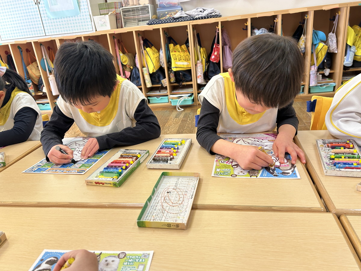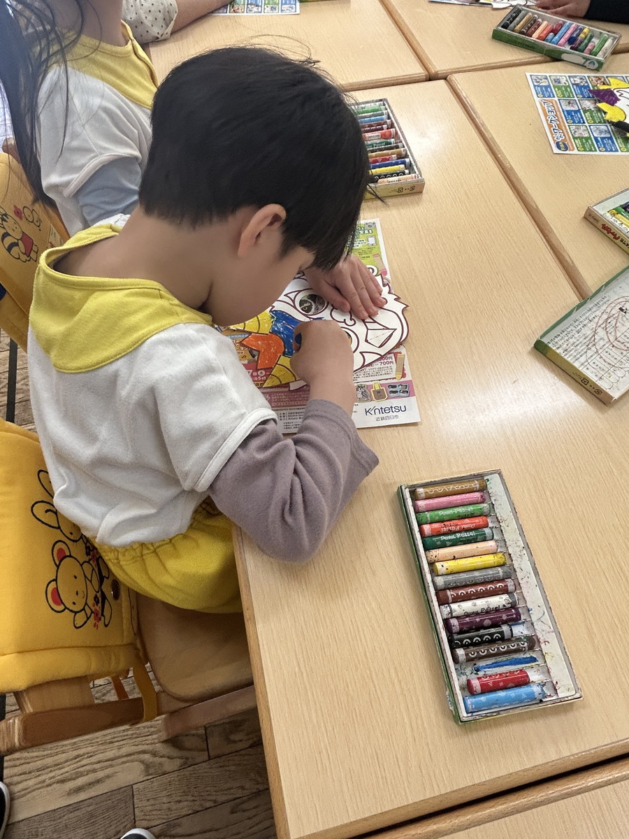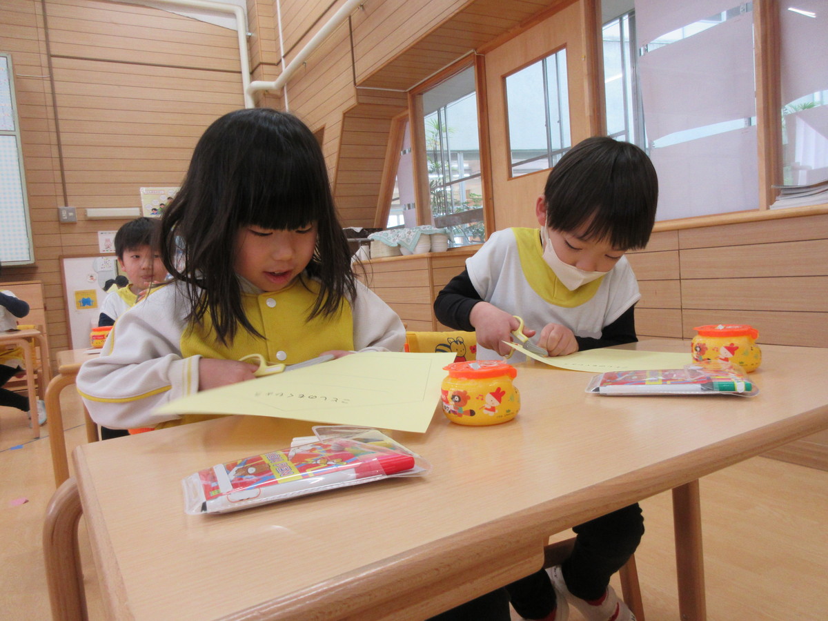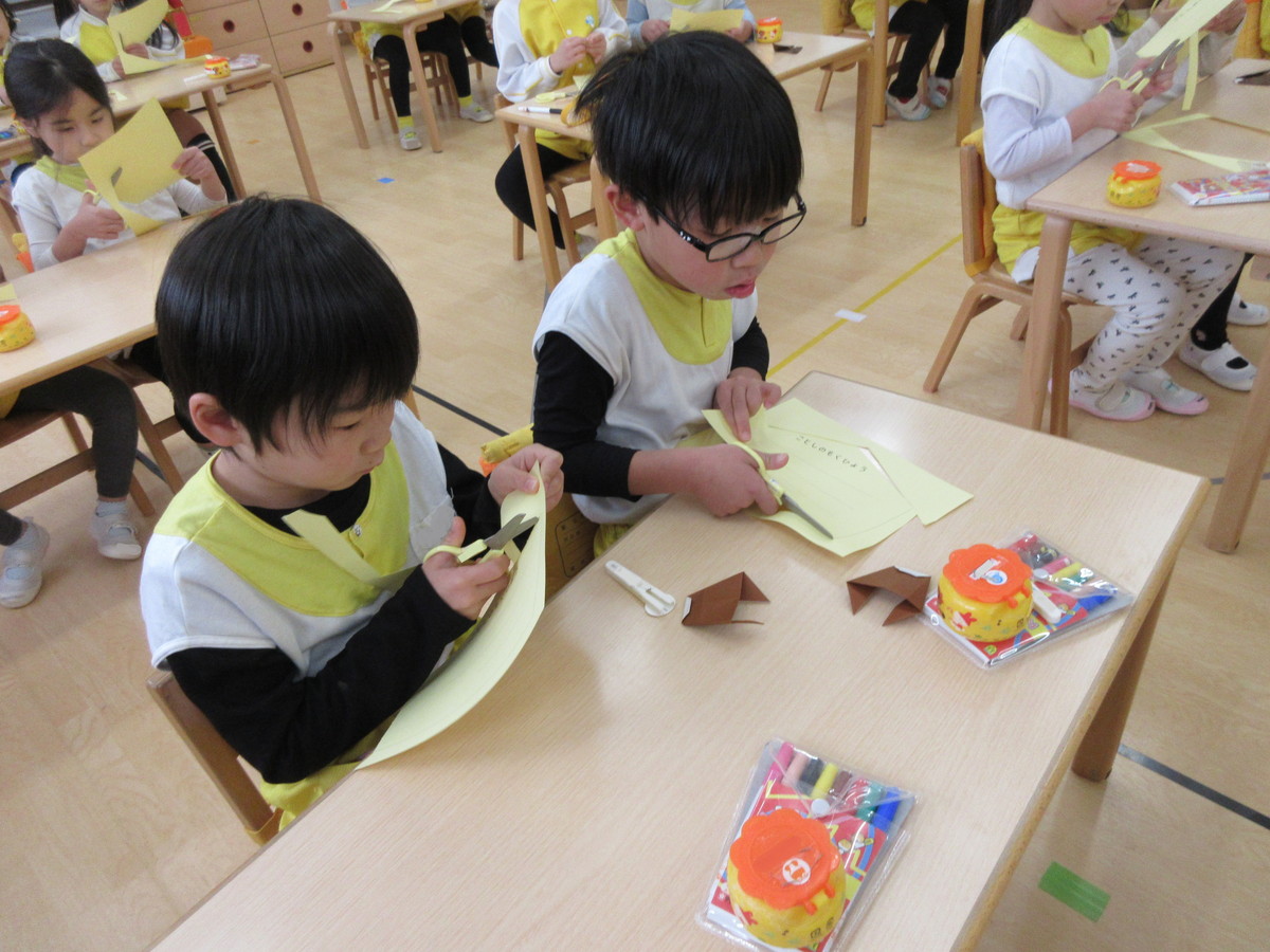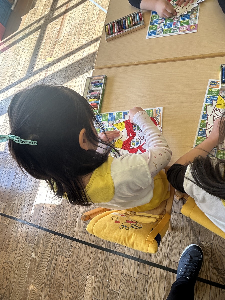 ふたつ目は、もうすぐやってくる「節分」に向けて、「鬼のお面」を作りましたよ。月刊絵本の付録から、丁寧に切り取りパスでしっかりと色を塗りこんで完成させました。「鬼が逃げていきそうな怖いのにする!」と、意気込んで色塗りをしましたが、隙間なくとても丁寧に色を塗る姿に成長を感じました。節分については、子どもたちと話をして「当日も心の中の鬼をやっつけよう!」と張り切っています。もちろん、「怖いなぁ…」と思っている子もいるはず。でも、みんなで力を合わせて頑張ろうね!