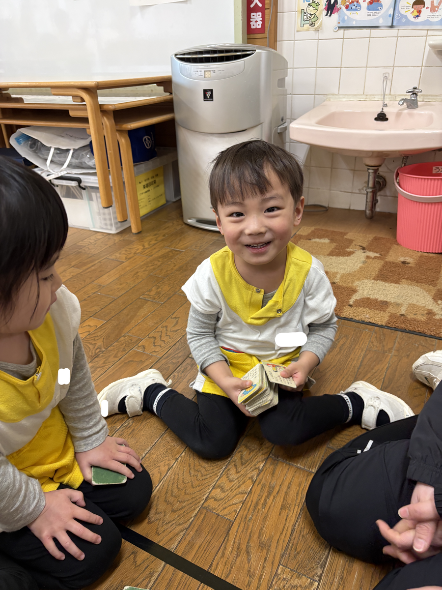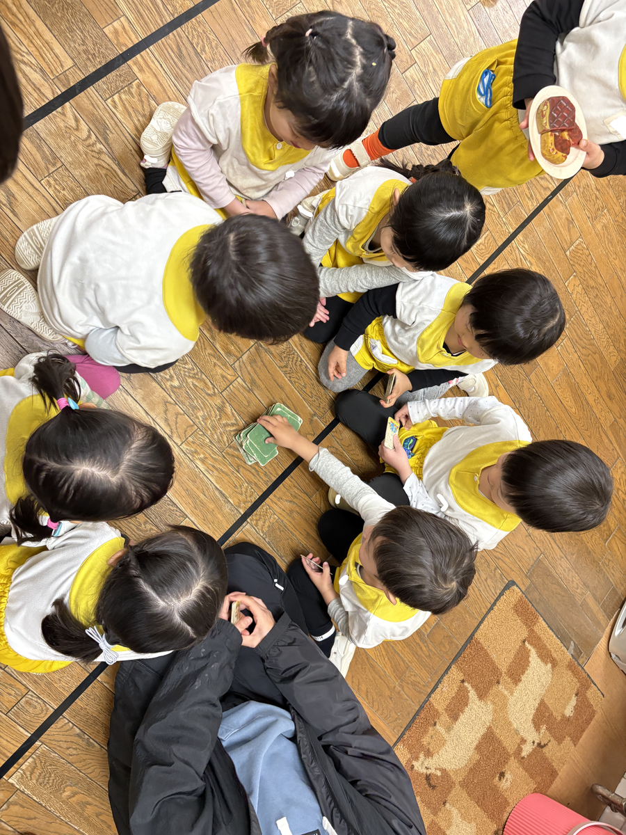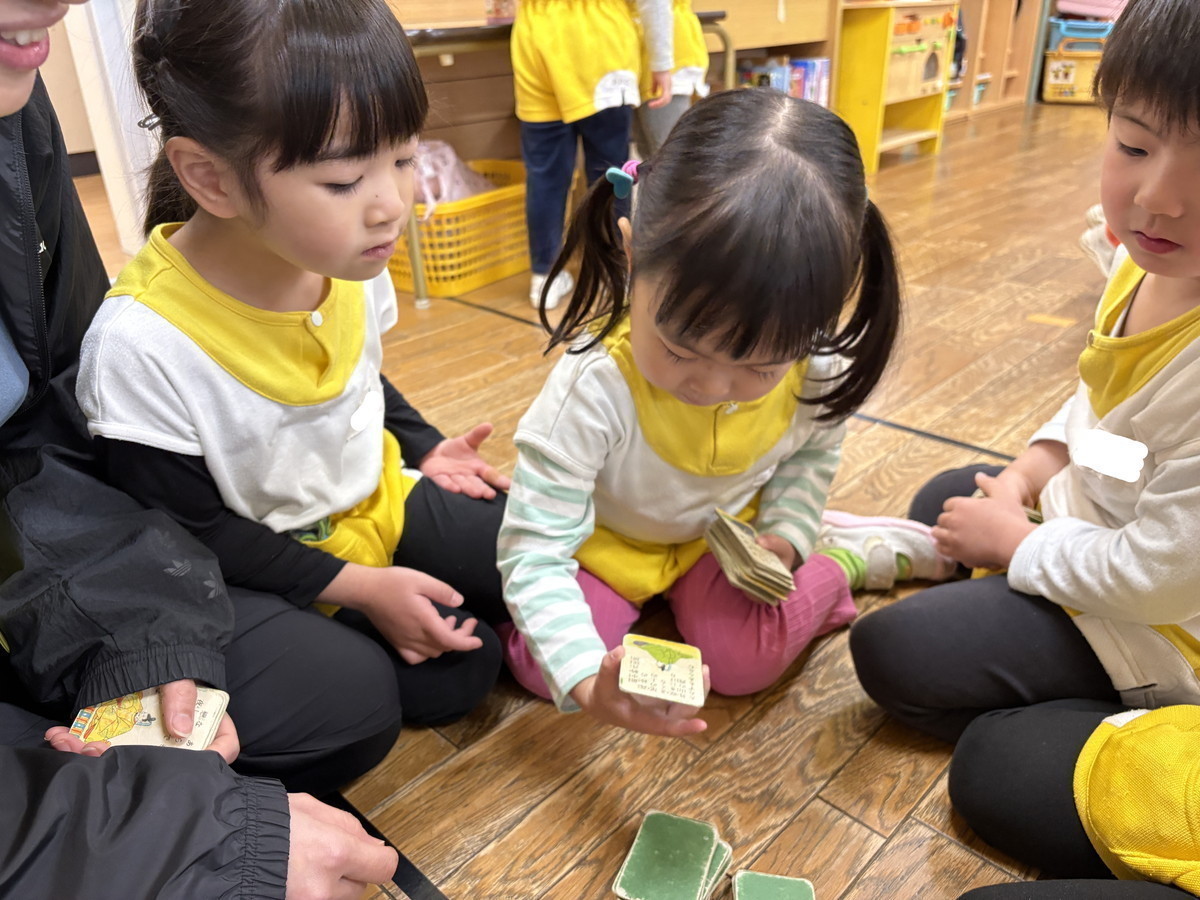 他には、坊主めくりも楽しみました!輪になって、真剣に百人一首の絵札をめくっていく子どもたち。中にはとても引きの強い子がいて…絵札が溜まってきたタイミングで必ずといっていい程、姫の絵札を引き当てて、溜まった絵札をぜーんぶ持っていってしまうんです!