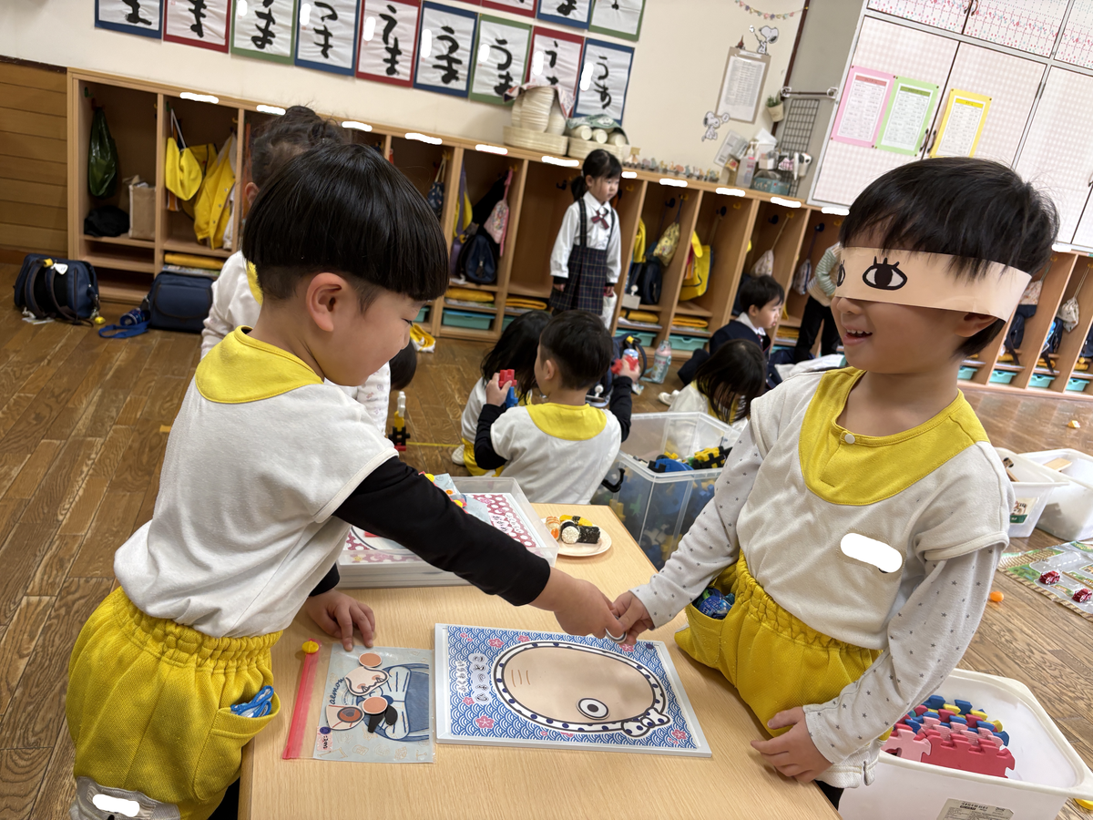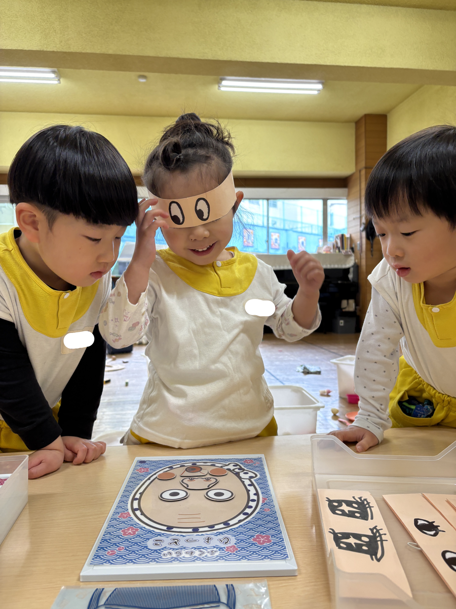 そして…お正月遊びに大盛り上がりだったこすもすさんたち。友だちと一緒に福笑いをして出来上がった顔に大笑いしたり、目隠しをつけた表情に大笑いしたり。目隠ししている友だちに、「これは目だよ」とパーツを手渡しながら、教える姿も微笑ましかったです。