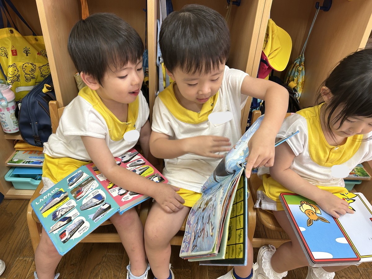 給食後のお腹を休める時間です。ロッカーが隣のお友だちと一緒に絵本を見ています♪