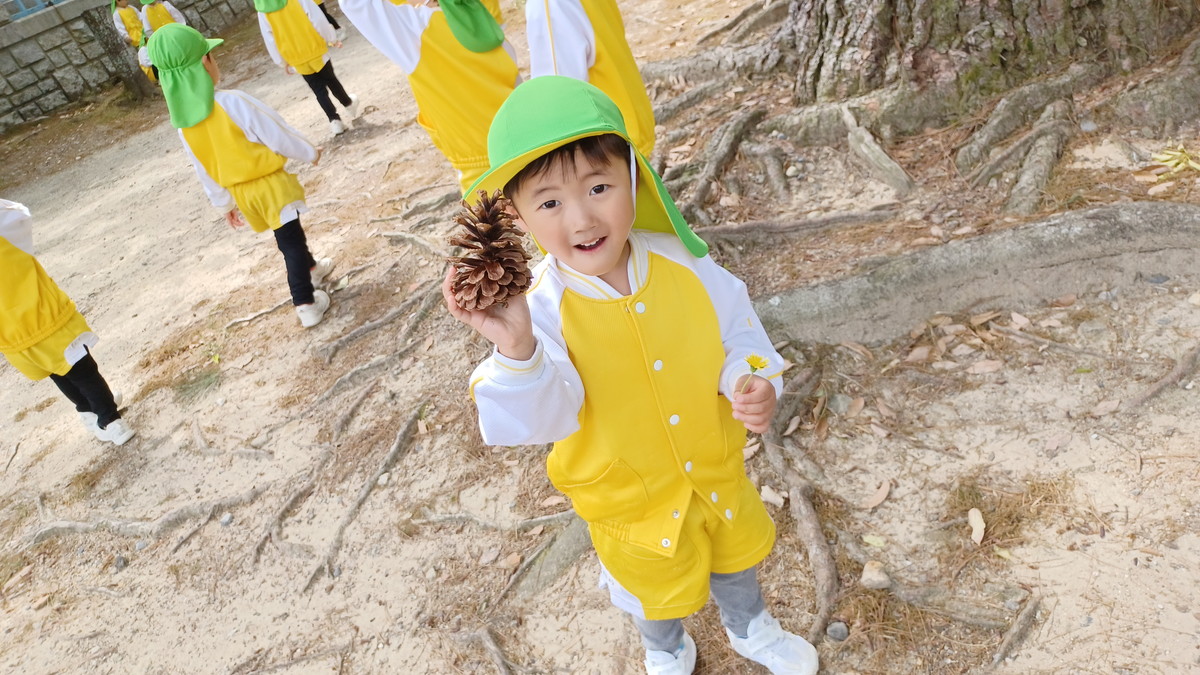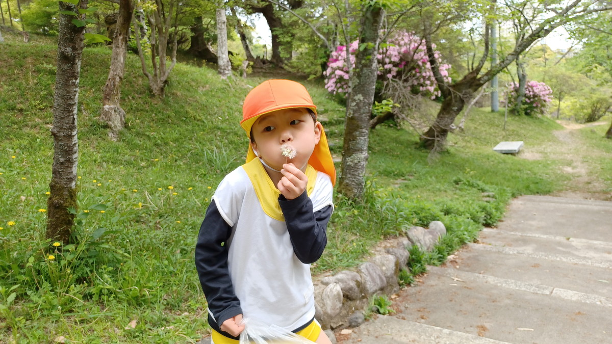 公園では、菖蒲、たんぽぽ、たけのこ、藤の花、大きな松ぼっくりなど、いっぱい見つけてくることができました。たんぽぽの綿毛を「ふぅ~」と吹き飛ばして見せてくれたものの、あまりにも早すぎてシャッターチャンスを逃してしまいました💦でも他の子も真似して楽しんでいたので、今度は上手く撮れました。
