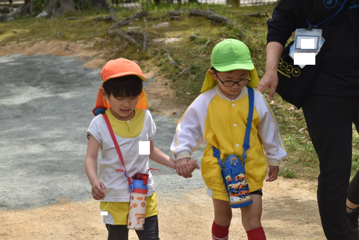 「昨年度のペアさんと手を繋いで行くよ!」と声がかかると、自然とお互いが相手を見つけてペアになっていましたよ。道中は、久しぶりのペアさんとの関わりではありましたが、楽しく会話しながら歩いて公園まで行くことが出来ました。