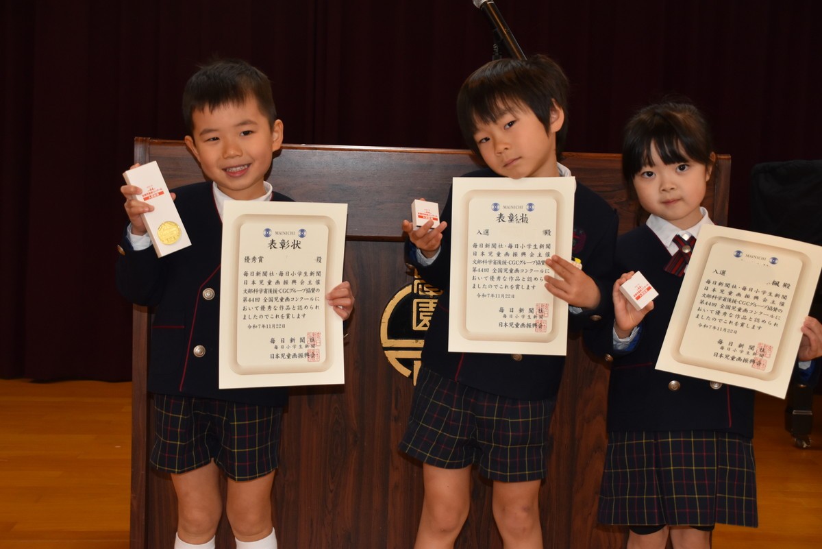 嬉しいニュースとしては、全国児童がコンクールでの入賞者が3名いらっしゃったこと。最近はお店に掲示されなくなったとお聞きしてちょっぴり残念でしたので、せめてお式の中でご紹介をと思い、入賞者の子どもたちには前に出てきてもらいました。みんなカメラの前でポーズしてとってもいい顔を見せてくれました。入賞おめでとうございます!!