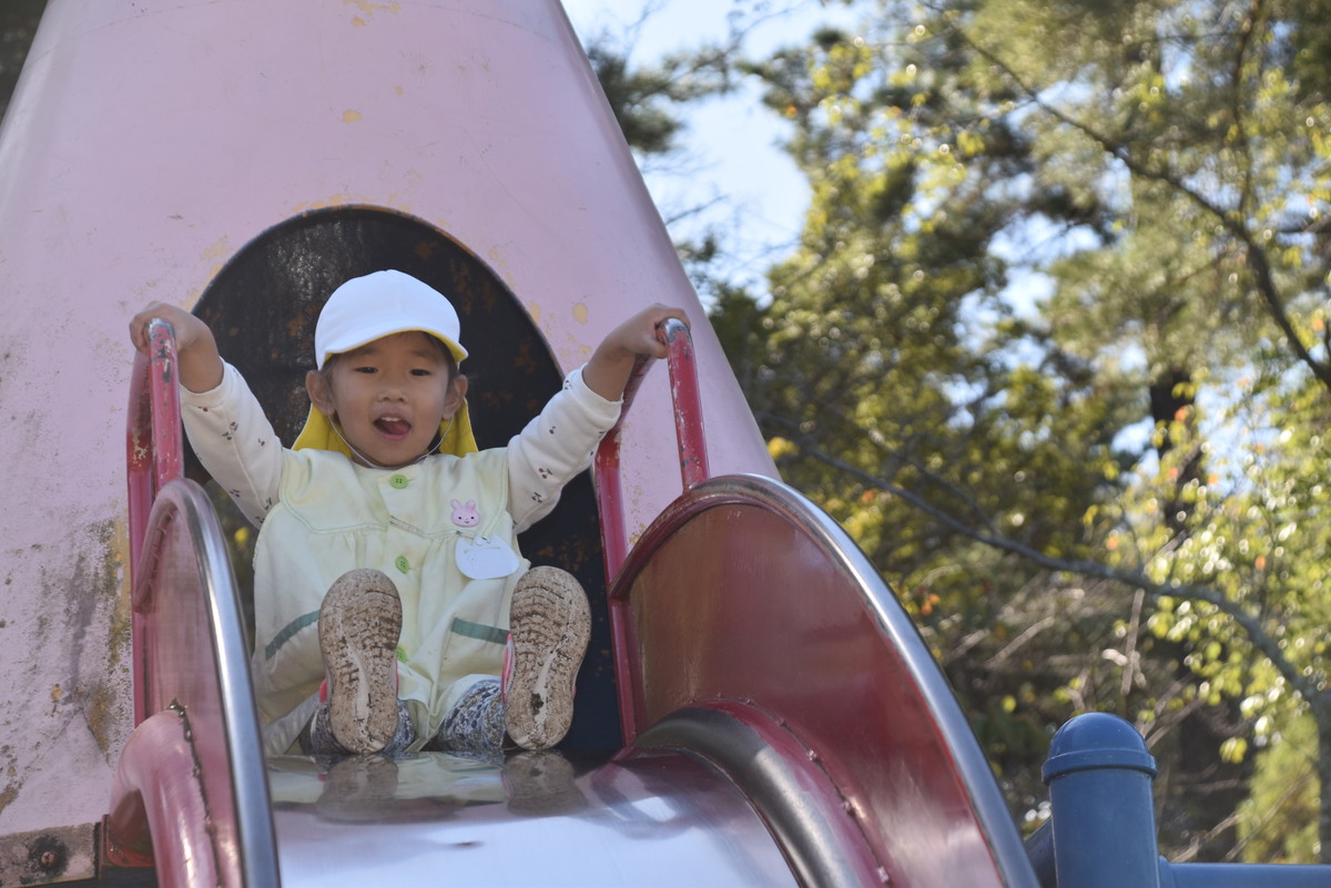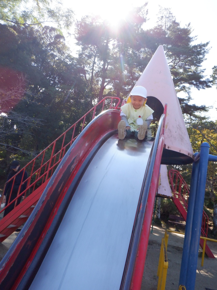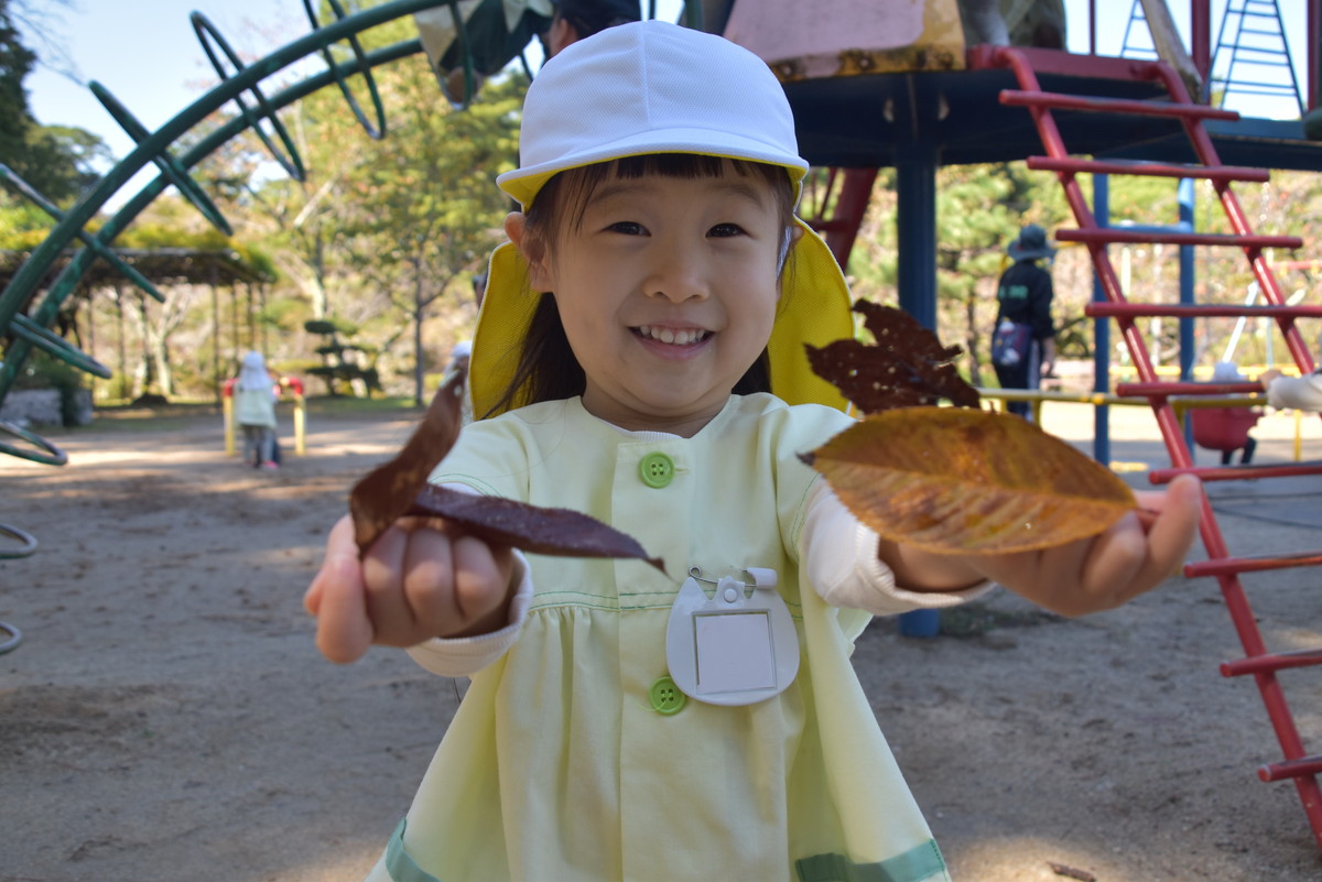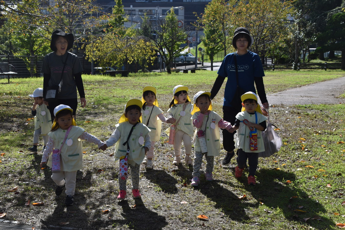 過ごしやすいお天気の中、機関車を見たり、遊具で遊んだり、どんぐりや落ち葉を収穫したりしました。
