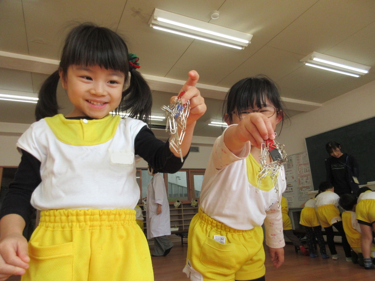 「これはくっつくと思うよ~」「これは無理だよね」と 友だちと話をしながらくっつくものを探し回ります。