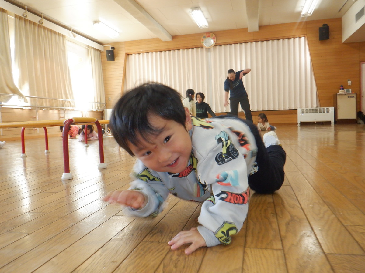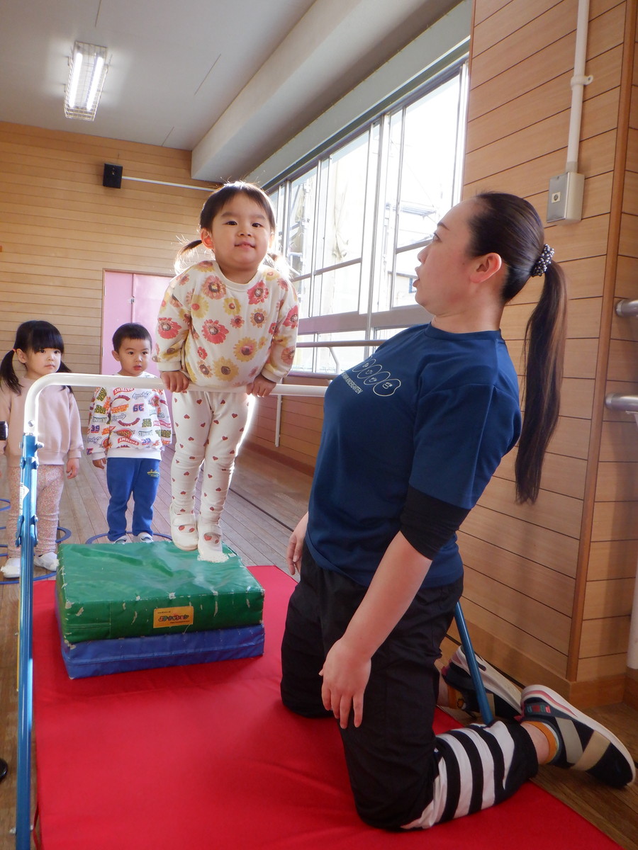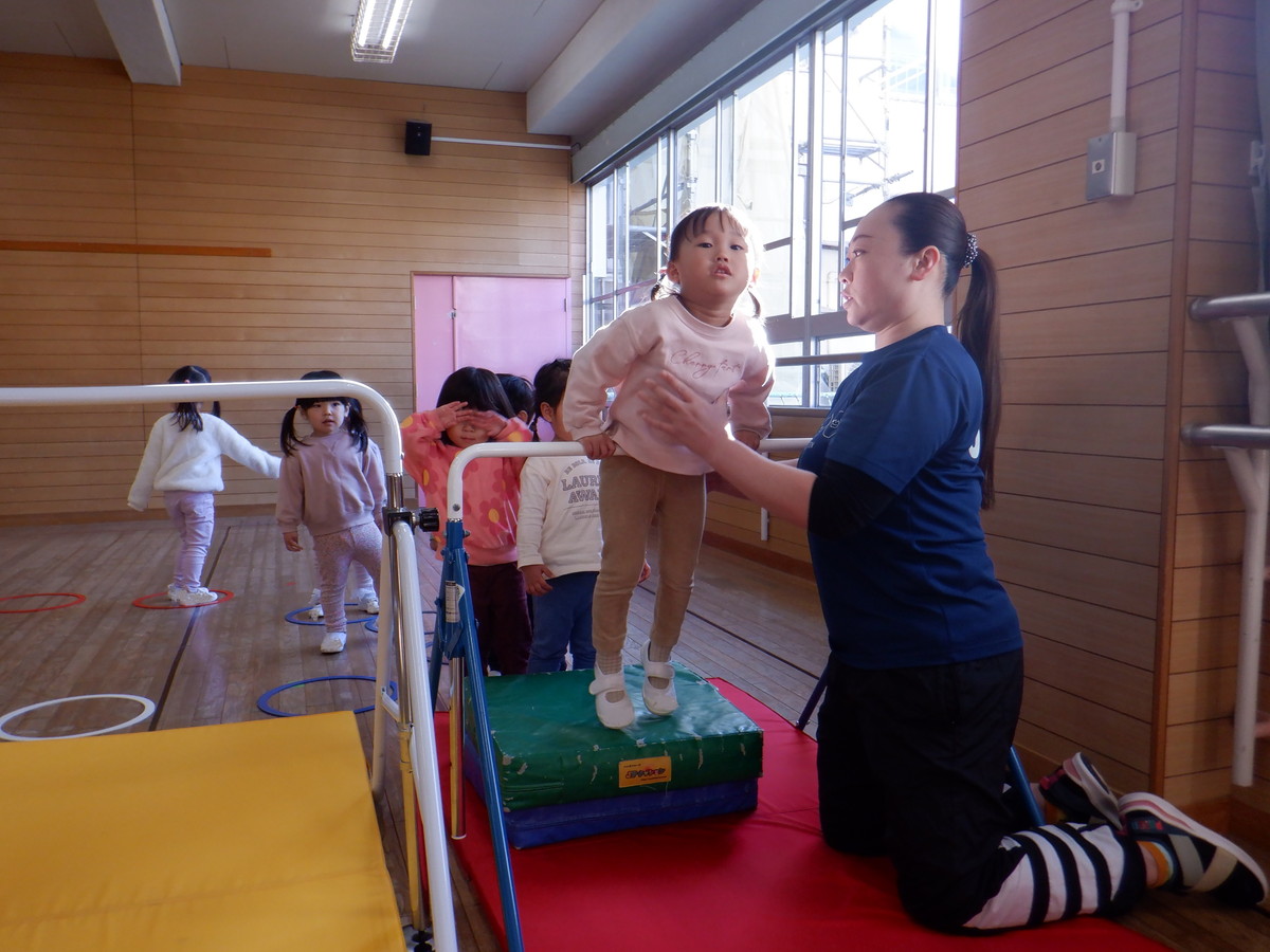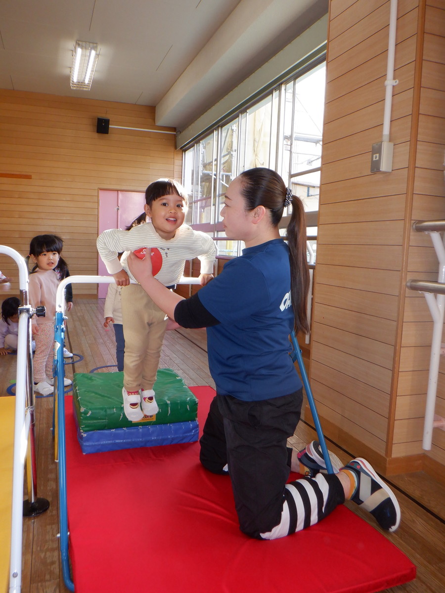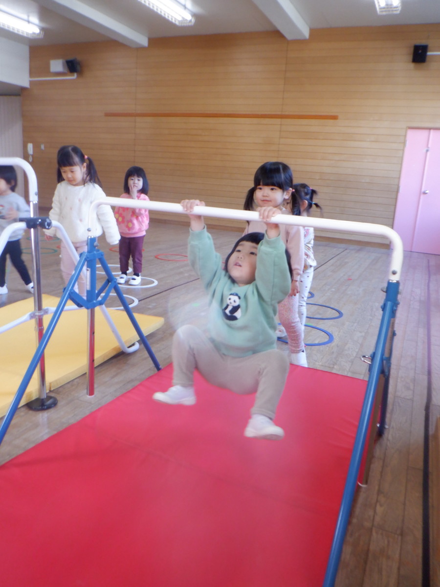 また、みんなの大好きな体操あそびでは、鉄棒にチャレンジしています。しっかりと腕で身体を支えて「つばめ」のポーズをしたり、先生に補助してもらいながら前回りができる子も出てきました。