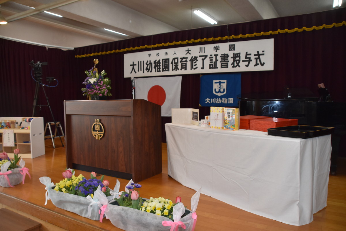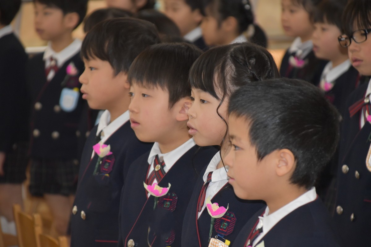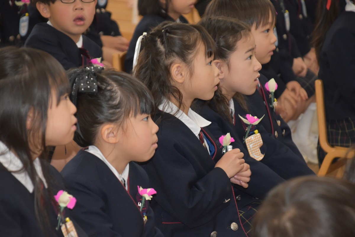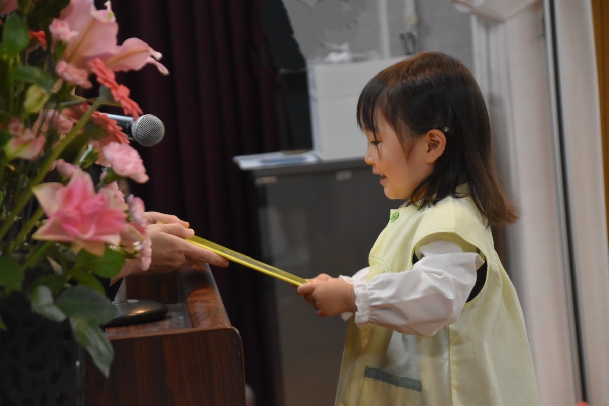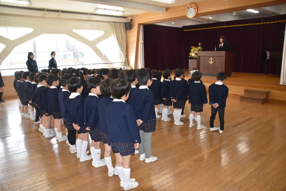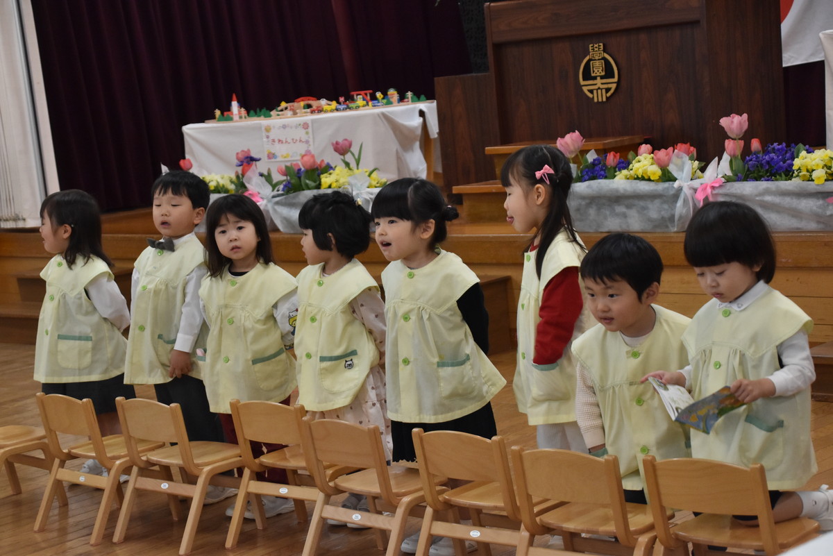 前の列に並んでいたかわいいちゅうりっぷ組さんも、一番最後尾でカッコいいあこがれの年長さんも修了式を迎えたので、ホールに並んで参列したのは年少さんと年中さんだけでした。ガランとしてとても寂しさを覚えるような光景。子どもたちも感じ取っていた様子でした。それでも元気に歌を歌い、最後のお話もよく聞いてくれたと思います。