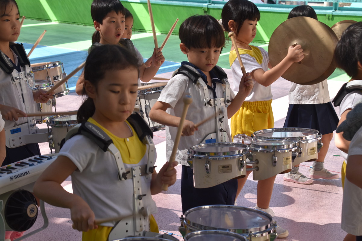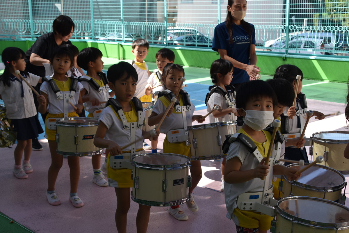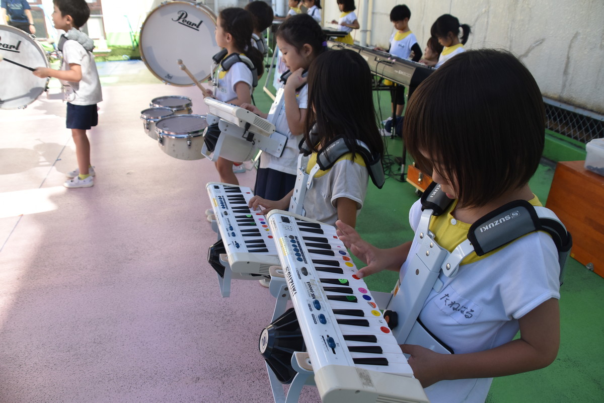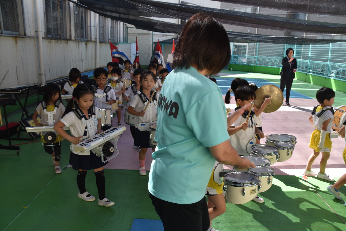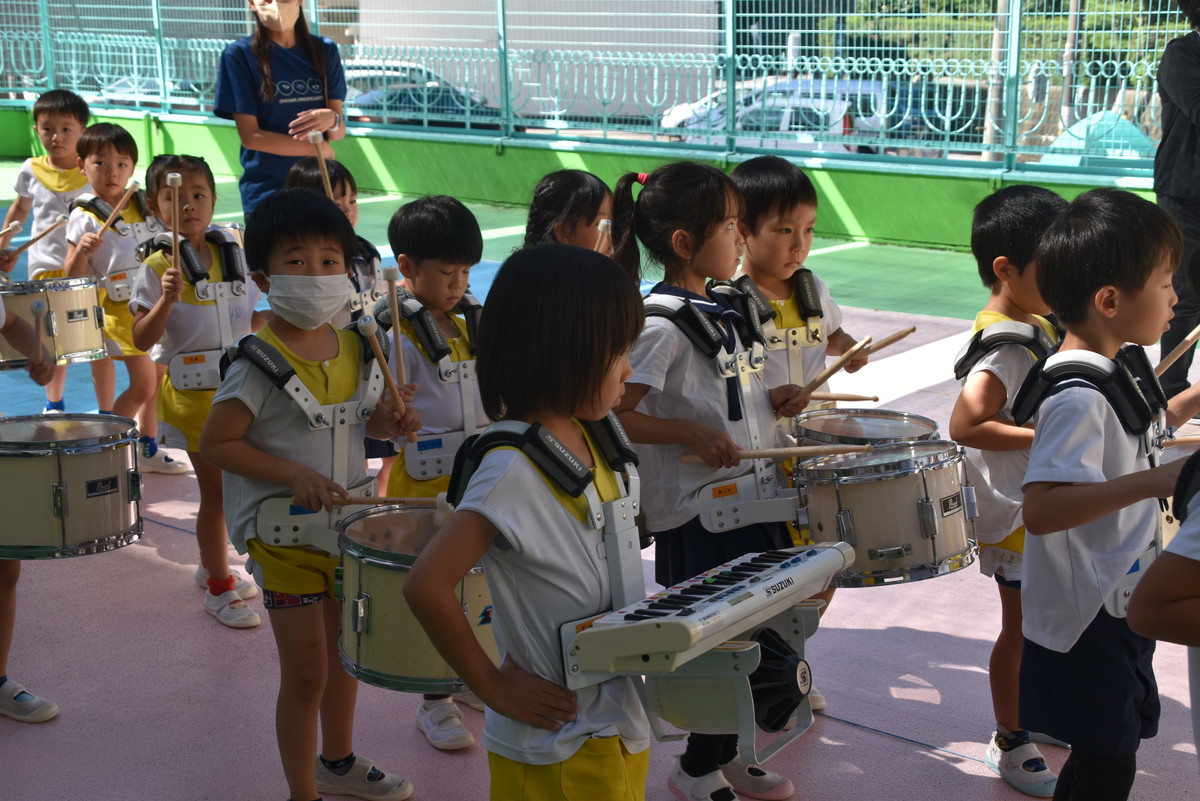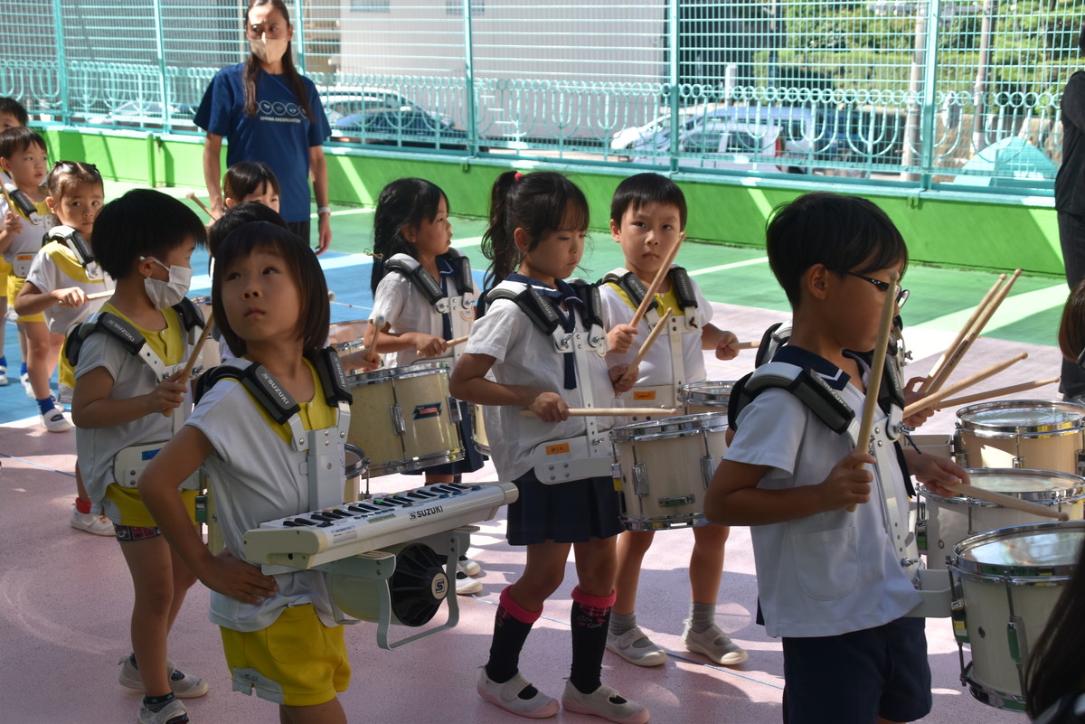 大川幼稚園は、年長児が「鼓笛隊演奏」で出場します。津まつりで、初めての鼓笛隊演奏を披露するので、子どもたちはとても張り切っています♪ とっても上手に演奏できるようになってきたので、昨日と今日は演奏しながら行進をする練習をしましたよ。歩きながら重い楽器を持って演奏するのは本当に大変だと思いますが、疲れを見せずに集中して演奏してくれました。