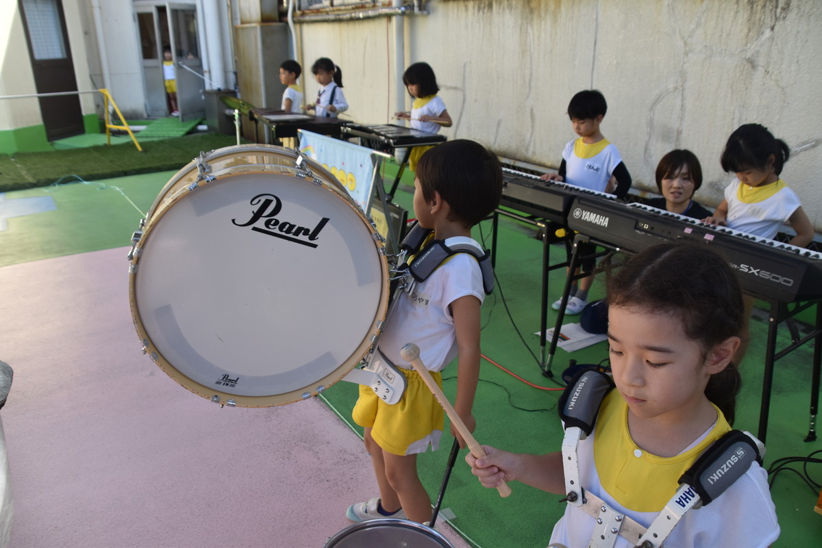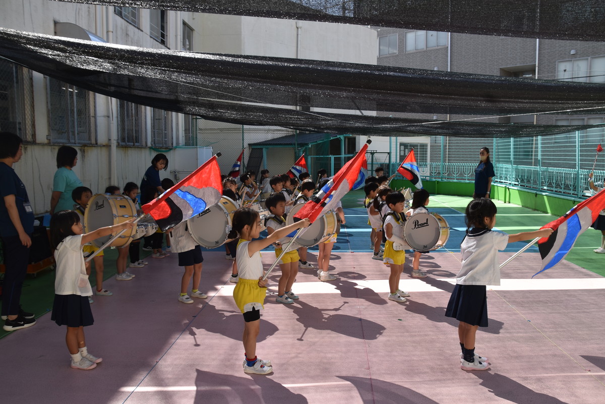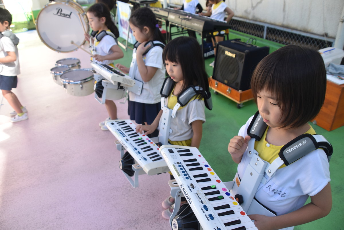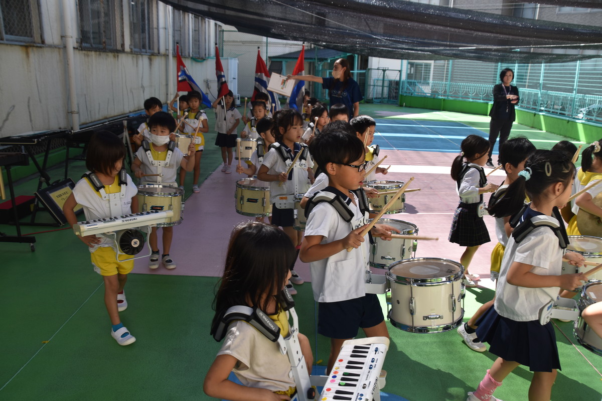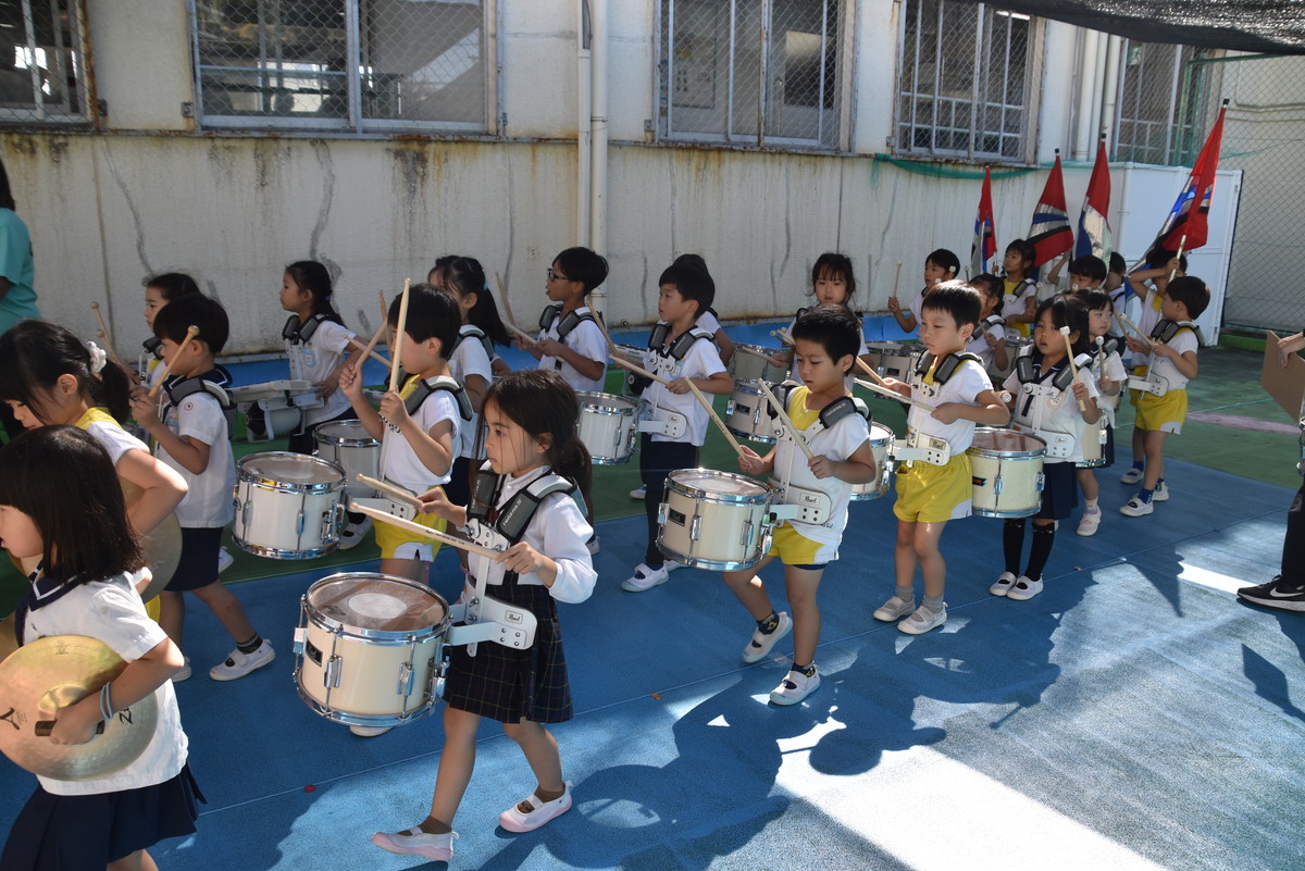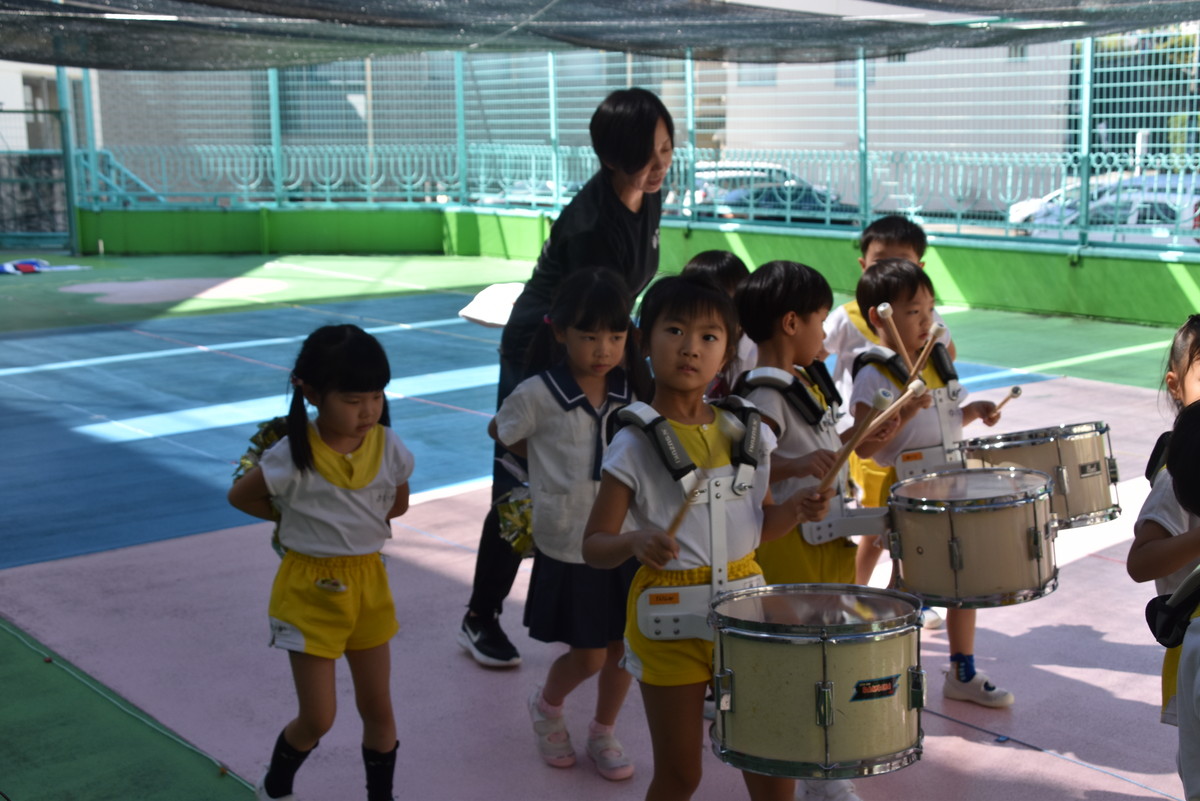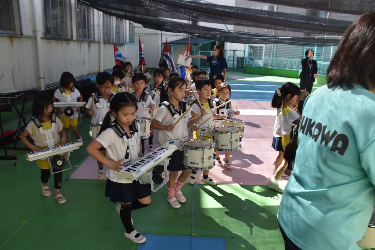 大川幼稚園は、年長児が「鼓笛隊演奏」で出場します。津まつりで、初めての鼓笛隊演奏を披露するので、子どもたちはとても張り切っています♪ とっても上手に演奏できるようになってきたので、昨日と今日は演奏しながら行進をする練習をしましたよ。歩きながら重い楽器を持って演奏するのは本当に大変だと思いますが、疲れを見せずに集中して演奏してくれました。