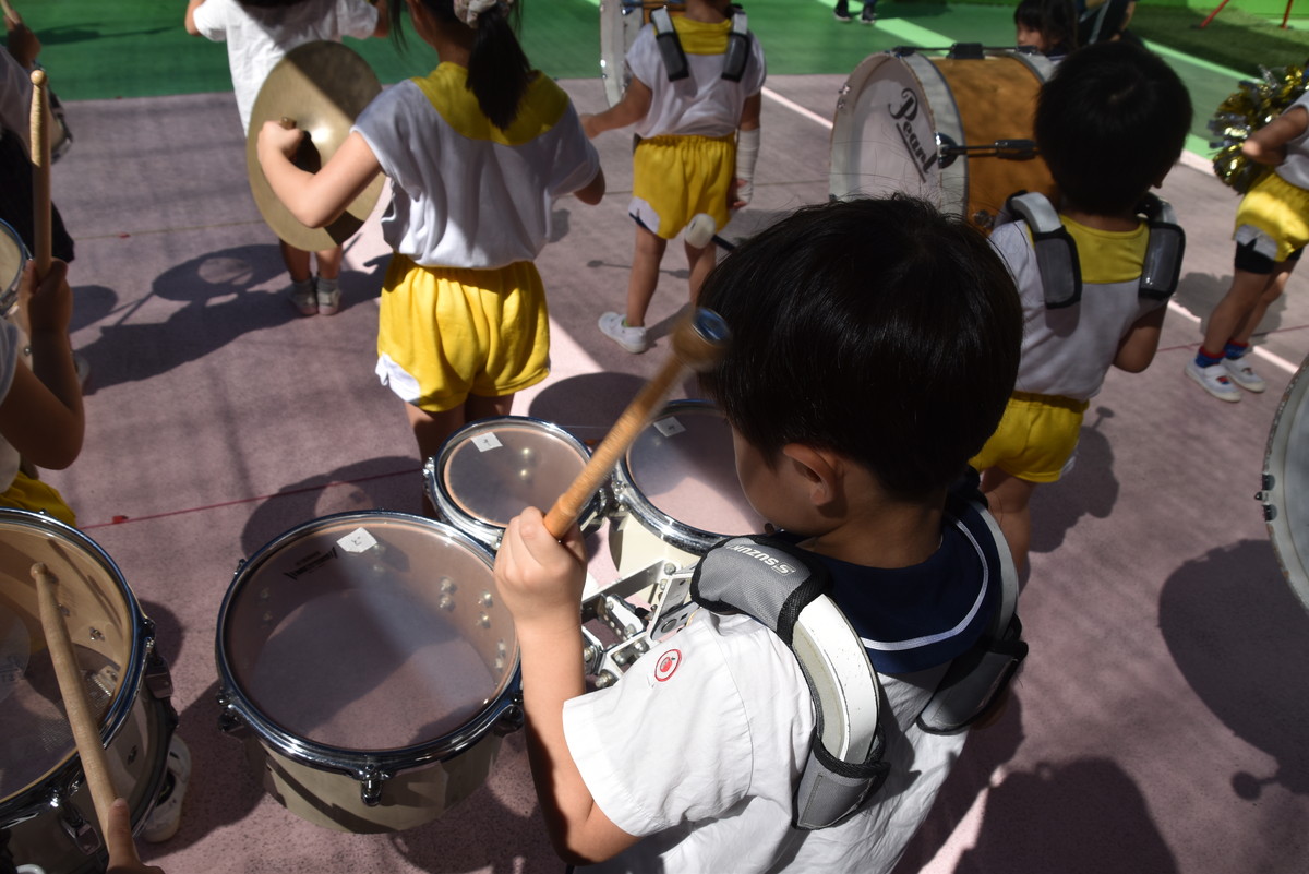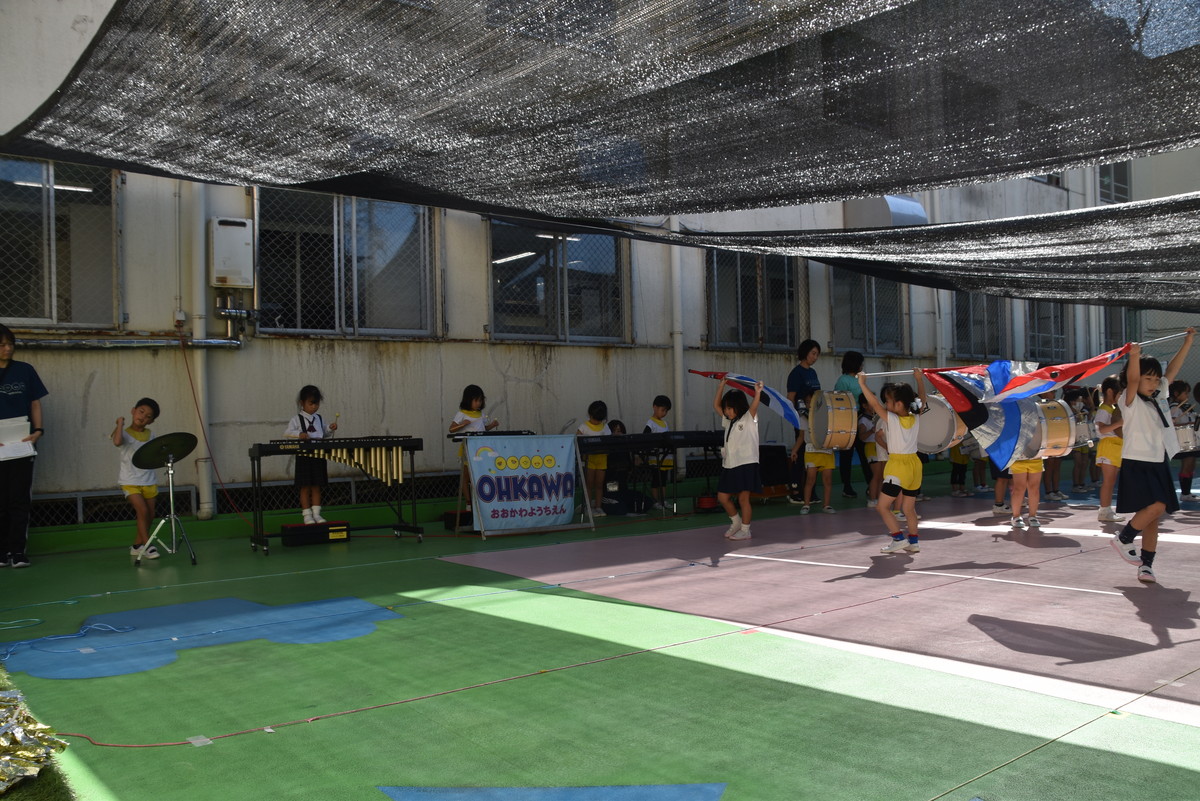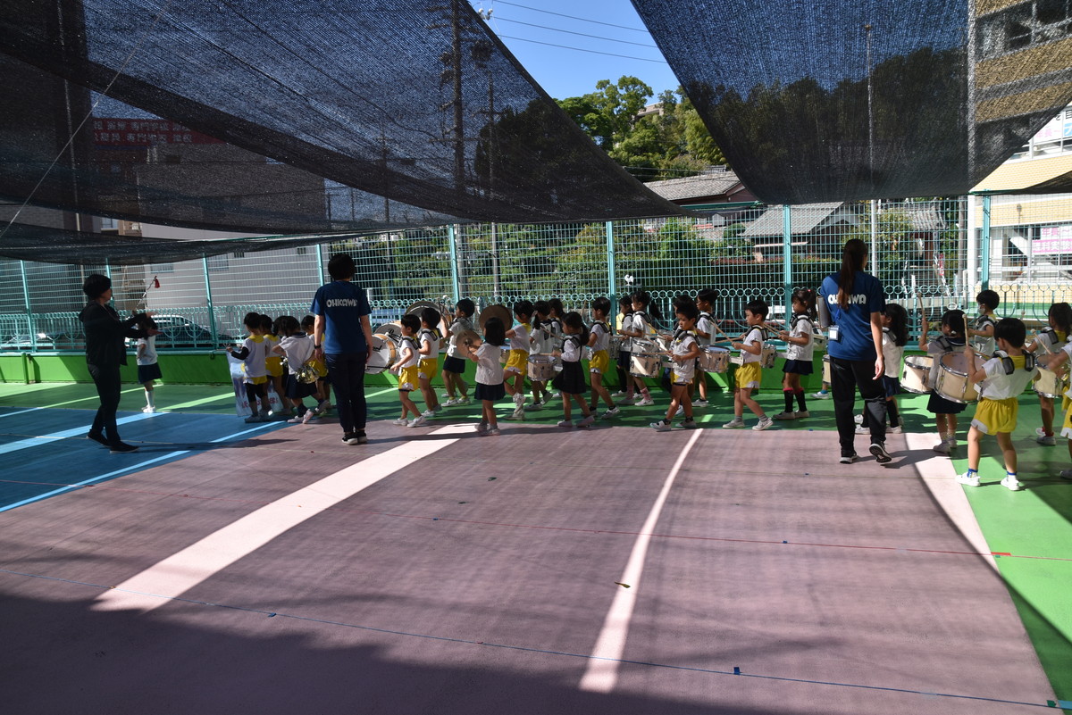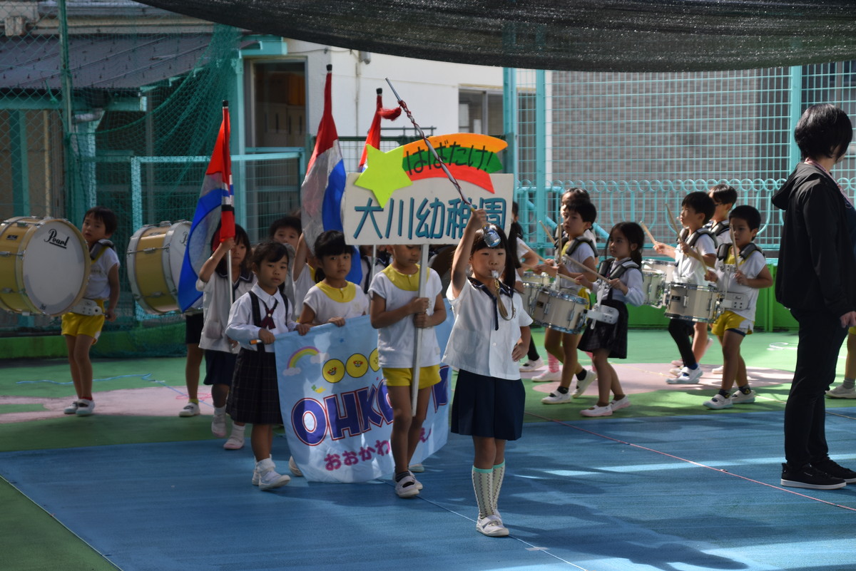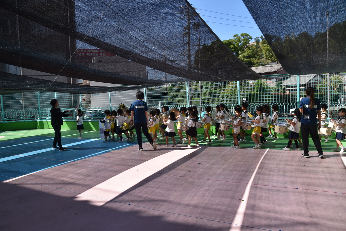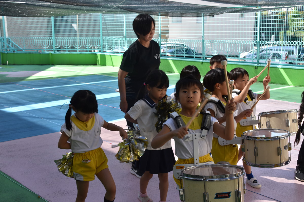 大川幼稚園は、年長児が「鼓笛隊演奏」で出場します。津まつりで、初めての鼓笛隊演奏を披露するので、子どもたちはとても張り切っています♪ とっても上手に演奏できるようになってきたので、昨日と今日は演奏しながら行進をする練習をしましたよ。歩きながら重い楽器を持って演奏するのは本当に大変だと思いますが、疲れを見せずに集中して演奏してくれました。