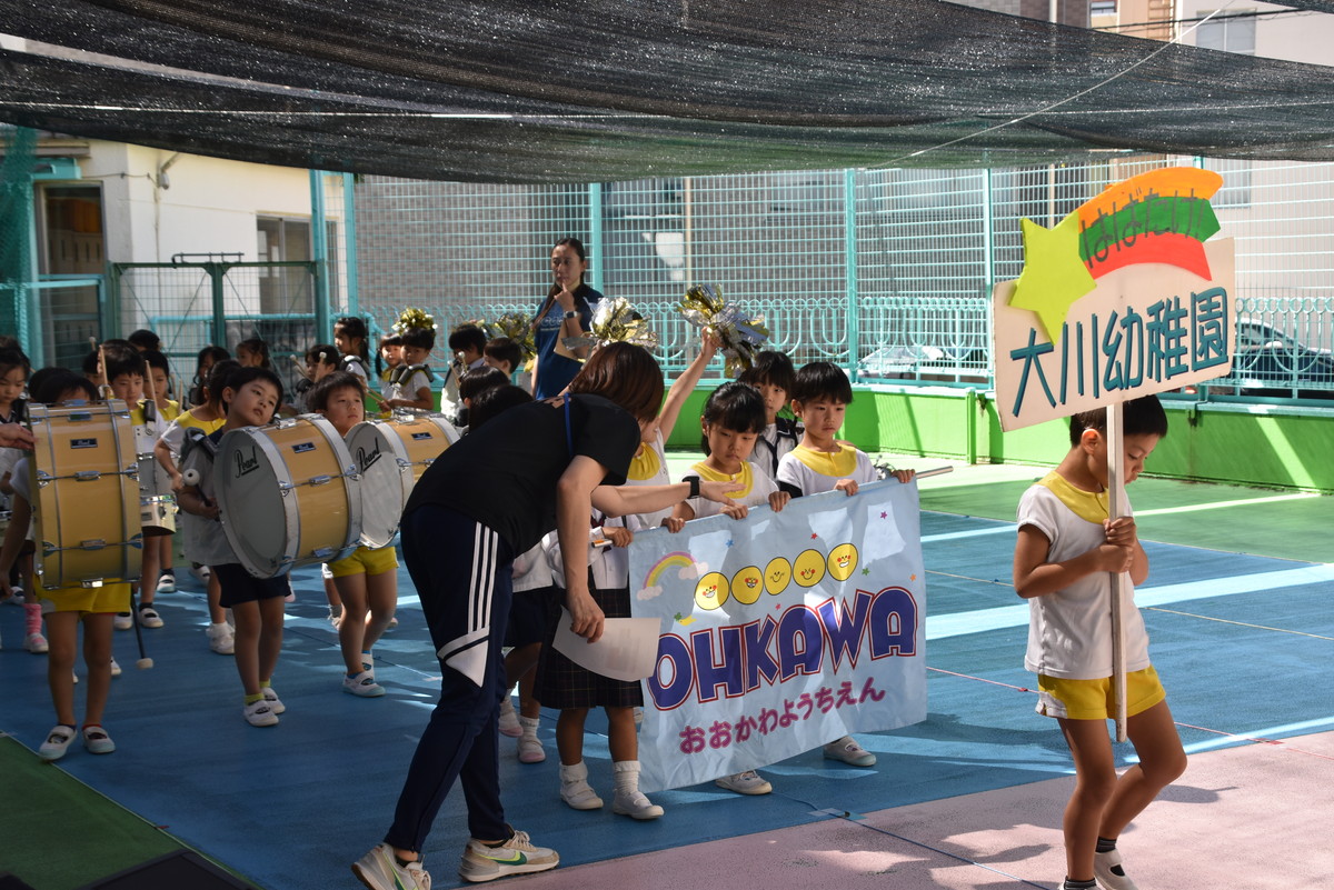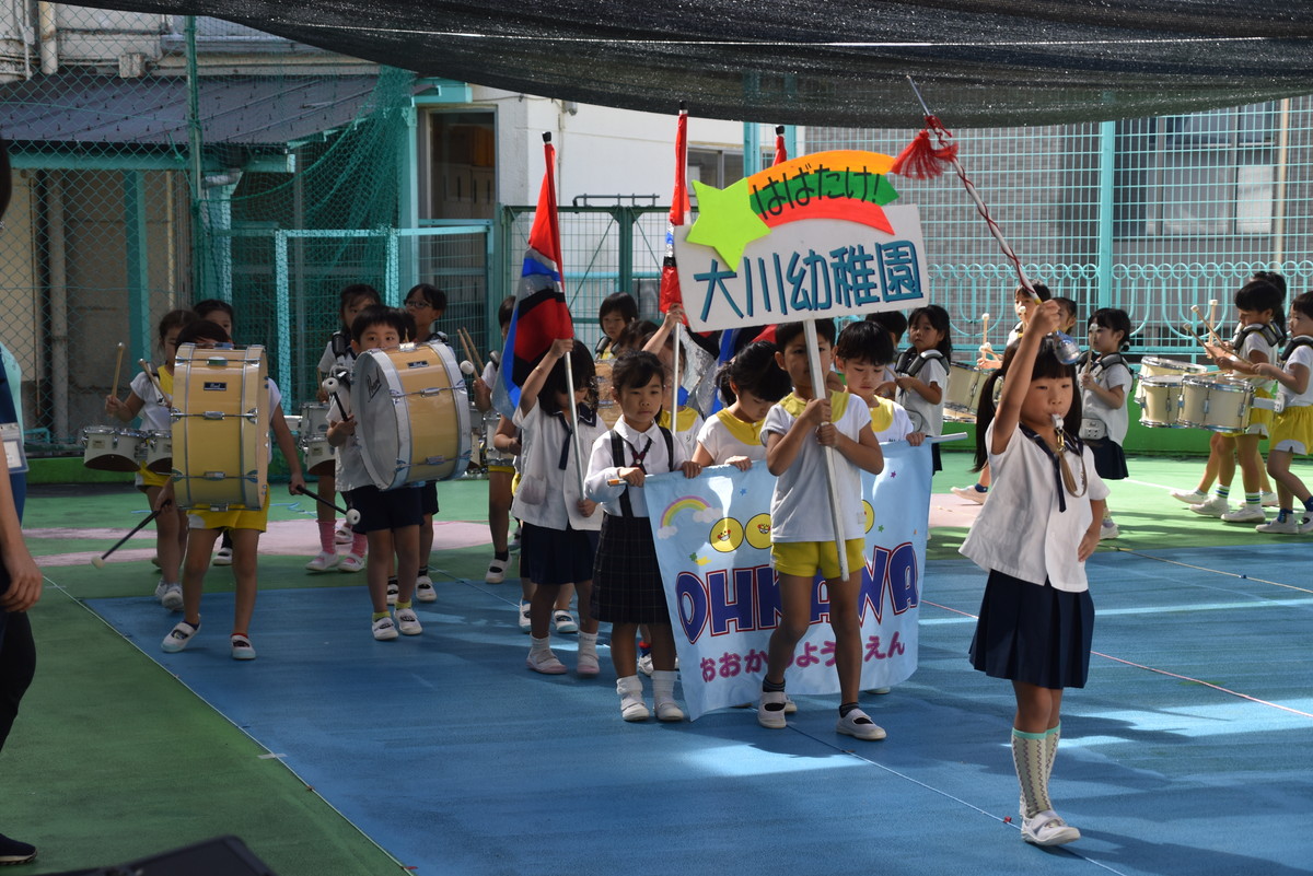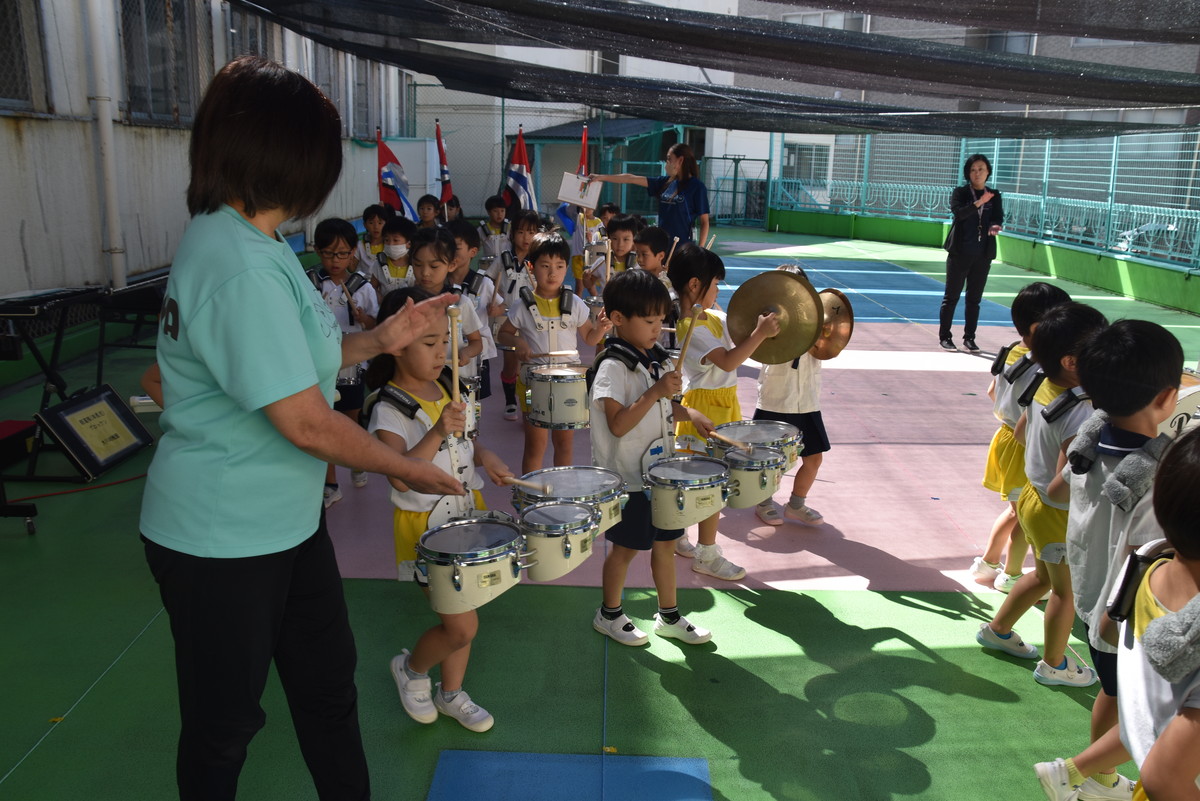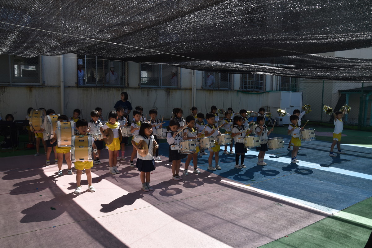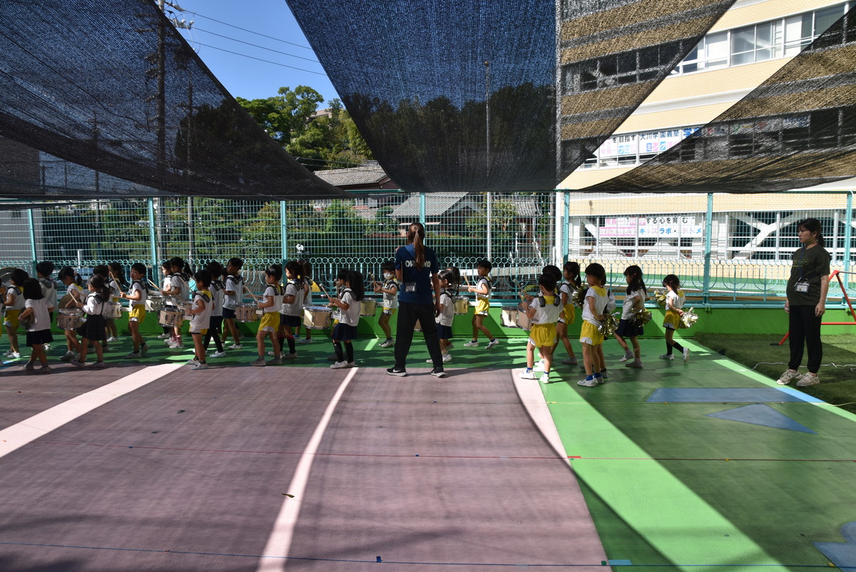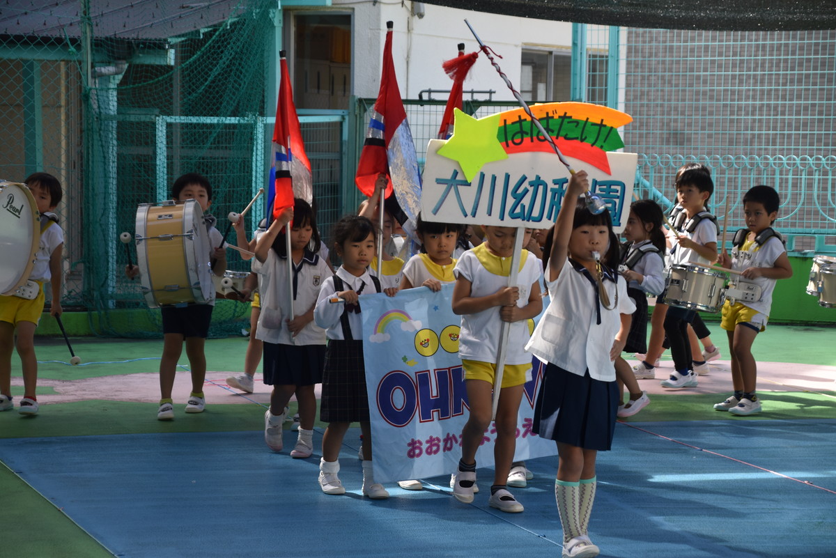大川幼稚園は、年長児が「鼓笛隊演奏」で出場します。津まつりで、初めての鼓笛隊演奏を披露するので、子どもたちはとても張り切っています♪ とっても上手に演奏できるようになってきたので、昨日と今日は演奏しながら行進をする練習をしましたよ。歩きながら重い楽器を持って演奏するのは本当に大変だと思いますが、疲れを見せずに集中して演奏してくれました。