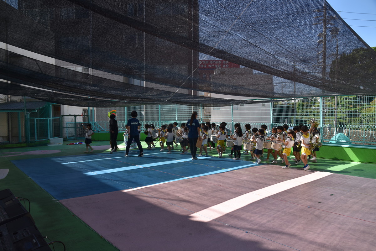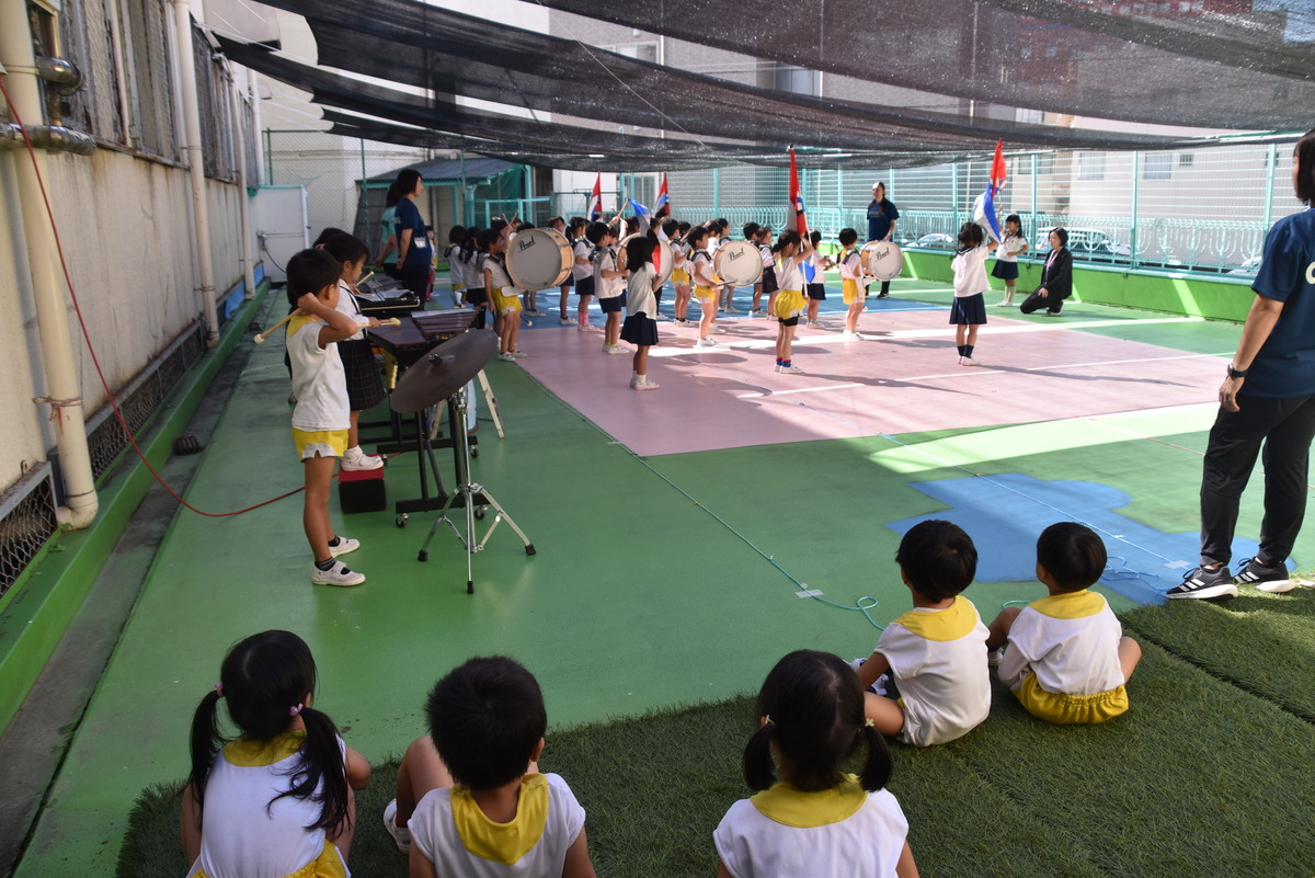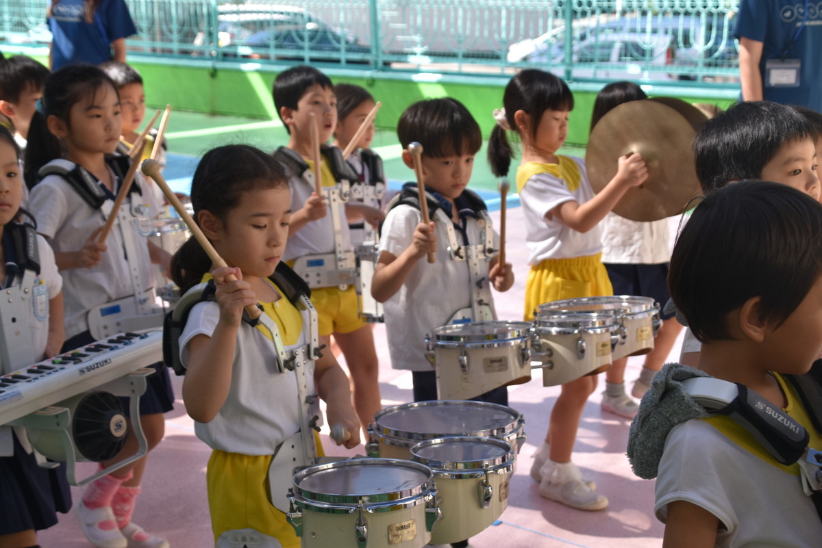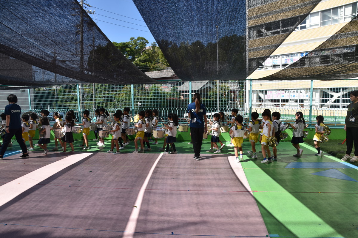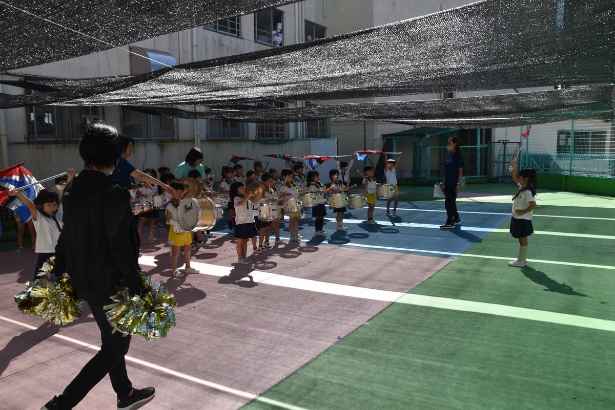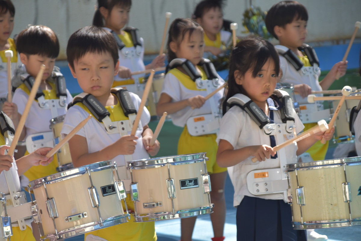 大川幼稚園は、年長児が「鼓笛隊演奏」で出場します。津まつりで、初めての鼓笛隊演奏を披露するので、子どもたちはとても張り切っています♪ とっても上手に演奏できるようになってきたので、昨日と今日は演奏しながら行進をする練習をしましたよ。歩きながら重い楽器を持って演奏するのは本当に大変だと思いますが、疲れを見せずに集中して演奏してくれました。