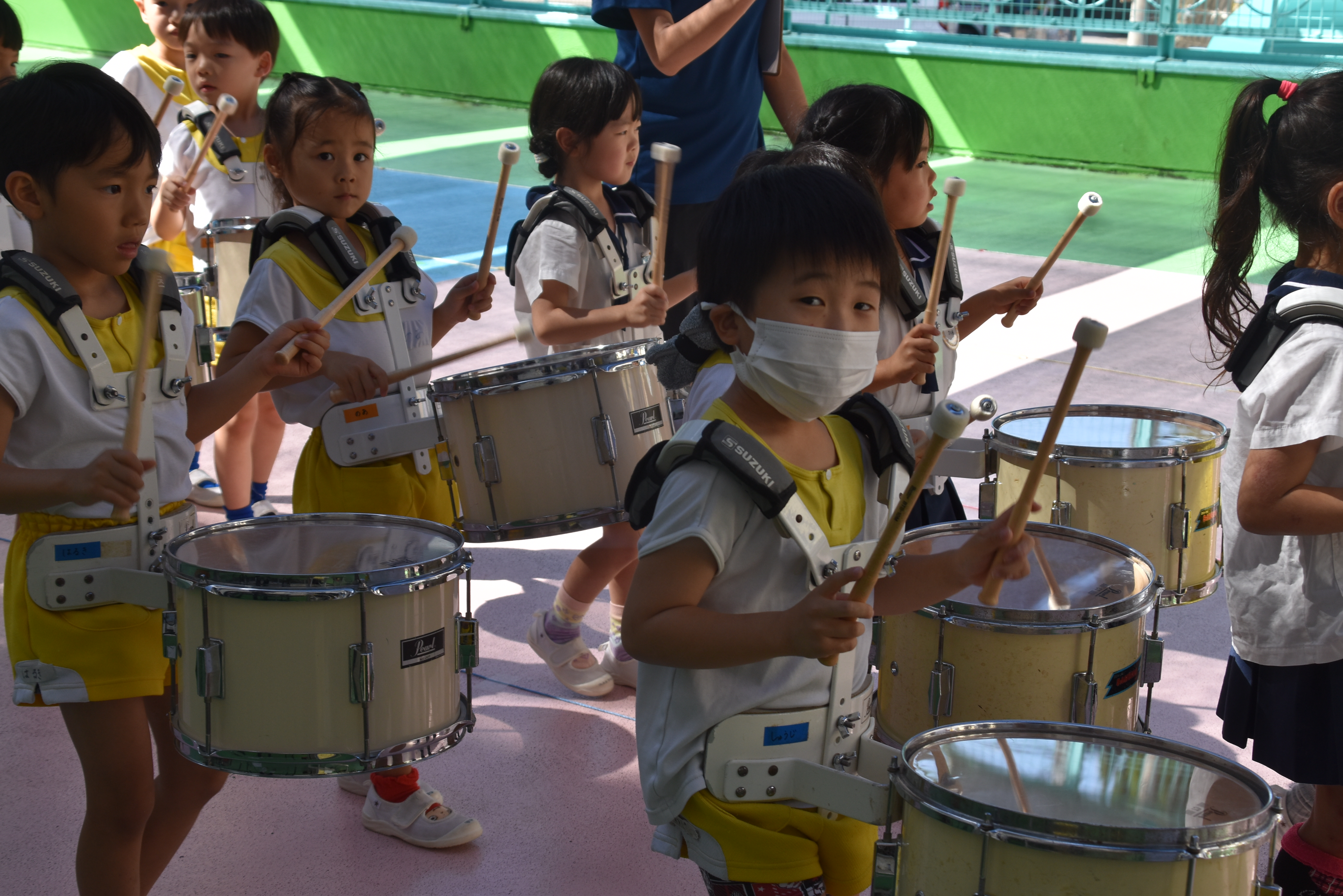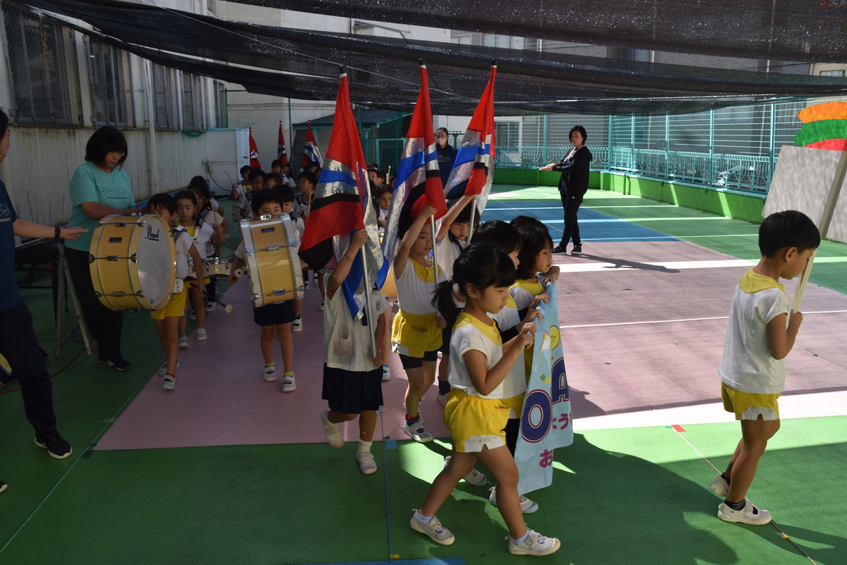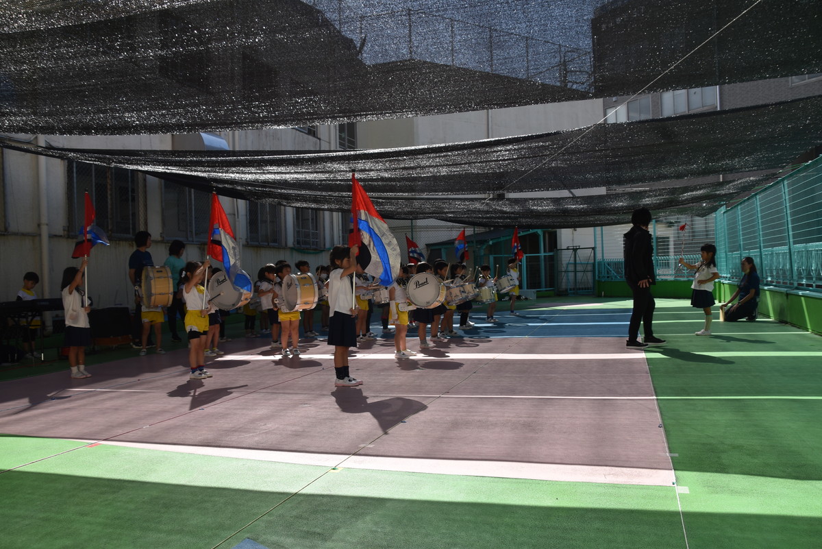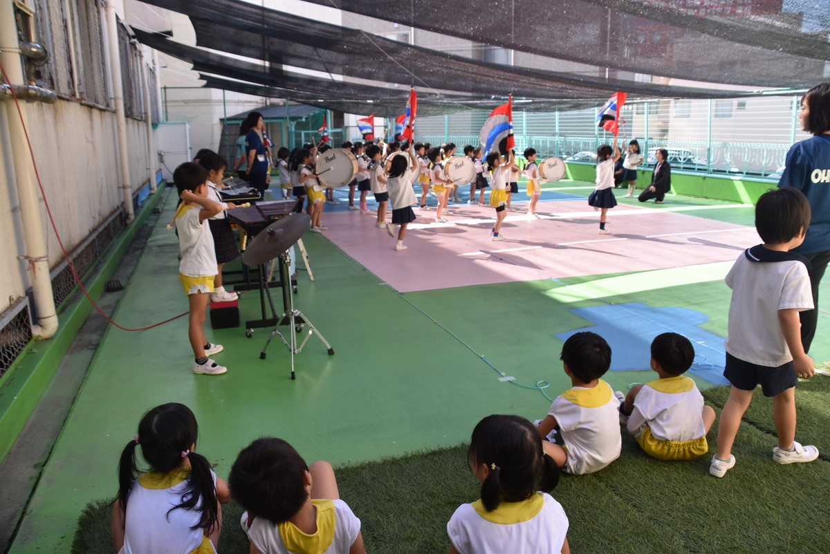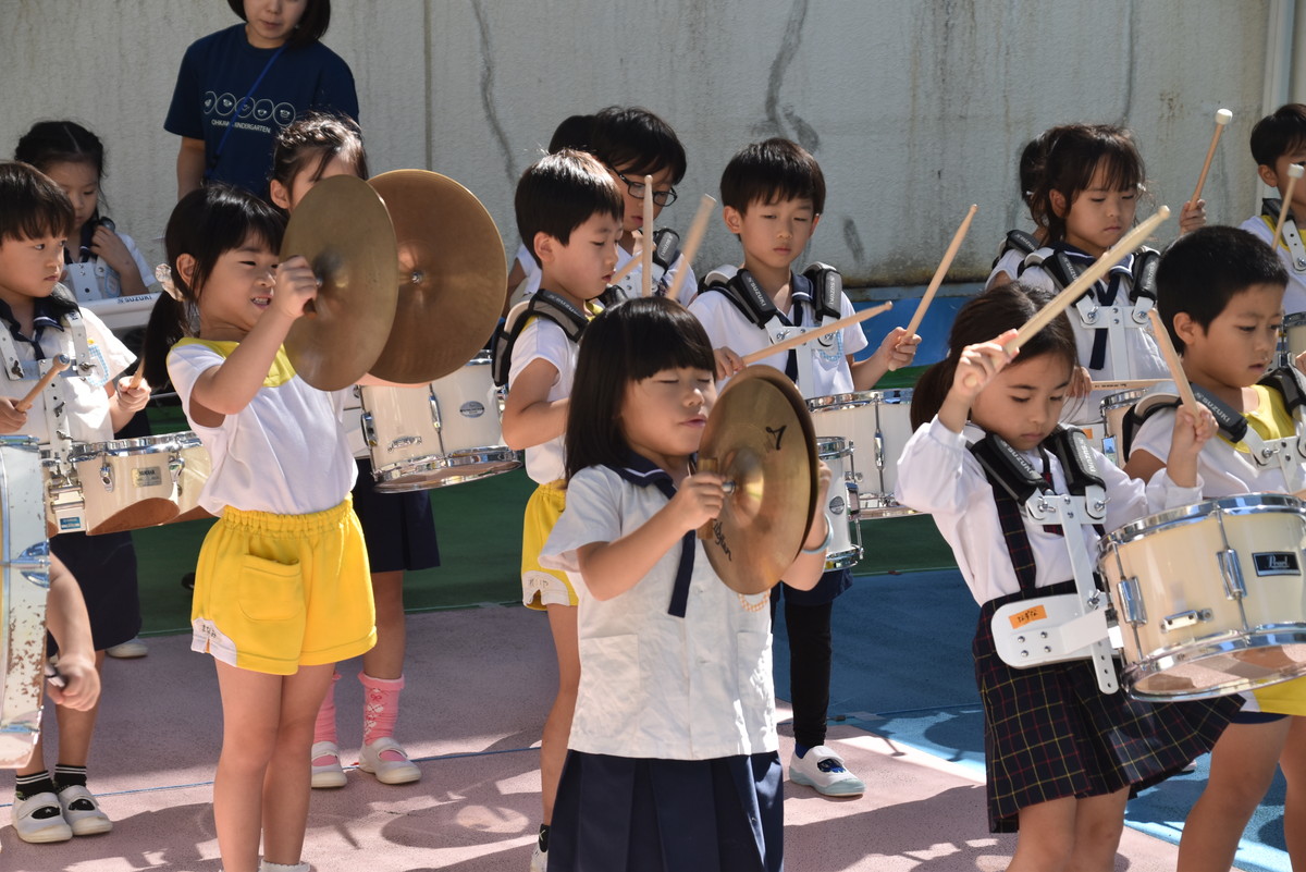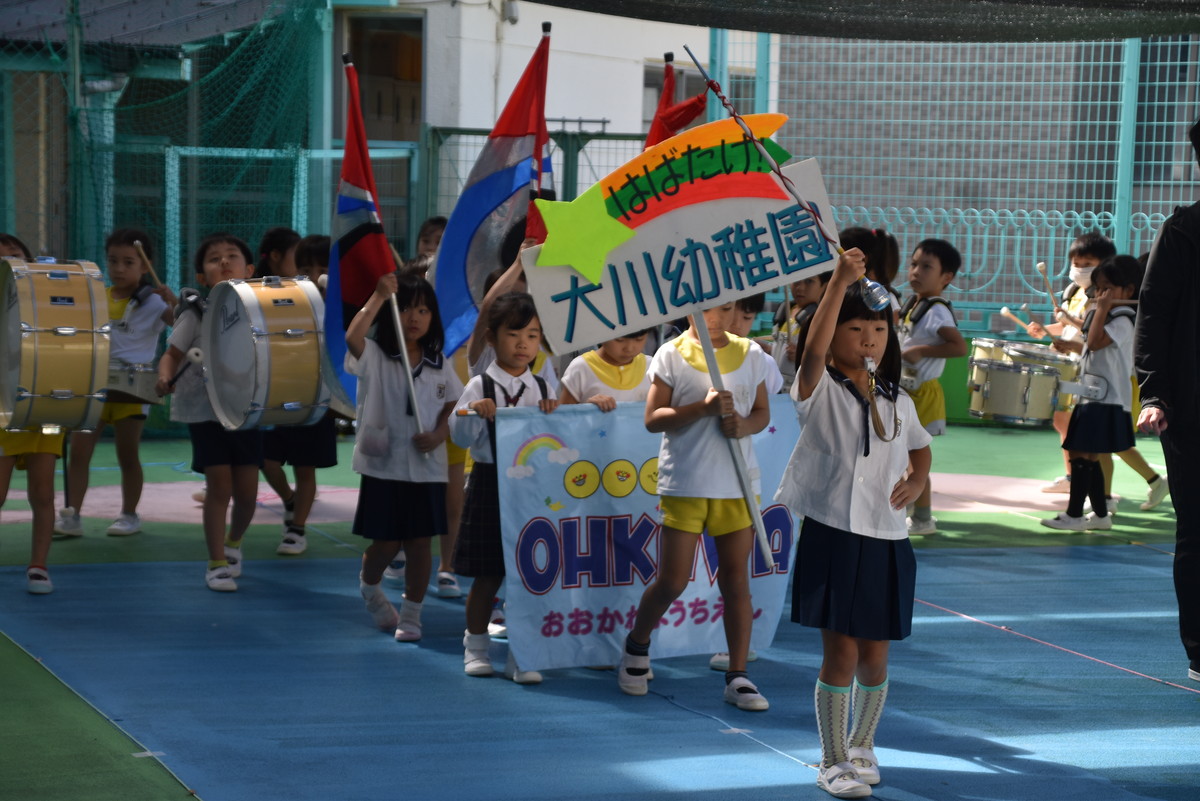 大川幼稚園は、年長児が「鼓笛隊演奏」で出場します。津まつりで、初めての鼓笛隊演奏を披露するので、子どもたちはとても張り切っています♪ とっても上手に演奏できるようになってきたので、昨日と今日は演奏しながら行進をする練習をしましたよ。歩きながら重い楽器を持って演奏するのは本当に大変だと思いますが、疲れを見せずに集中して演奏してくれました。