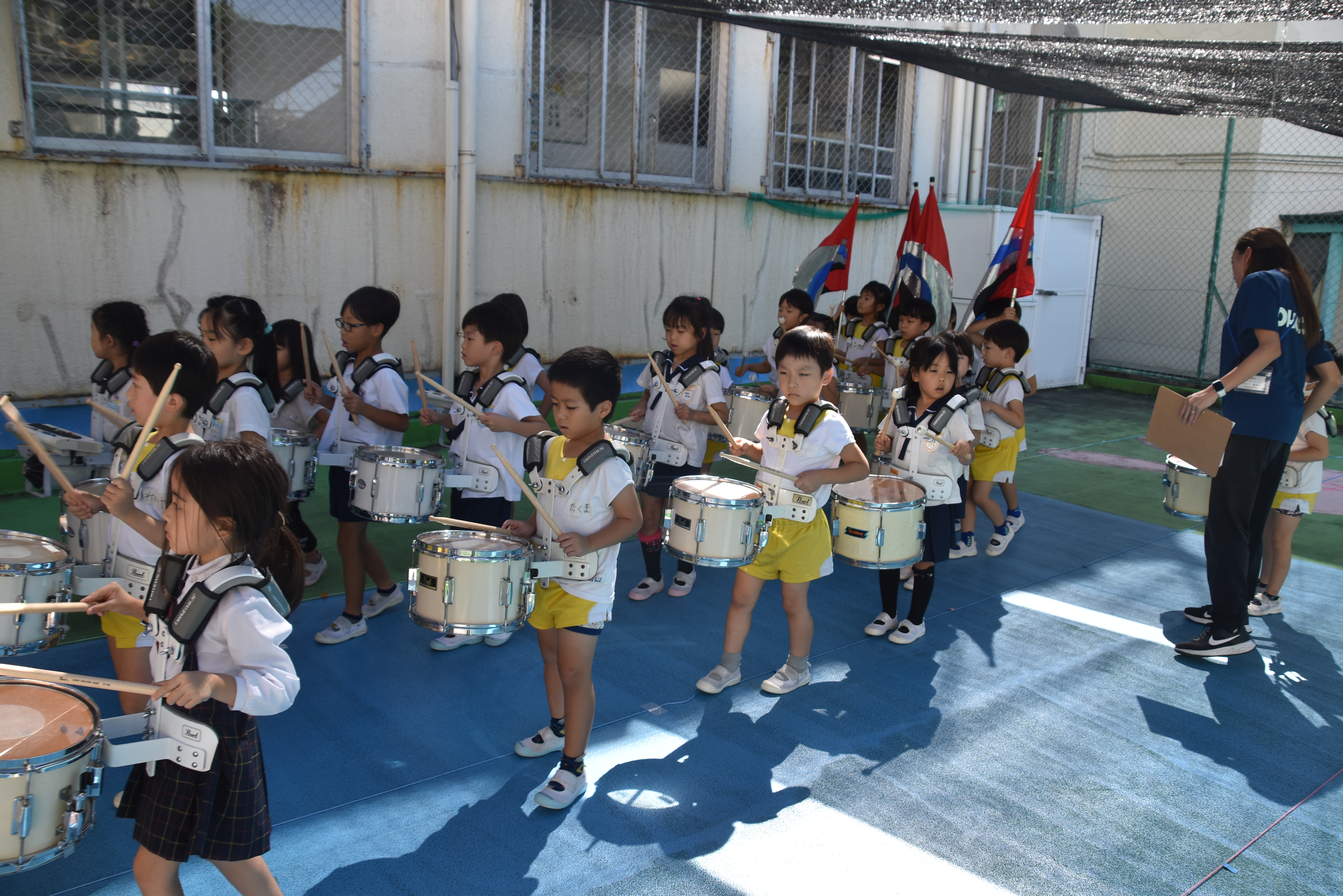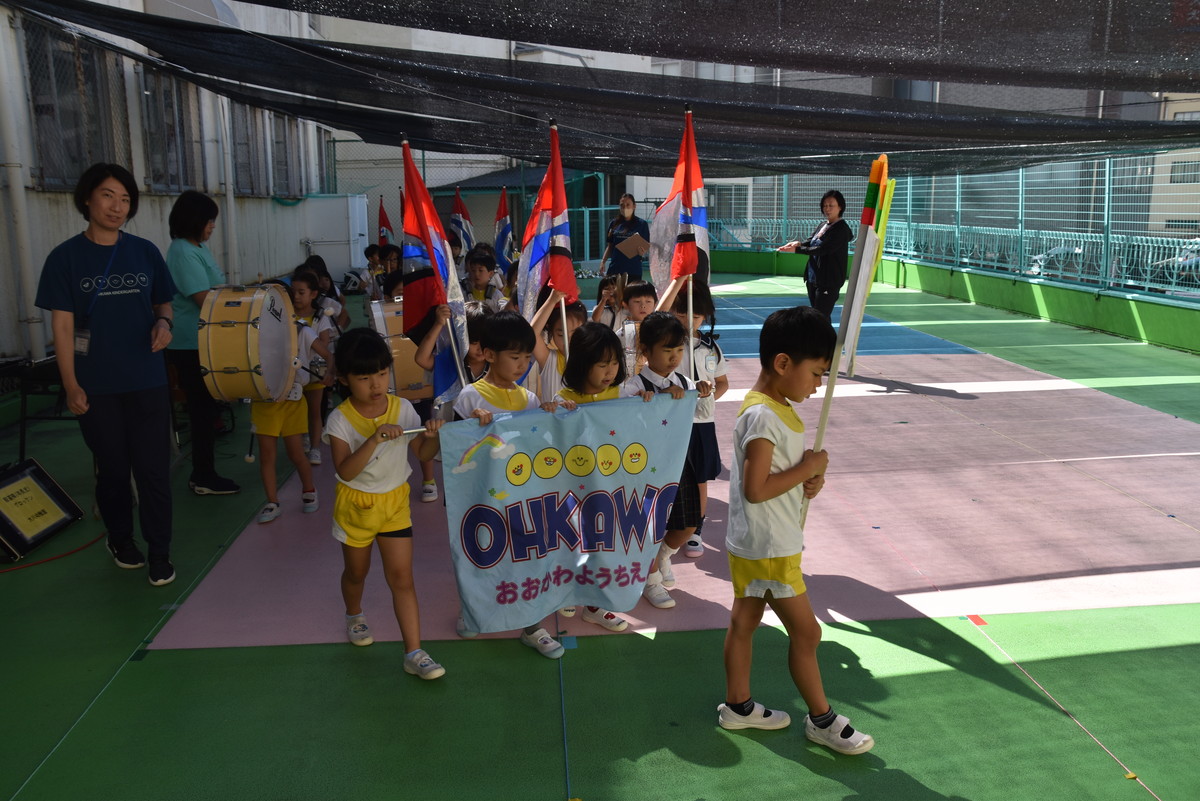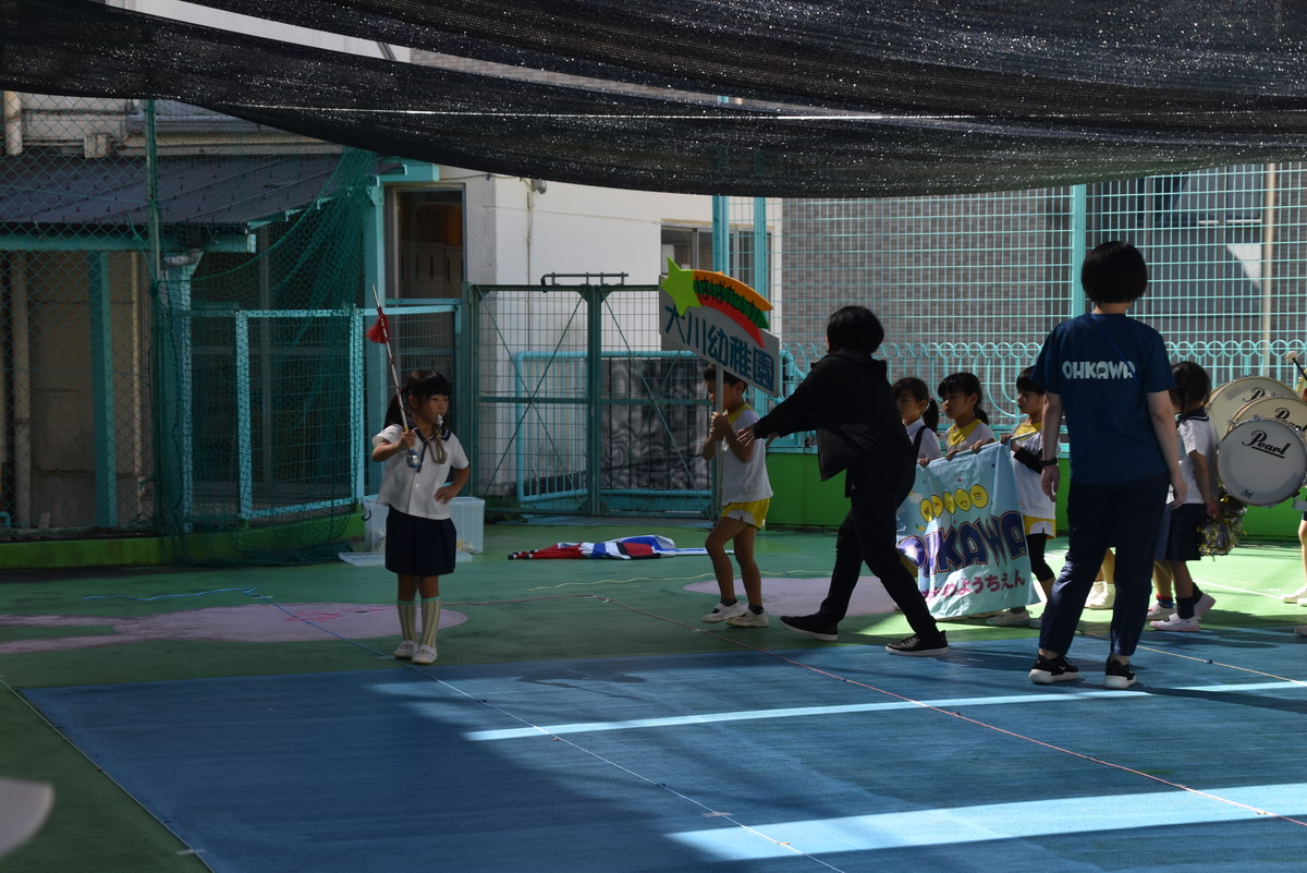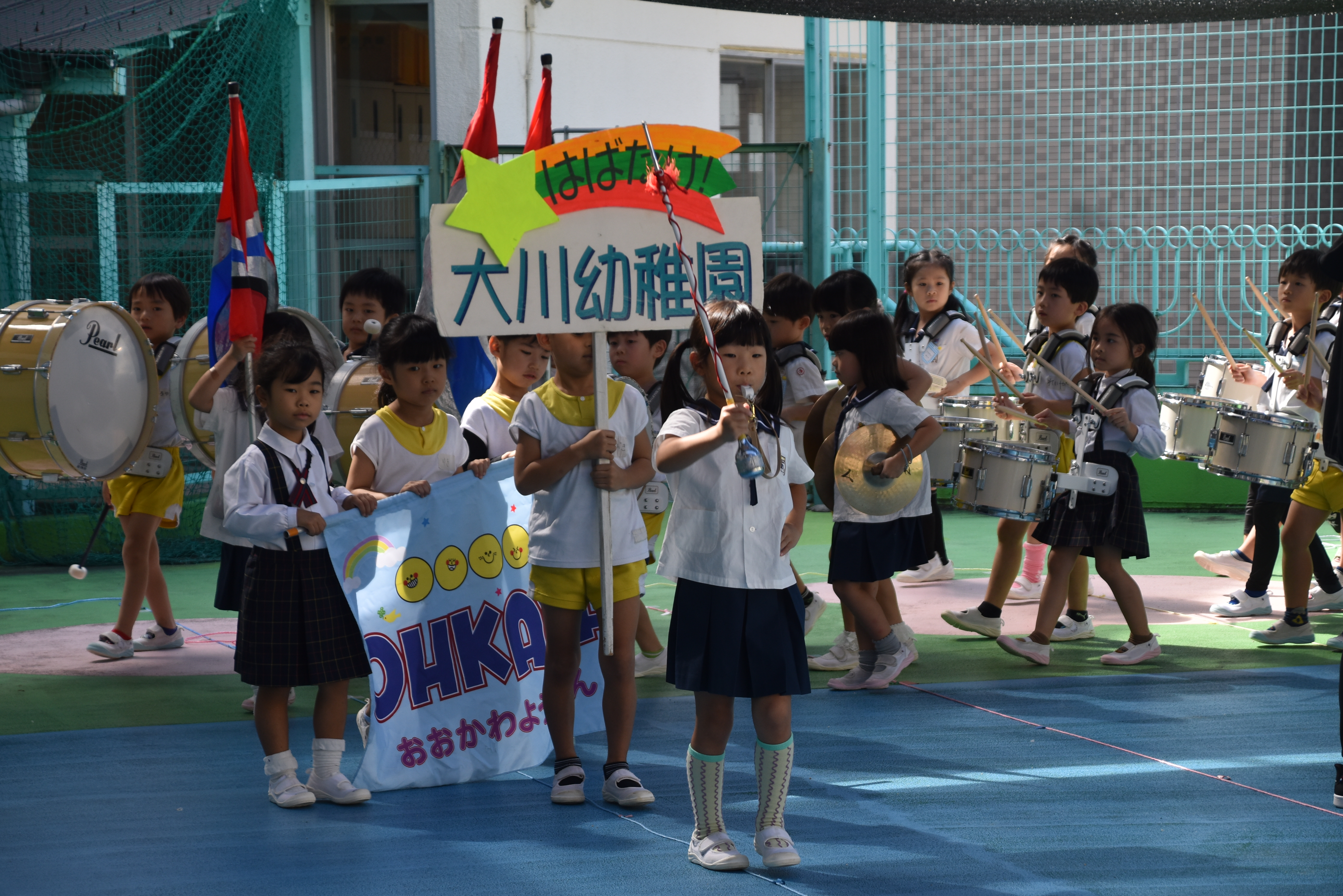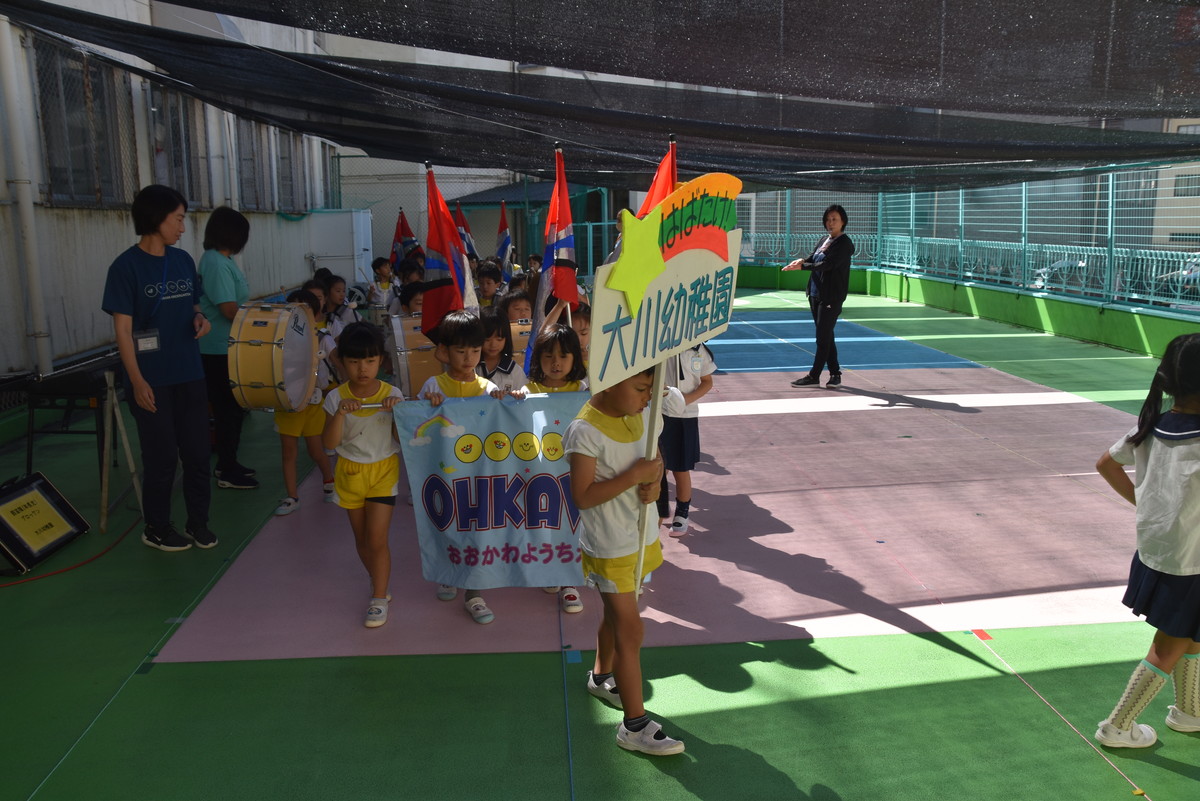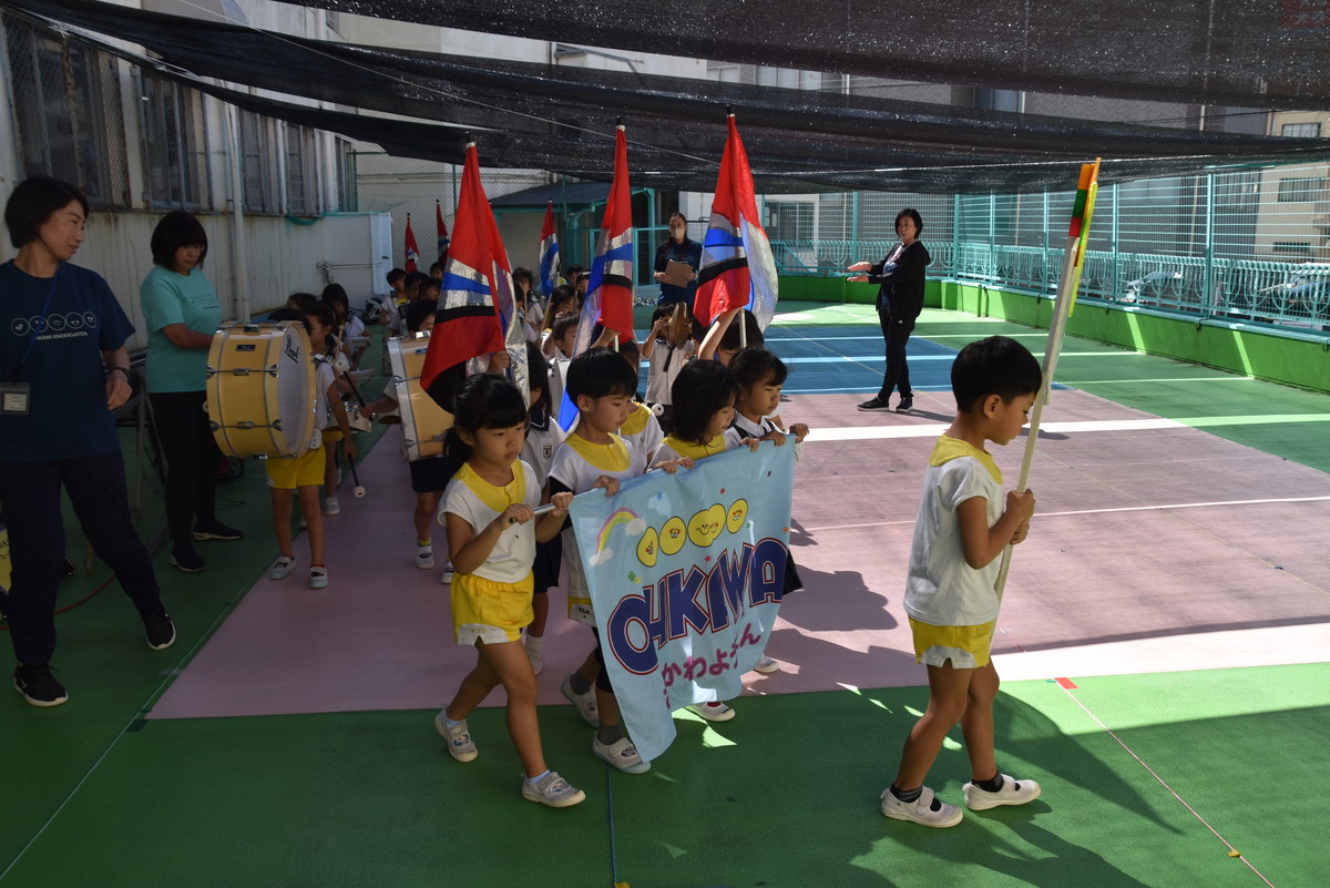 大川幼稚園は、年長児が「鼓笛隊演奏」で出場します。津まつりで、初めての鼓笛隊演奏を披露するので、子どもたちはとても張り切っています♪ とっても上手に演奏できるようになってきたので、昨日と今日は演奏しながら行進をする練習をしましたよ。歩きながら重い楽器を持って演奏するのは本当に大変だと思いますが、疲れを見せずに集中して演奏してくれました。
