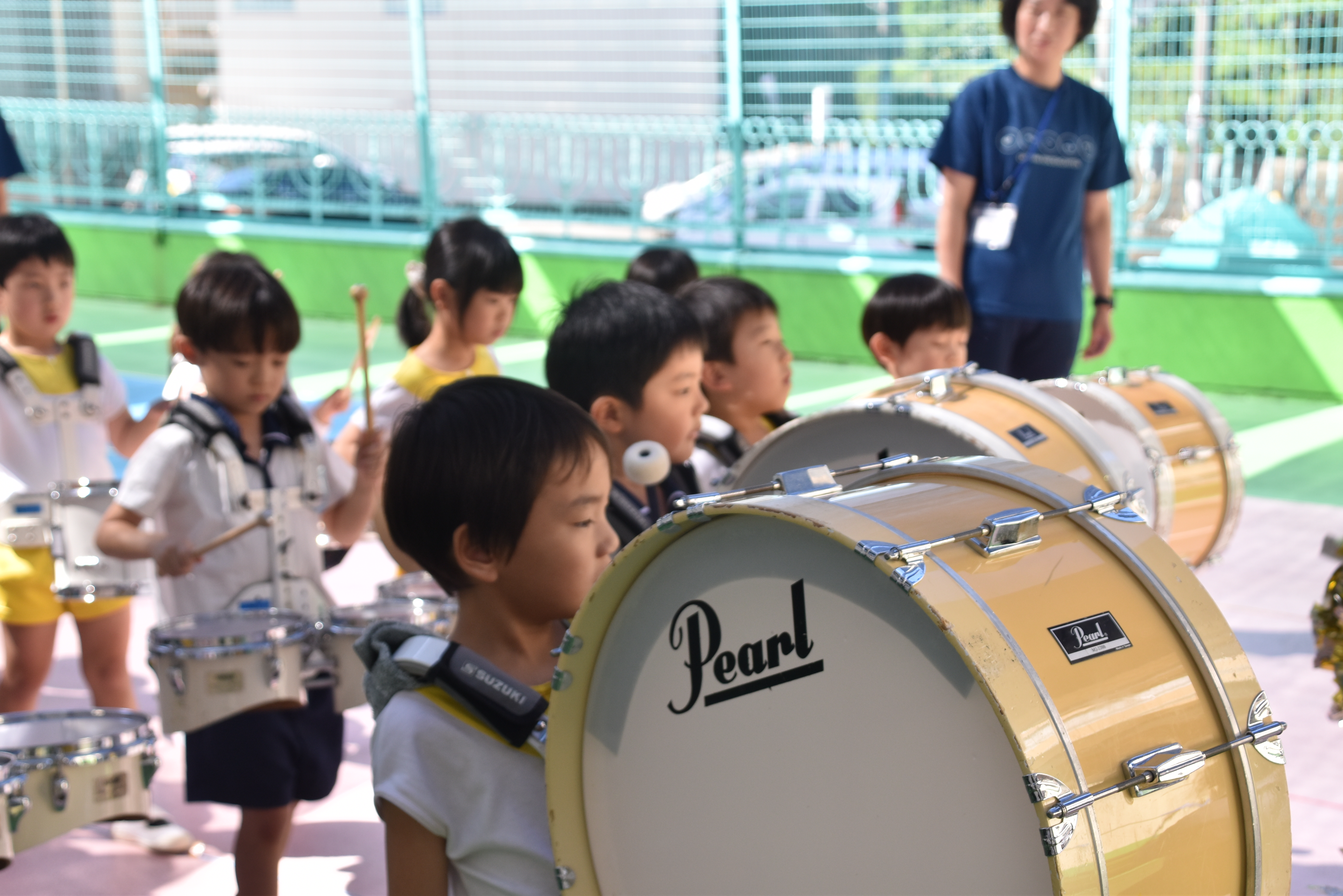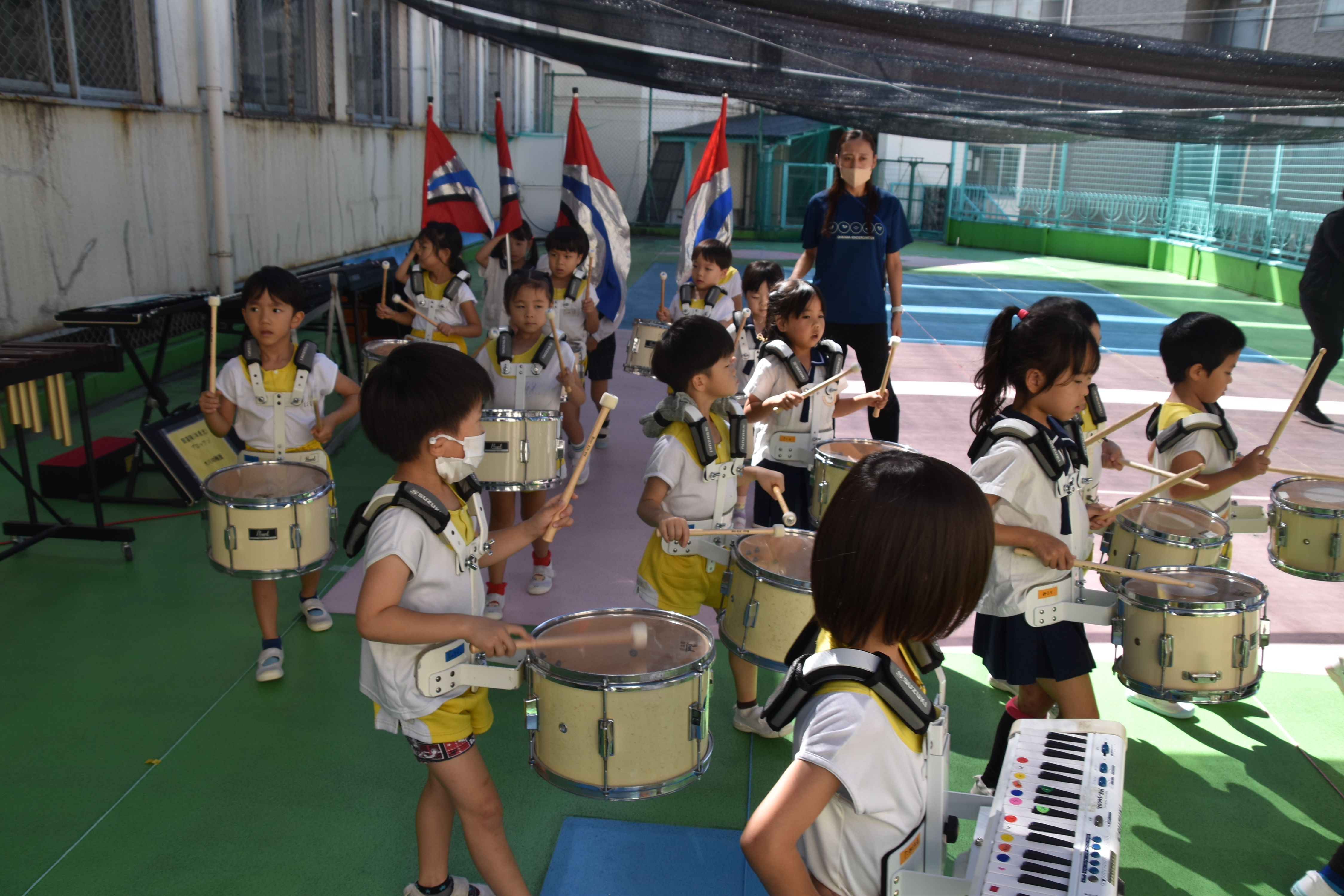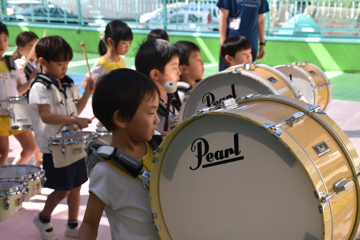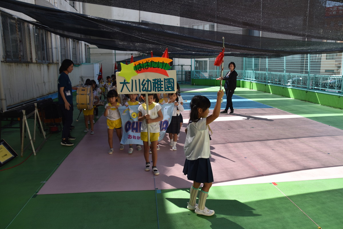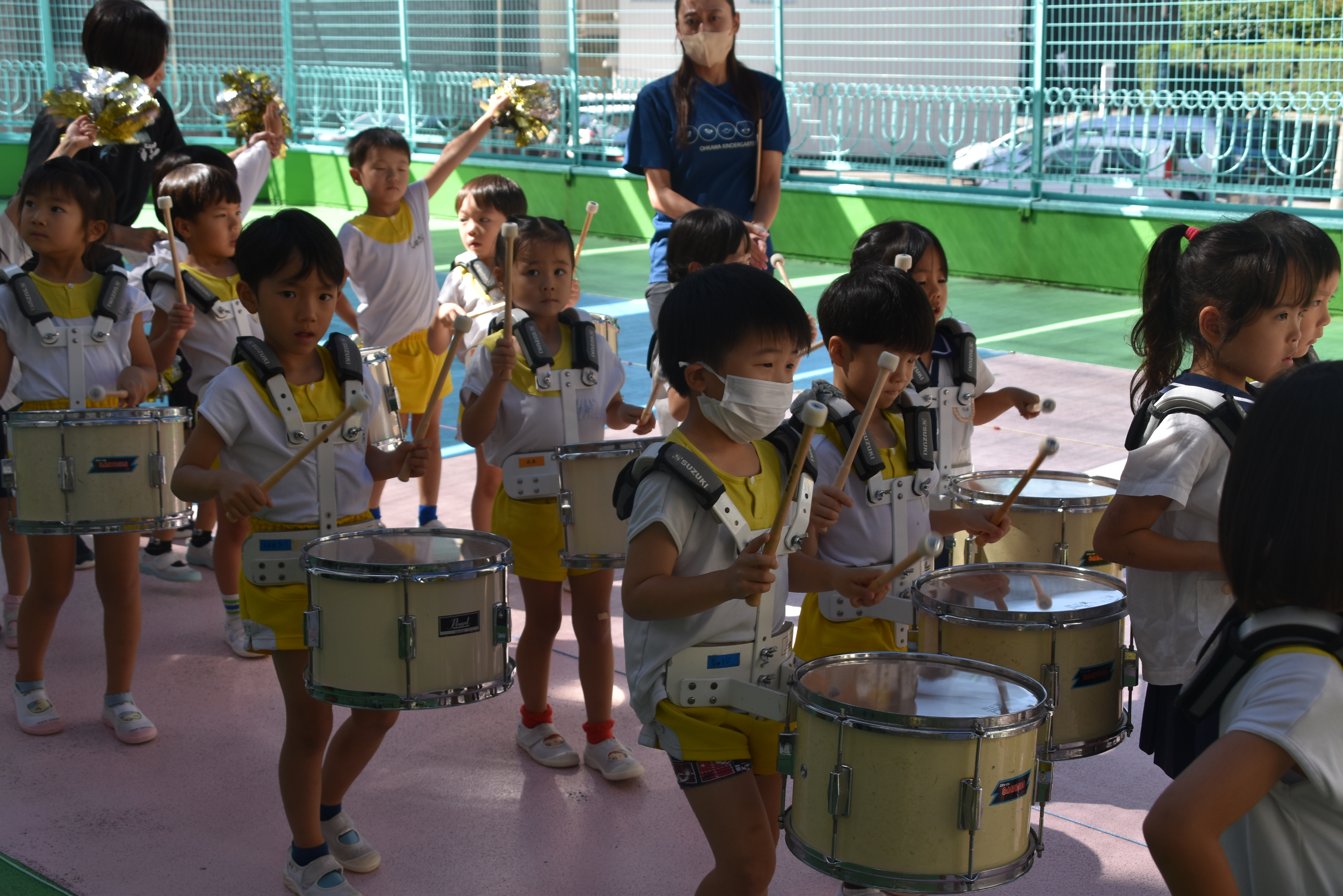 大川幼稚園は、年長児が「鼓笛隊演奏」で出場します。津まつりで、初めての鼓笛隊演奏を披露するので、子どもたちはとても張り切っています♪ とっても上手に演奏できるようになってきたので、昨日と今日は演奏しながら行進をする練習をしましたよ。歩きながら重い楽器を持って演奏するのは本当に大変だと思いますが、疲れを見せずに集中して演奏してくれました。