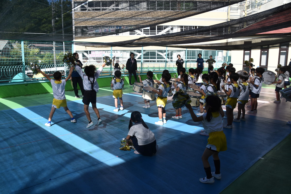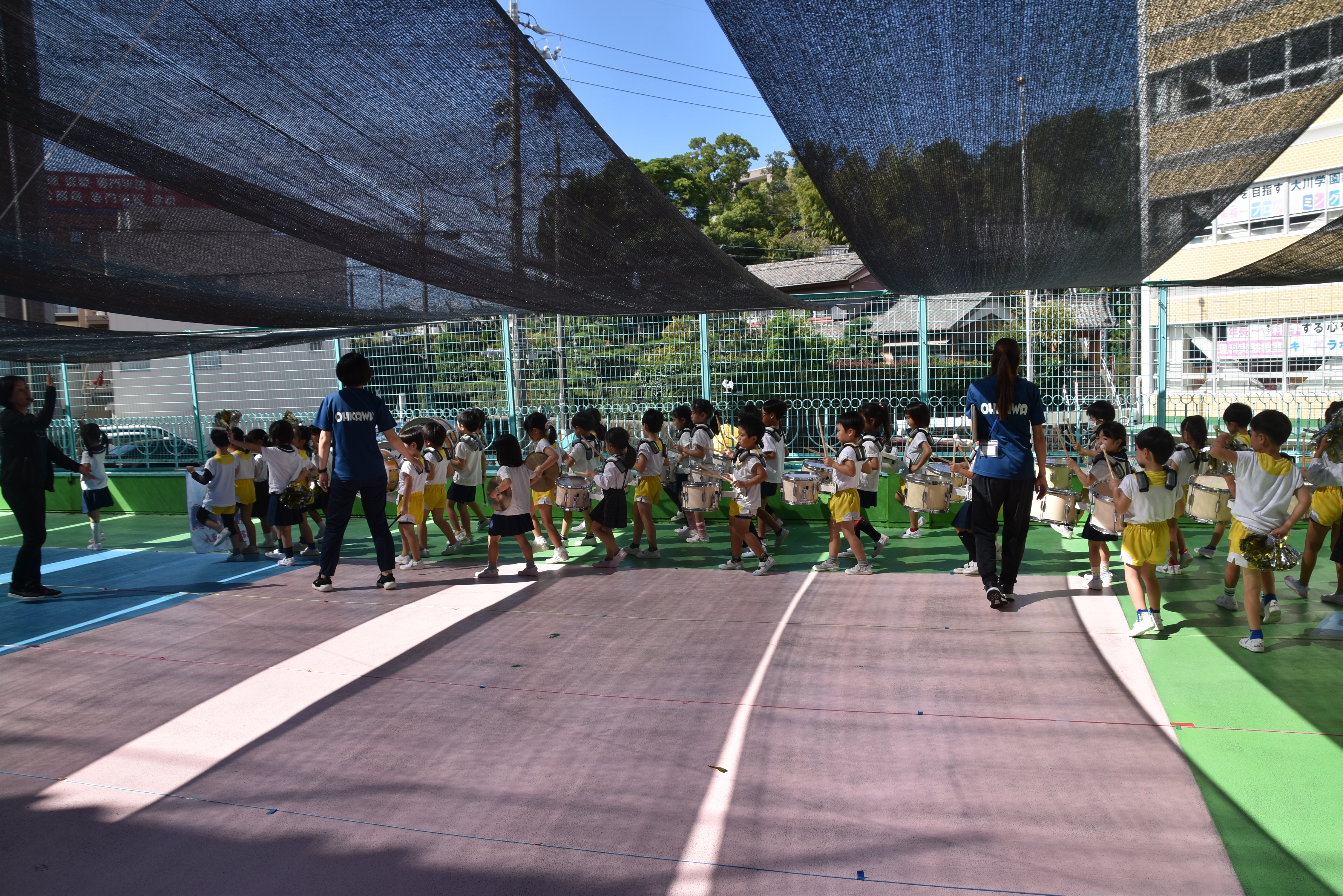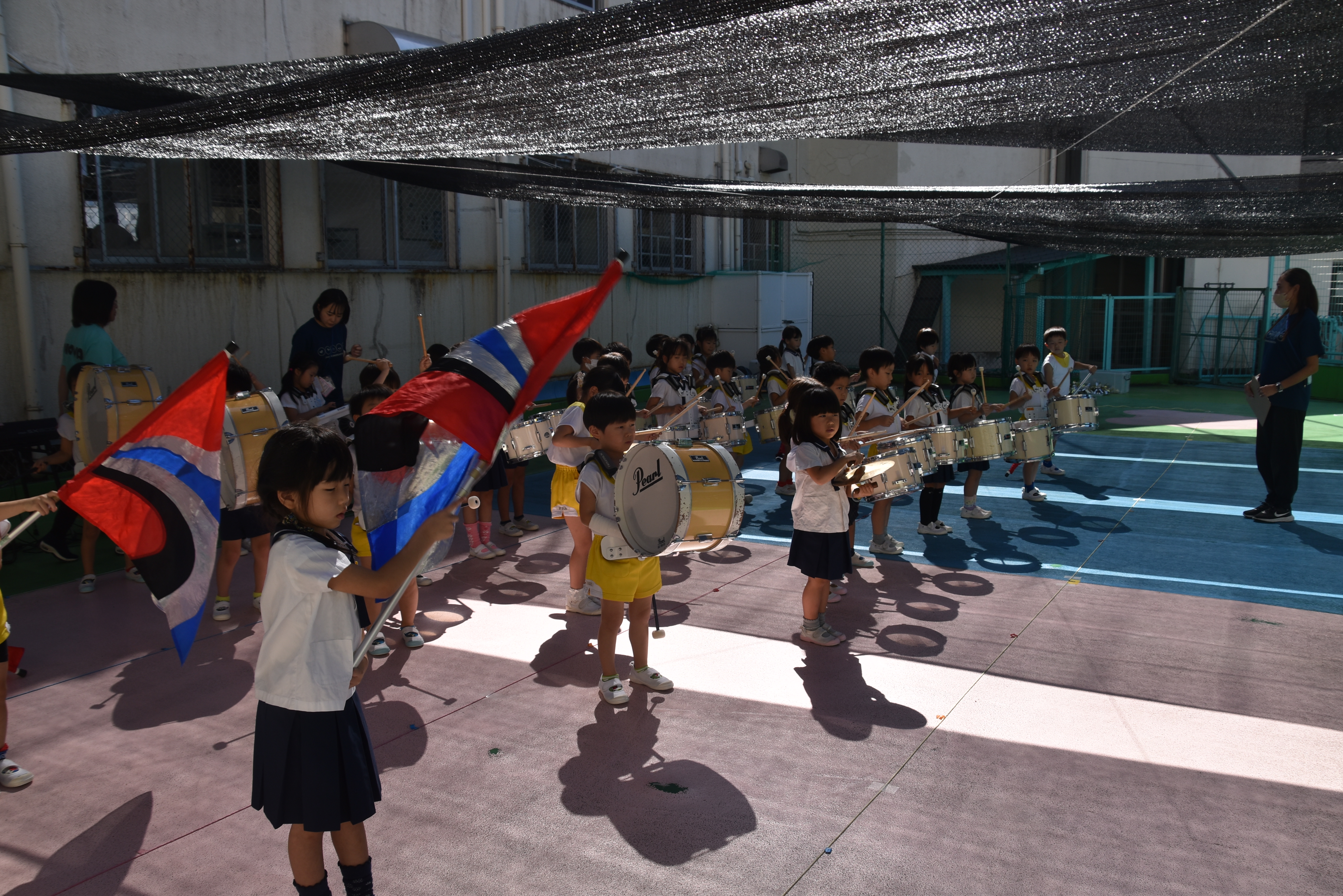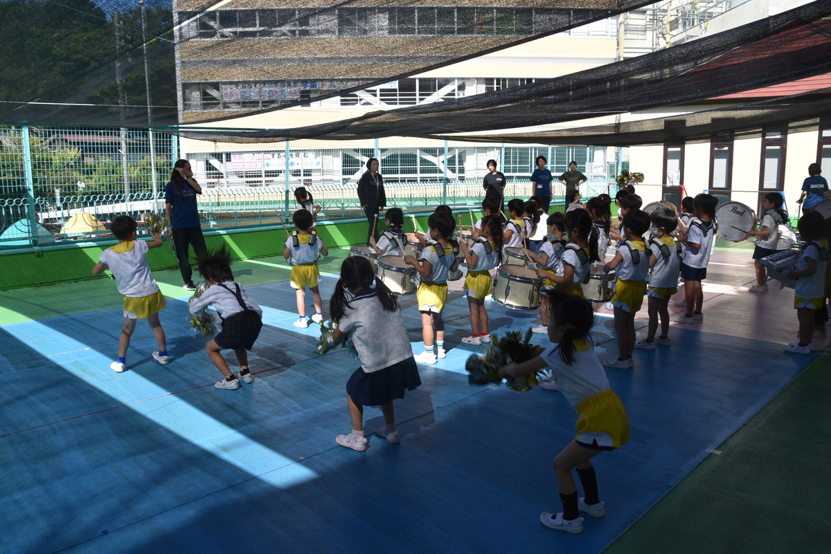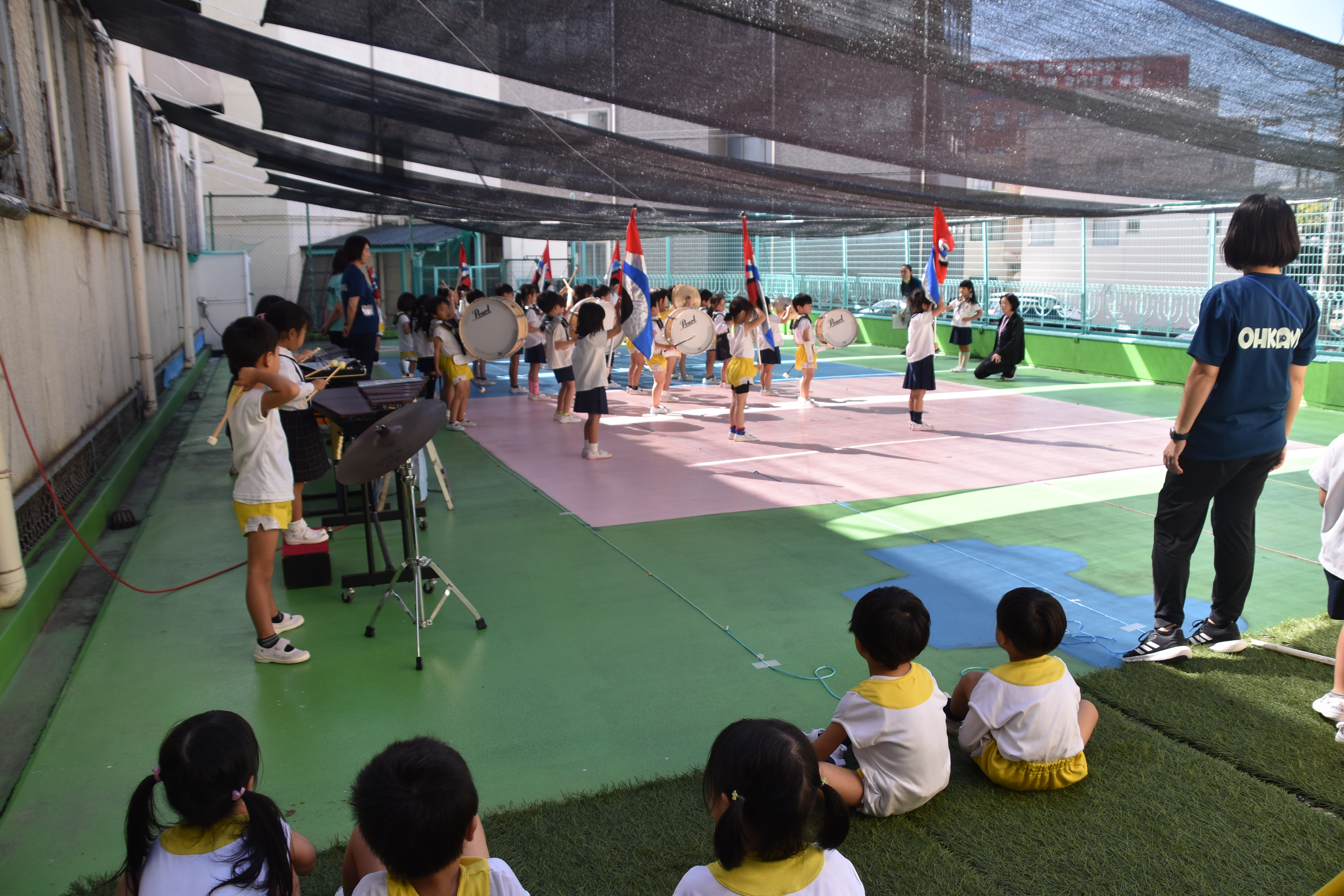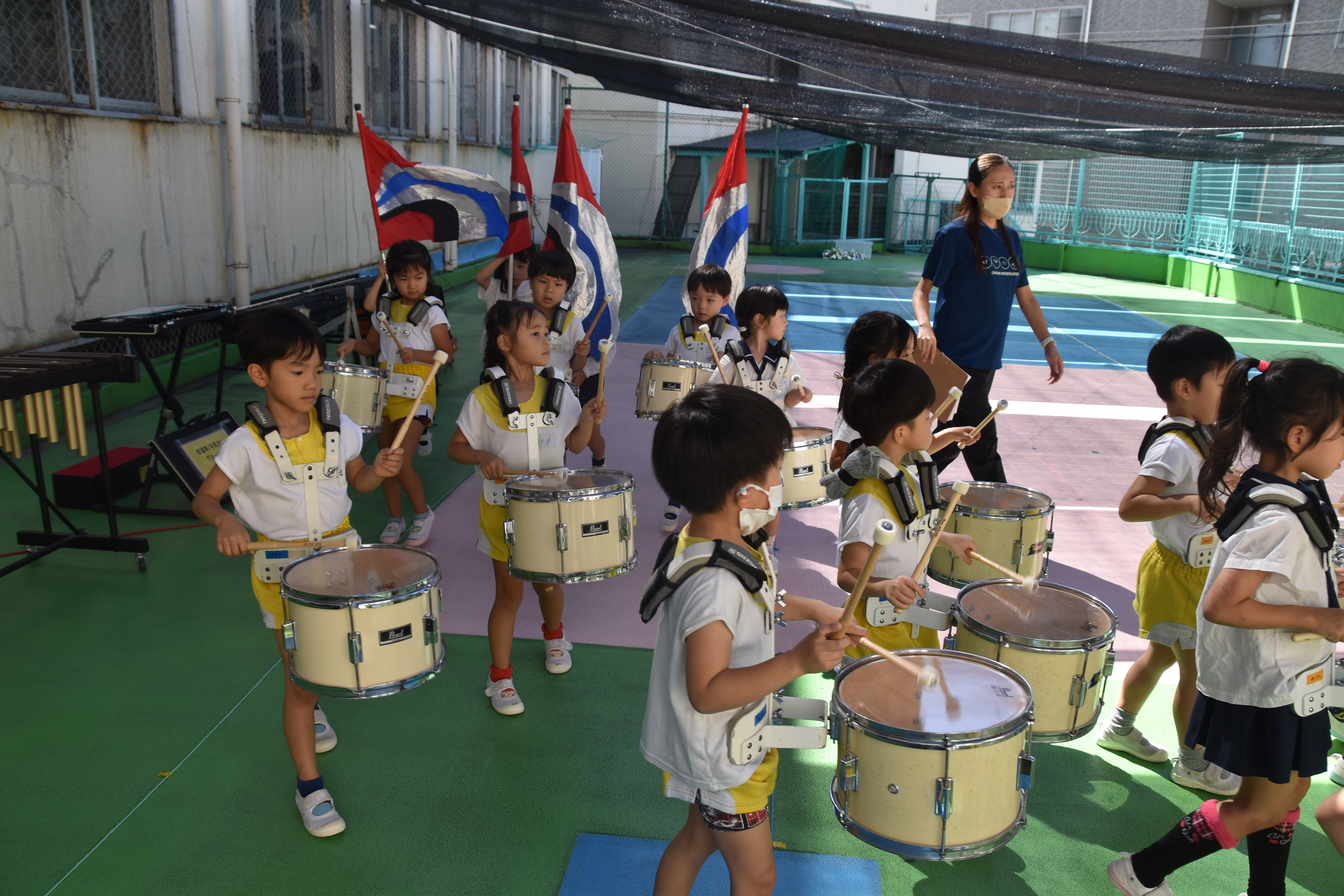 大川幼稚園は、年長児が「鼓笛隊演奏」で出場します。津まつりで、初めての鼓笛隊演奏を披露するので、子どもたちはとても張り切っています♪ とっても上手に演奏できるようになってきたので、昨日と今日は演奏しながら行進をする練習をしましたよ。歩きながら重い楽器を持って演奏するのは本当に大変だと思いますが、疲れを見せずに集中して演奏してくれました。