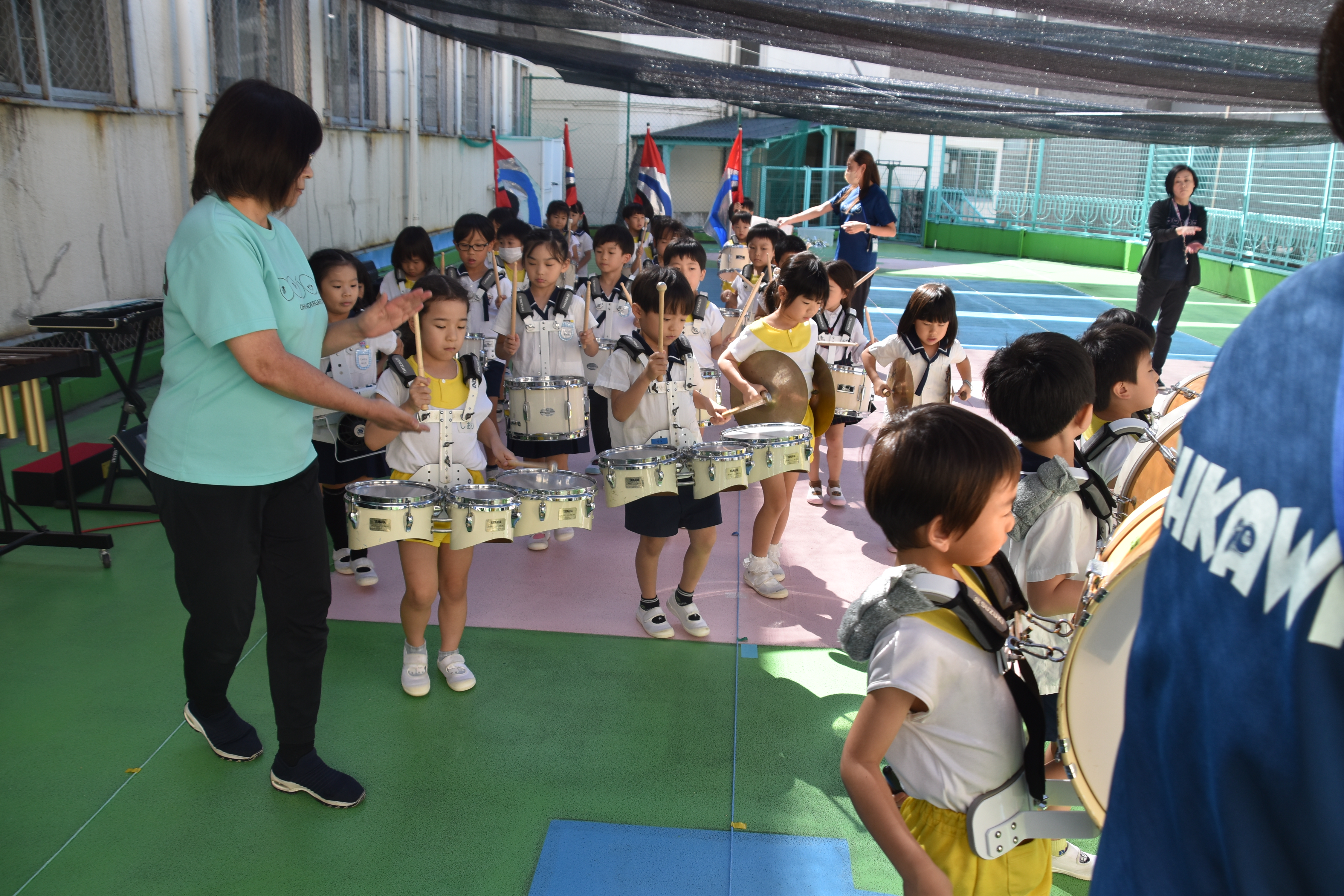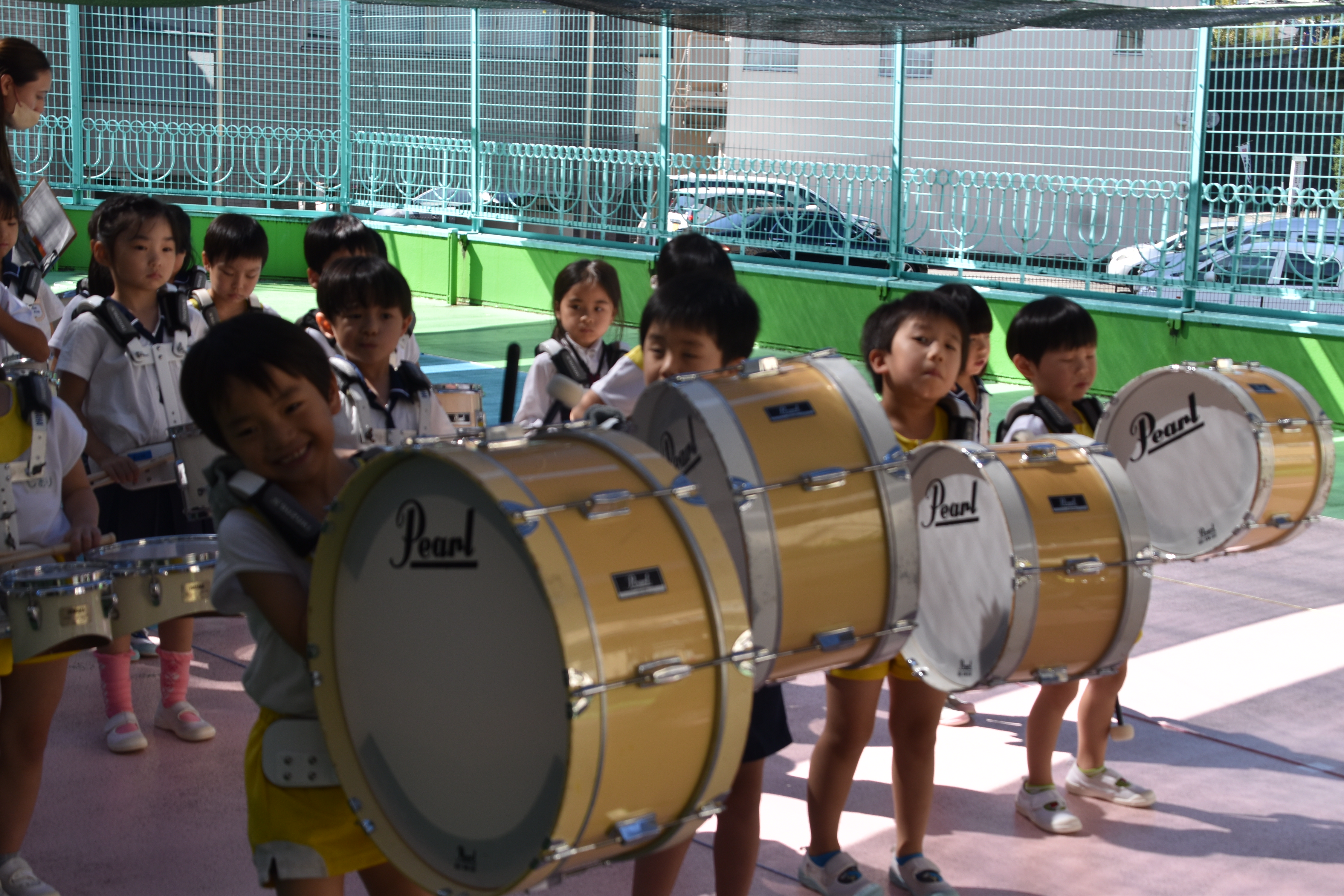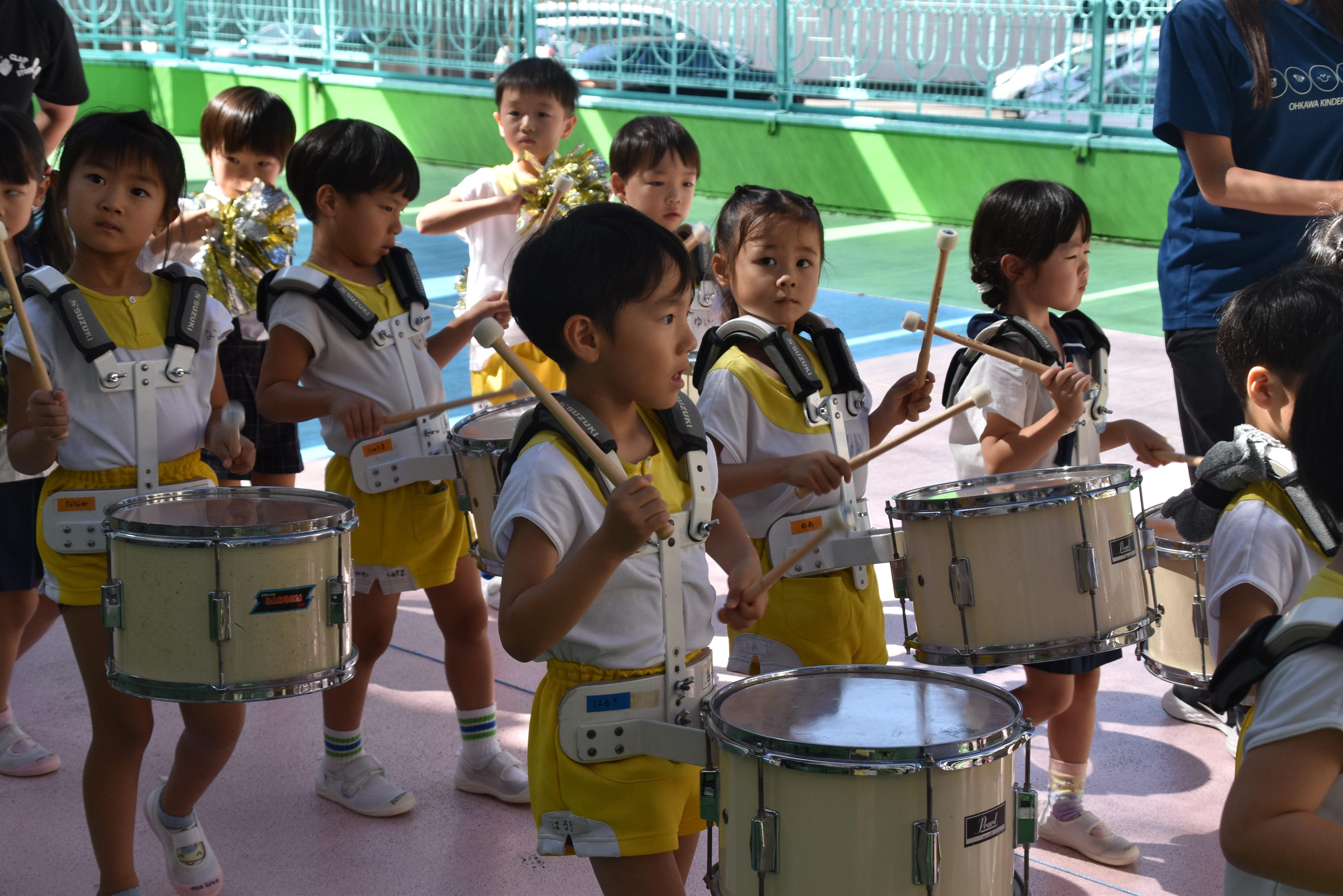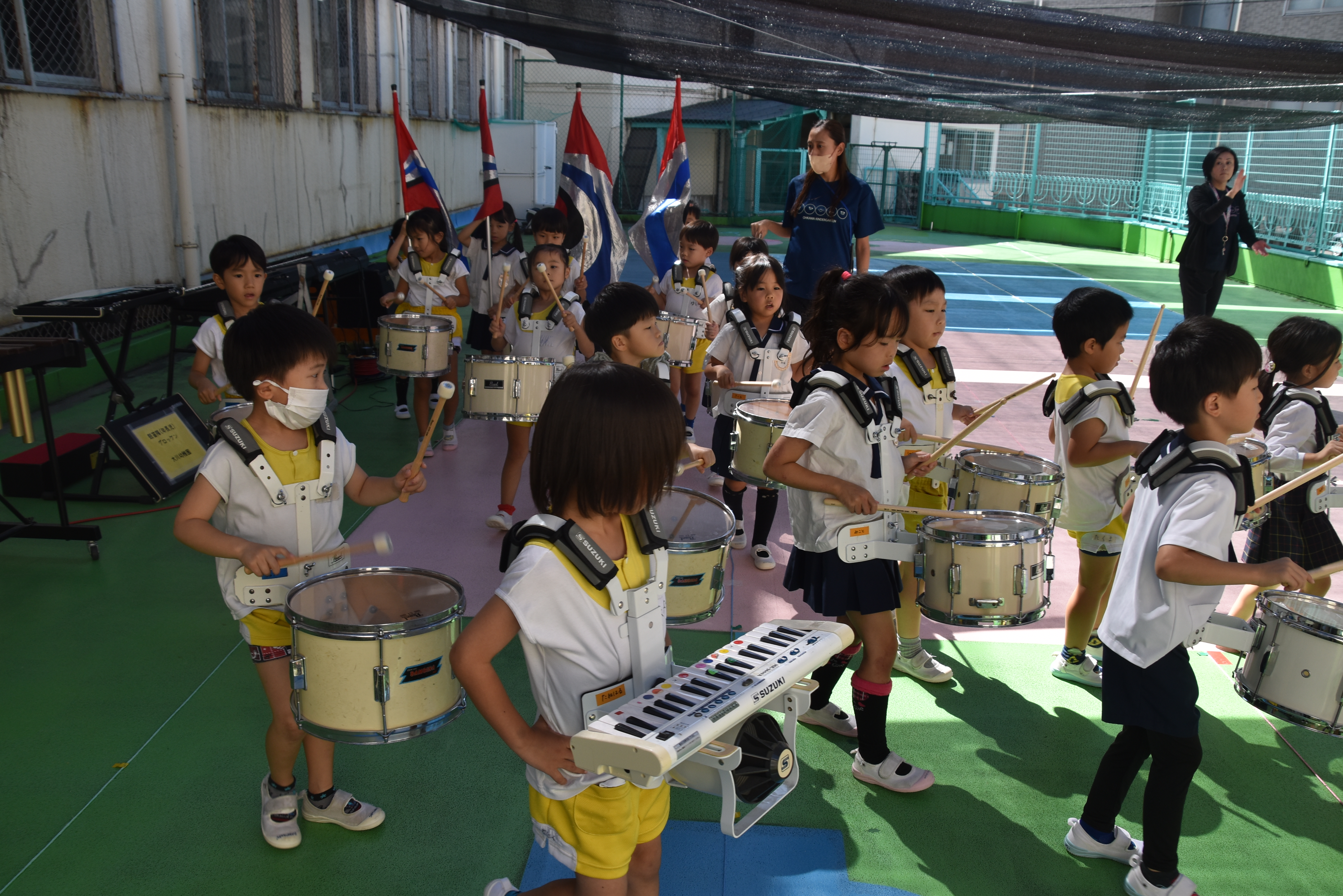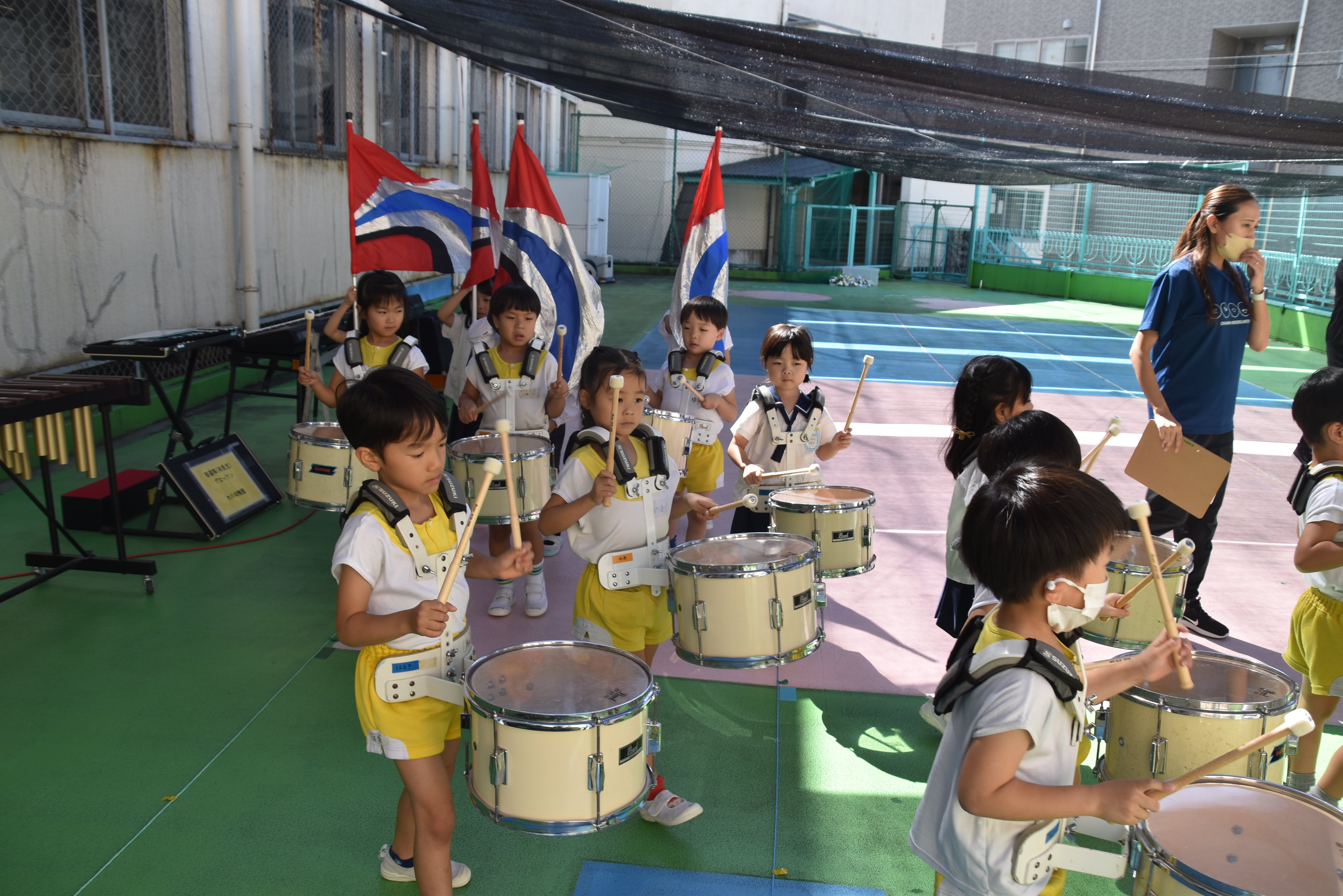 大川幼稚園は、年長児が「鼓笛隊演奏」で出場します。津まつりで、初めての鼓笛隊演奏を披露するので、子どもたちはとても張り切っています♪ とっても上手に演奏できるようになってきたので、昨日と今日は演奏しながら行進をする練習をしましたよ。歩きながら重い楽器を持って演奏するのは本当に大変だと思いますが、疲れを見せずに集中して演奏してくれました。