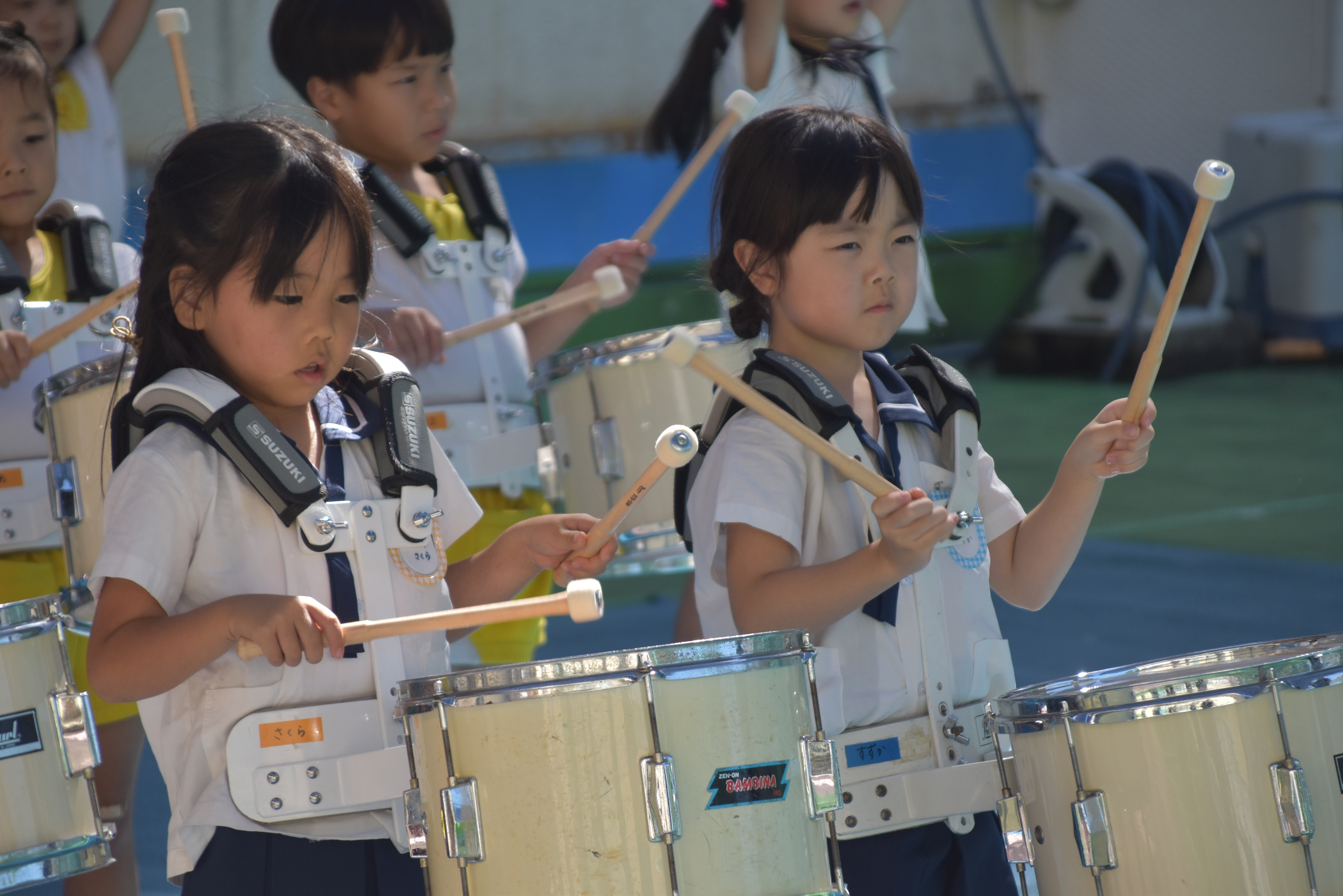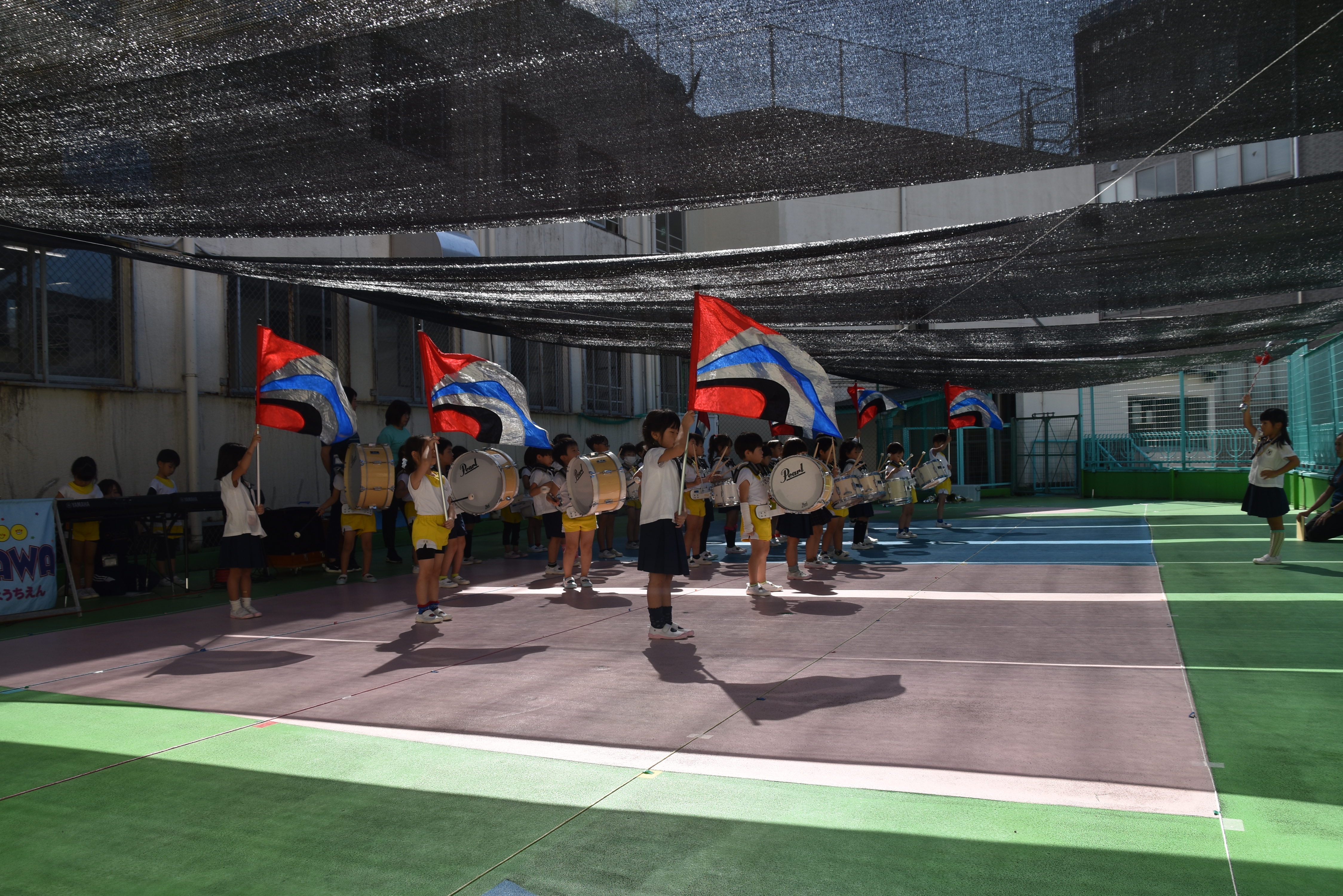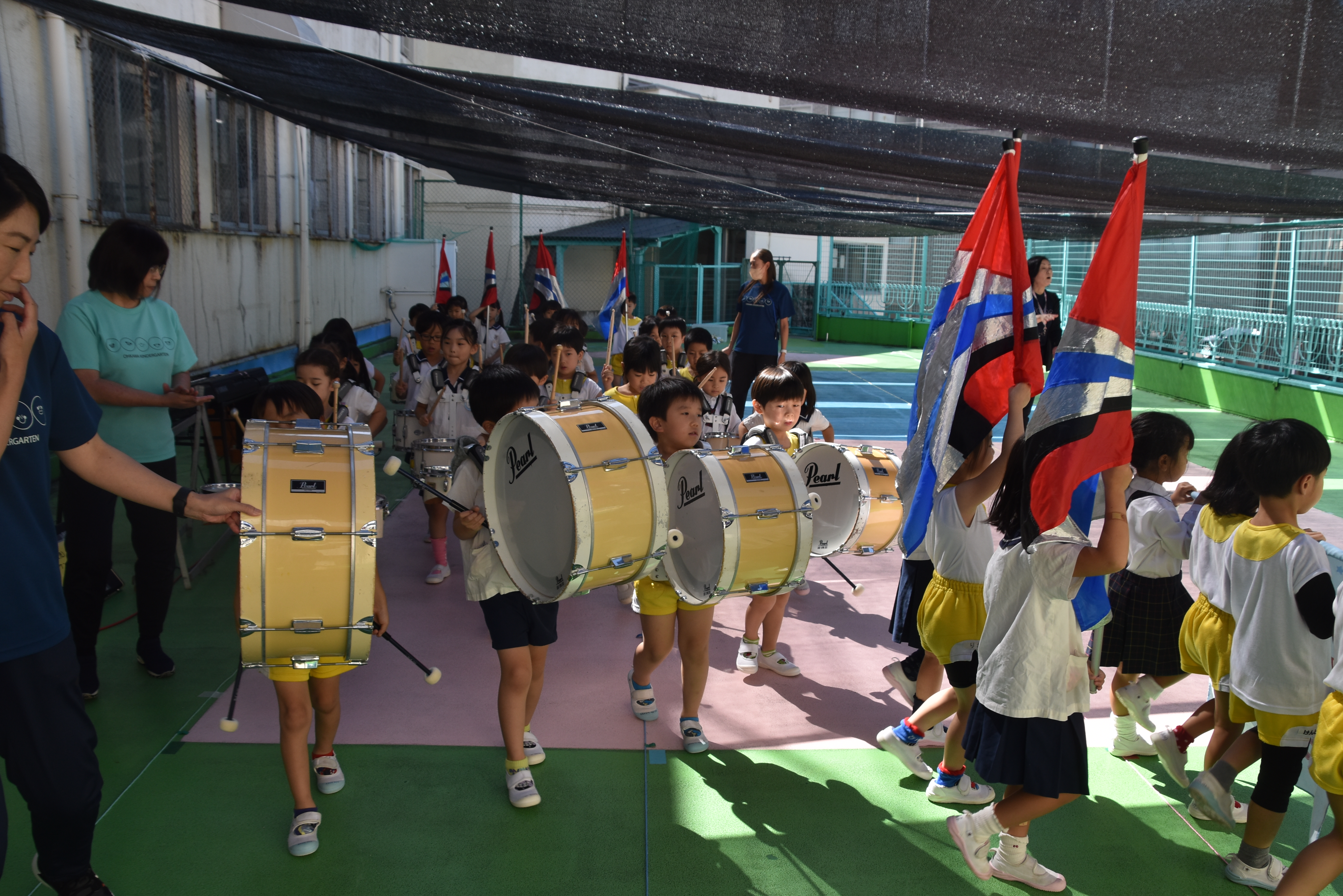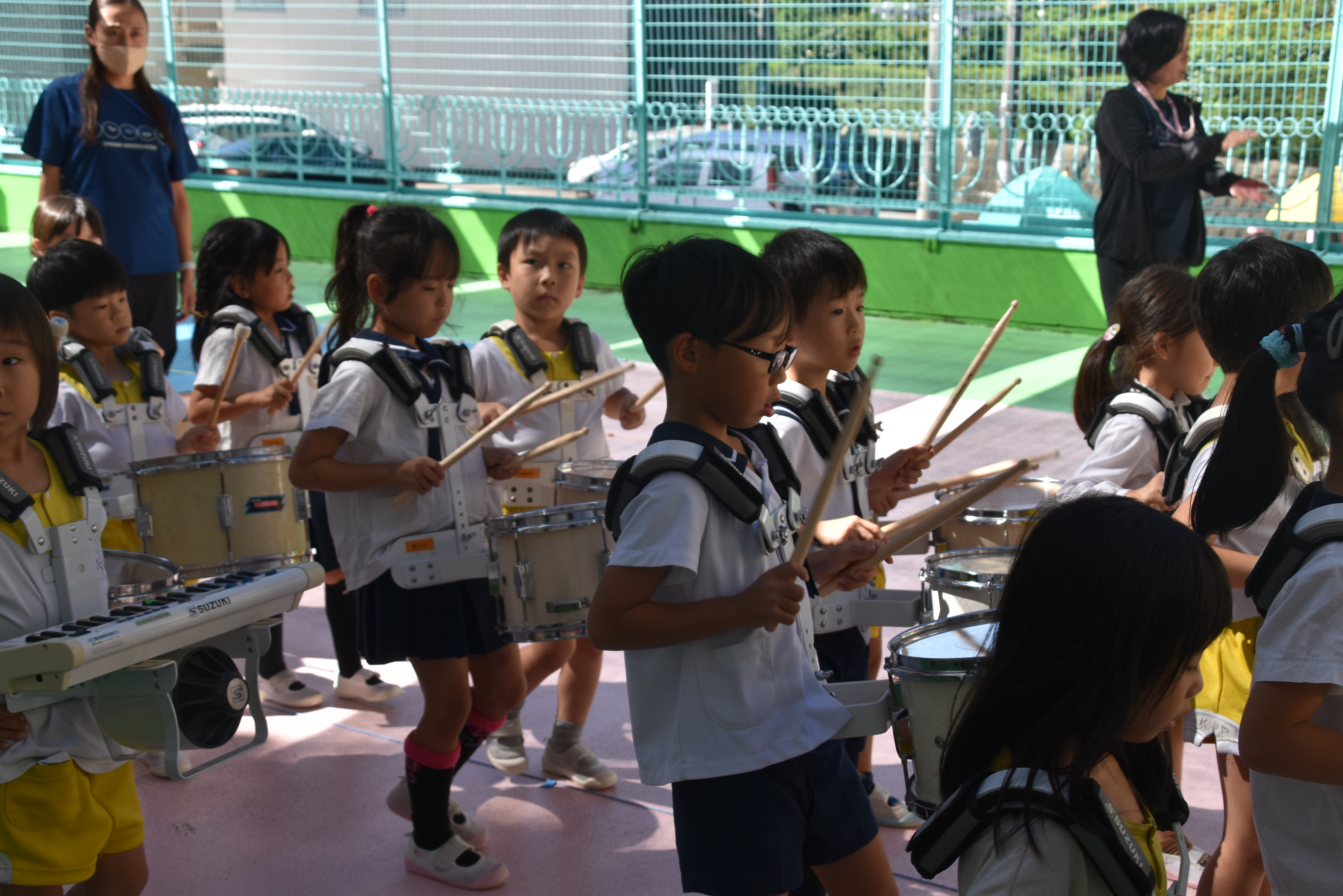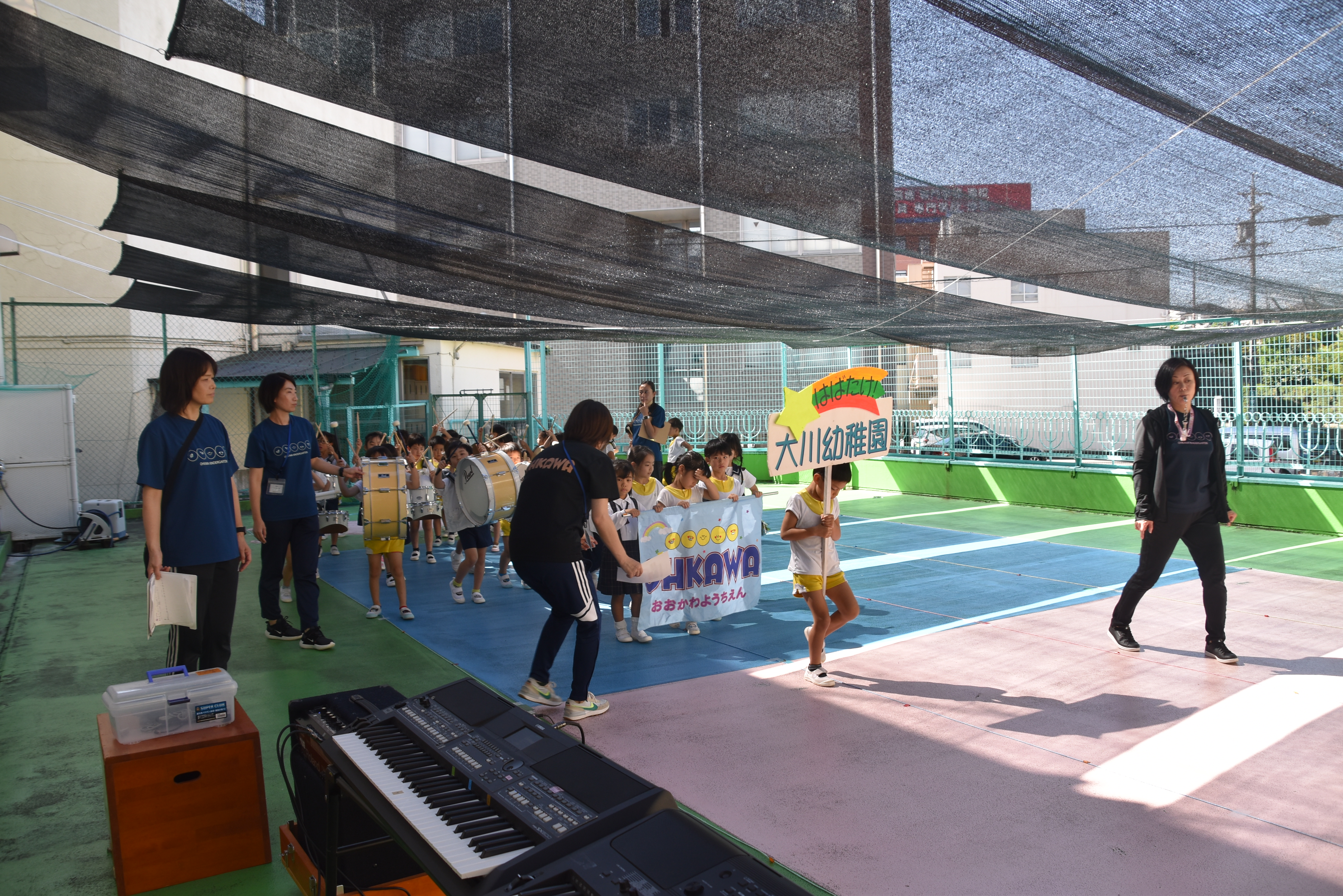 大川幼稚園は、年長児が「鼓笛隊演奏」で出場します。津まつりで、初めての鼓笛隊演奏を披露するので、子どもたちはとても張り切っています♪ とっても上手に演奏できるようになってきたので、昨日と今日は演奏しながら行進をする練習をしましたよ。歩きながら重い楽器を持って演奏するのは本当に大変だと思いますが、疲れを見せずに集中して演奏してくれました。