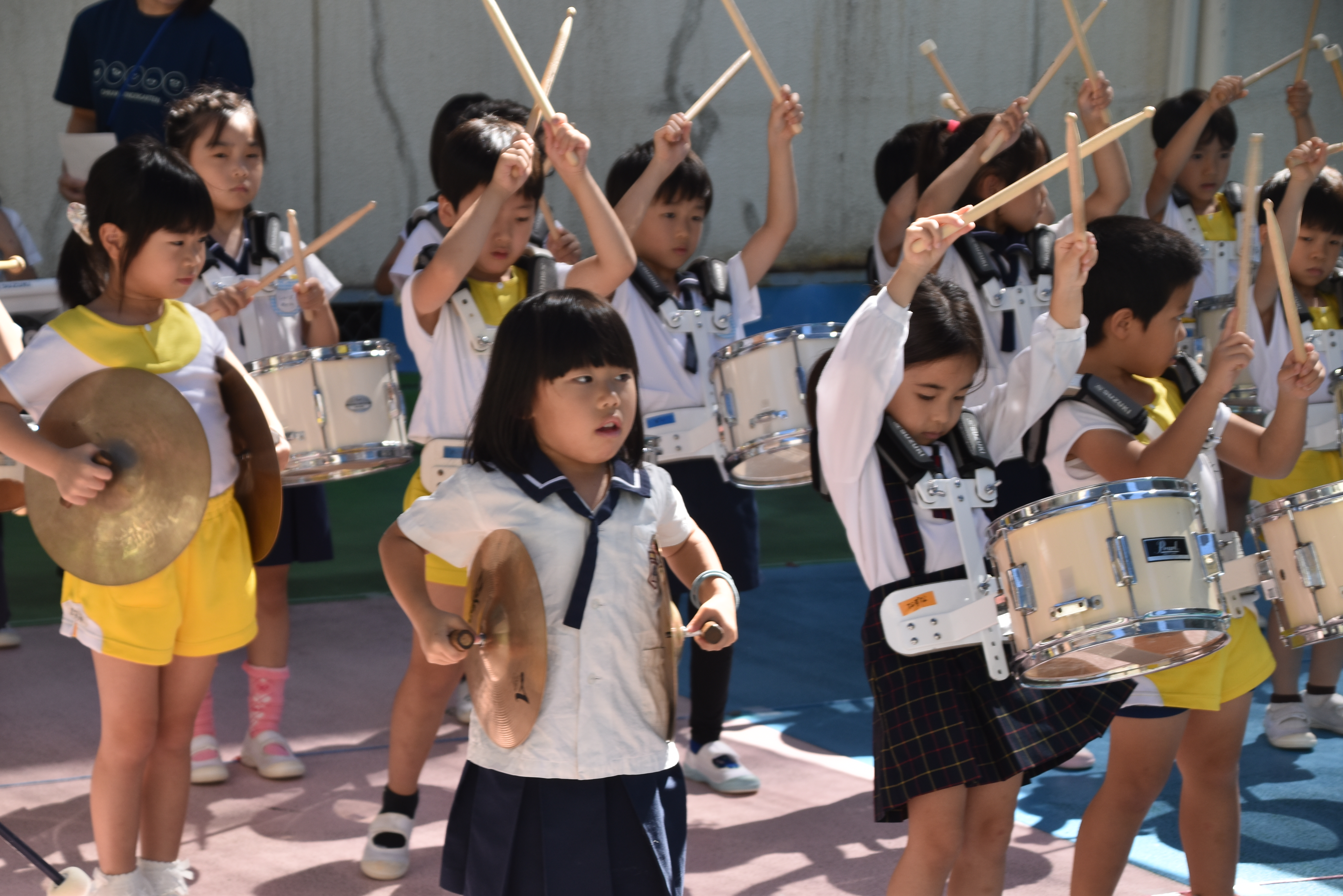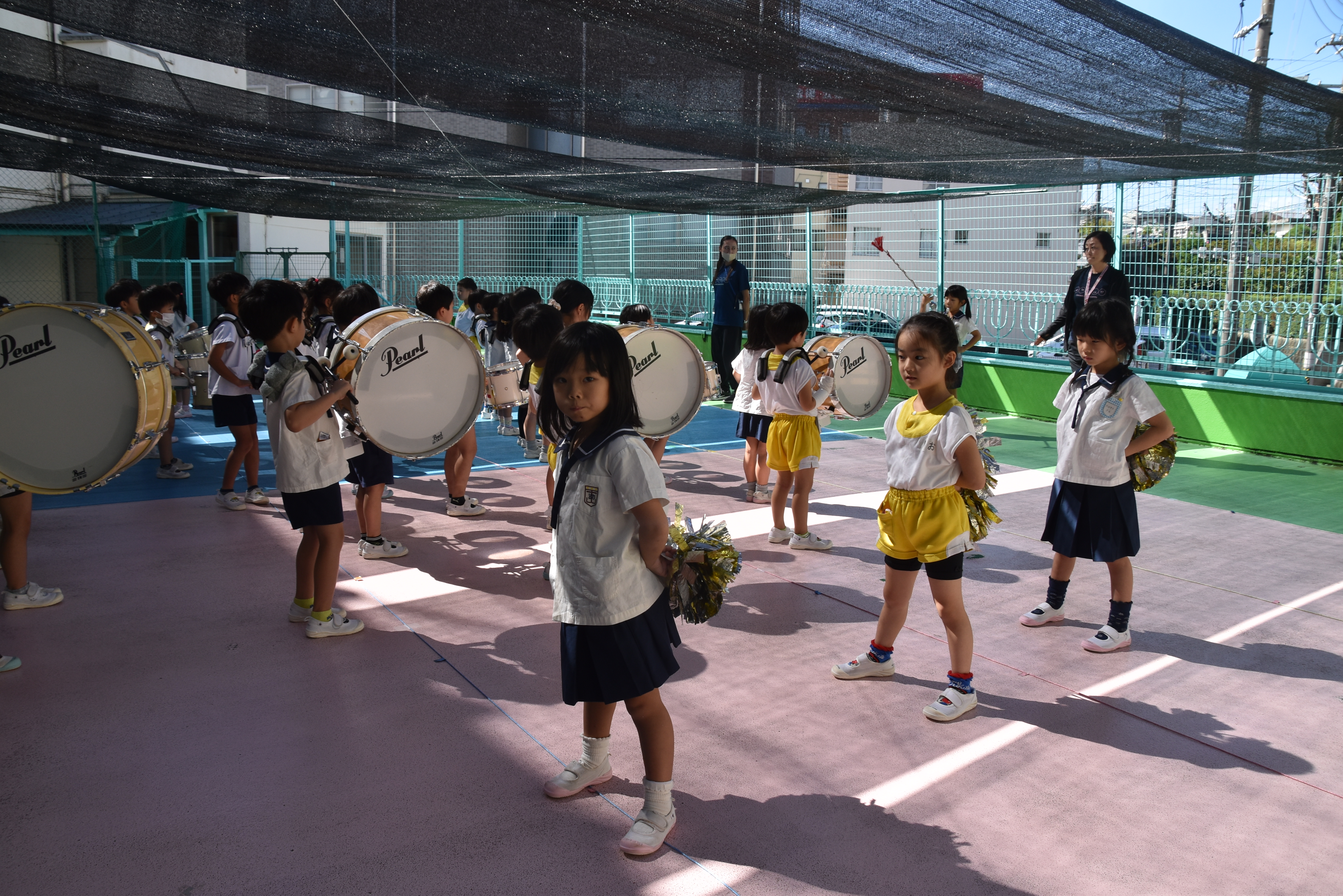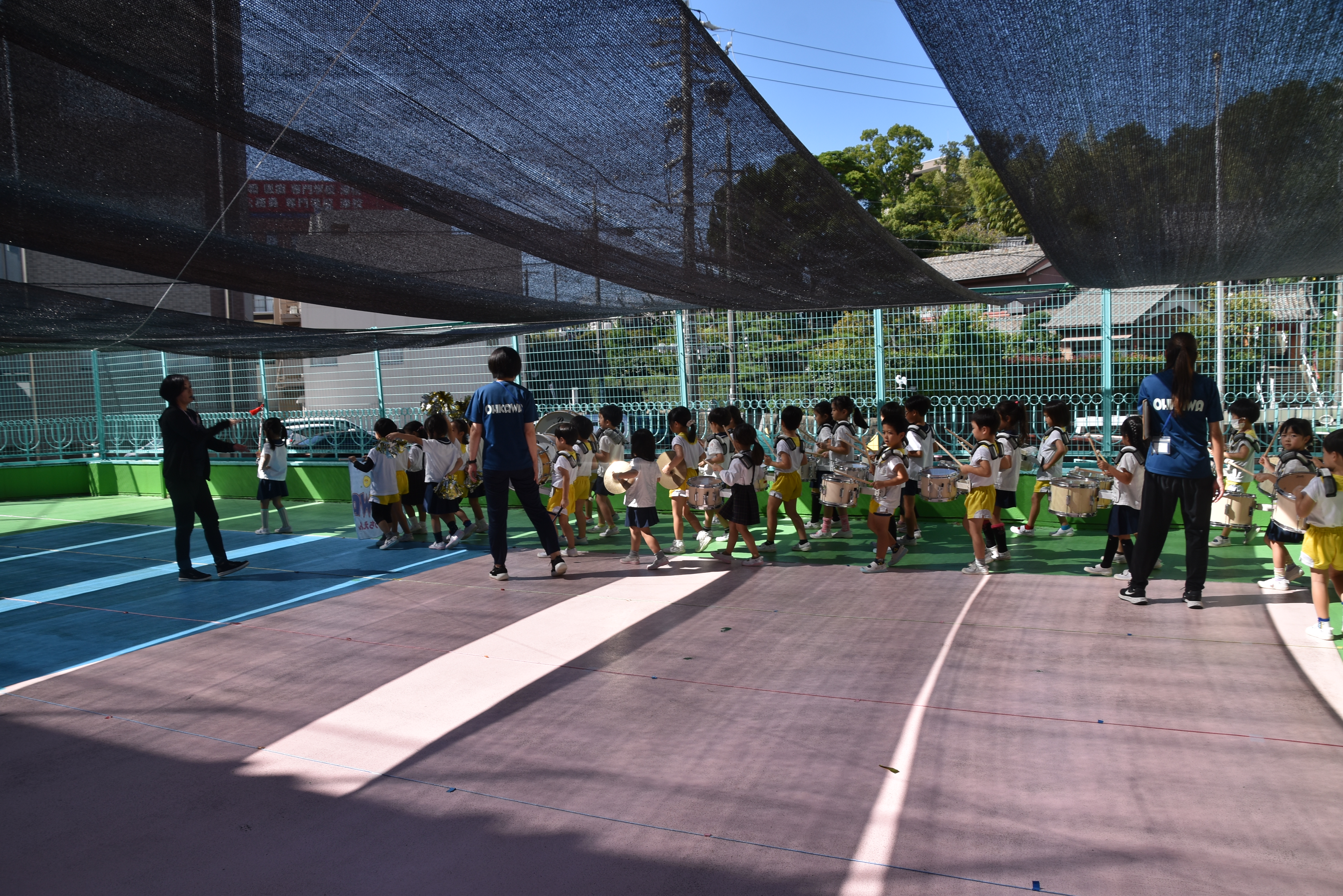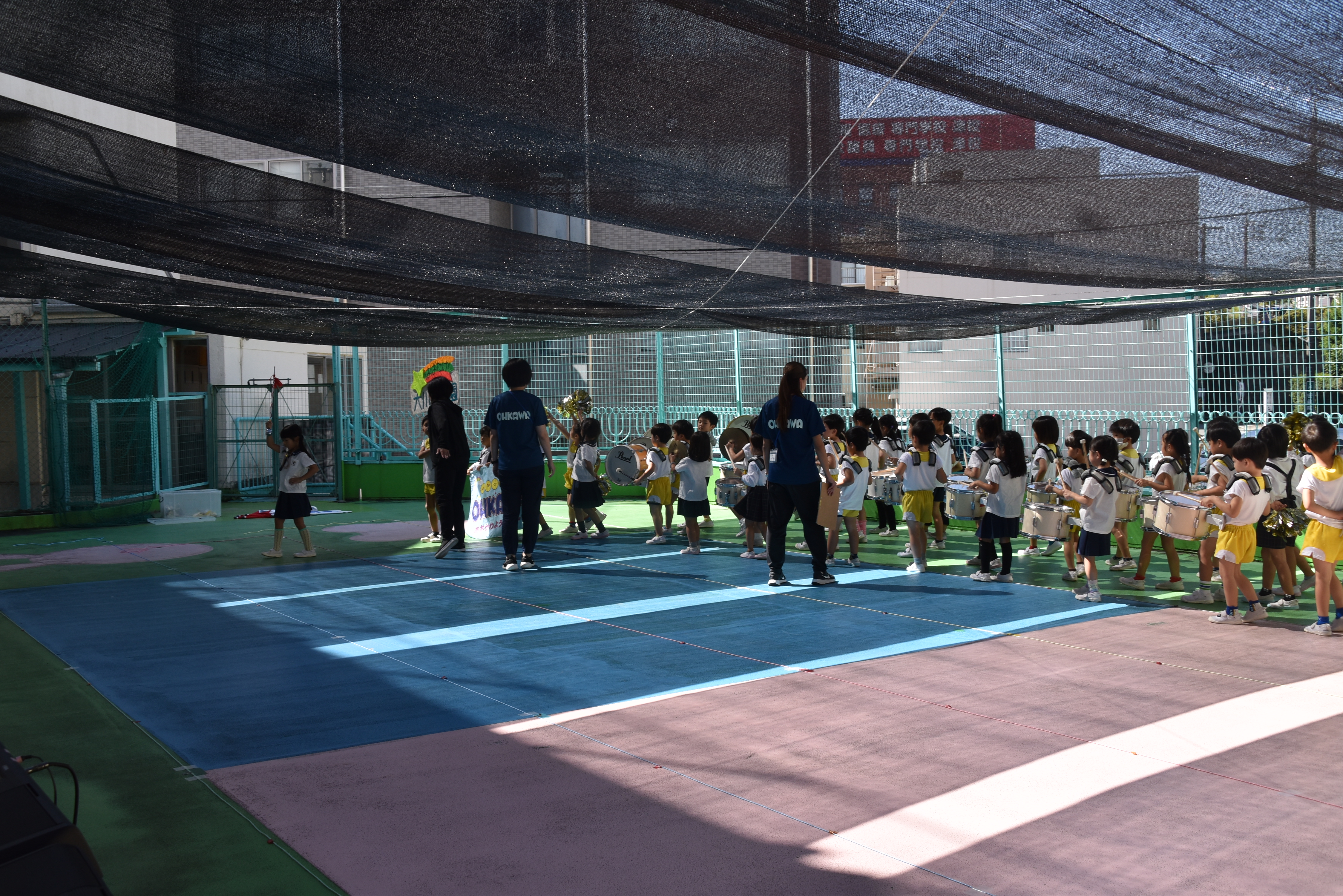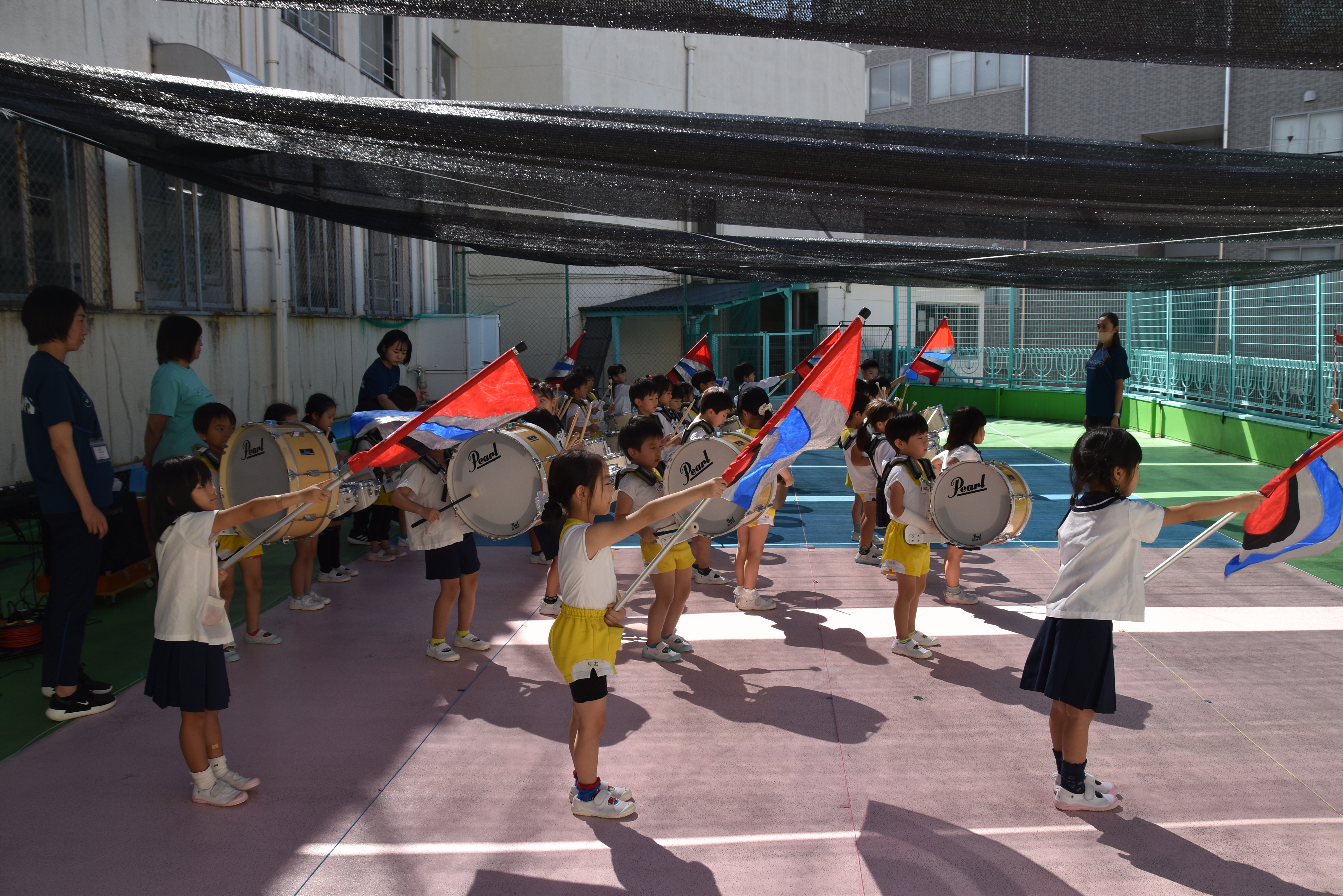 大川幼稚園は、年長児が「鼓笛隊演奏」で出場します。津まつりで、初めての鼓笛隊演奏を披露するので、子どもたちはとても張り切っています♪ とっても上手に演奏できるようになってきたので、昨日と今日は演奏しながら行進をする練習をしましたよ。歩きながら重い楽器を持って演奏するのは本当に大変だと思いますが、疲れを見せずに集中して演奏してくれました。