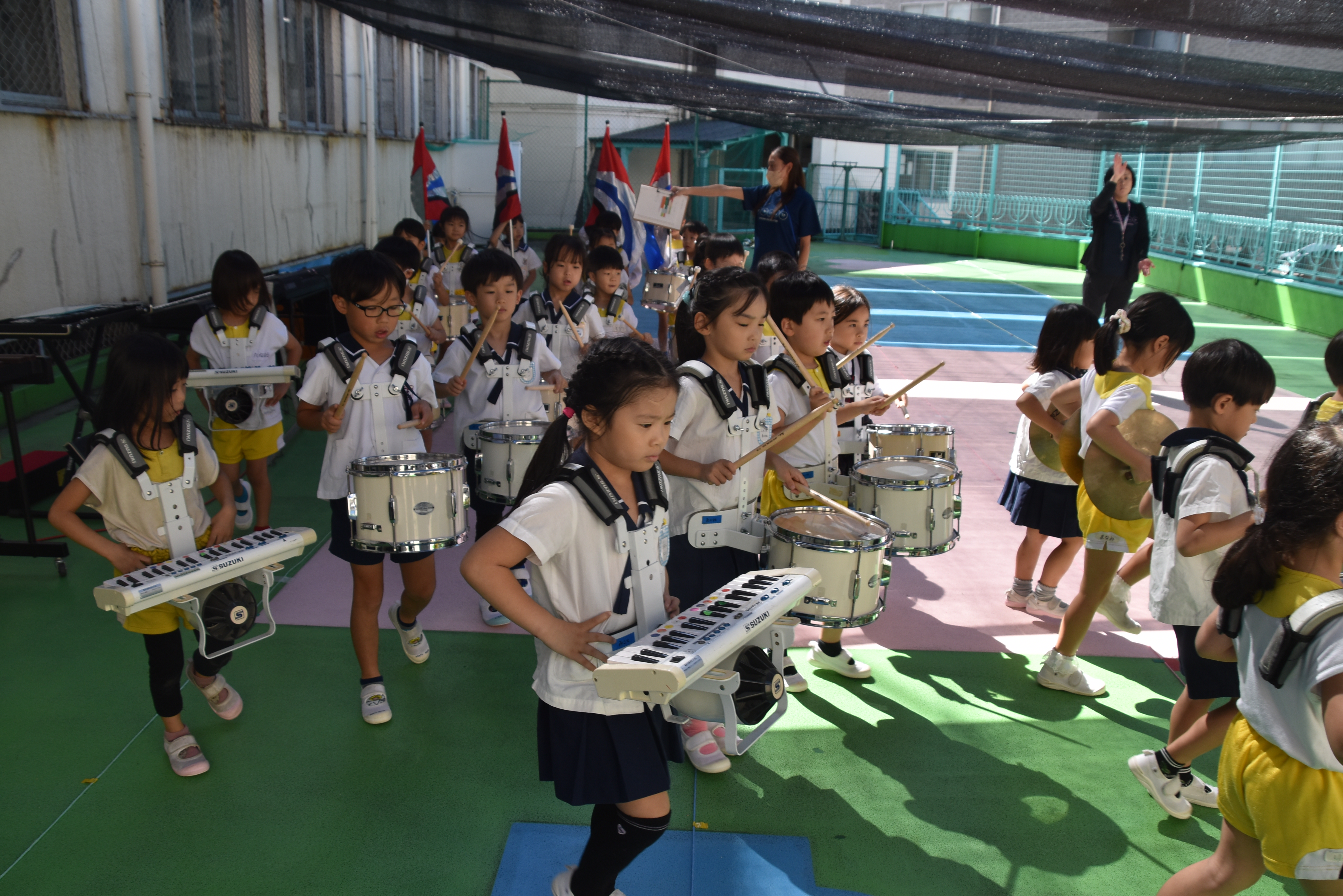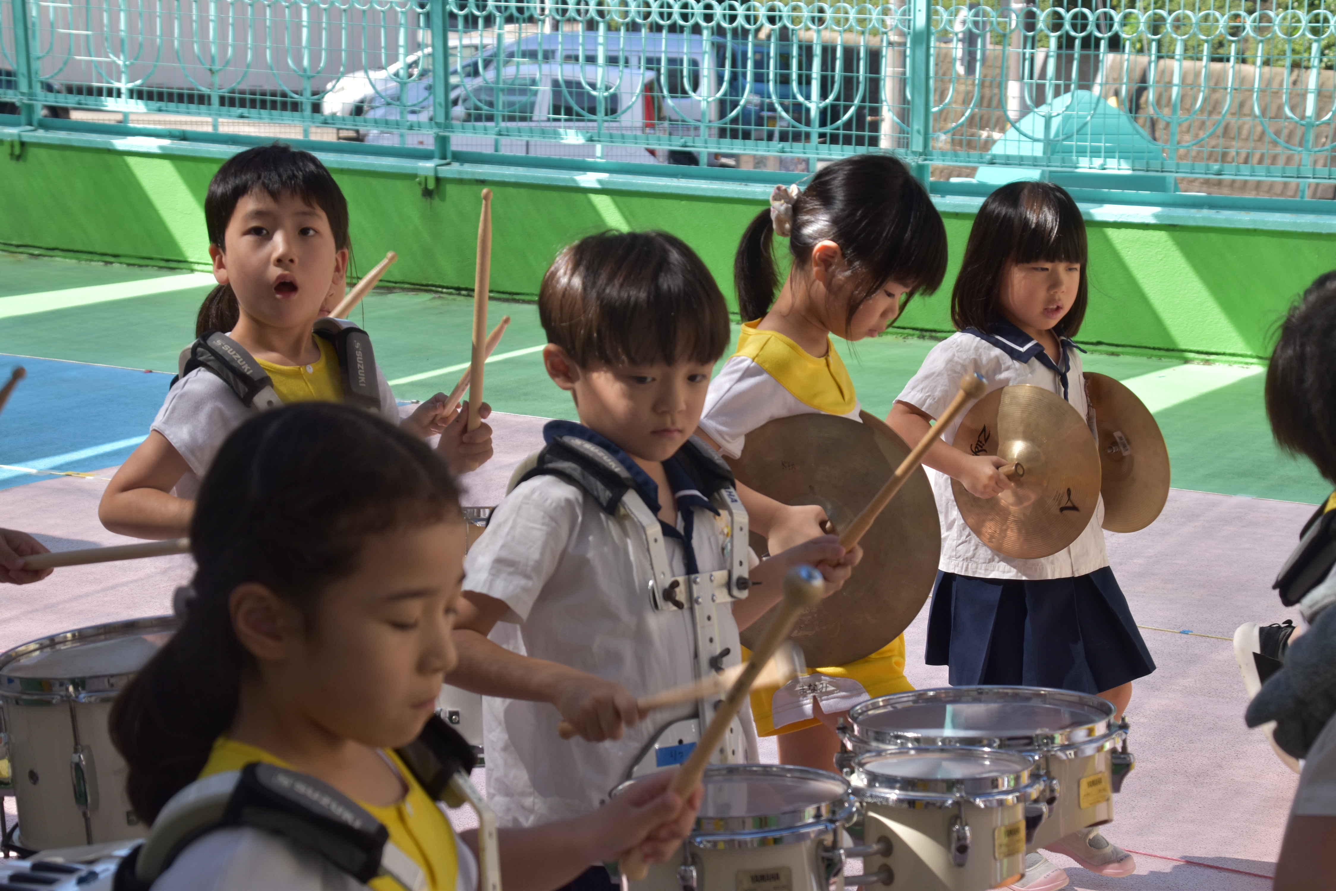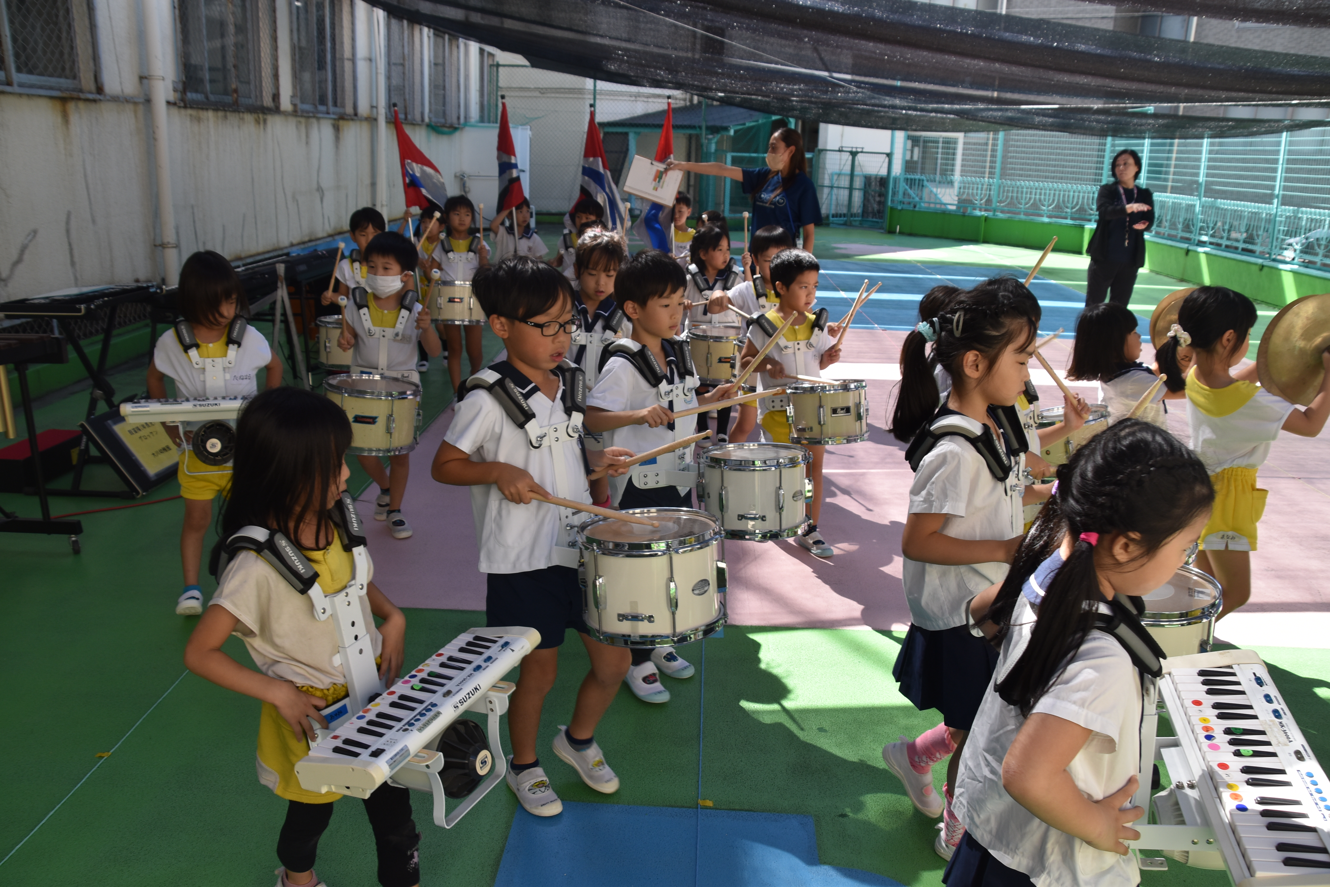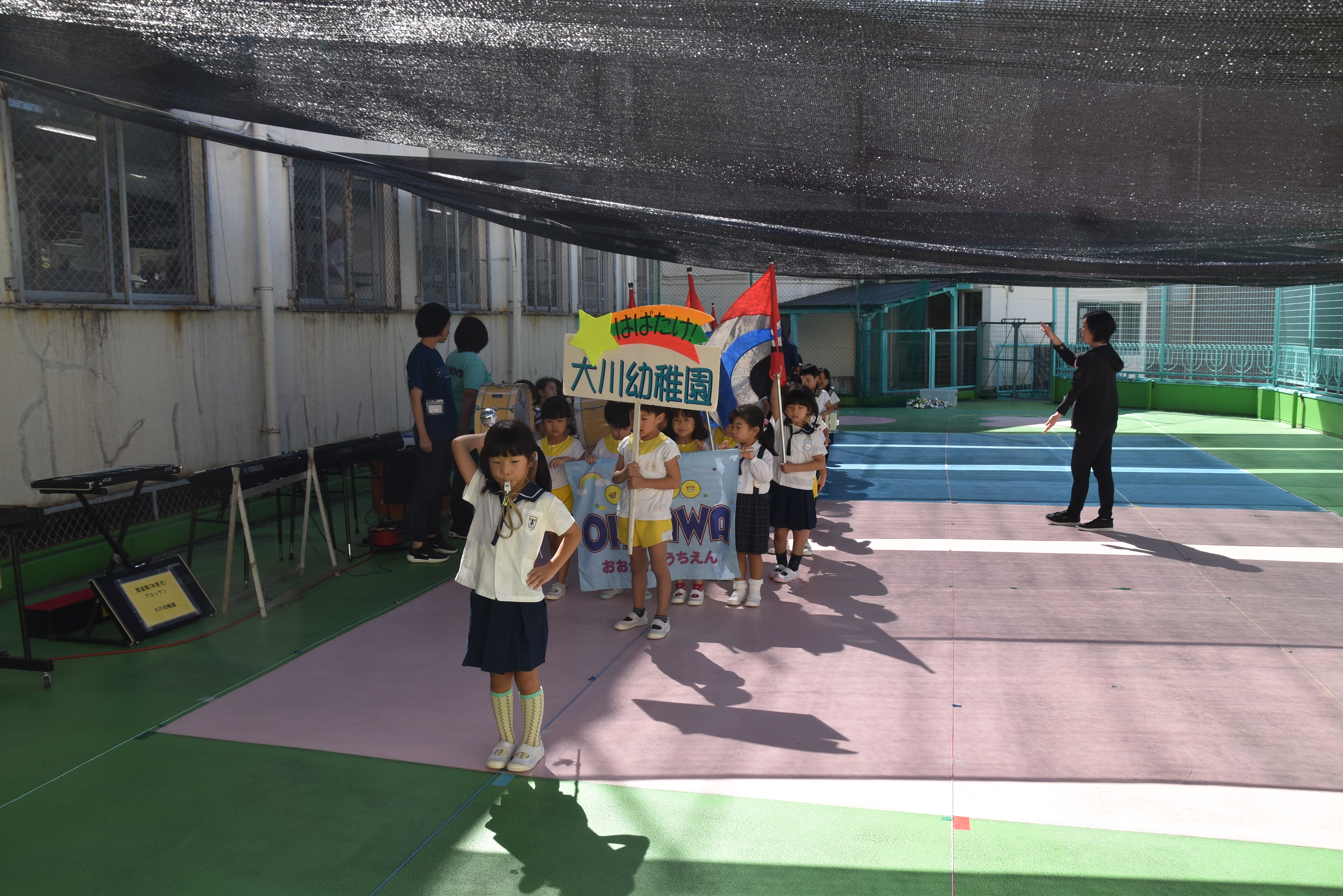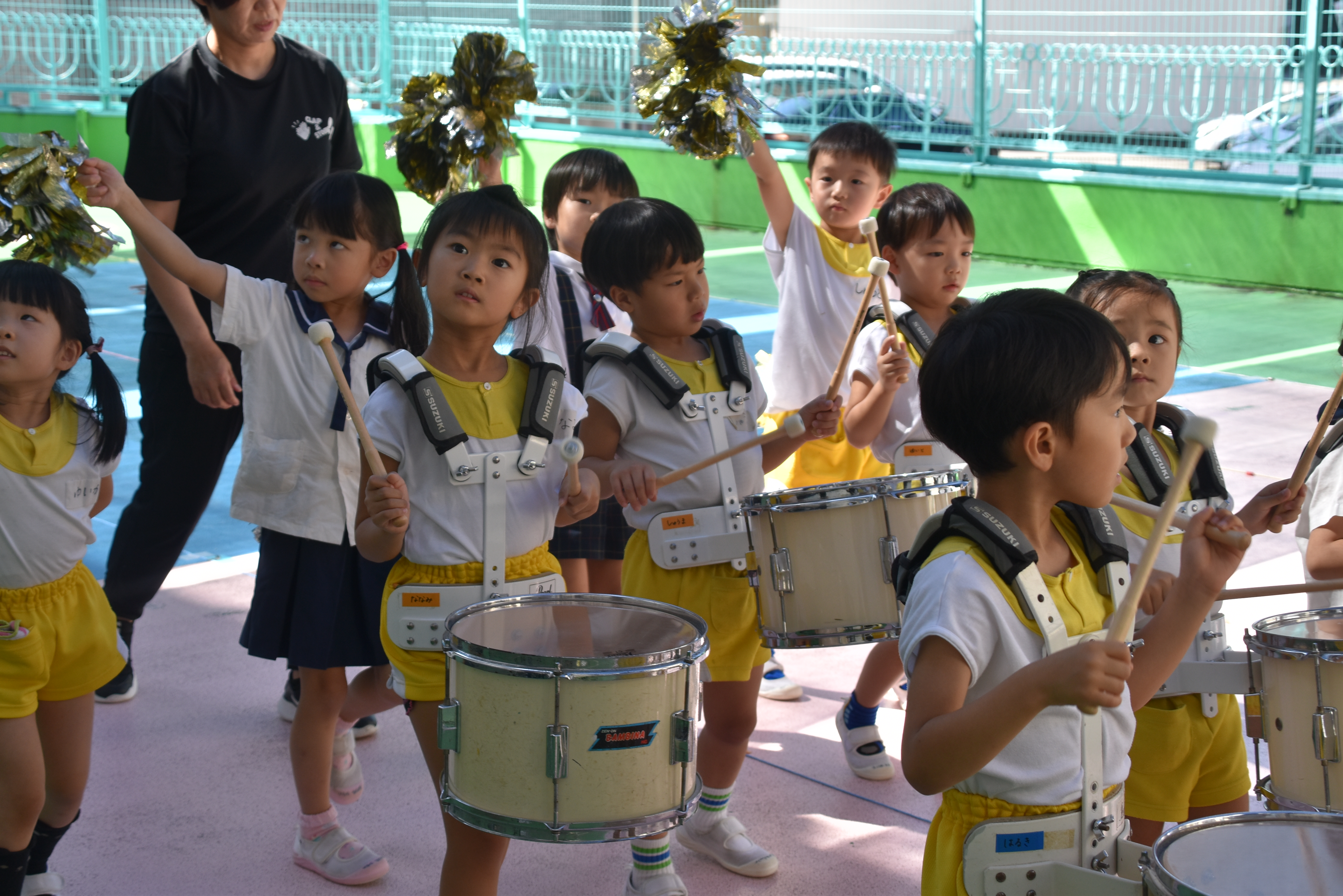 大川幼稚園は、年長児が「鼓笛隊演奏」で出場します。津まつりで、初めての鼓笛隊演奏を披露するので、子どもたちはとても張り切っています♪ とっても上手に演奏できるようになってきたので、昨日と今日は演奏しながら行進をする練習をしましたよ。歩きながら重い楽器を持って演奏するのは本当に大変だと思いますが、疲れを見せずに集中して演奏してくれました。