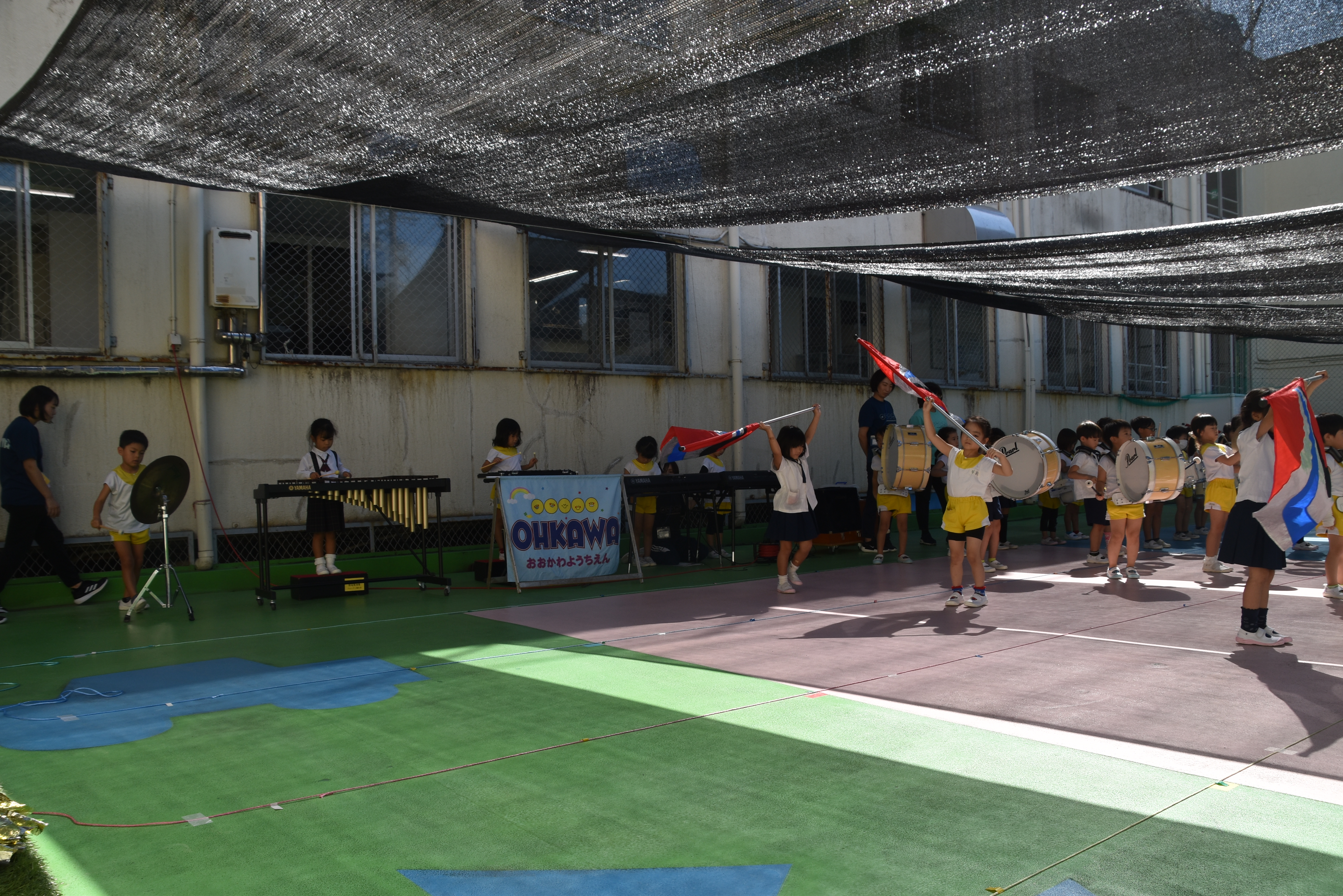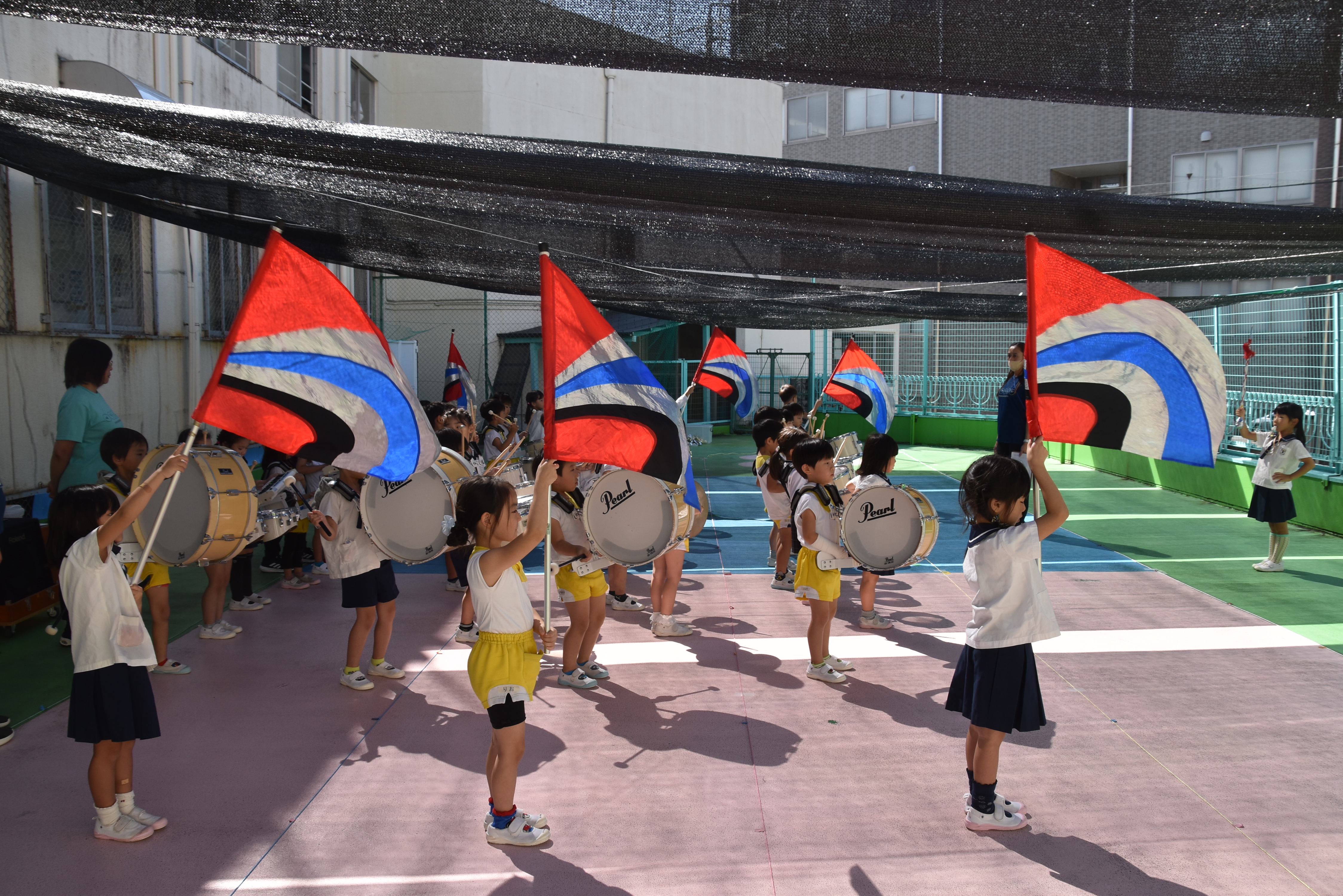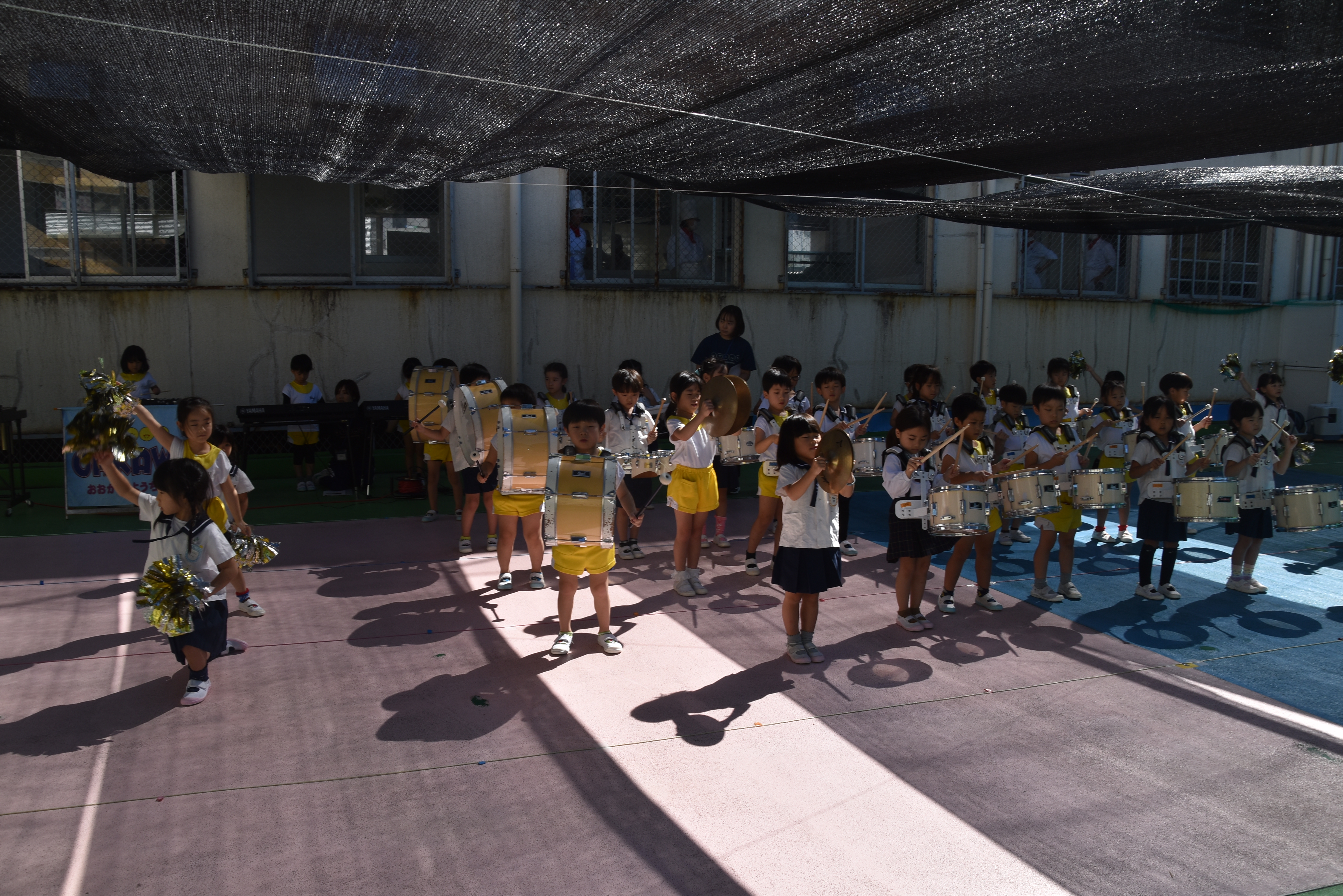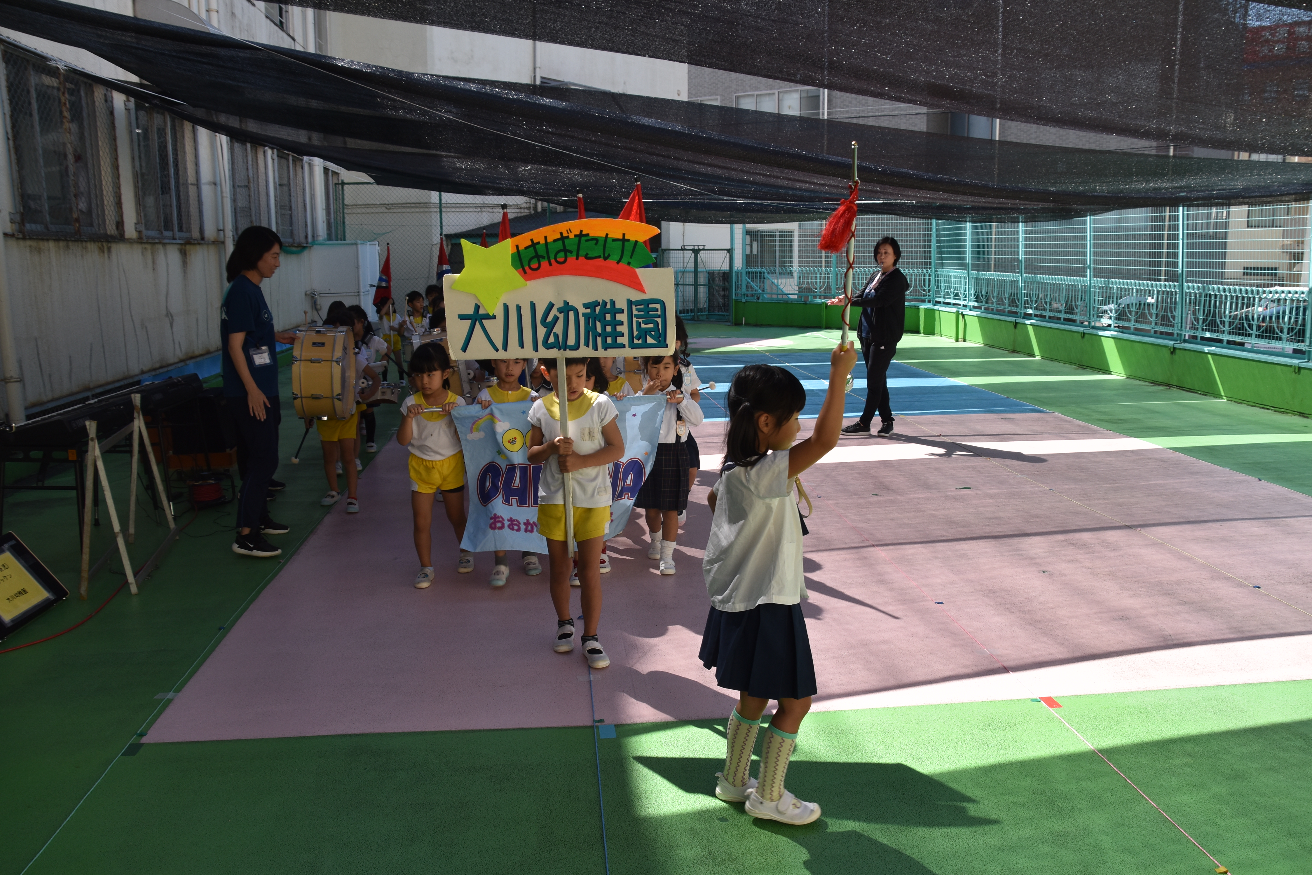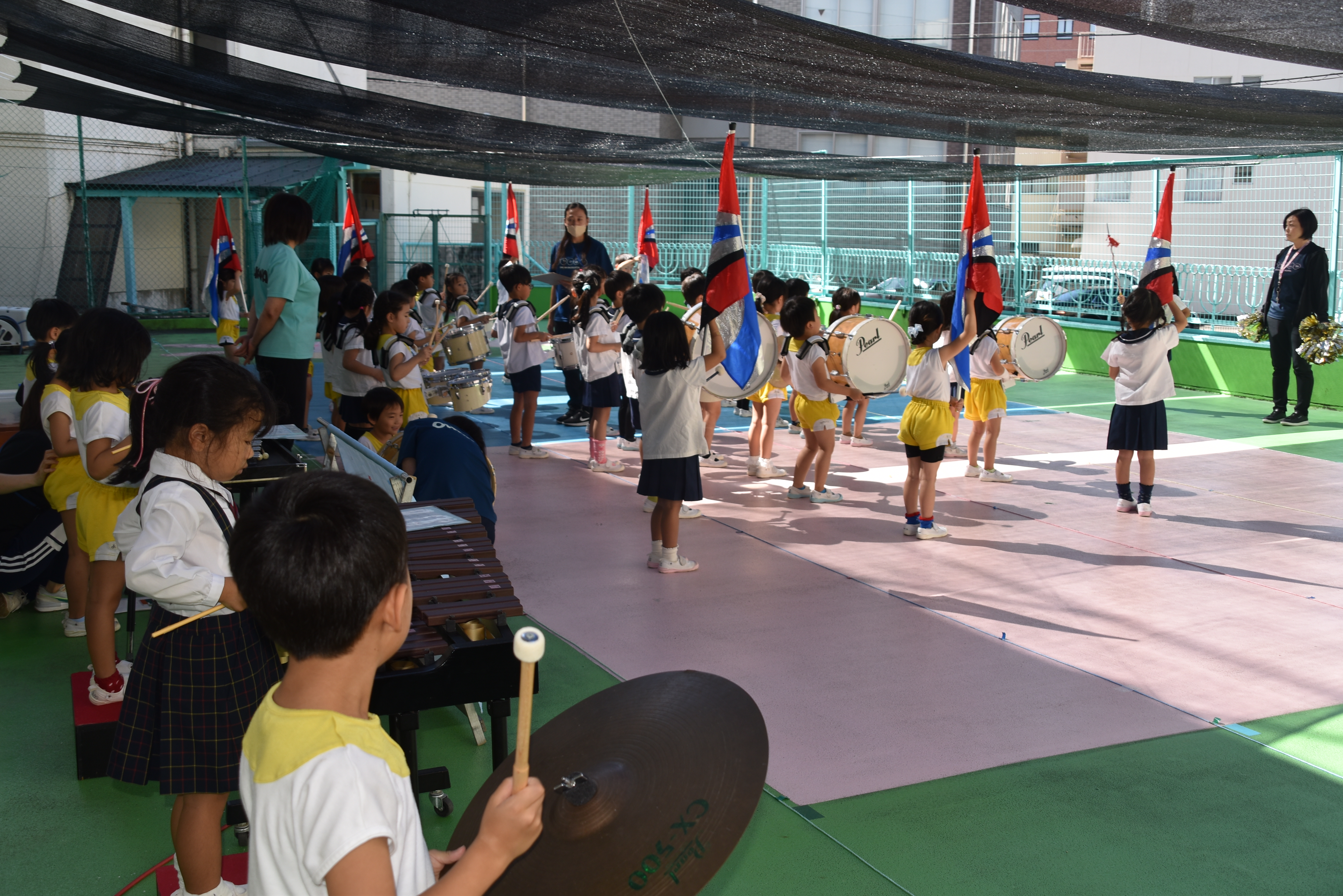 大川幼稚園は、年長児が「鼓笛隊演奏」で出場します。津まつりで、初めての鼓笛隊演奏を披露するので、子どもたちはとても張り切っています♪ とっても上手に演奏できるようになってきたので、昨日と今日は演奏しながら行進をする練習をしましたよ。歩きながら重い楽器を持って演奏するのは本当に大変だと思いますが、疲れを見せずに集中して演奏してくれました。