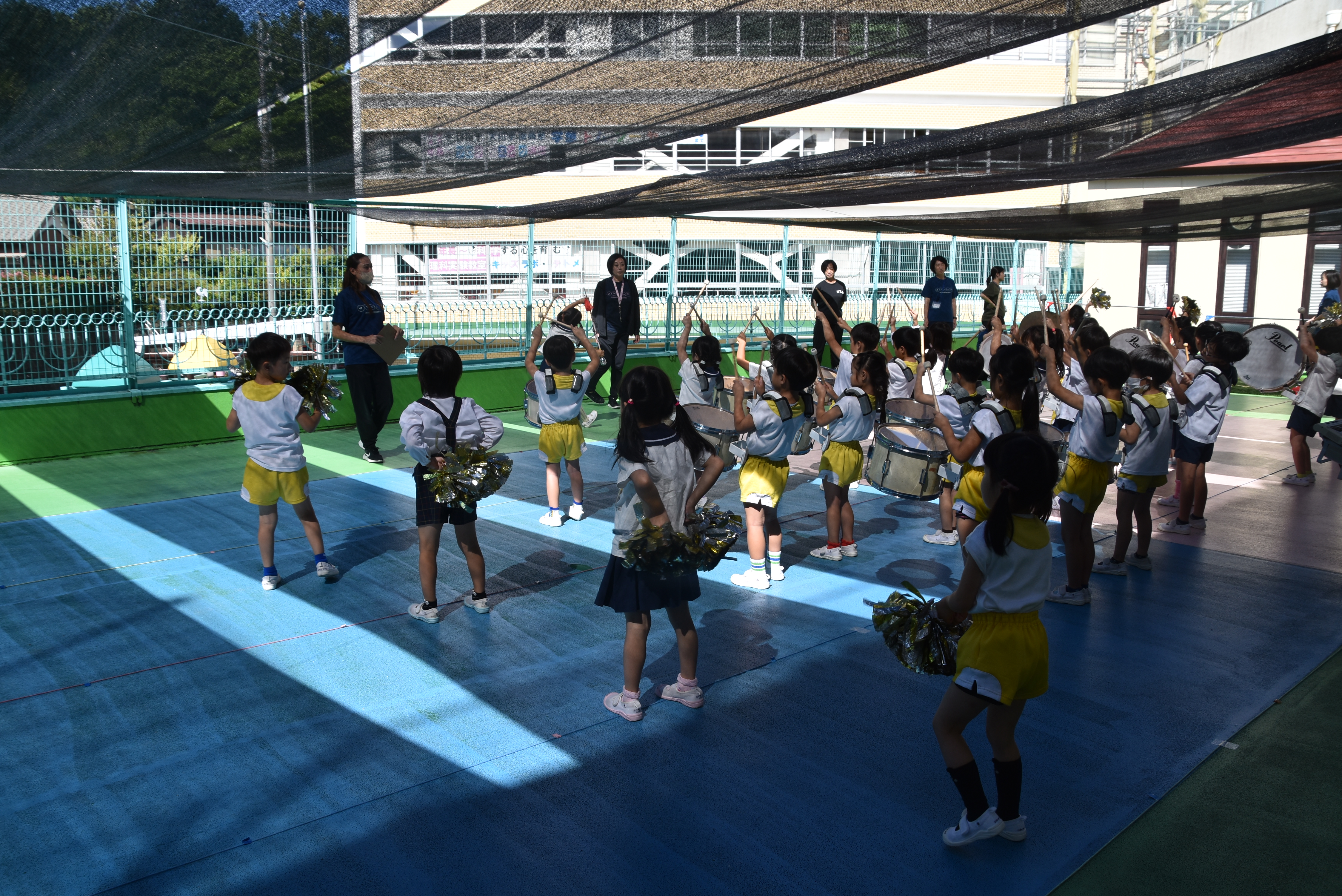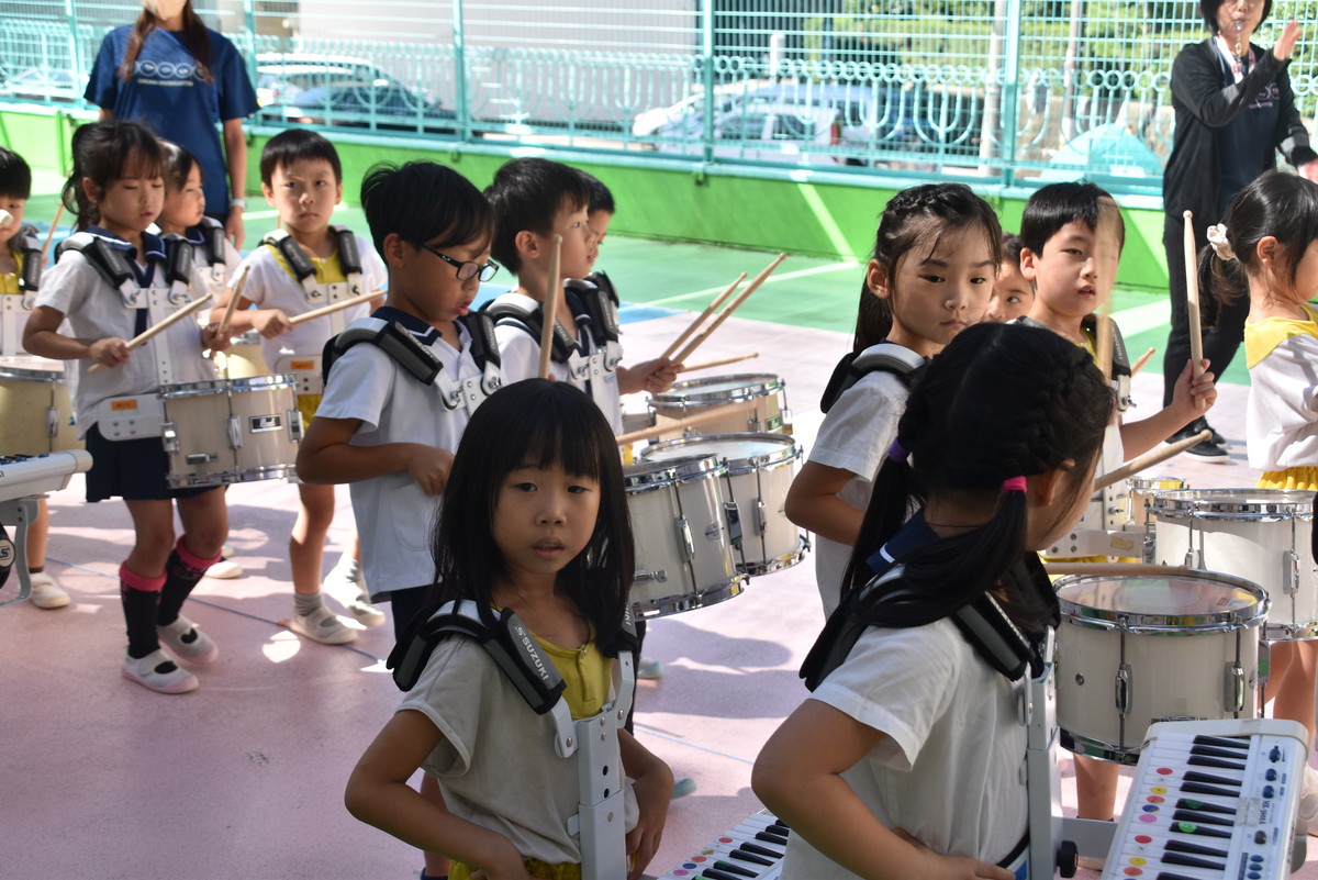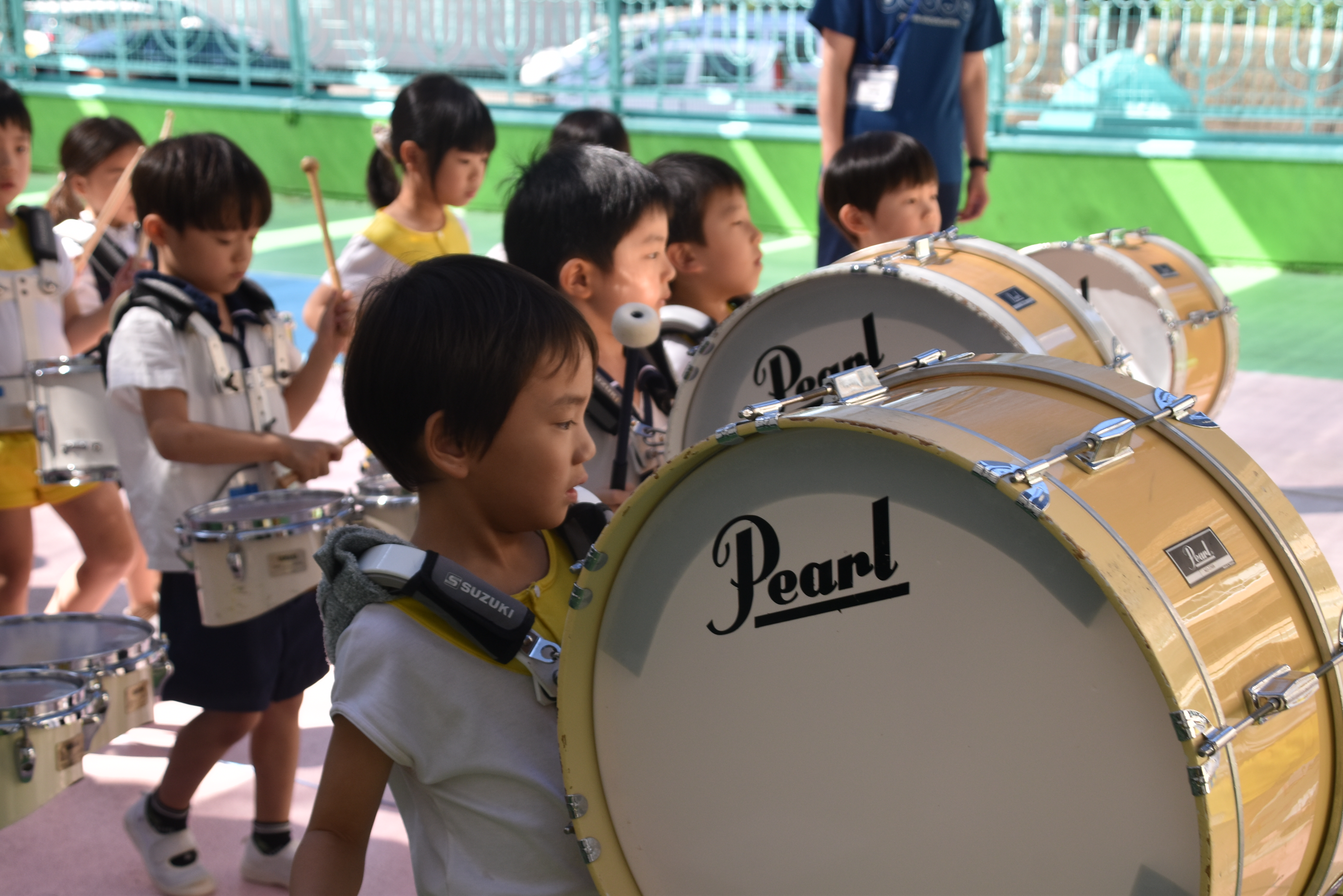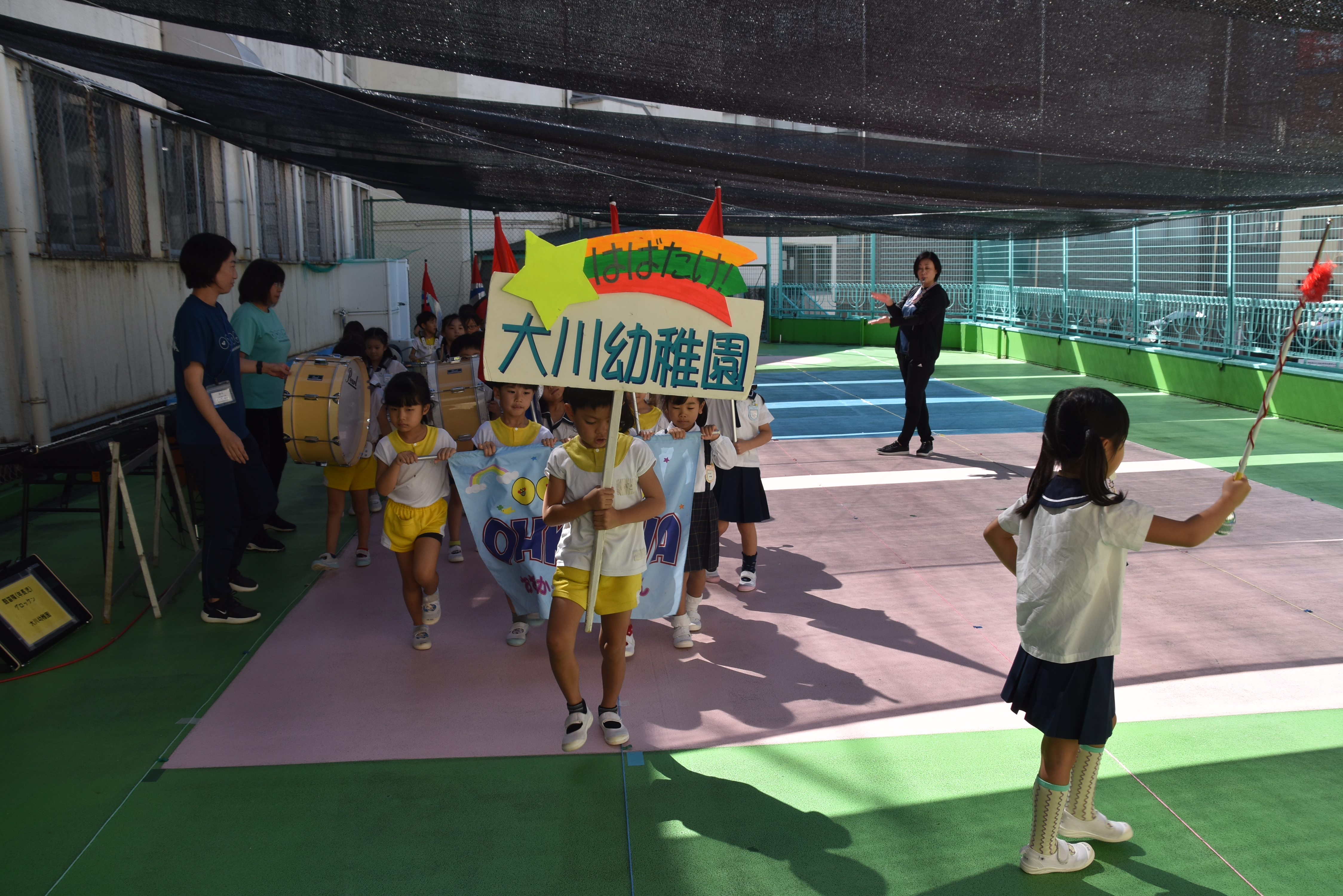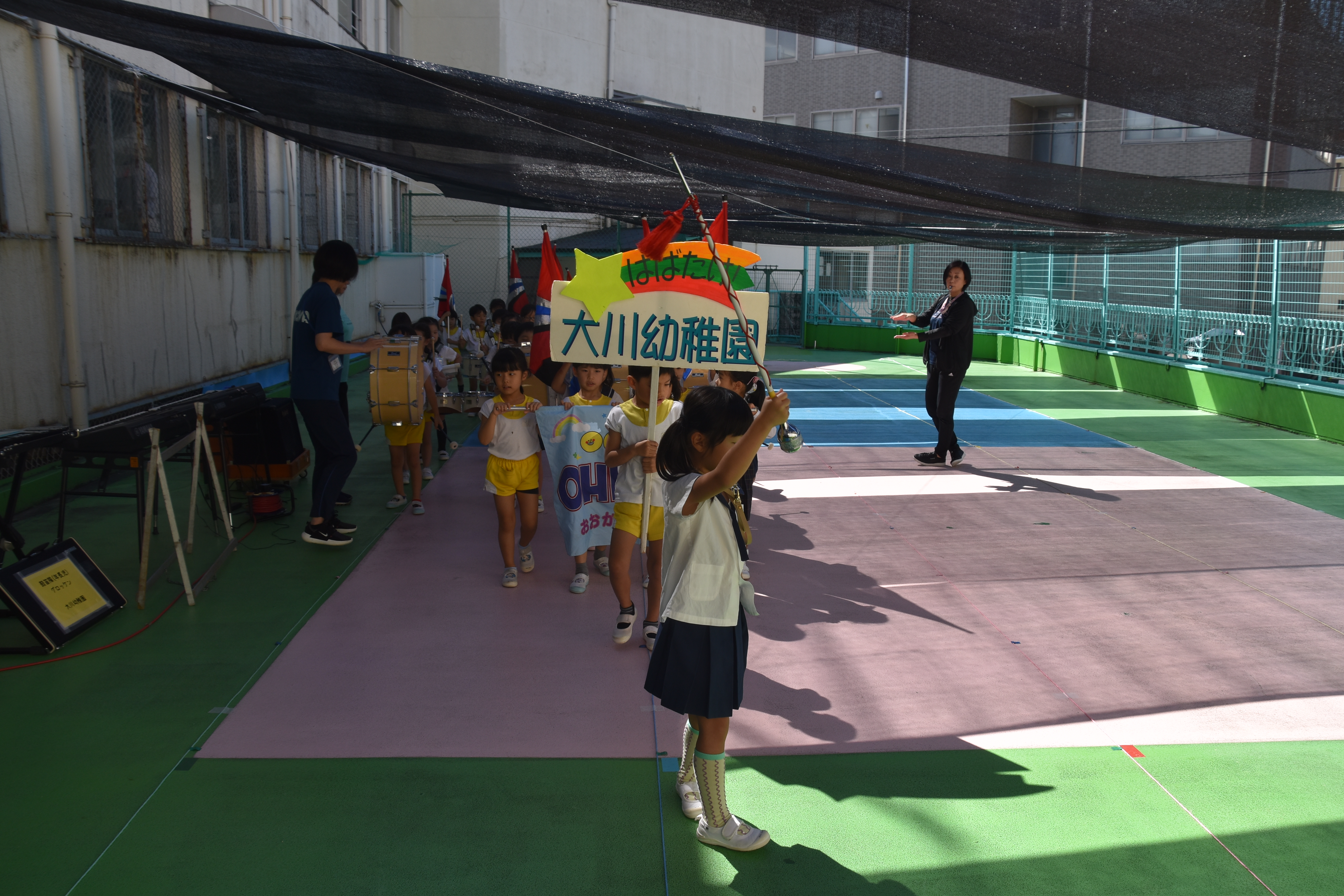 大川幼稚園は、年長児が「鼓笛隊演奏」で出場します。津まつりで、初めての鼓笛隊演奏を披露するので、子どもたちはとても張り切っています♪ とっても上手に演奏できるようになってきたので、昨日と今日は演奏しながら行進をする練習をしましたよ。歩きながら重い楽器を持って演奏するのは本当に大変だと思いますが、疲れを見せずに集中して演奏してくれました。