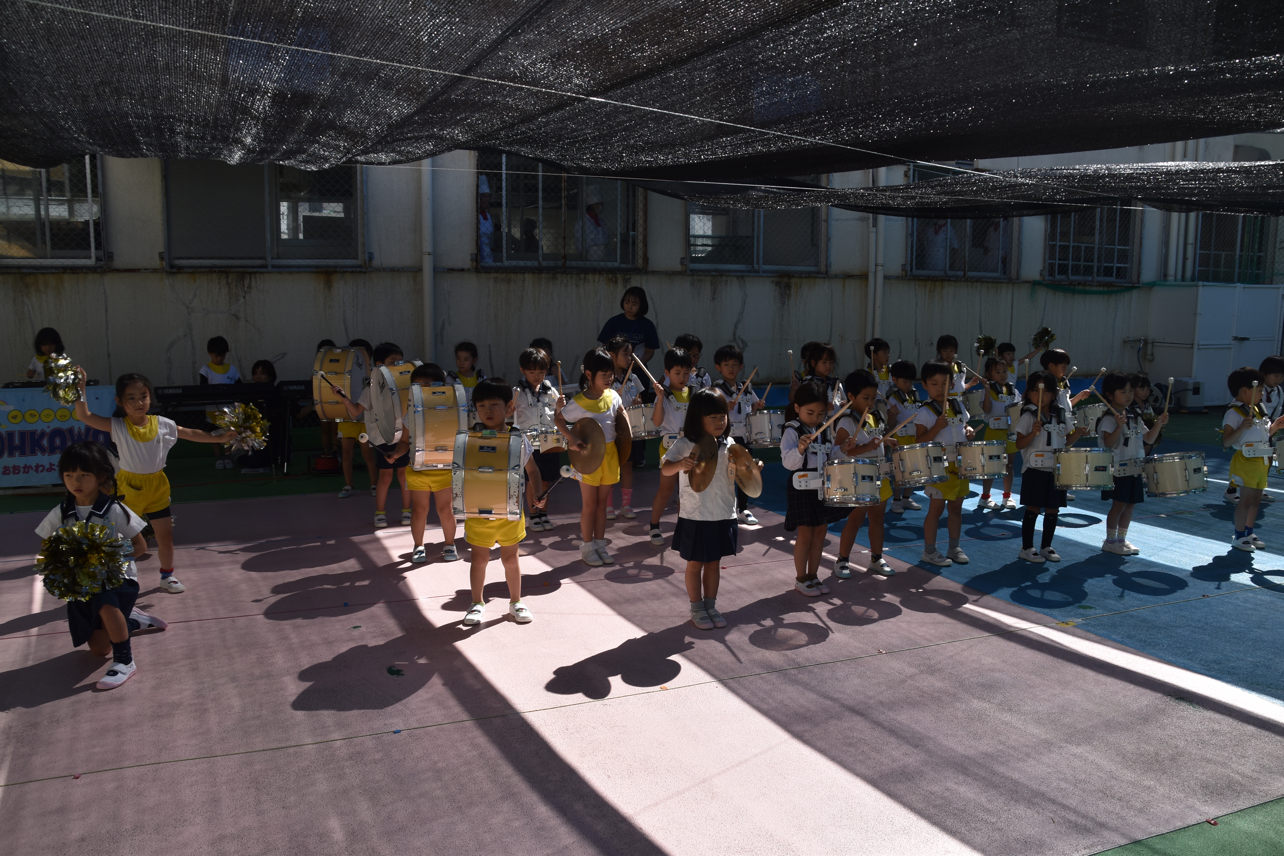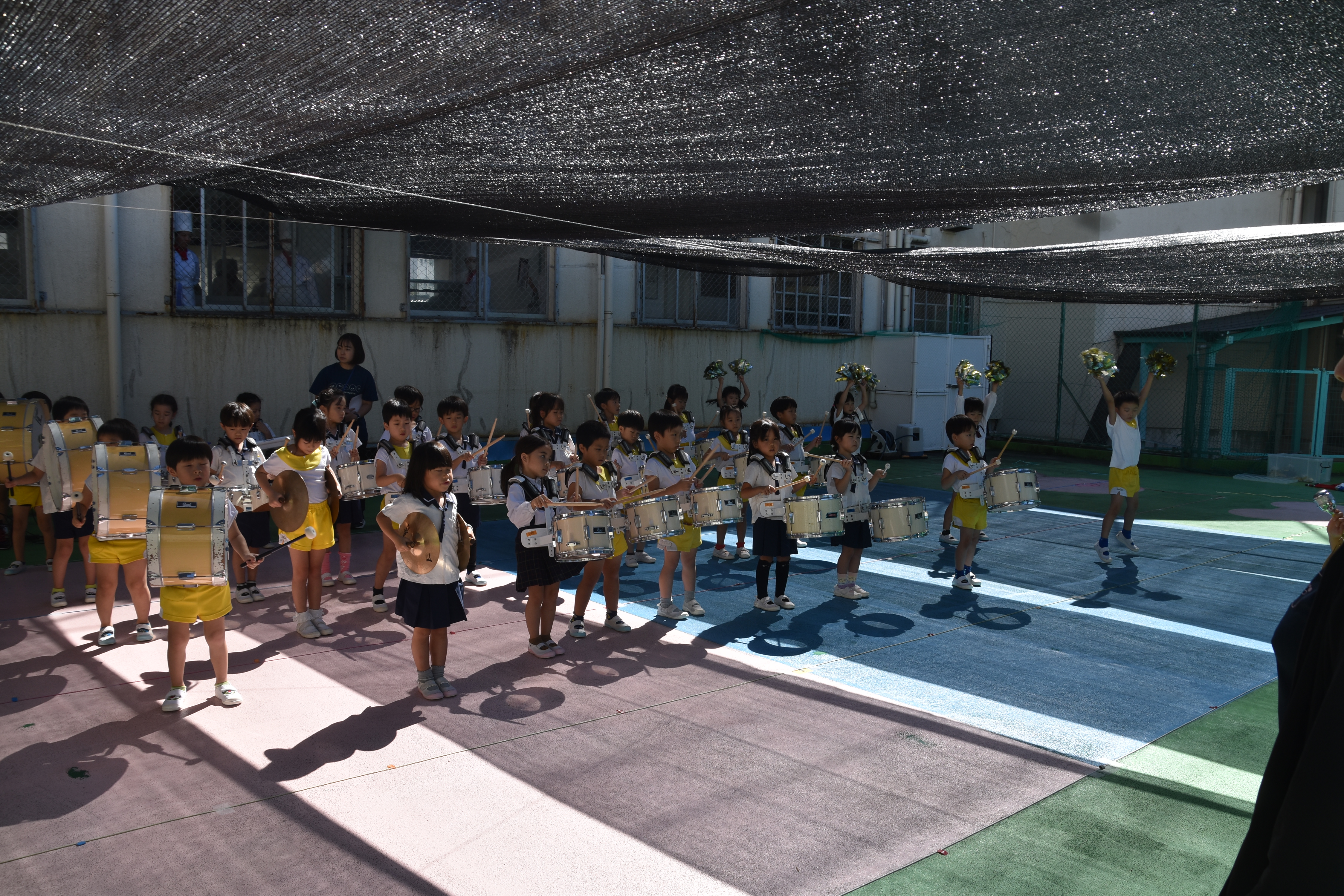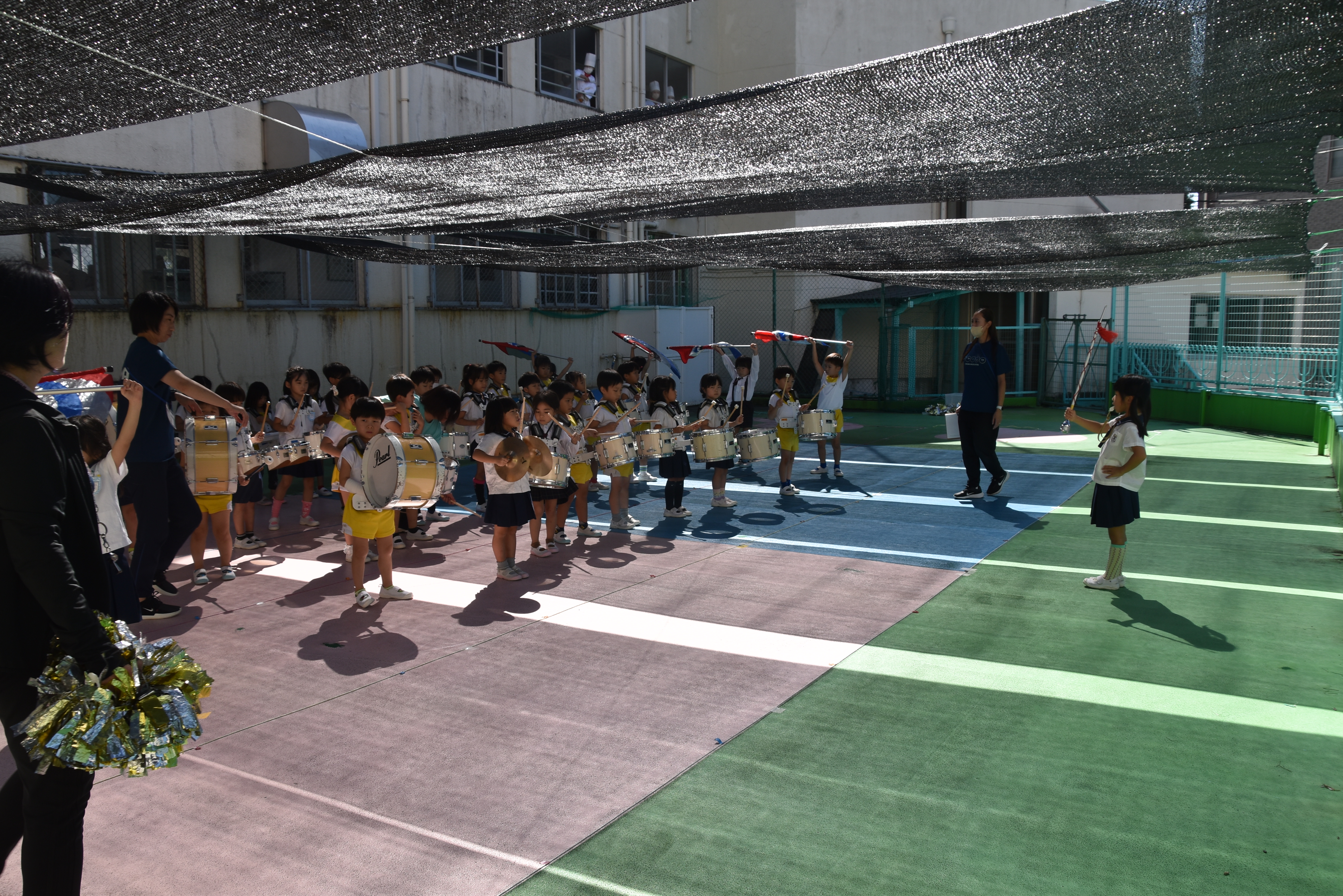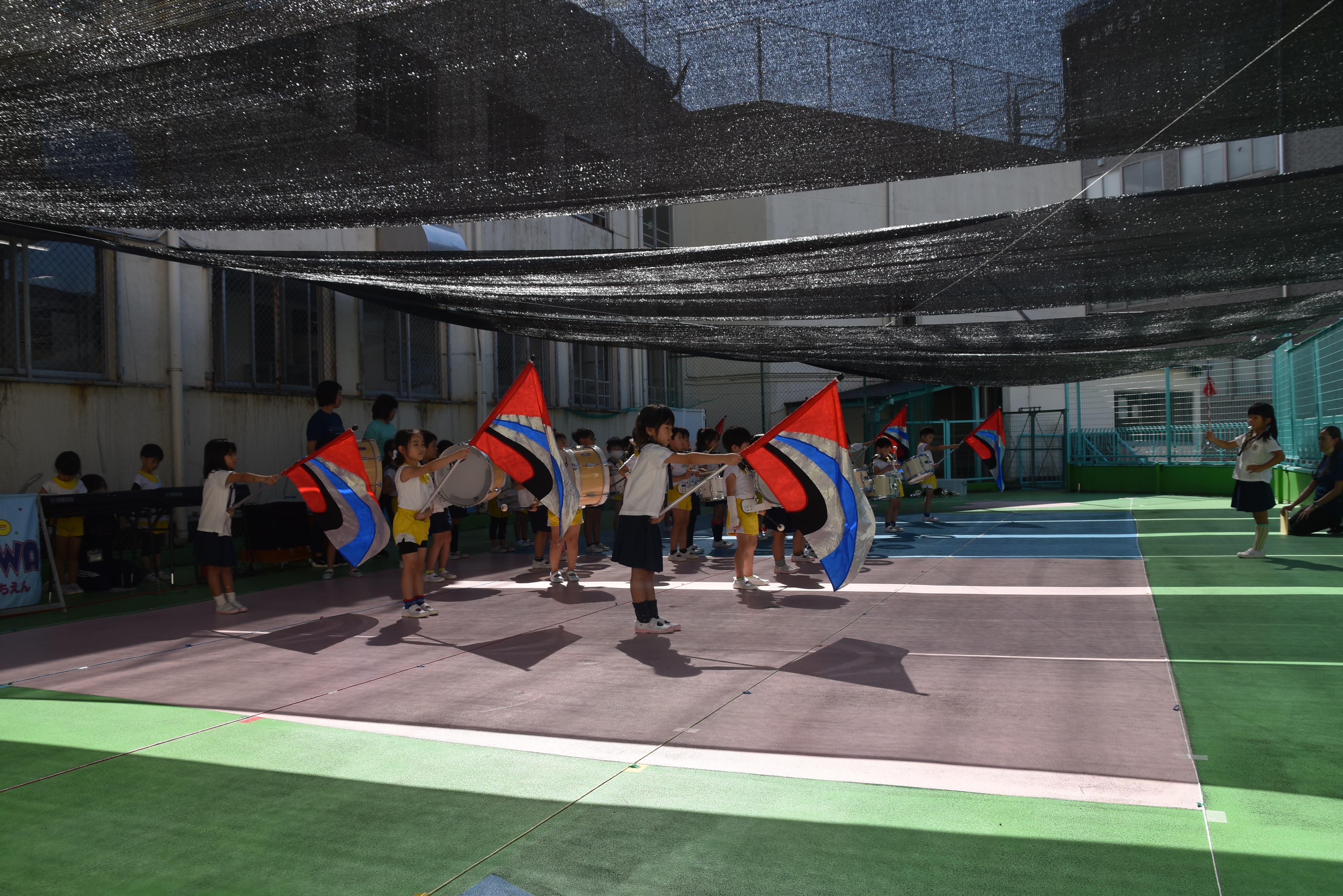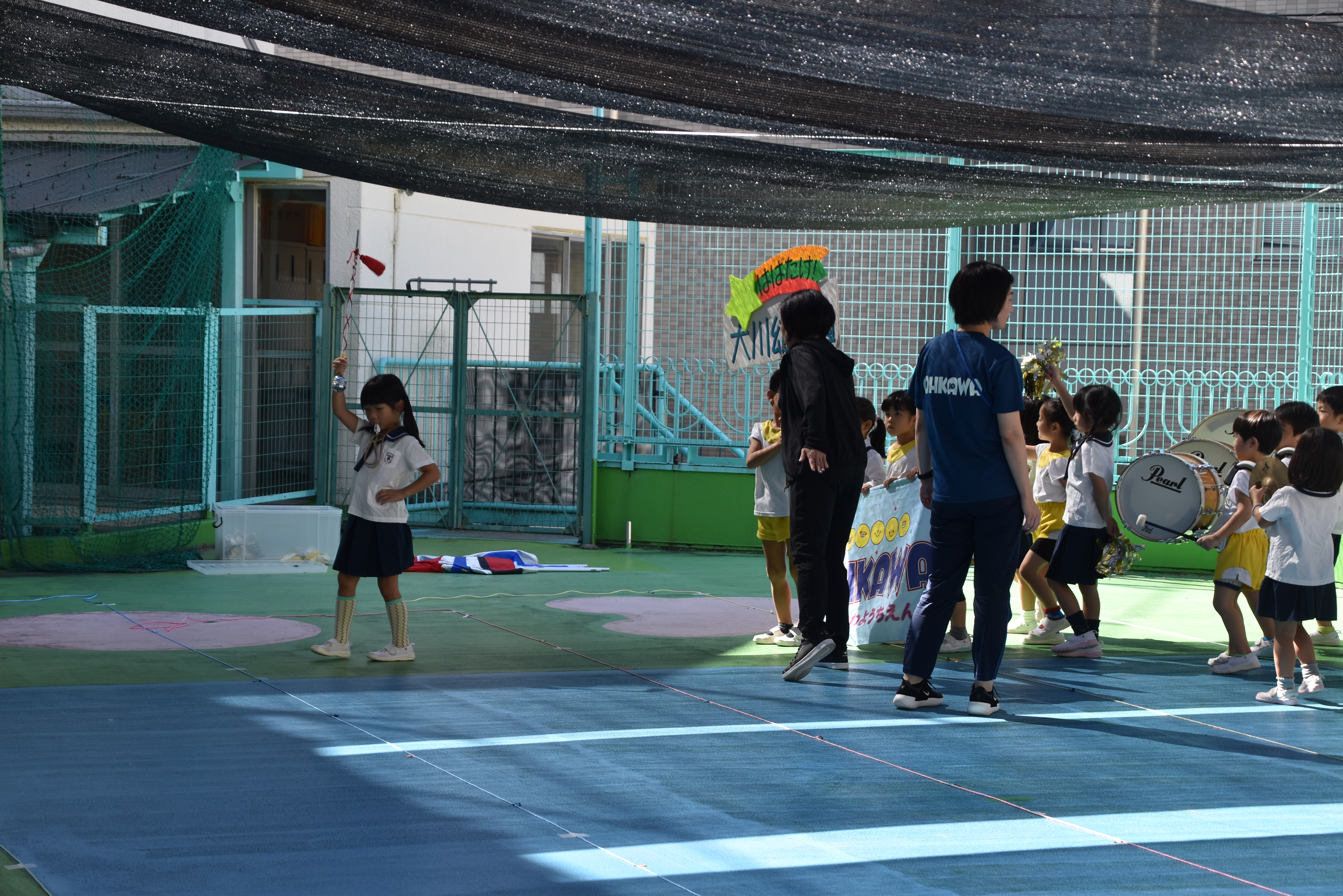 大川幼稚園は、年長児が「鼓笛隊演奏」で出場します。津まつりで、初めての鼓笛隊演奏を披露するので、子どもたちはとても張り切っています♪ とっても上手に演奏できるようになってきたので、昨日と今日は演奏しながら行進をする練習をしましたよ。歩きながら重い楽器を持って演奏するのは本当に大変だと思いますが、疲れを見せずに集中して演奏してくれました。