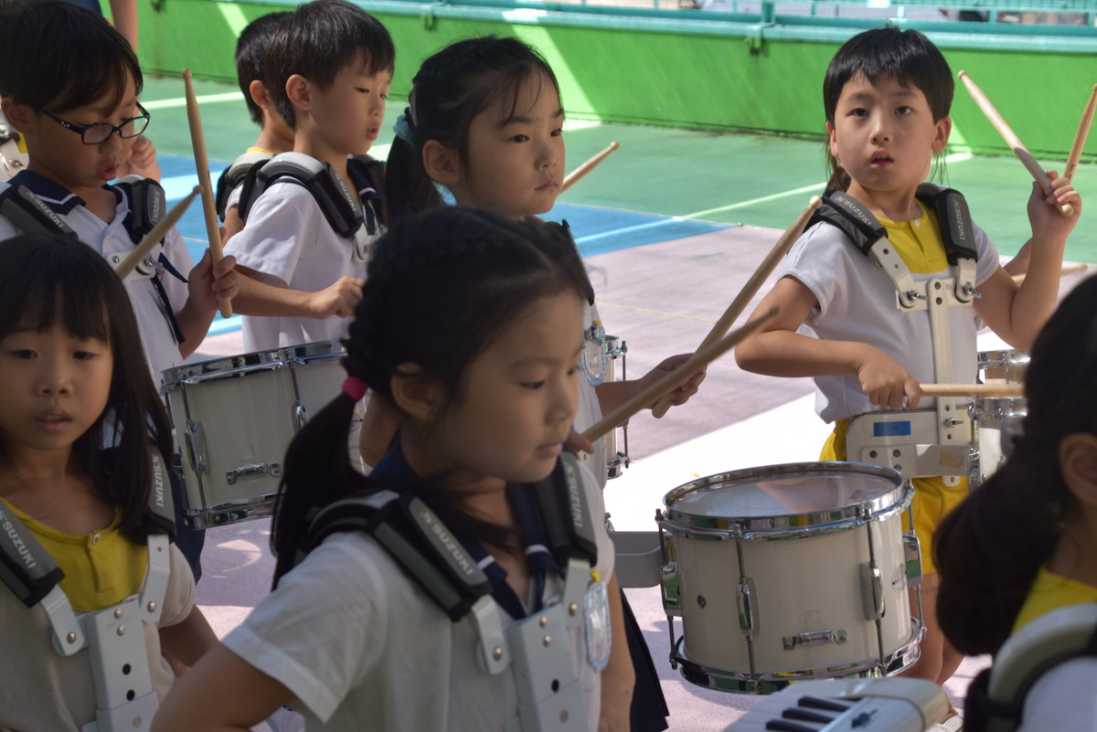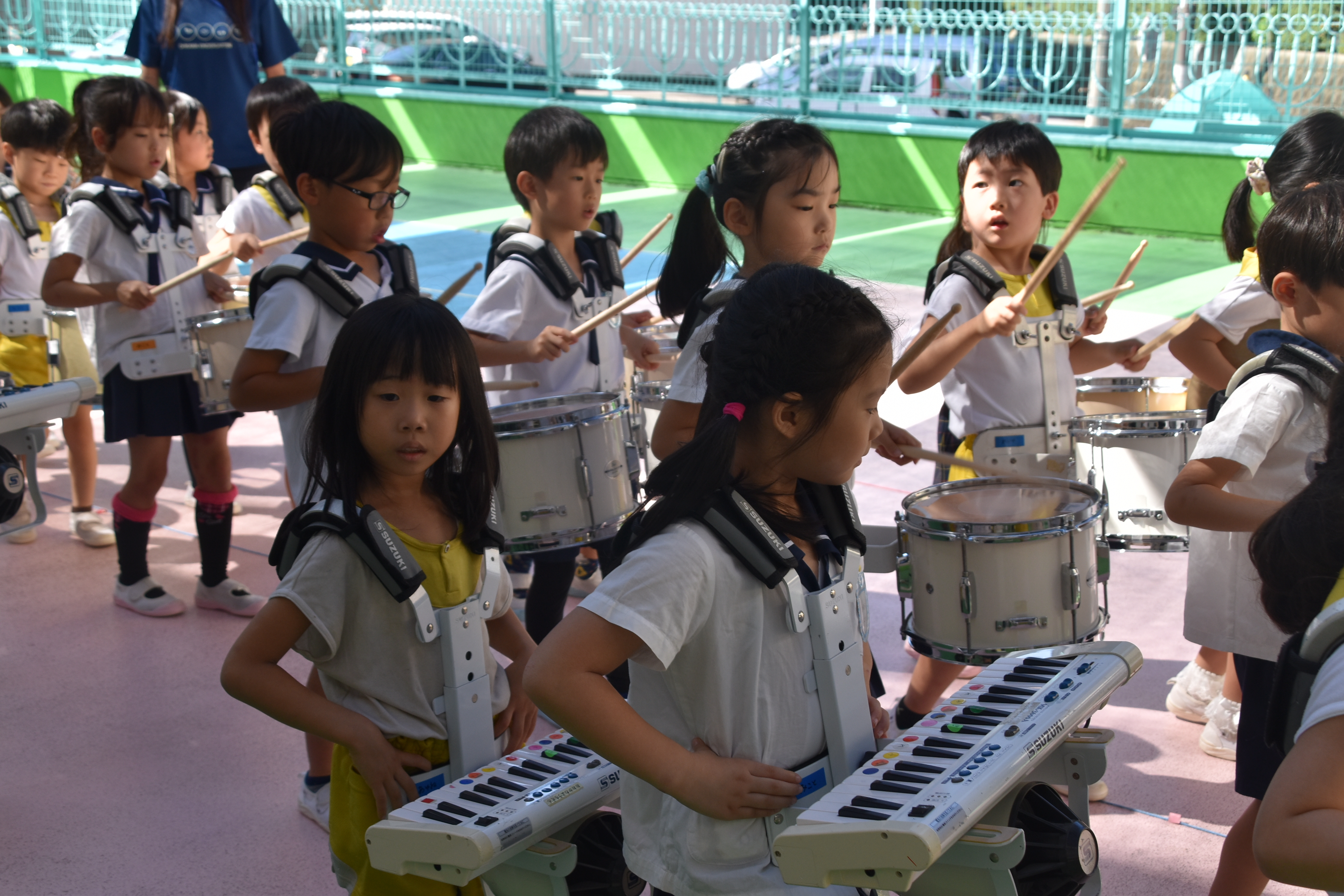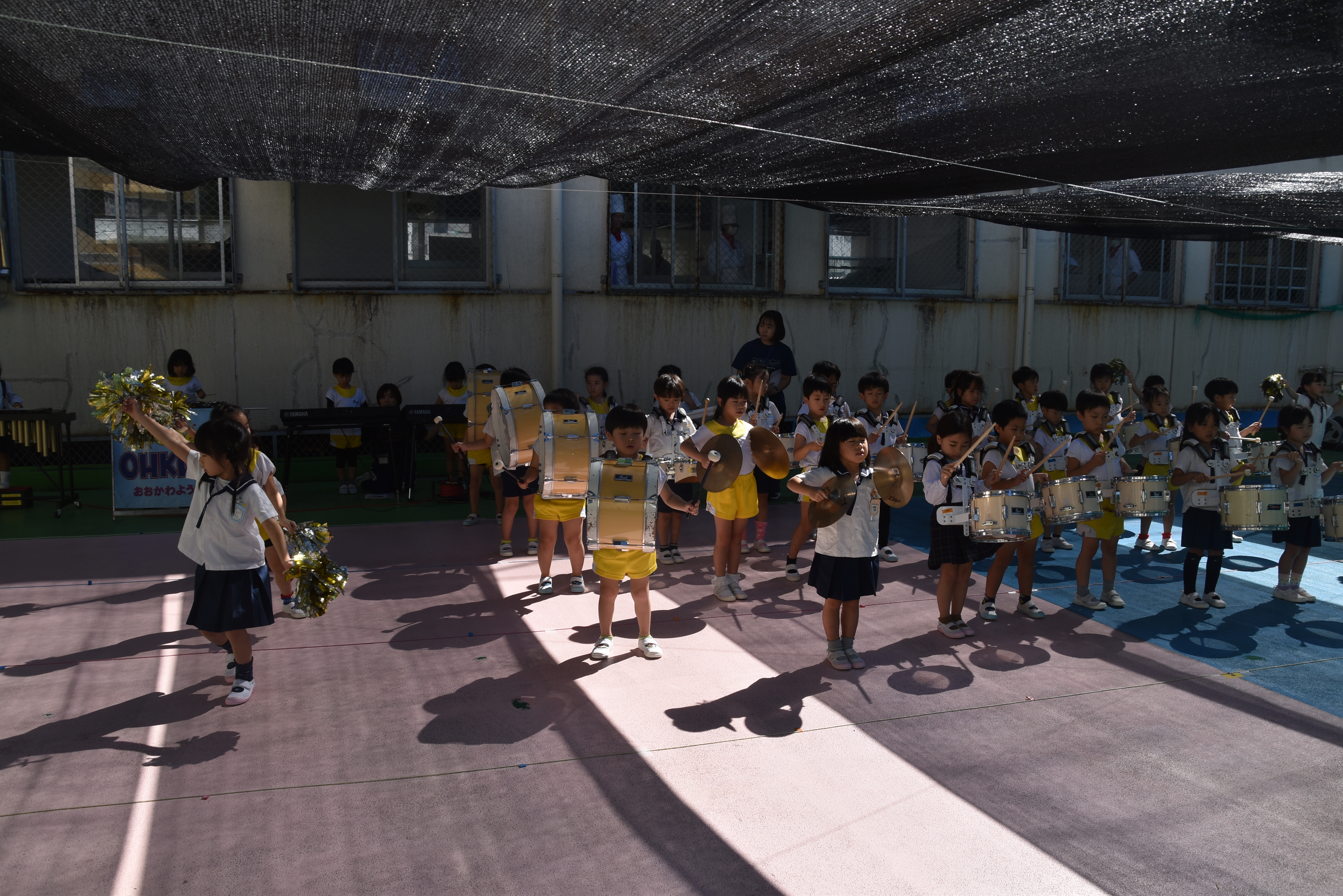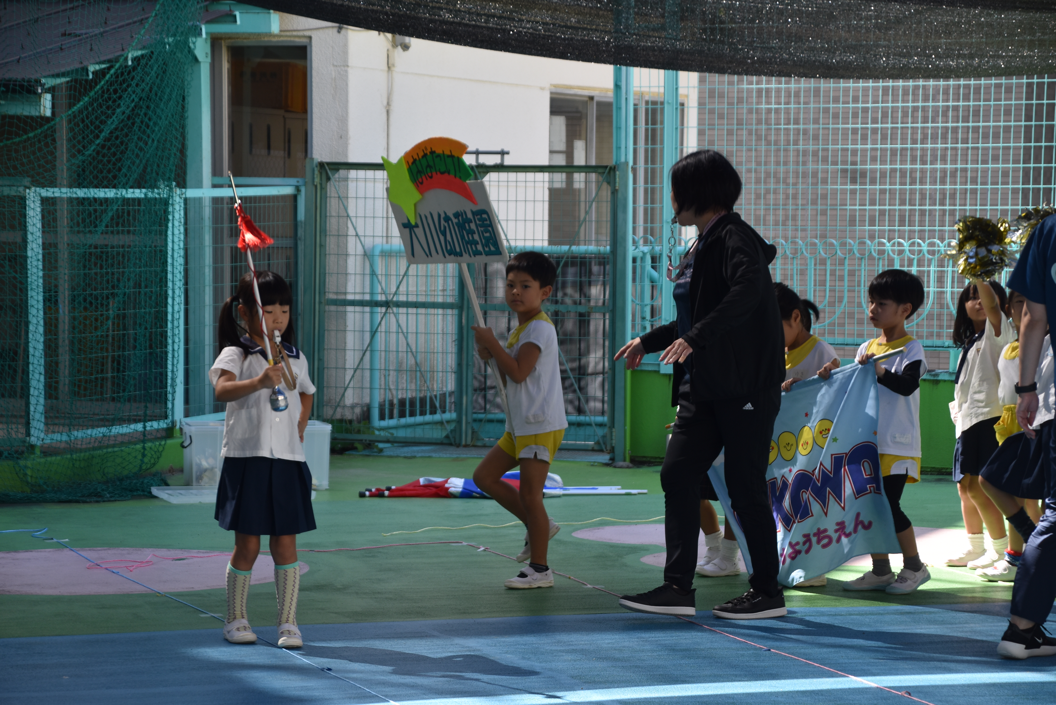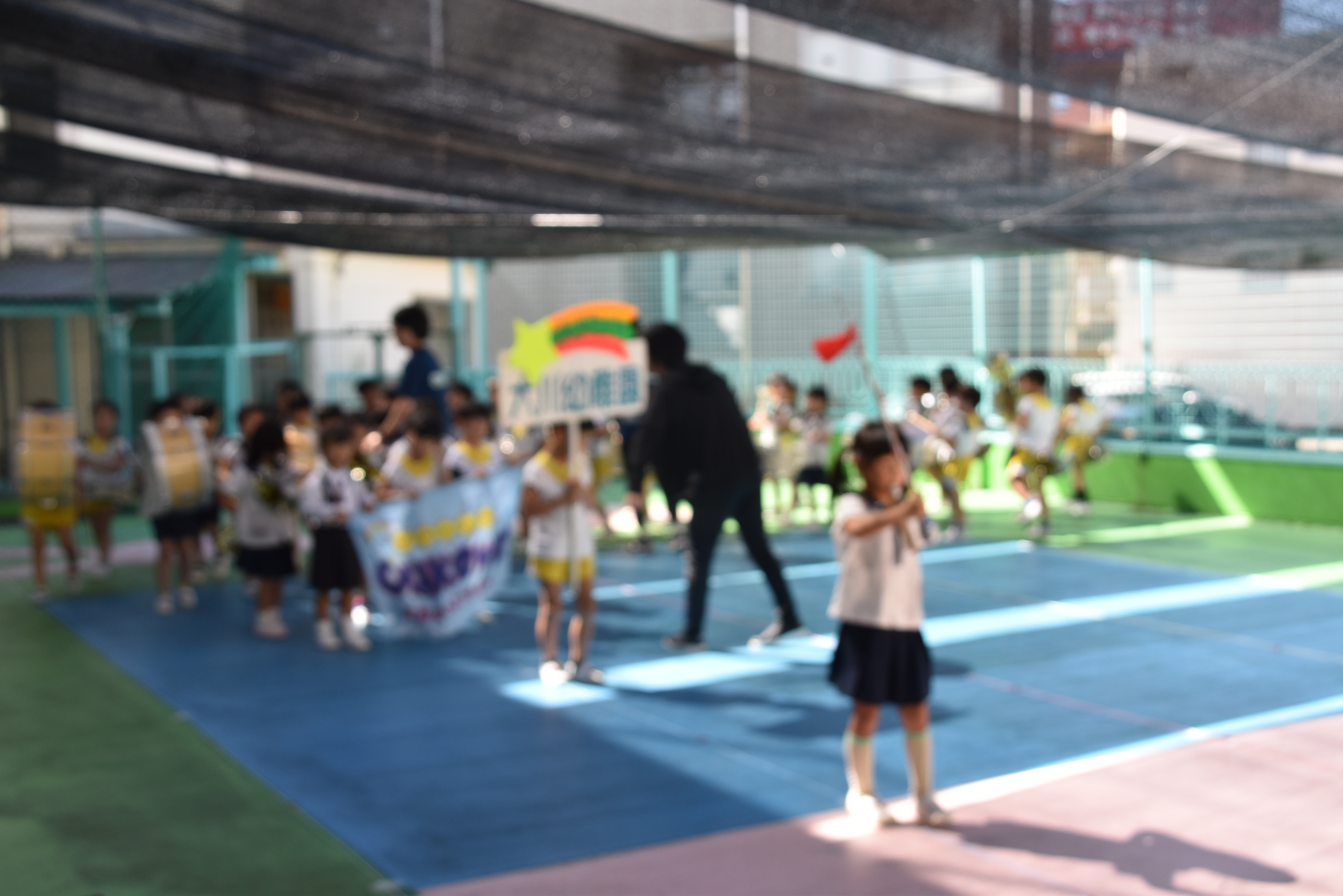 大川幼稚園は、年長児が「鼓笛隊演奏」で出場します。津まつりで、初めての鼓笛隊演奏を披露するので、子どもたちはとても張り切っています♪ とっても上手に演奏できるようになってきたので、昨日と今日は演奏しながら行進をする練習をしましたよ。歩きながら重い楽器を持って演奏するのは本当に大変だと思いますが、疲れを見せずに集中して演奏してくれました。