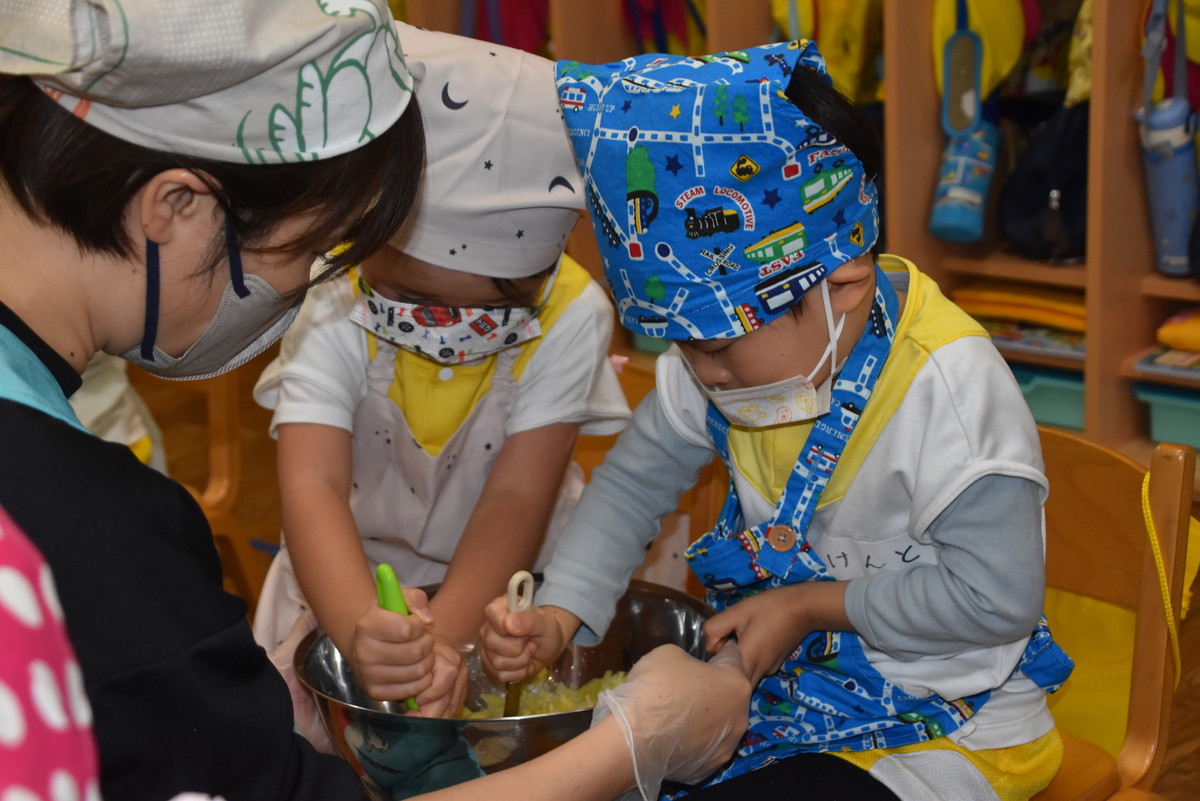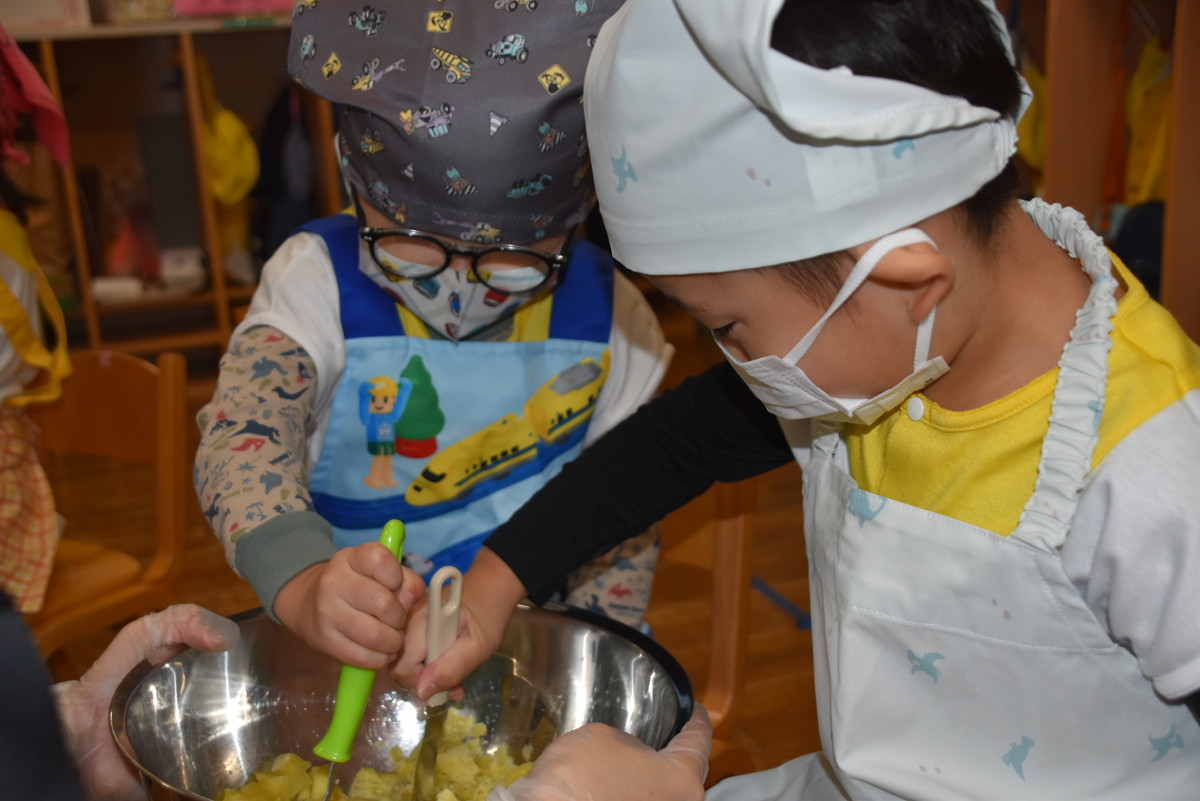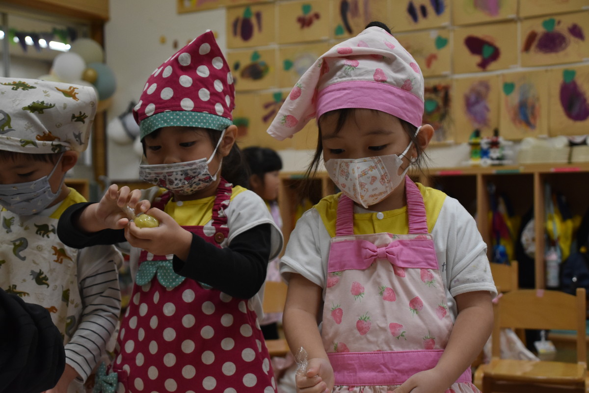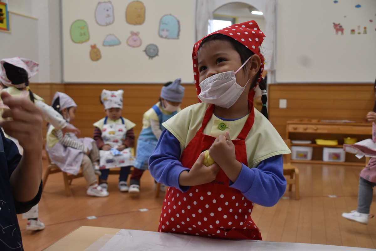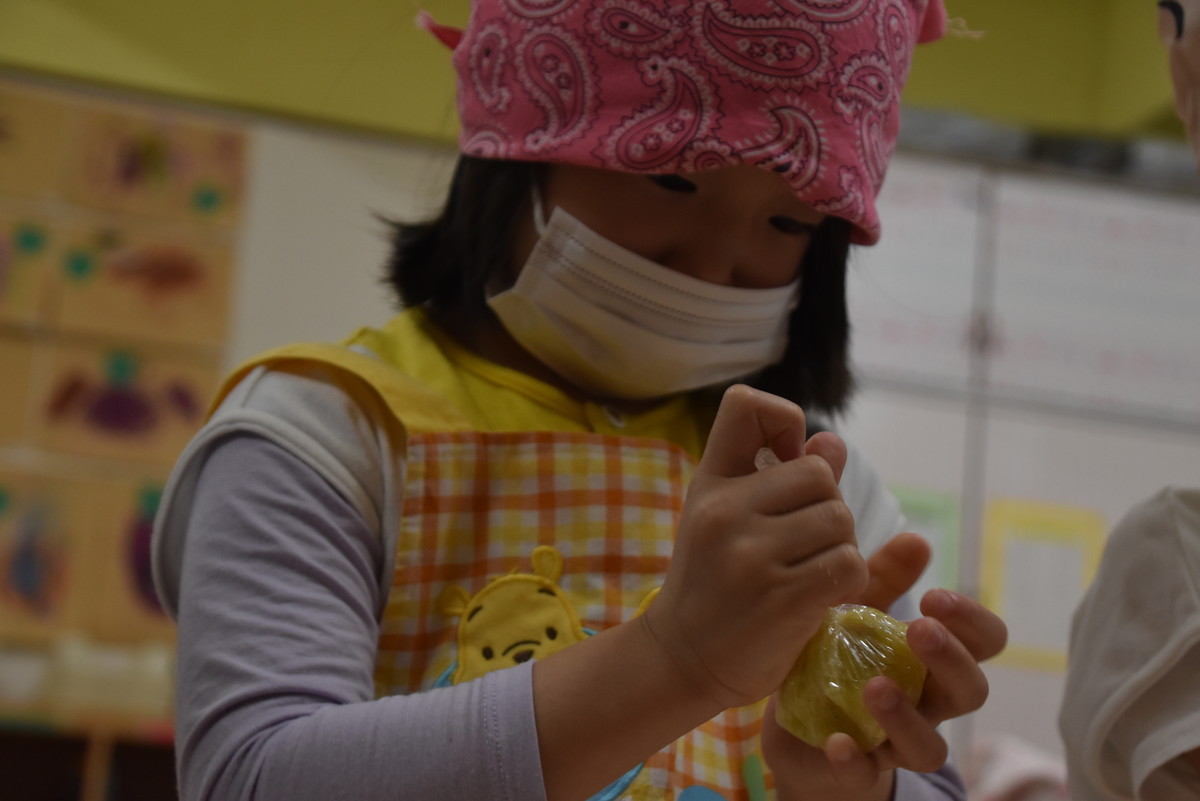 今日は、ちゅうりっぷぐみとこすもすぐみが9月のいもほり遠足時に収穫してきたさつまいもを使った「いもきんとん」作りを行いました。