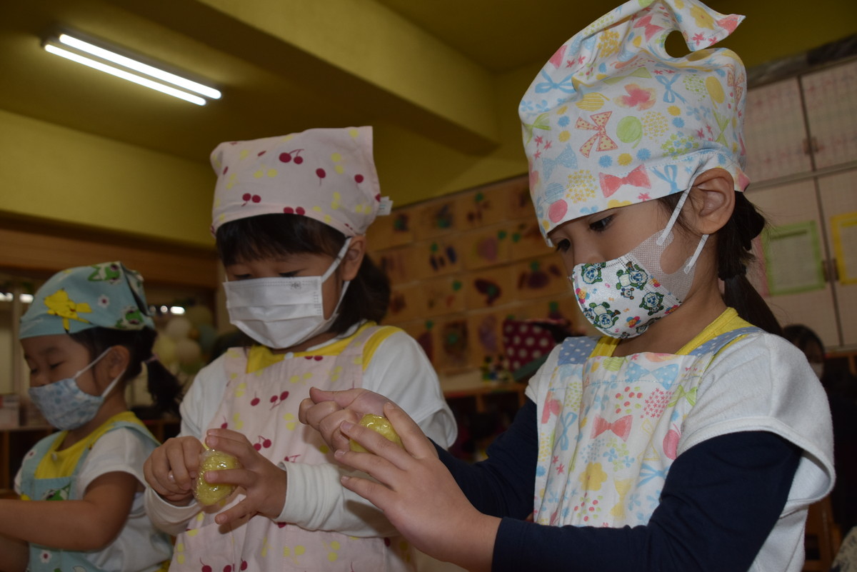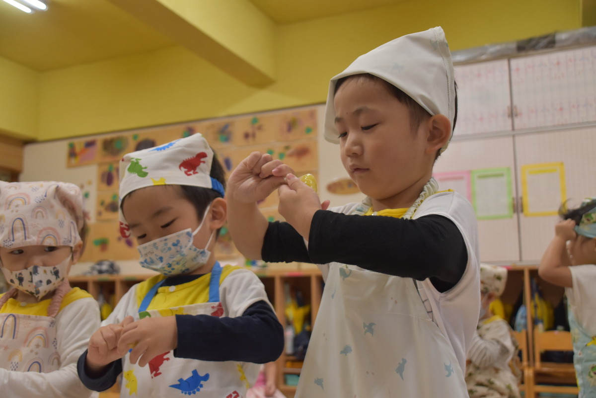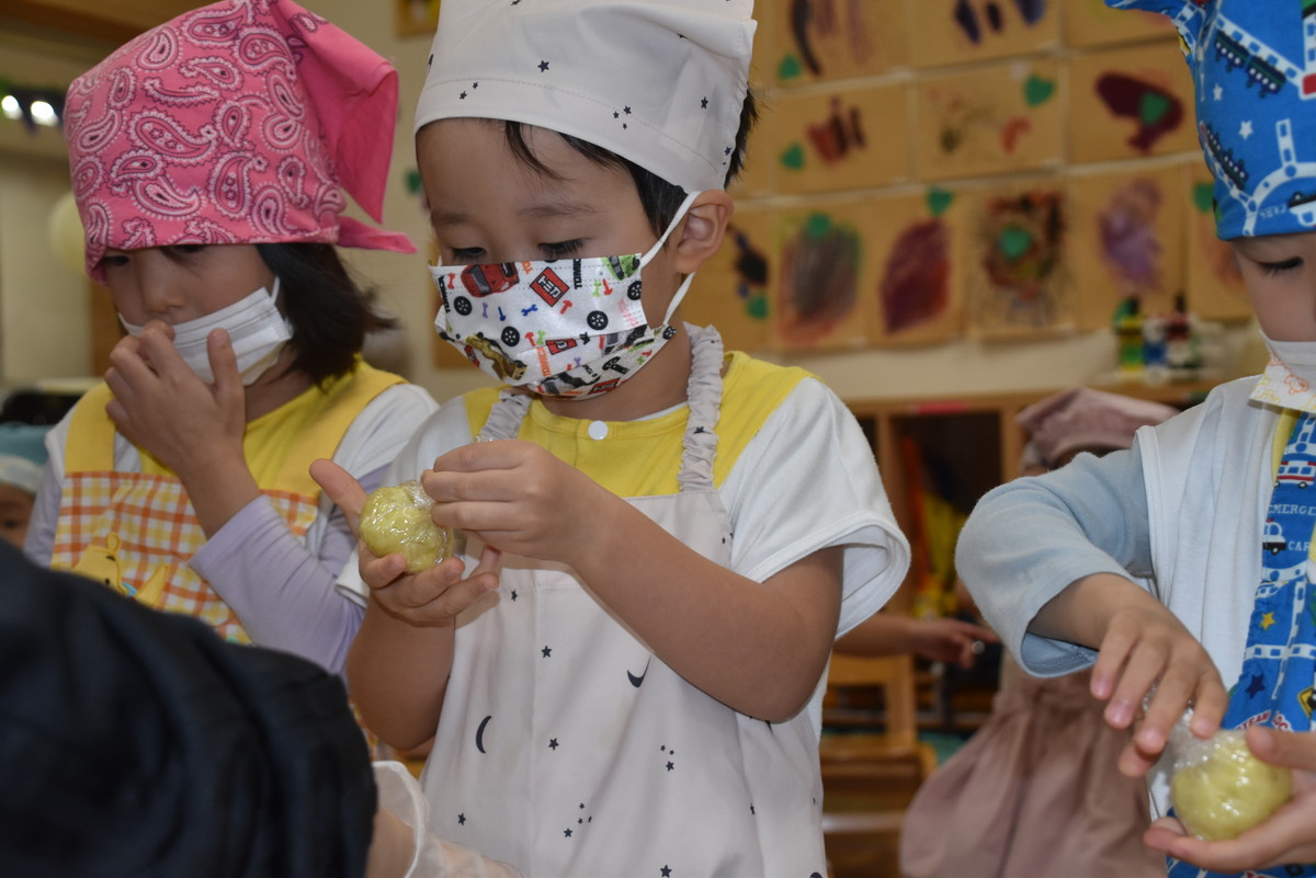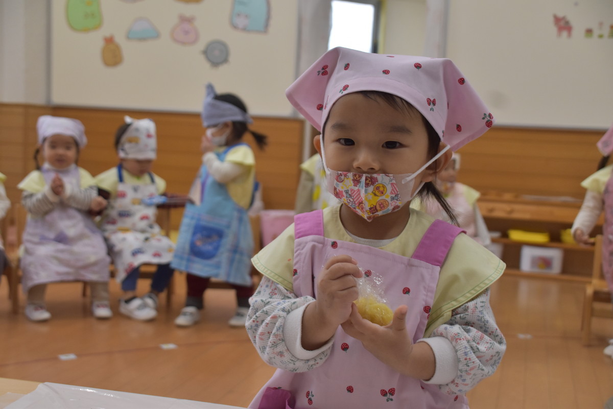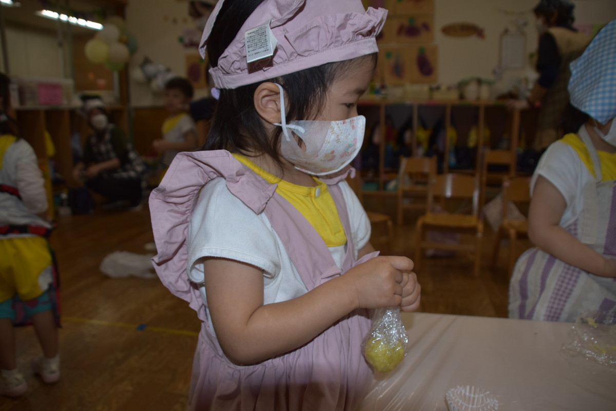 今日は、ちゅうりっぷぐみとこすもすぐみが9月のいもほり遠足時に収穫してきたさつまいもを使った「いもきんとん」作りを行いました。