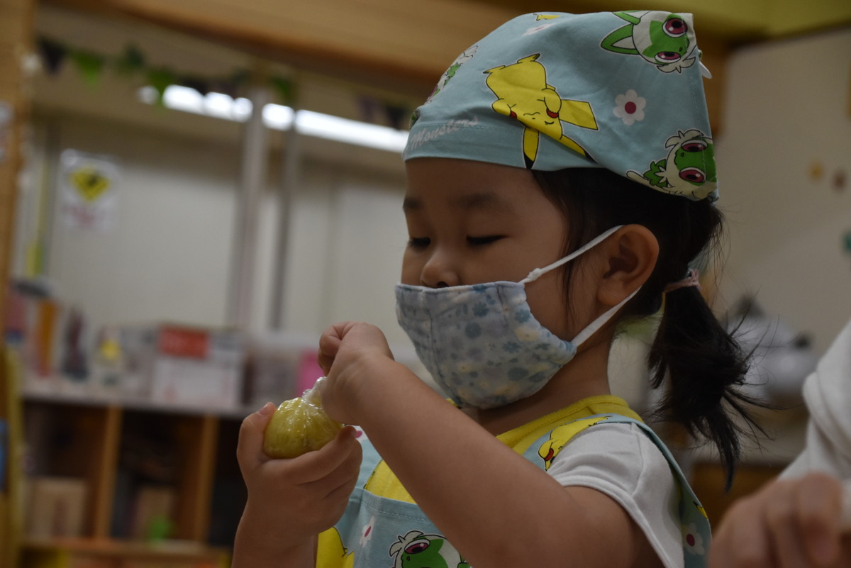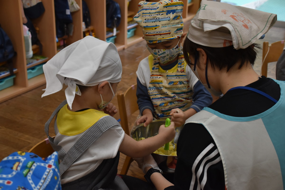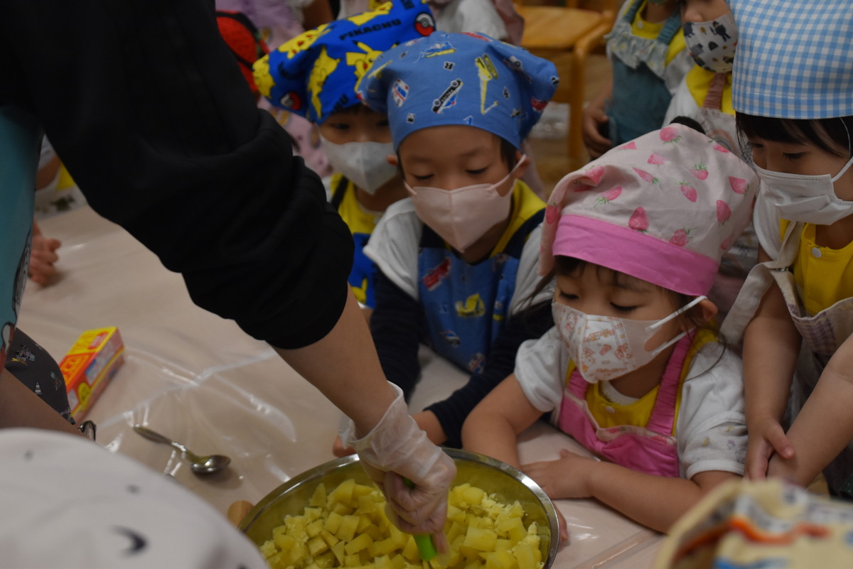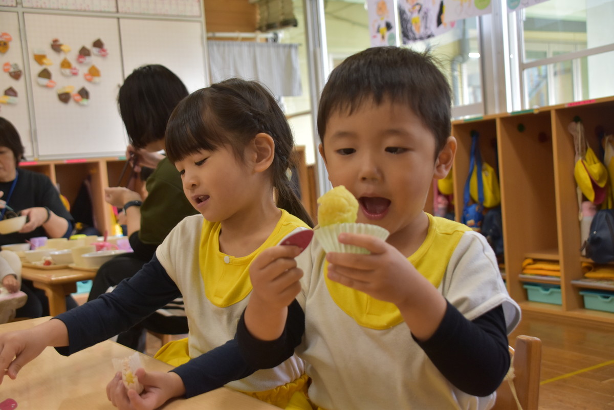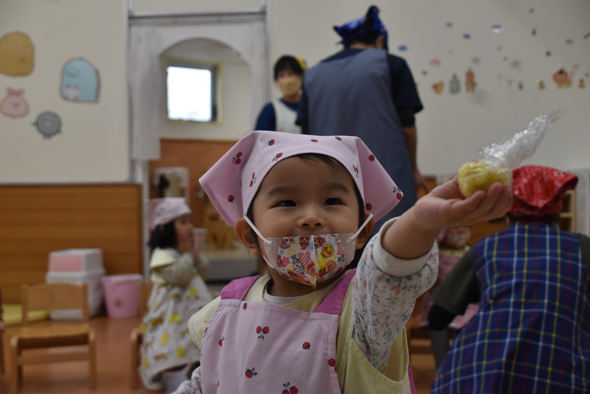 今日は、ちゅうりっぷぐみとこすもすぐみが9月のいもほり遠足時に収穫してきたさつまいもを使った「いもきんとん」作りを行いました。