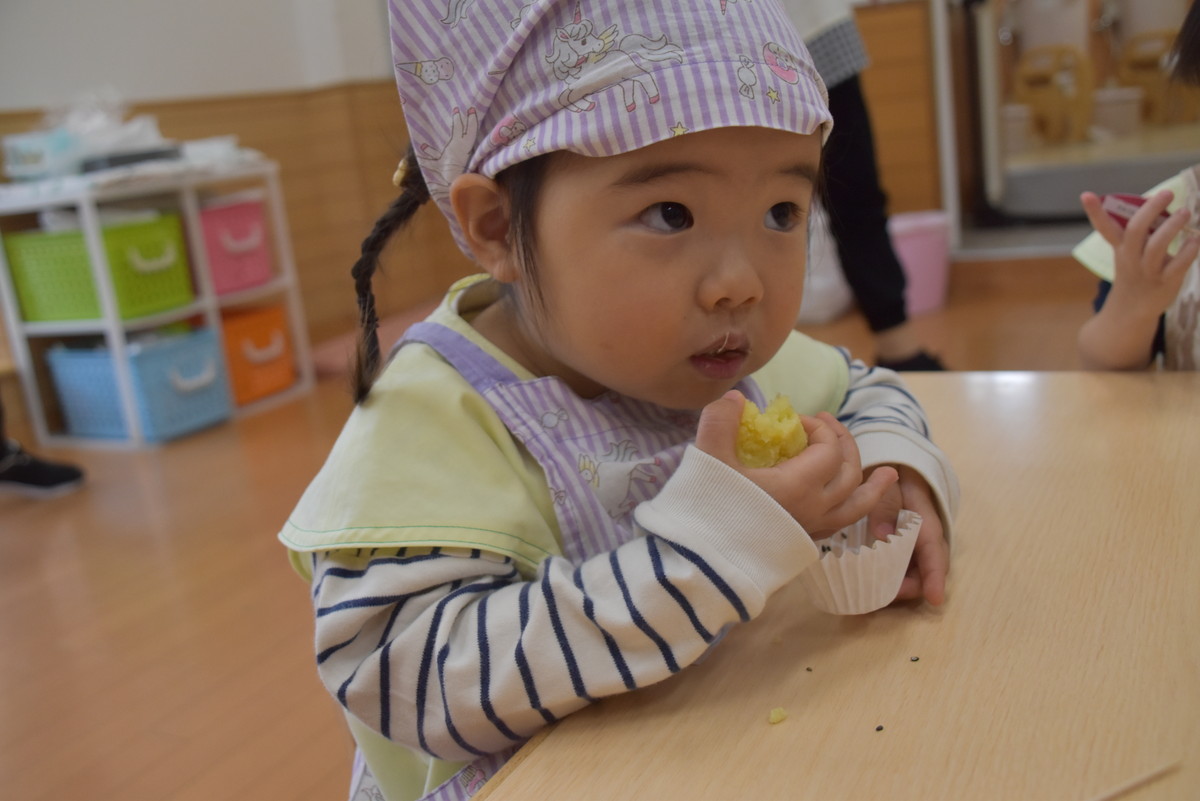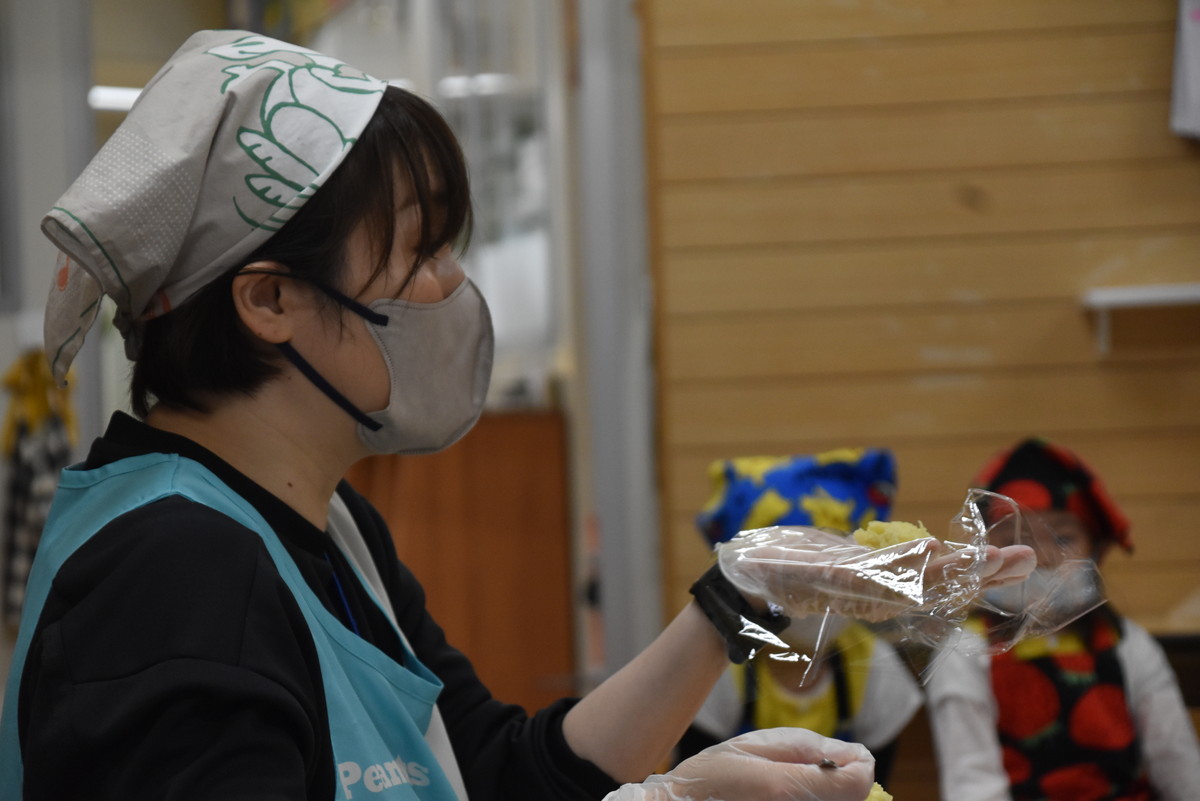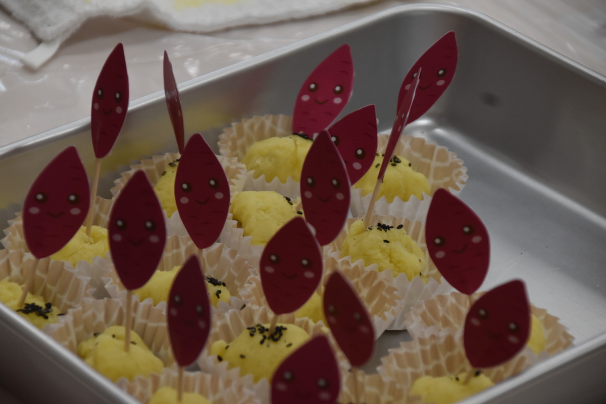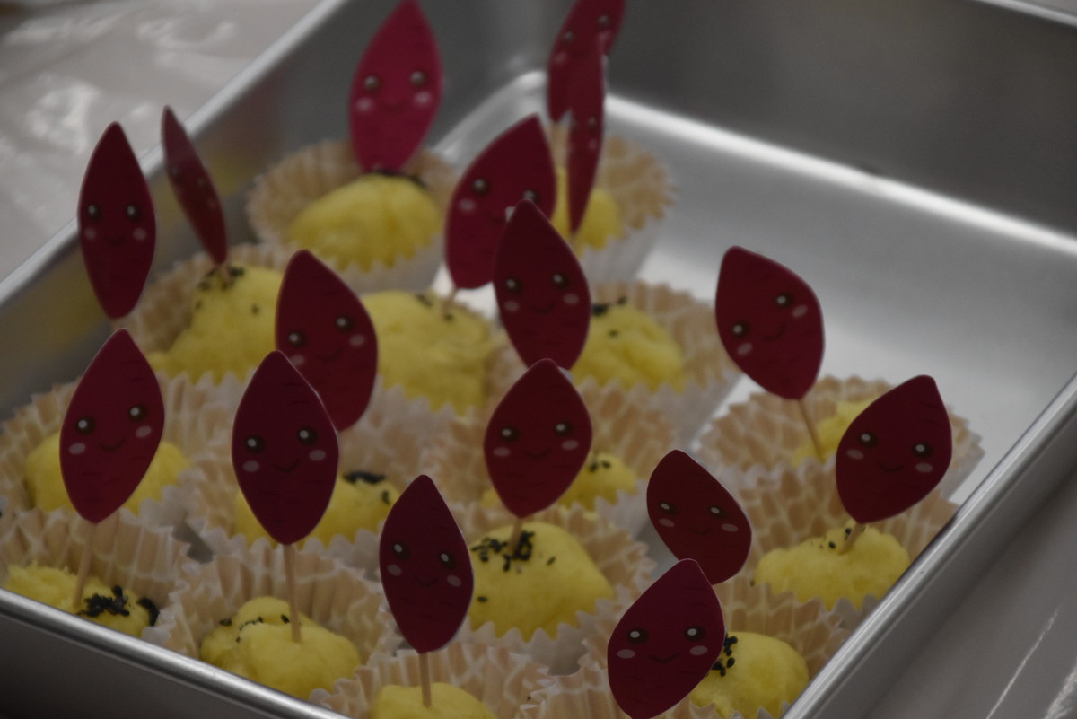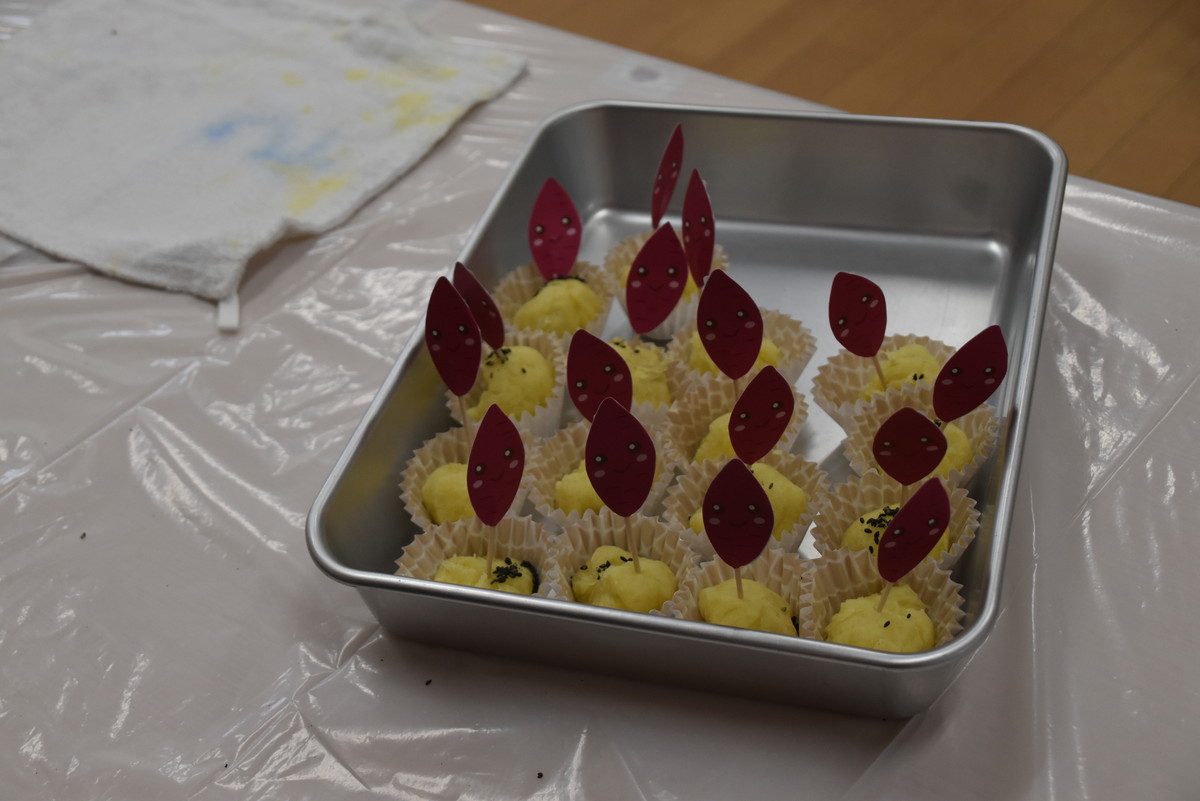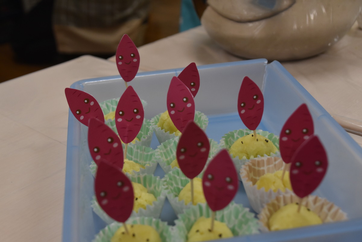 次も子どもたちの出番。潰したいもをラップに包んでくるくるするときれいなきんとんになり、それをカップに移して黒ゴマをふりかけたら完成。最後にかわいいさつまいものイラストを貼り付けた楊枝をきんとんに挿して、みんなでいただきましたよ。