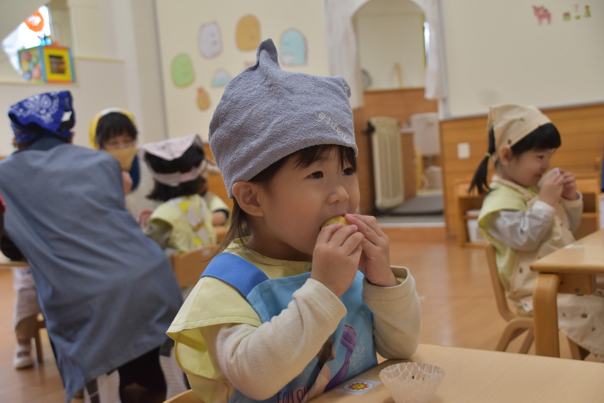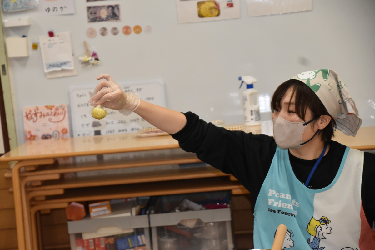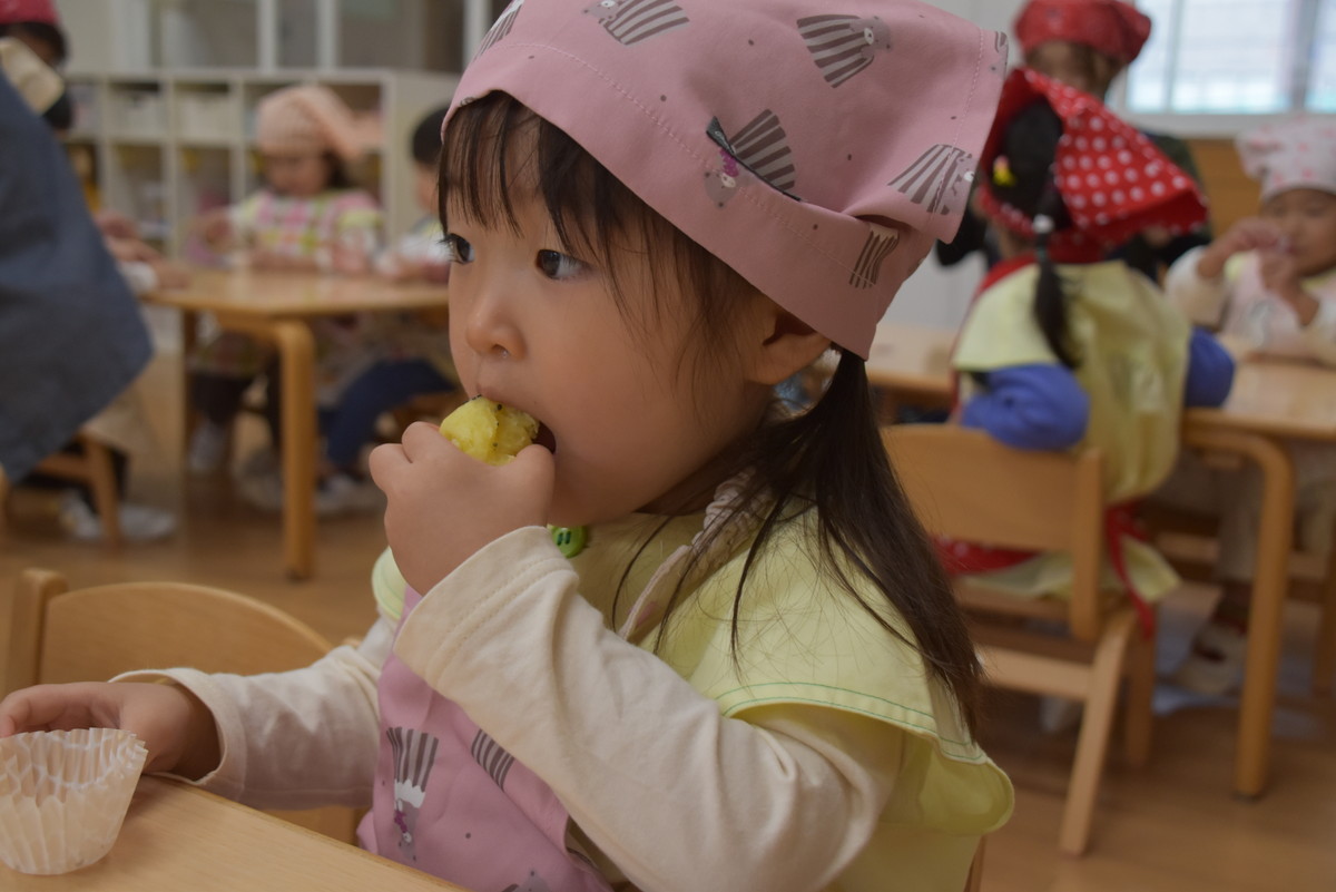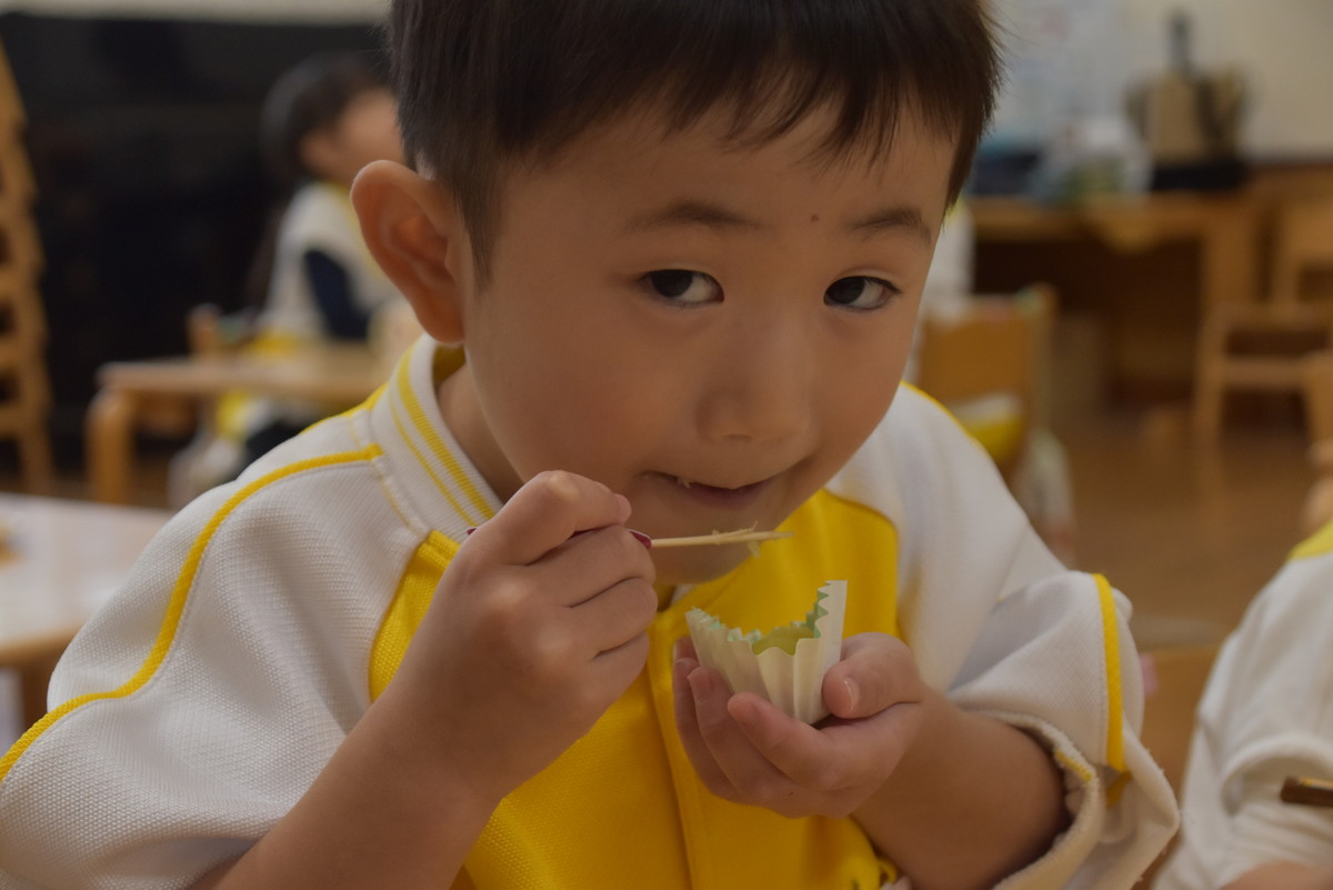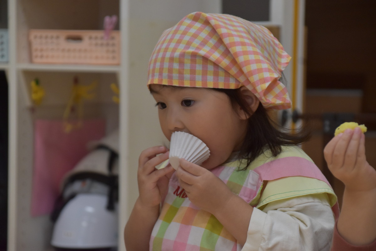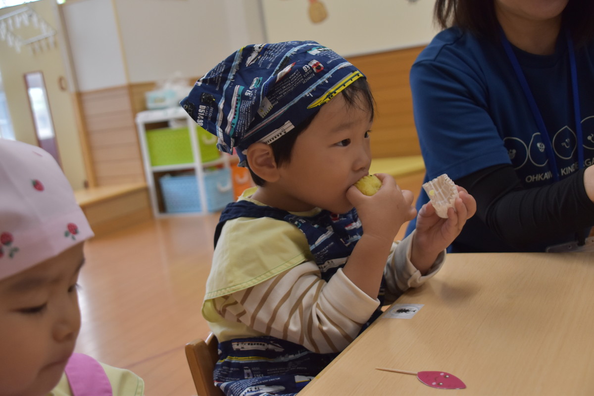 次も子どもたちの出番。潰したいもをラップに包んでくるくるするときれいなきんとんになり、それをカップに移して黒ゴマをふりかけたら完成。最後にかわいいさつまいものイラストを貼り付けた楊枝をきんとんに挿して、みんなでいただきましたよ。