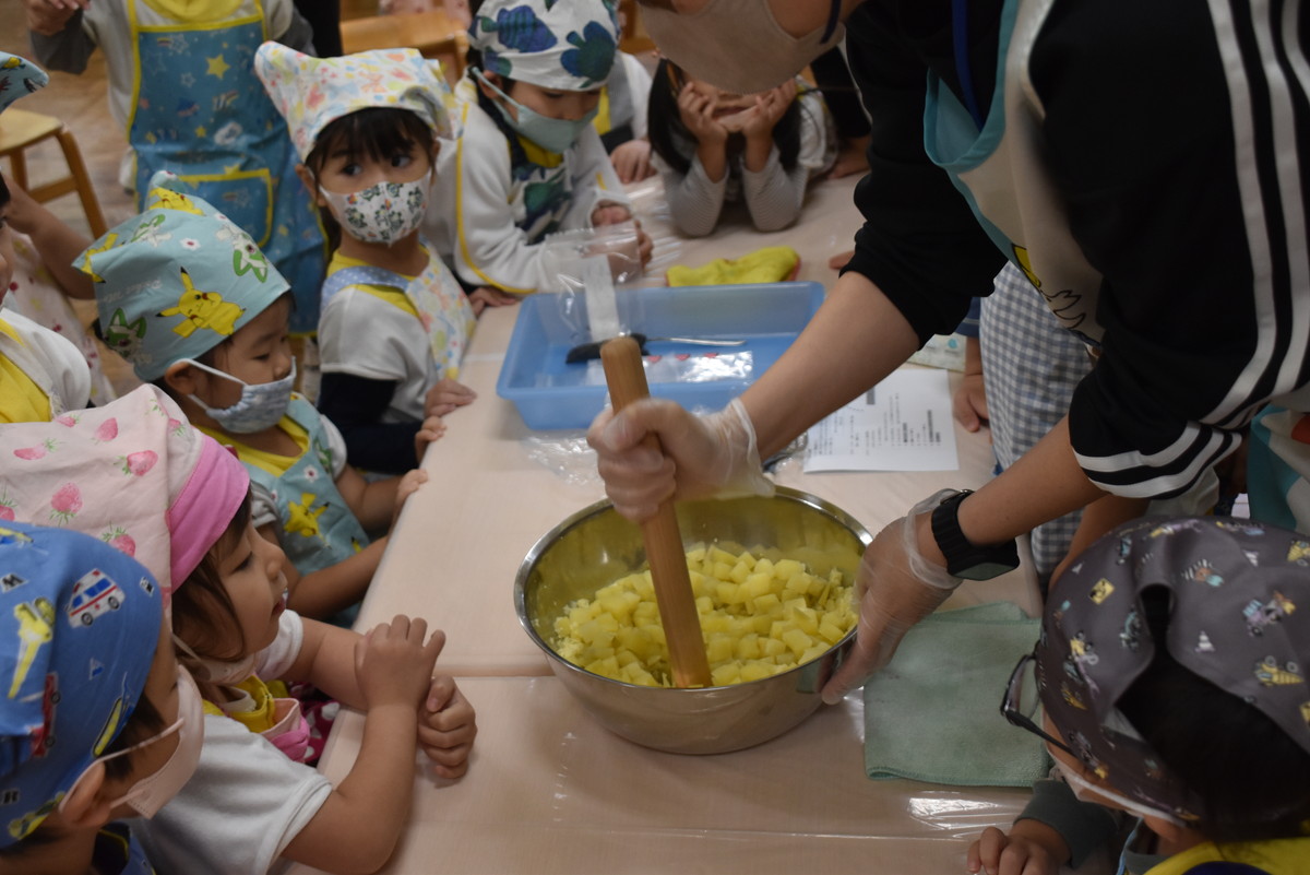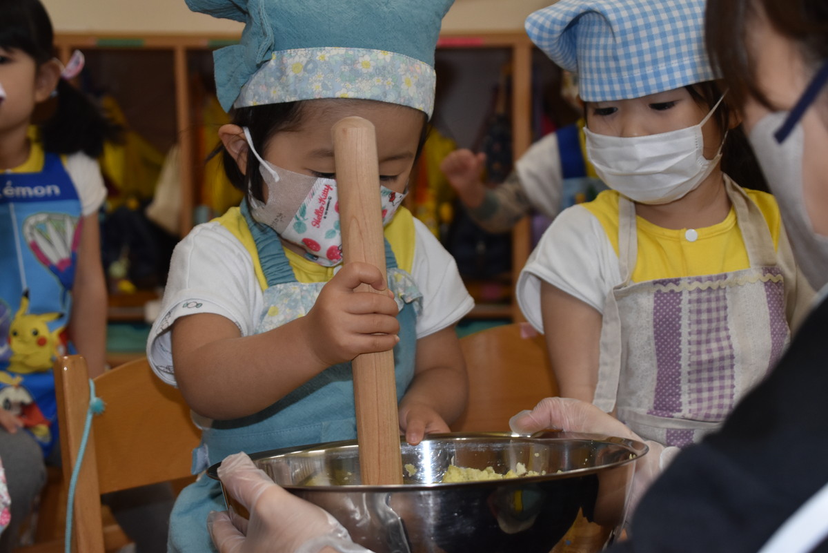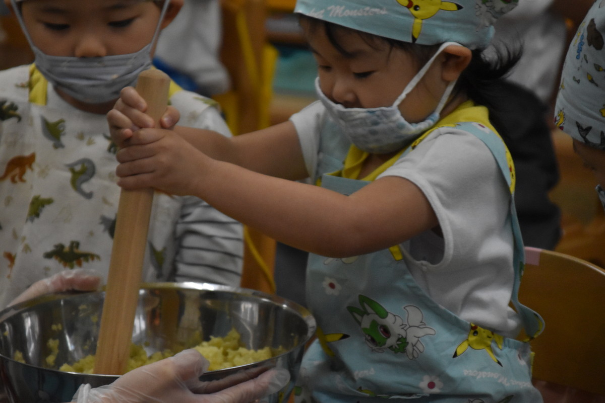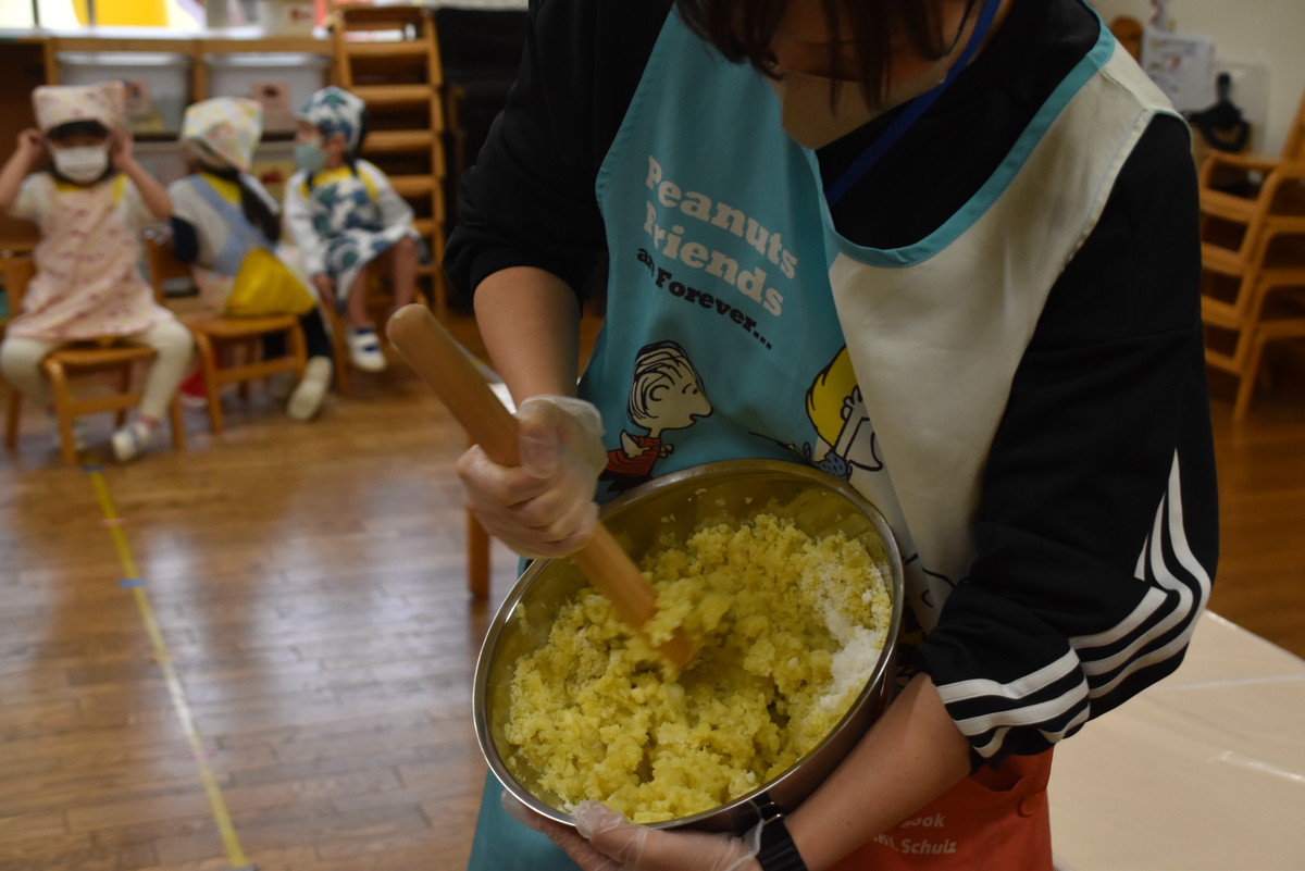 茹であがったさつまいもをマッシャーで潰すのは子どもたちの作業。とても上手に押し潰していましたよ。最後の仕上げは担任の先生の作業で、麺棒でしっかり潰しました。