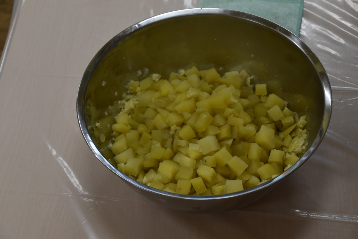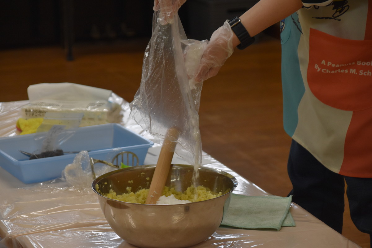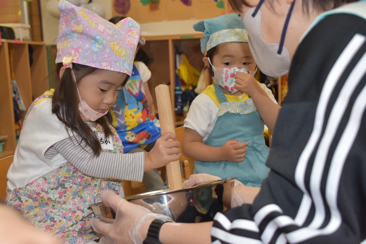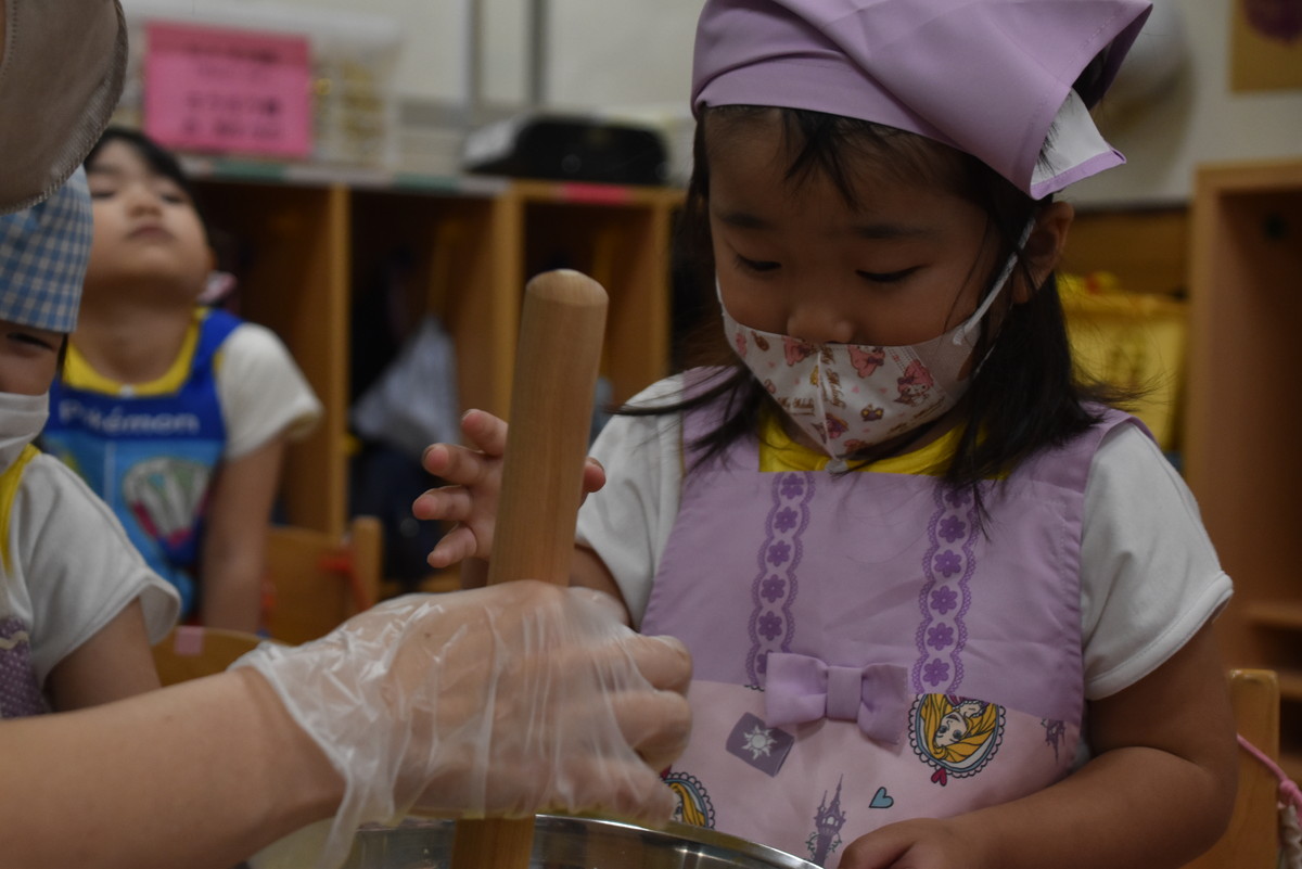 茹であがったさつまいもをマッシャーで潰すのは子どもたちの作業。とても上手に押し潰していましたよ。最後の仕上げは担任の先生の作業で、麺棒でしっかり潰しました。