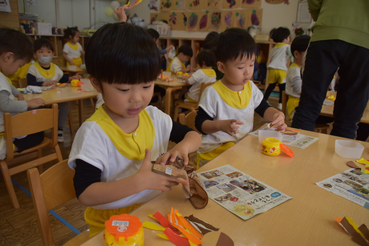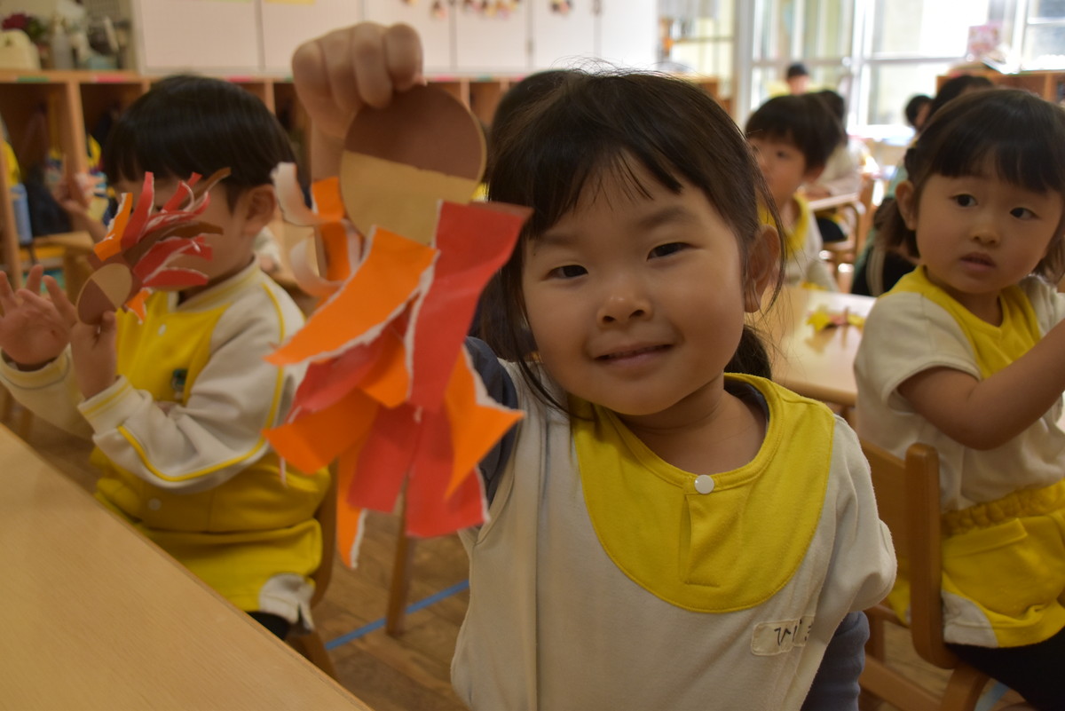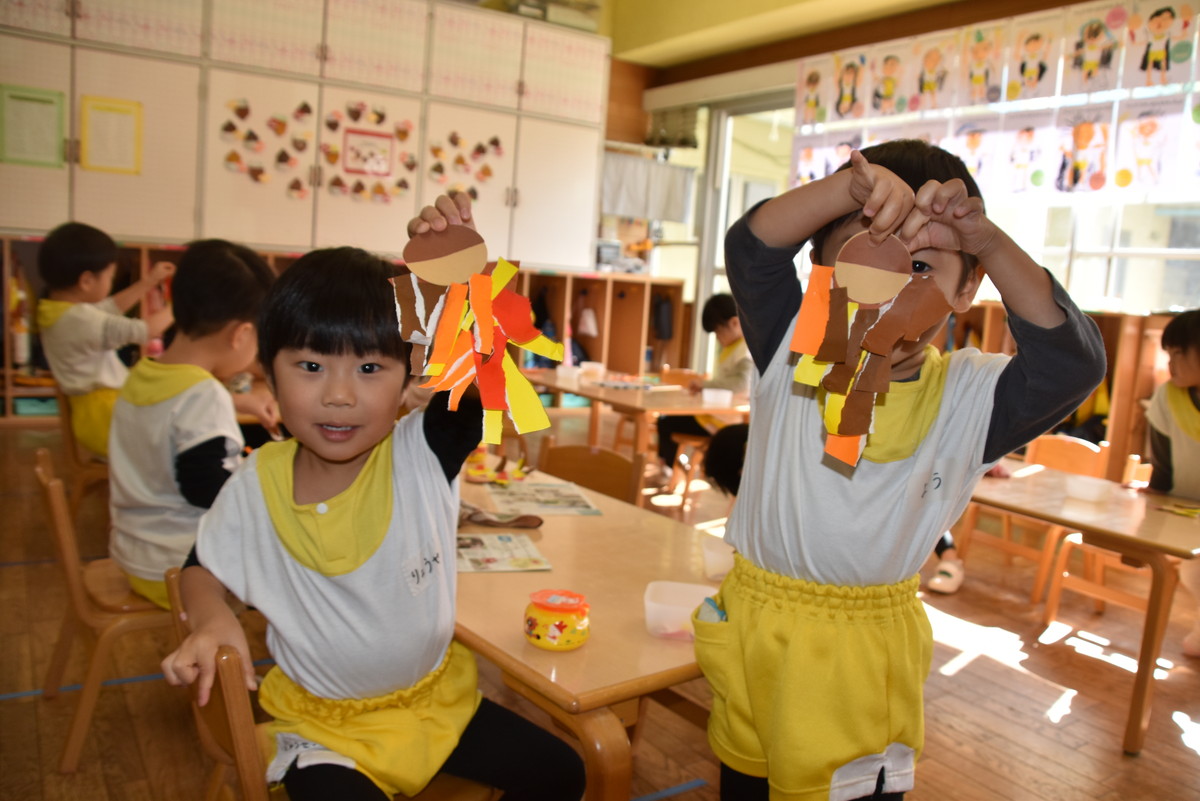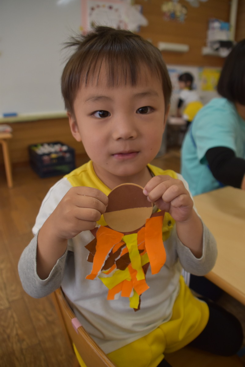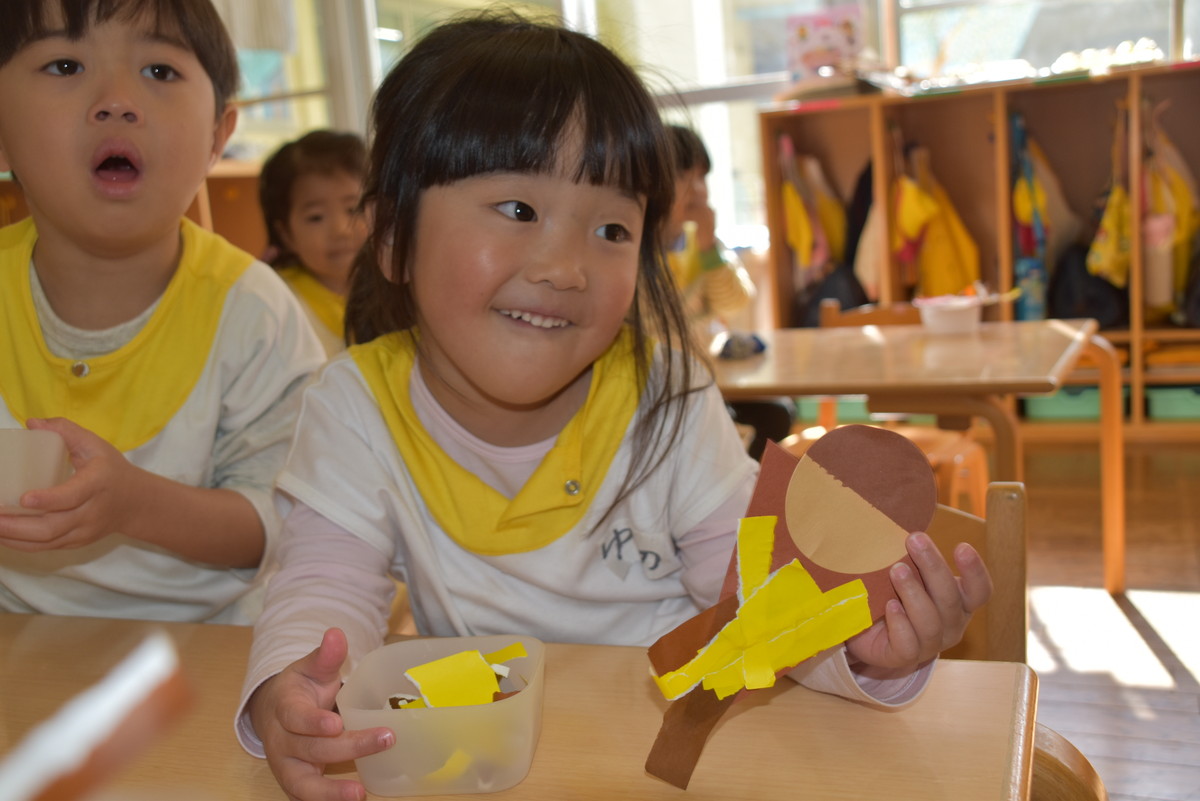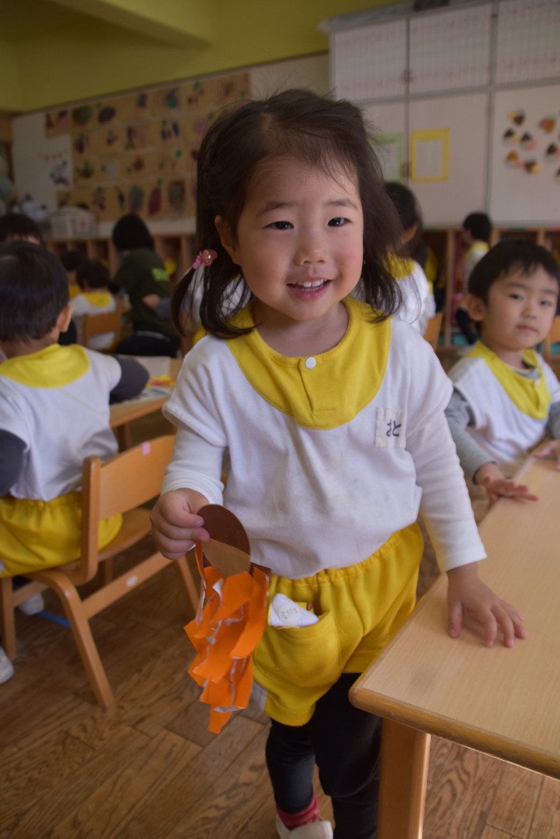 幼稚園での製作活動では、かわいいミノムシ作りをしていた年少さんでした。秋のあたたかな日差しにぶら下がったミノムシさんたち。