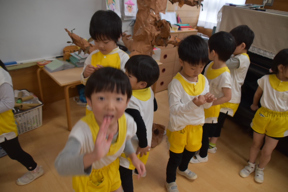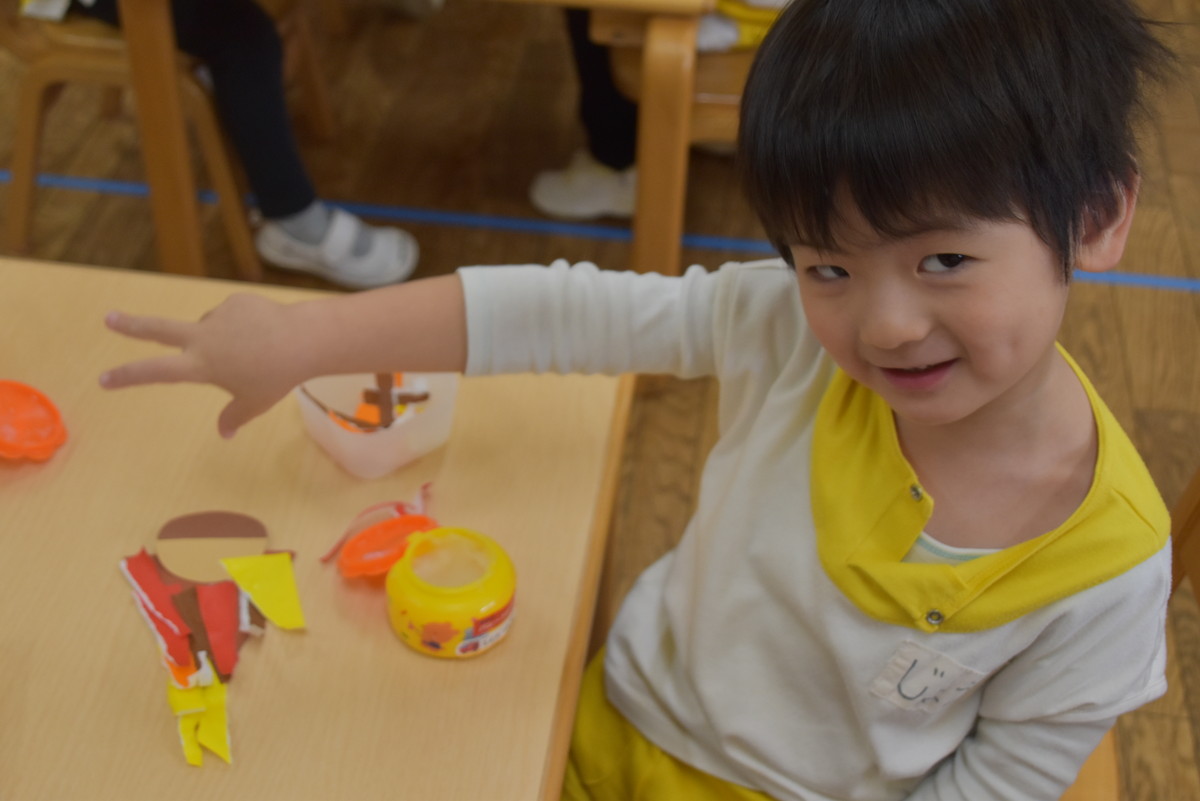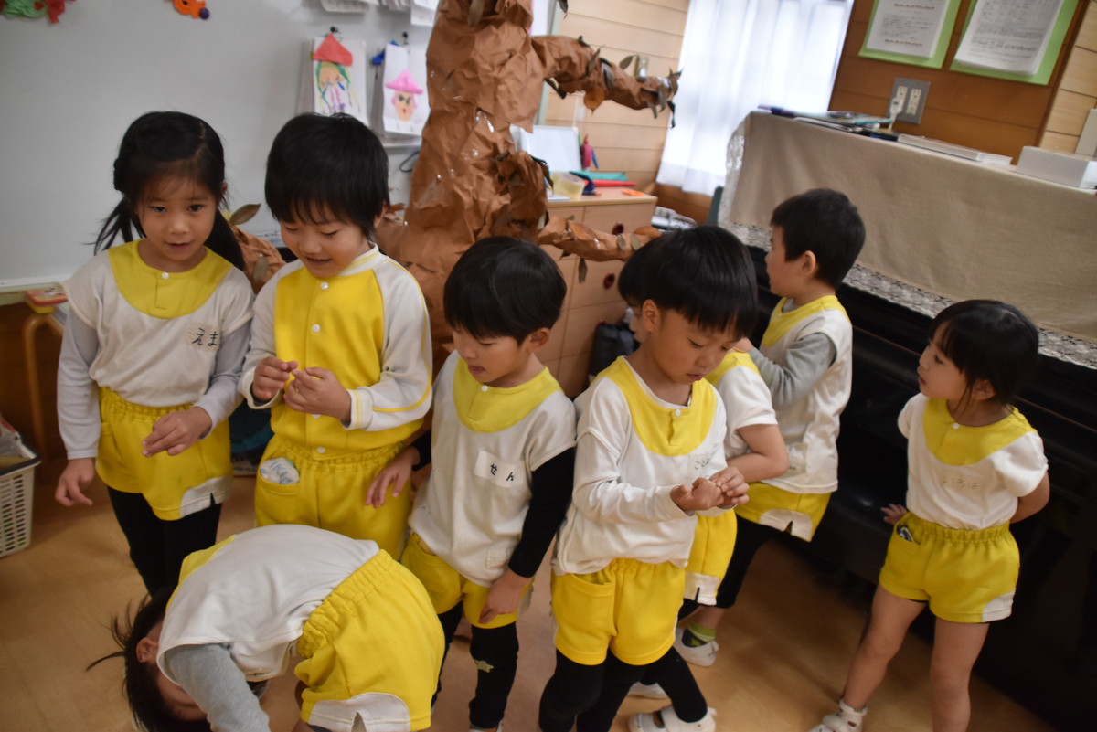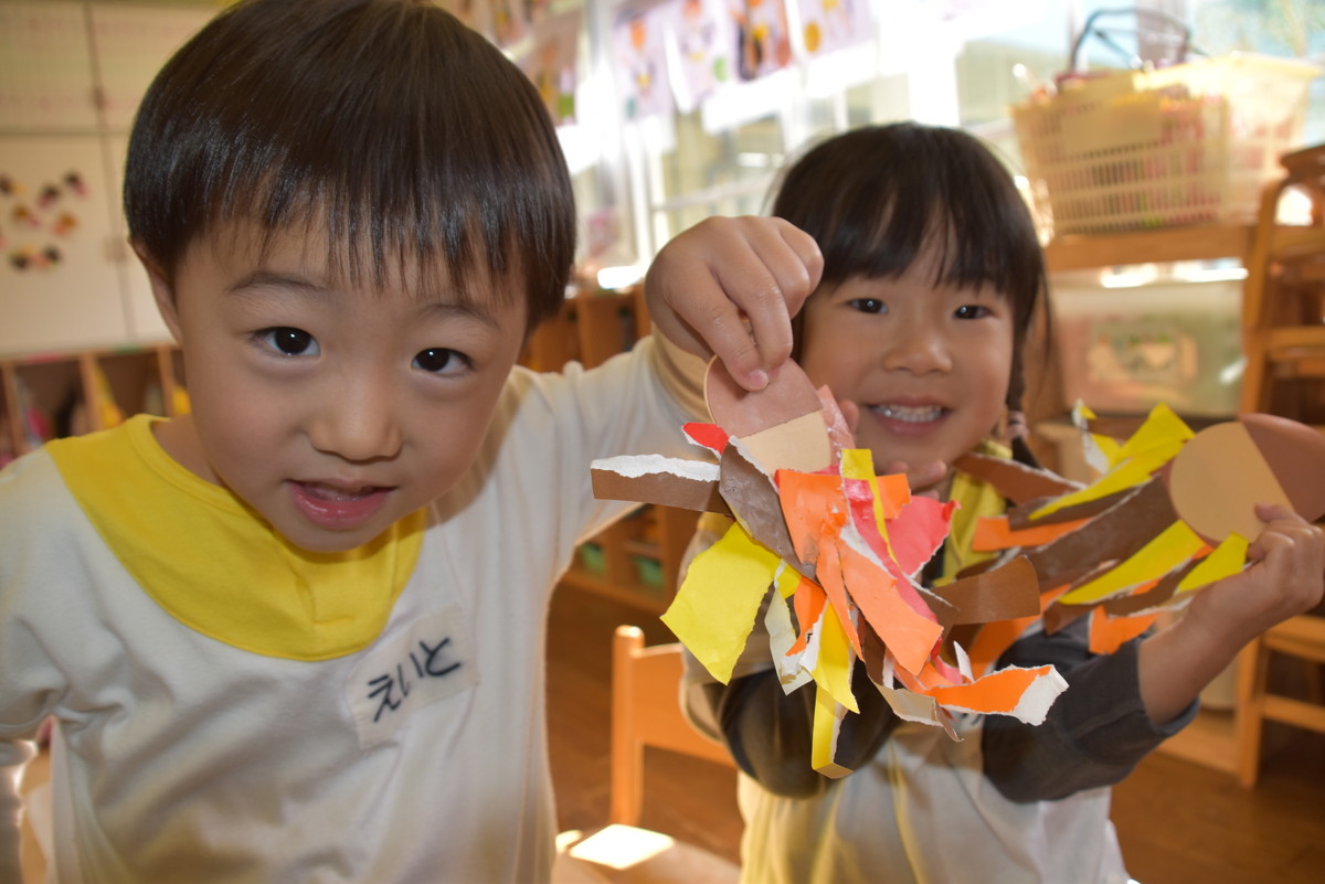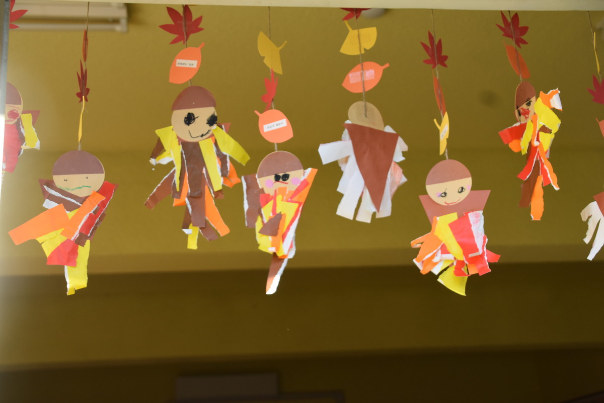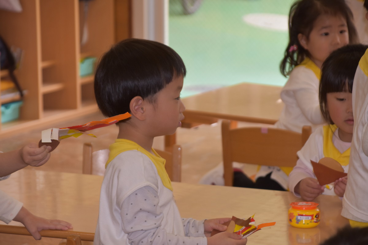 幼稚園での製作活動では、かわいいミノムシ作りをしていた年少さんでした。秋のあたたかな日差しにぶら下がったミノムシさんたち。