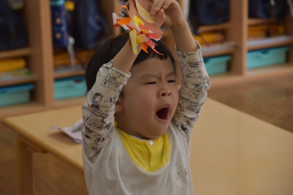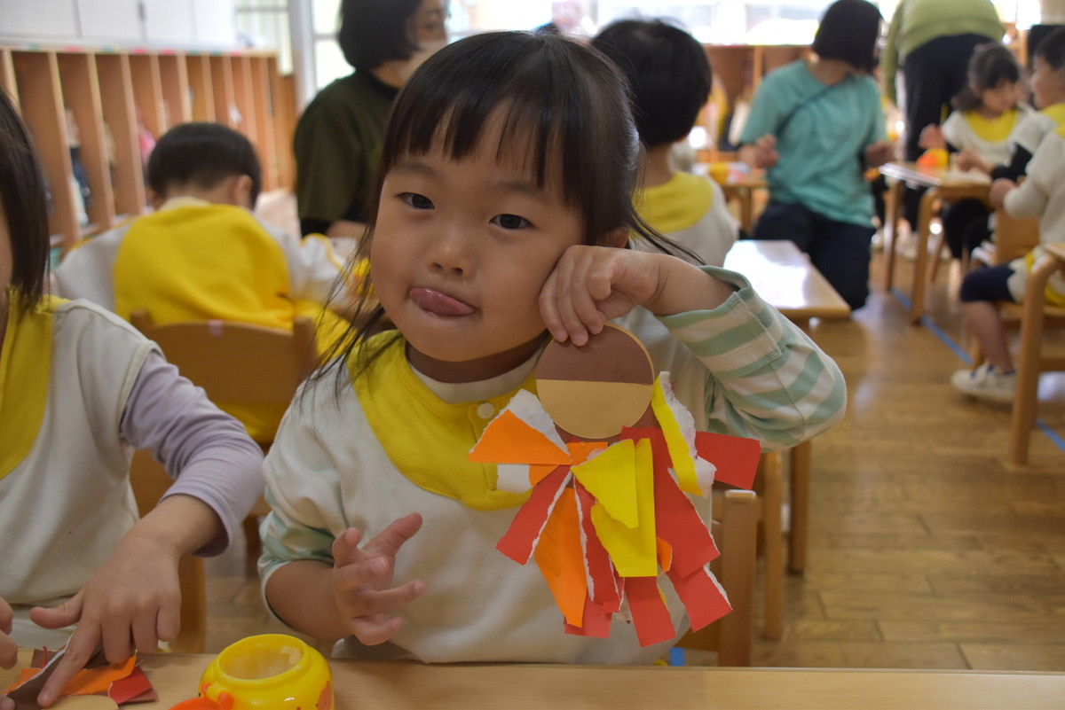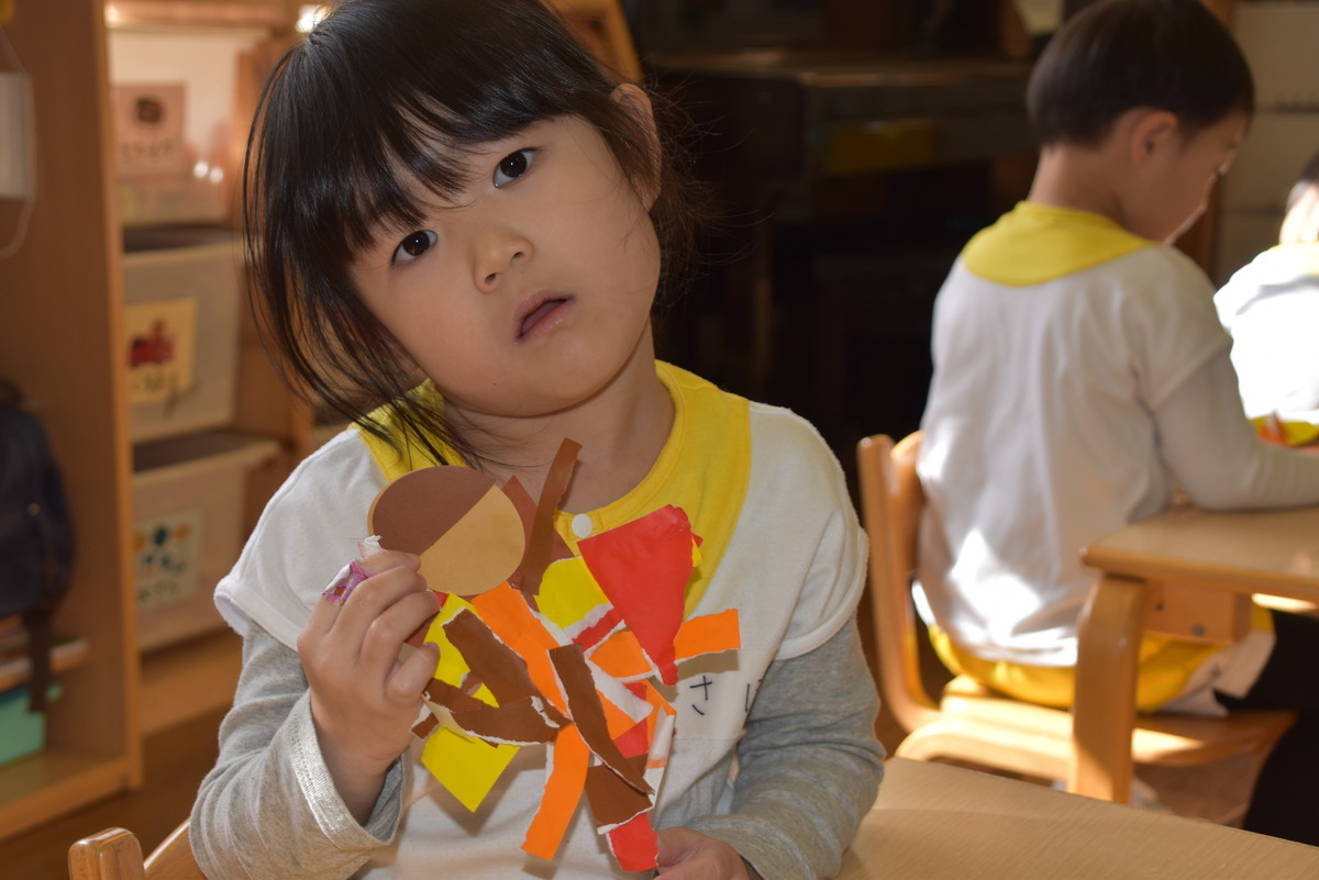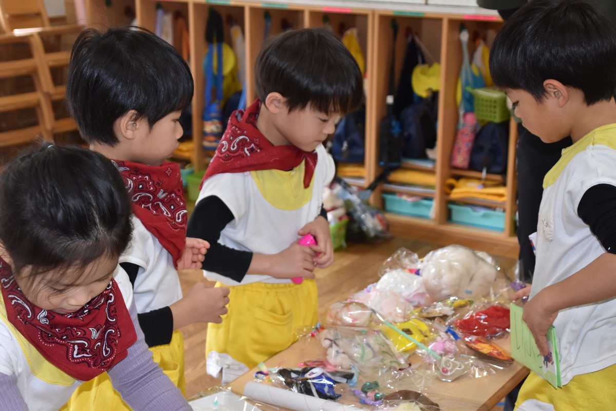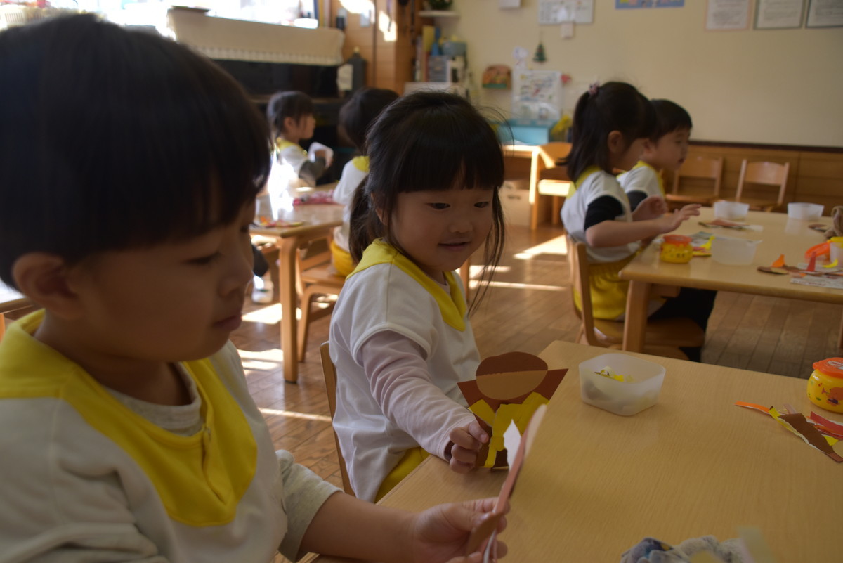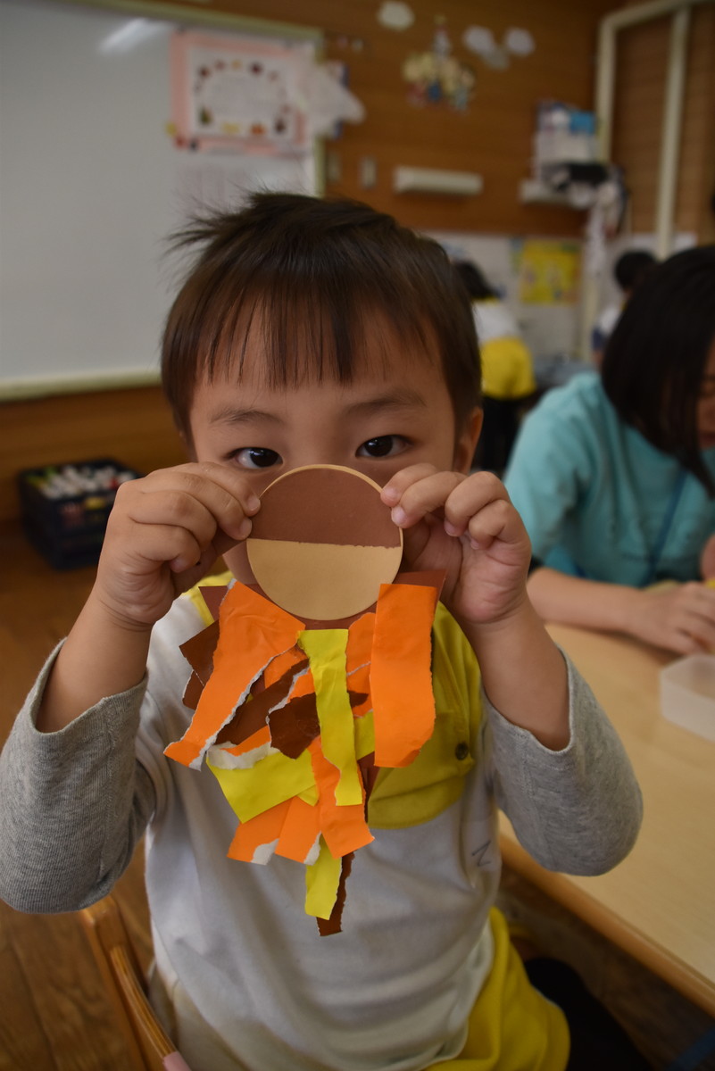 幼稚園での製作活動では、かわいいミノムシ作りをしていた年少さんでした。秋のあたたかな日差しにぶら下がったミノムシさんたち。
