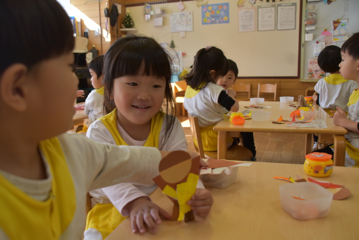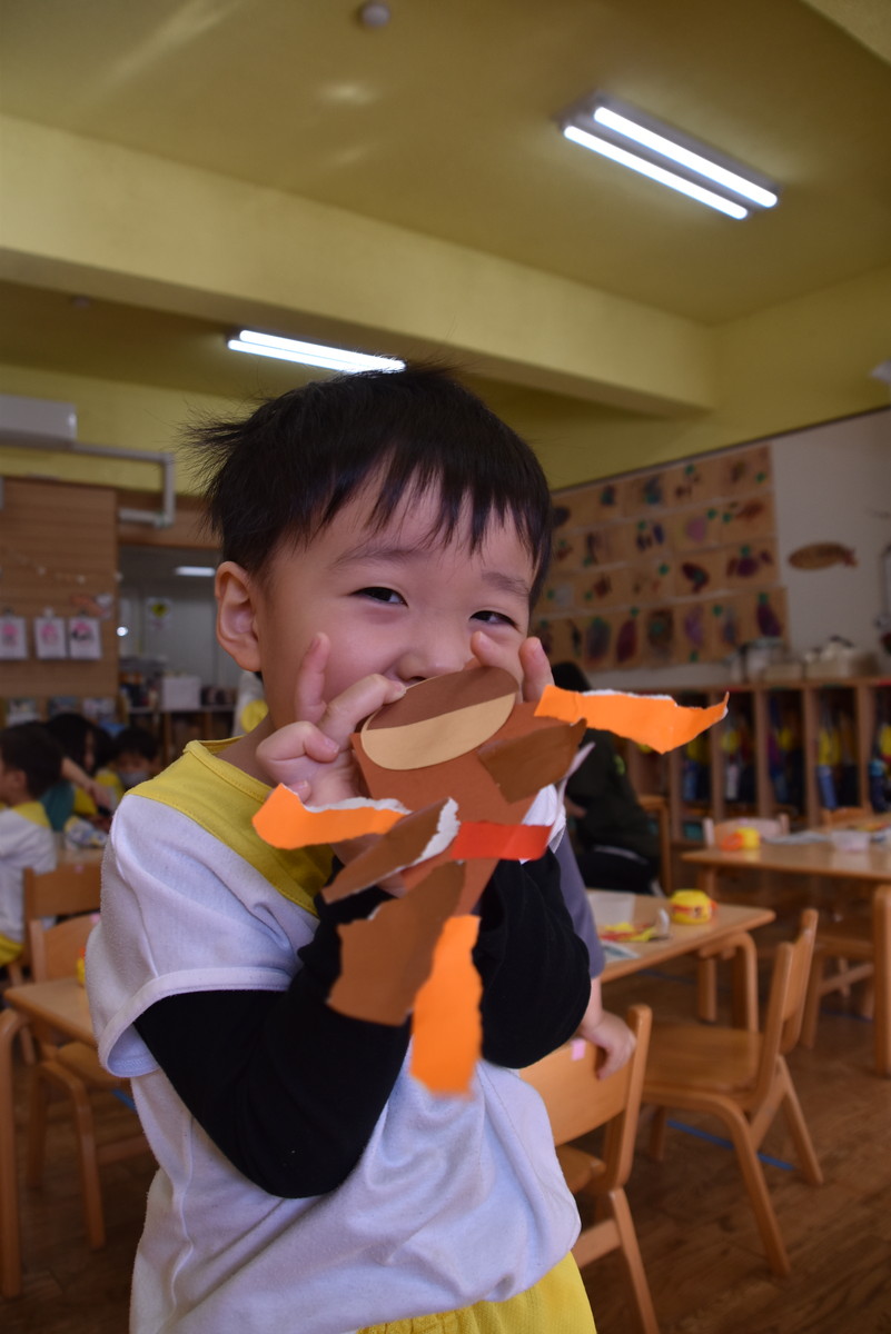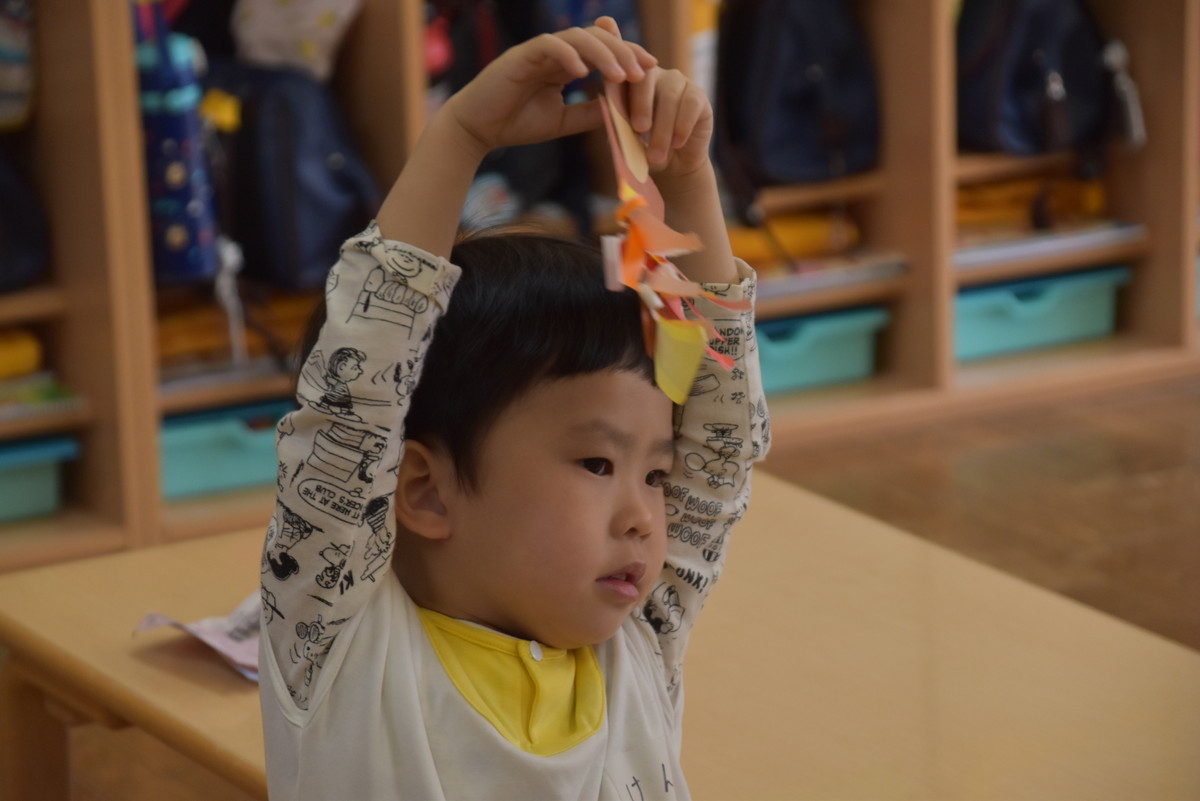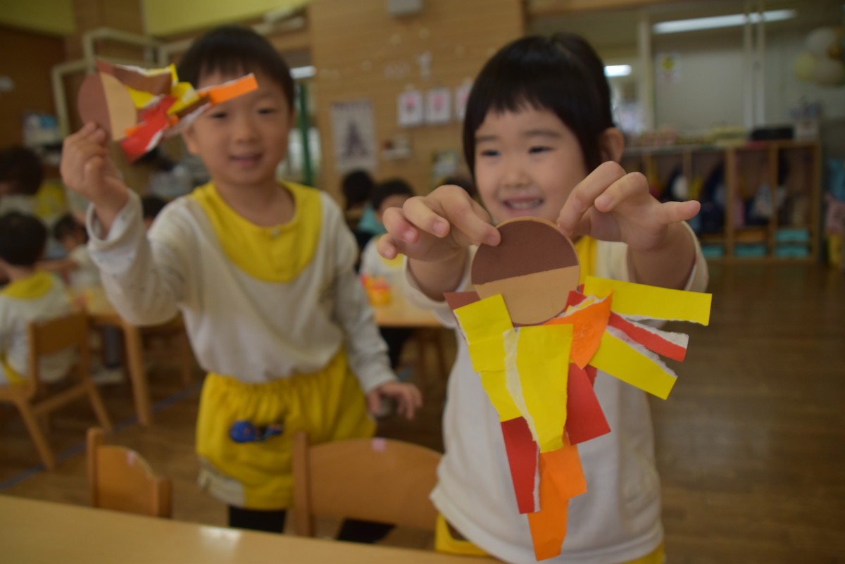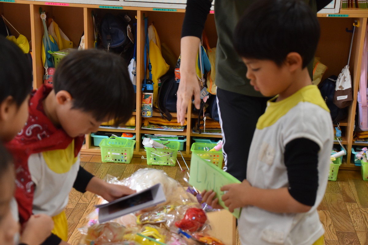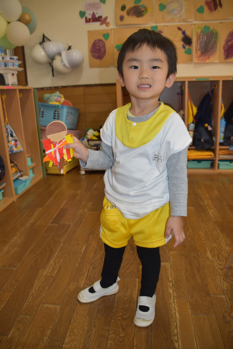 幼稚園での製作活動では、かわいいミノムシ作りをしていた年少さんでした。秋のあたたかな日差しにぶら下がったミノムシさんたち。