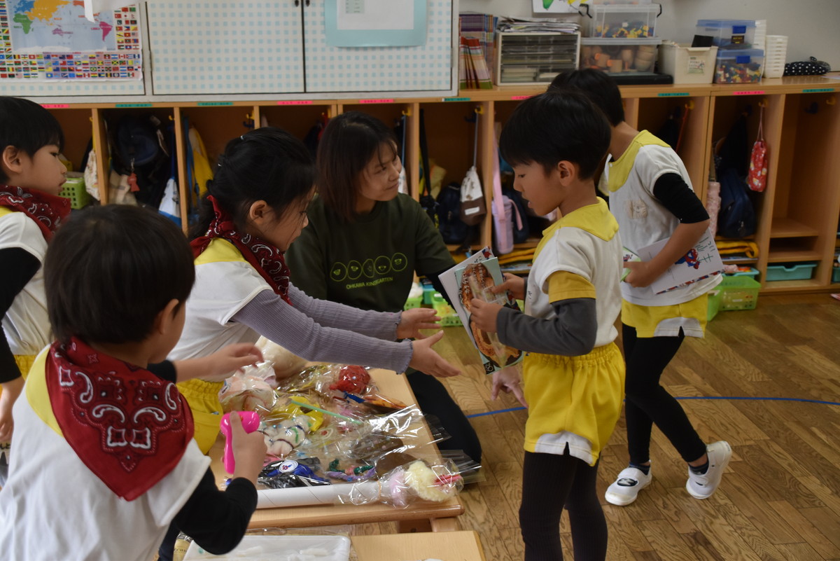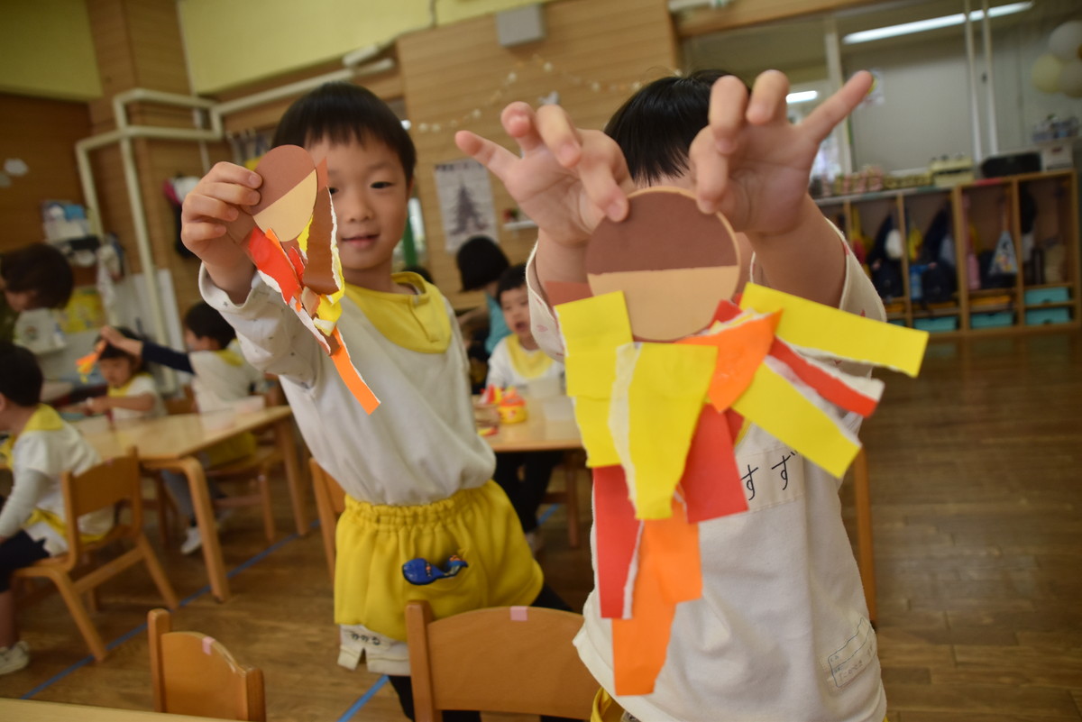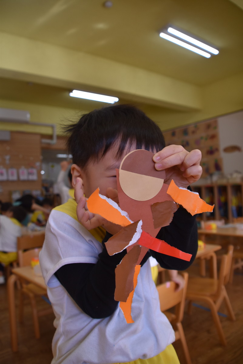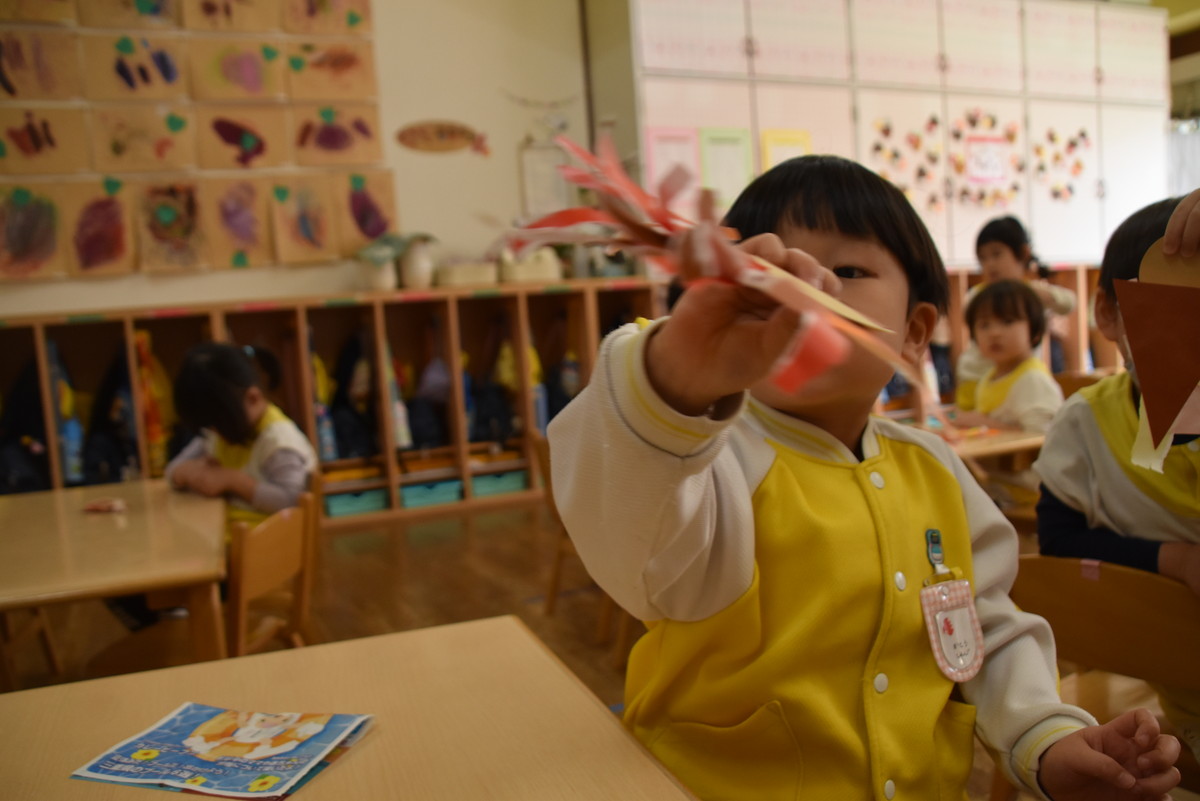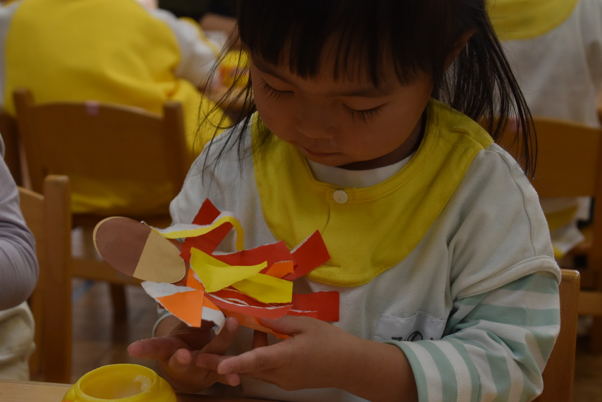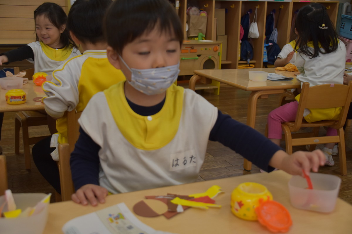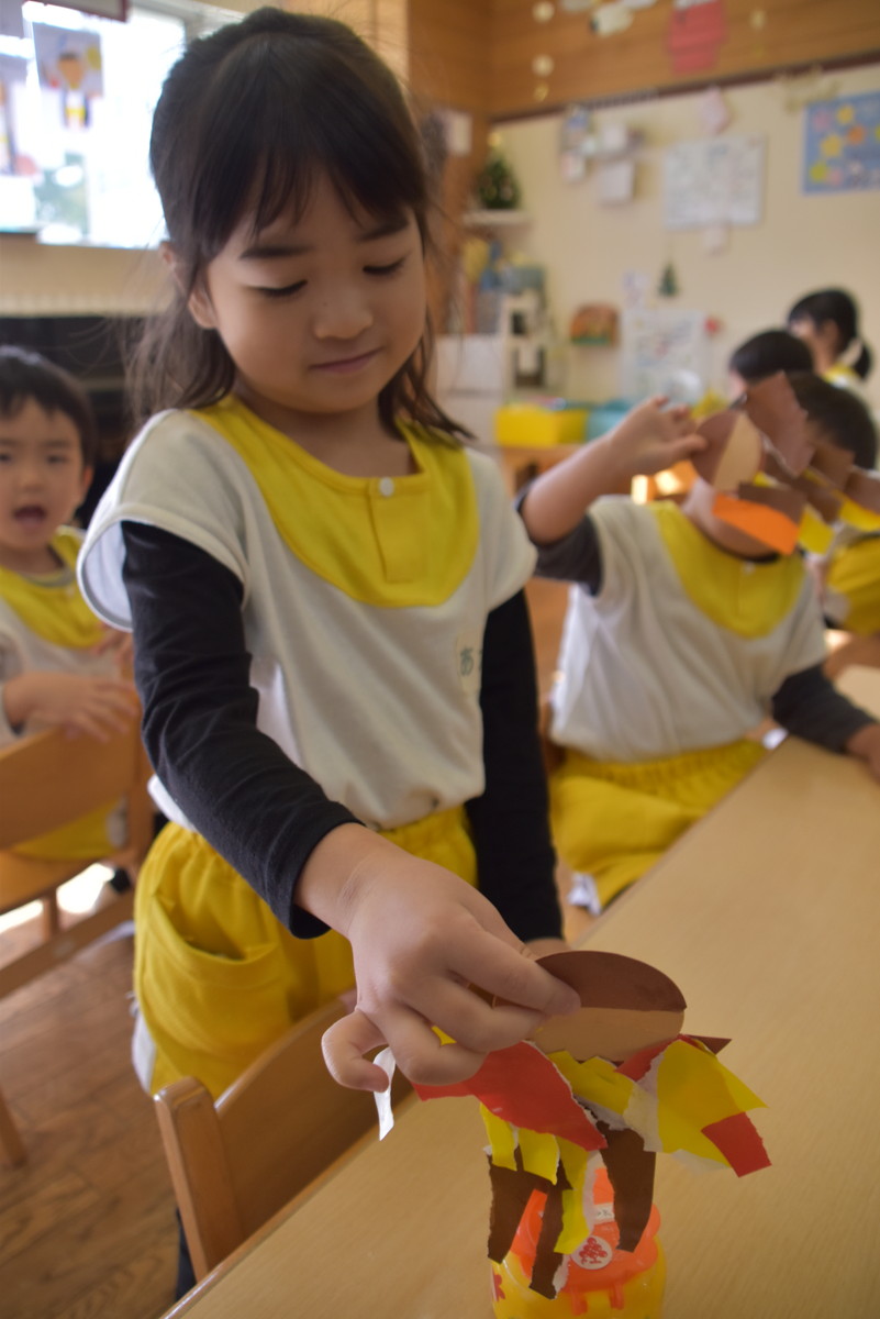 幼稚園での製作活動では、かわいいミノムシ作りをしていた年少さんでした。秋のあたたかな日差しにぶら下がったミノムシさんたち。