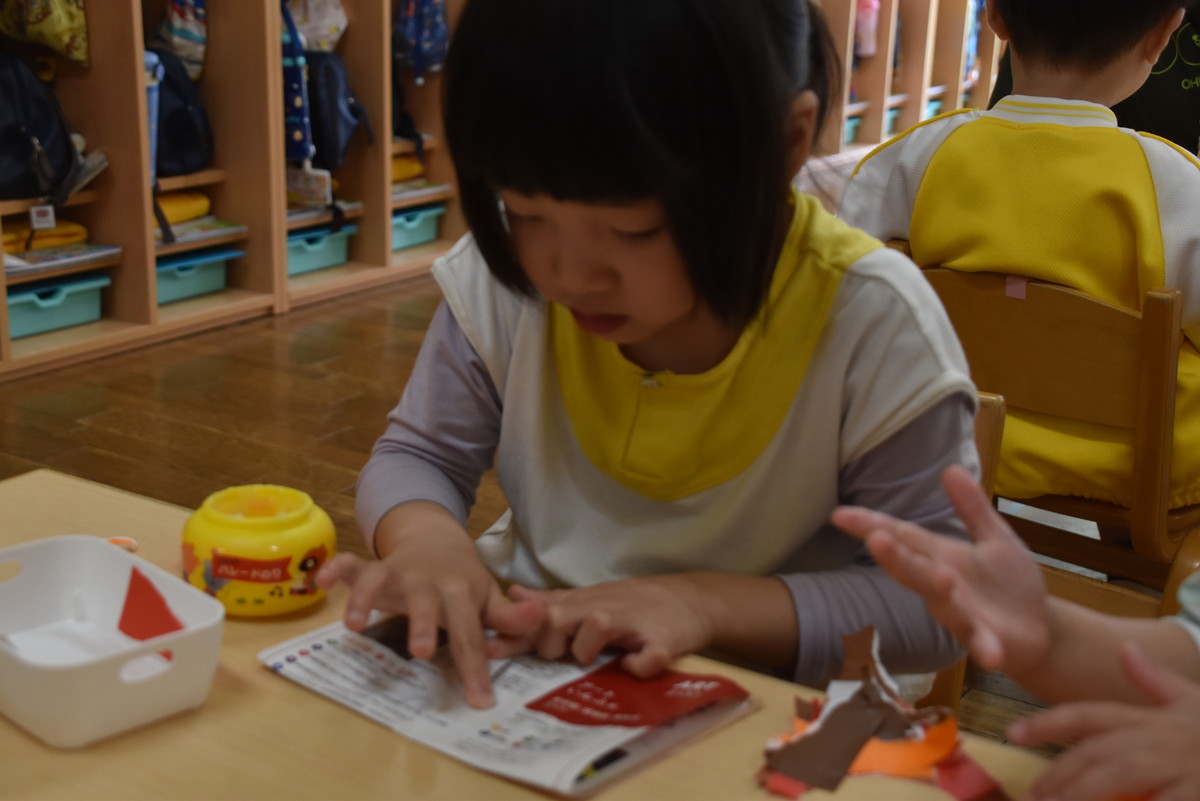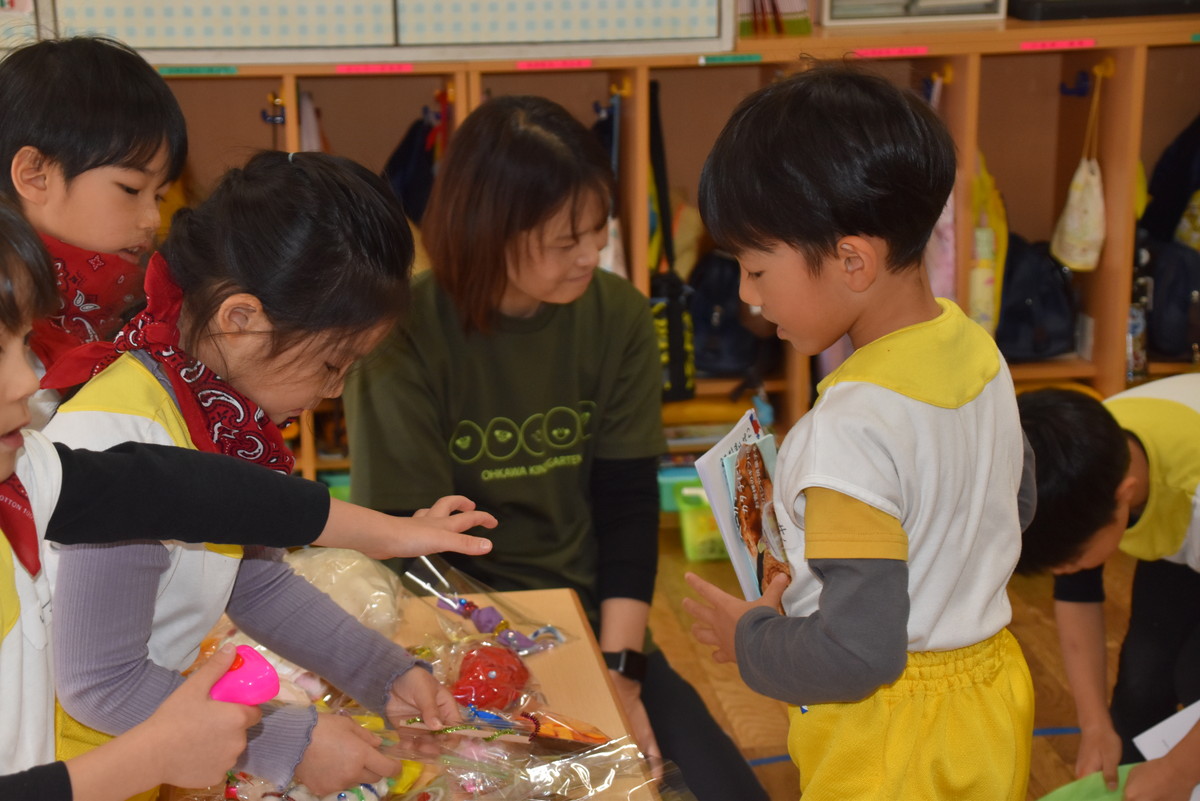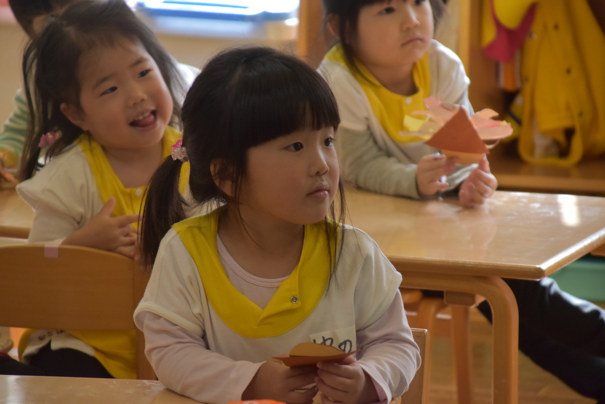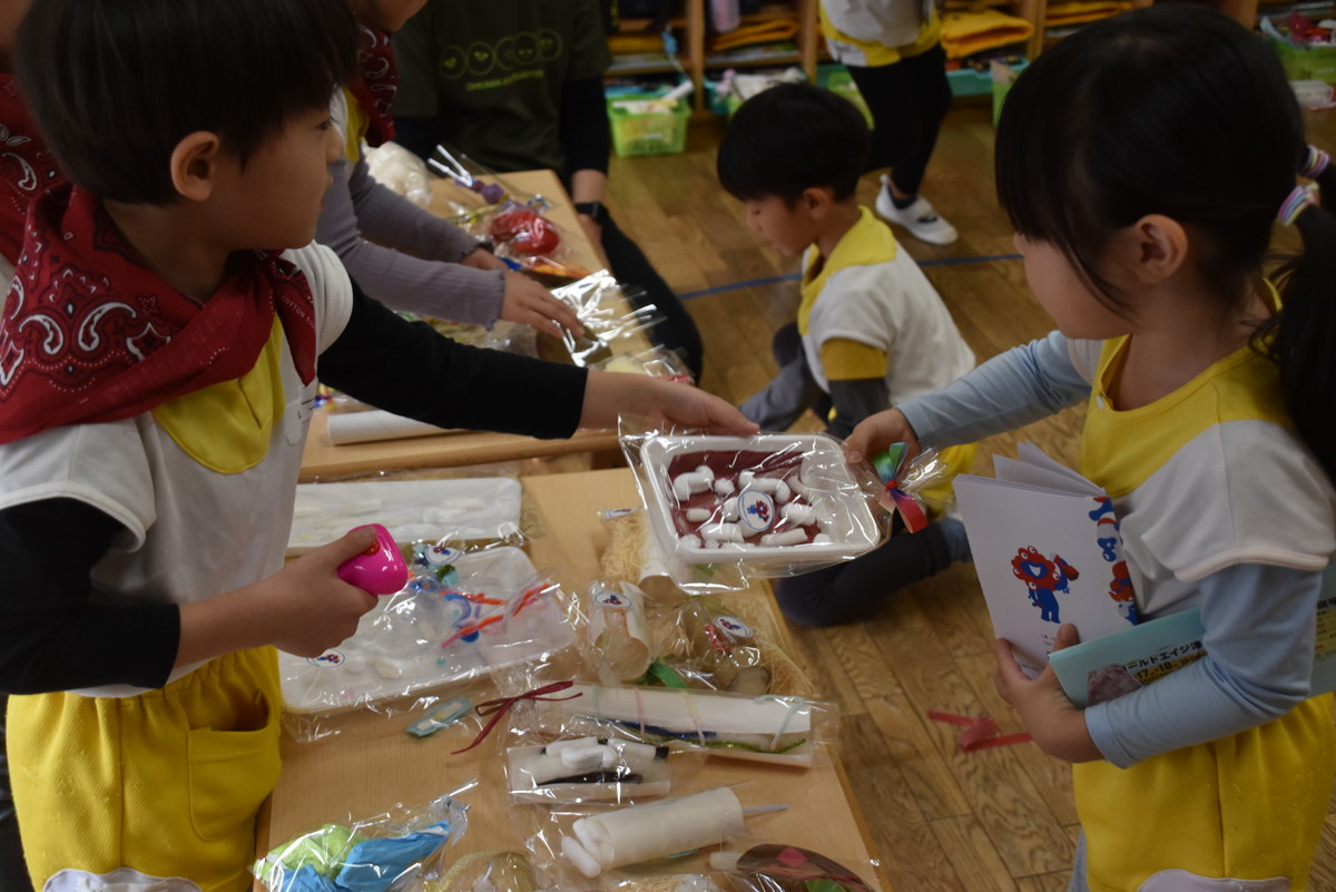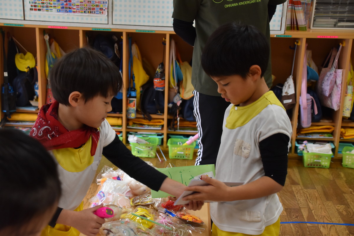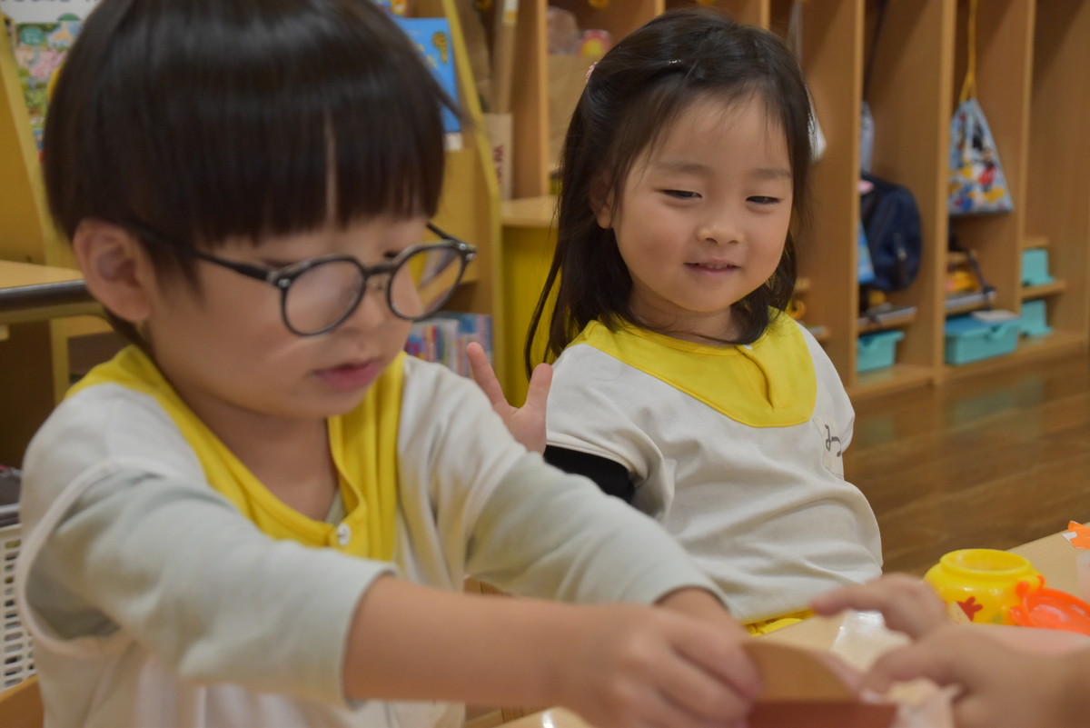幼稚園での製作活動では、かわいいミノムシ作りをしていた年少さんでした。秋のあたたかな日差しにぶら下がったミノムシさんたち。