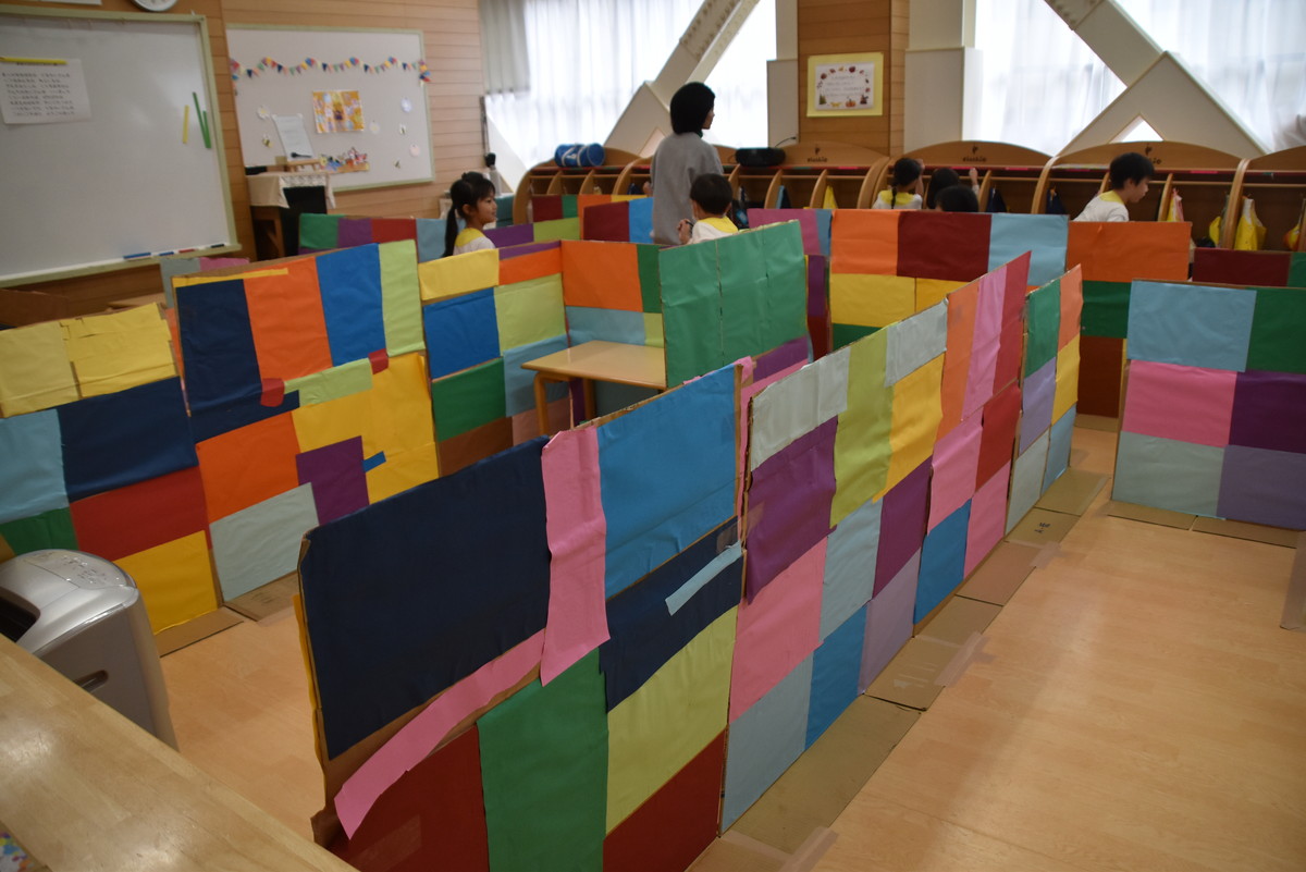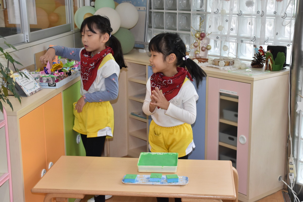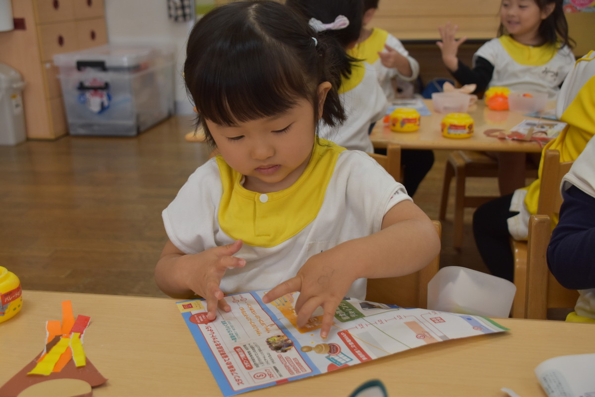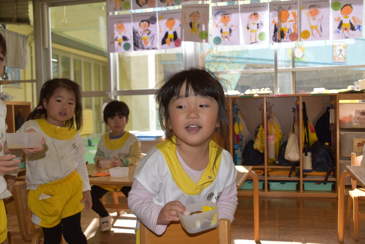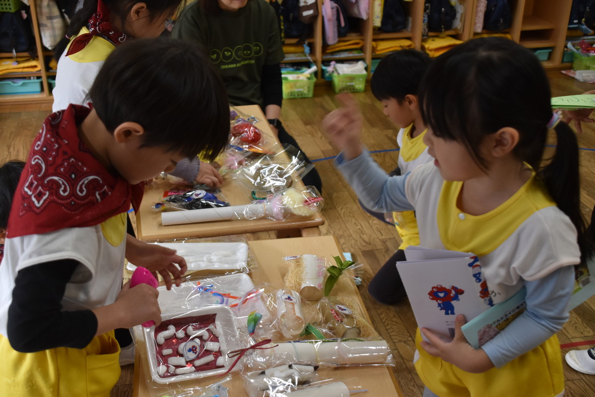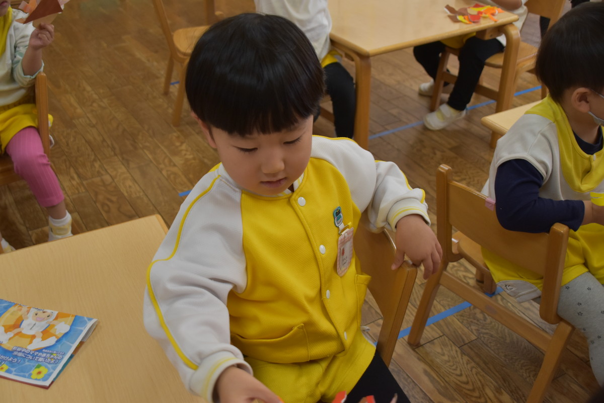 幼稚園での製作活動では、かわいいミノムシ作りをしていた年少さんでした。秋のあたたかな日差しにぶら下がったミノムシさんたち。