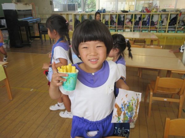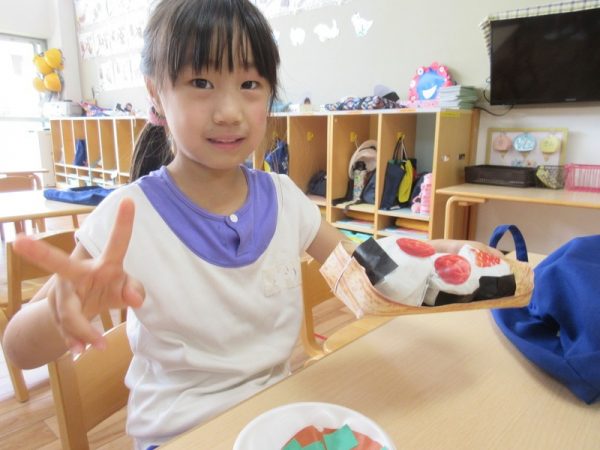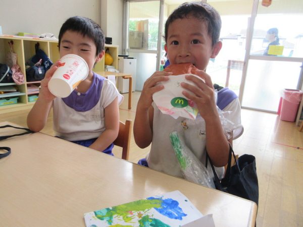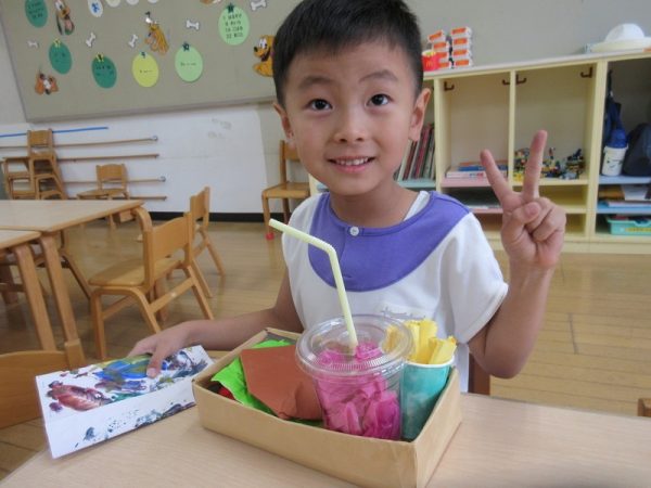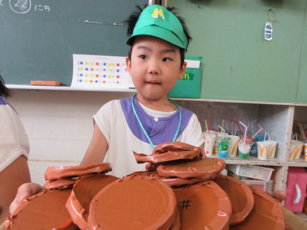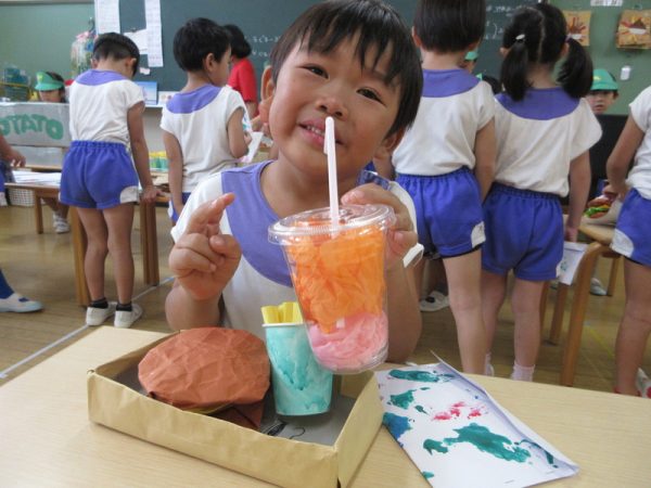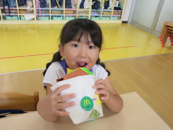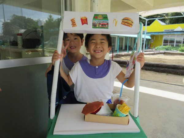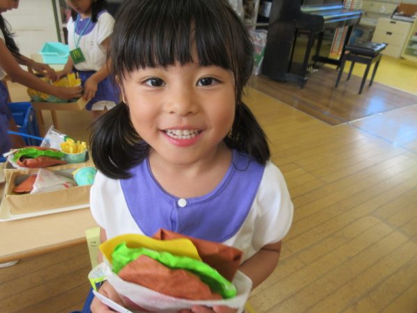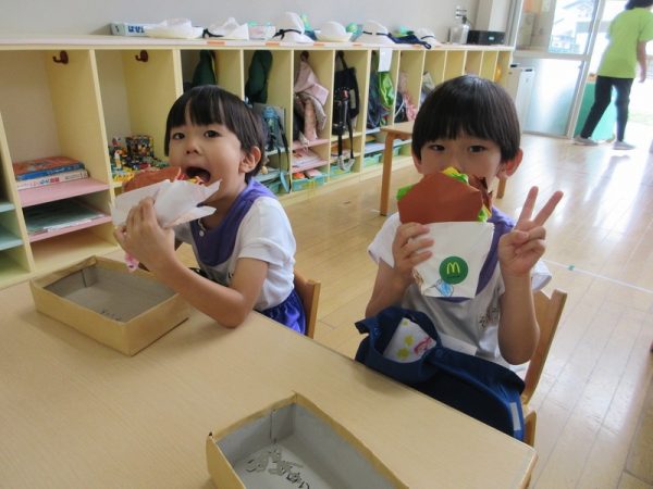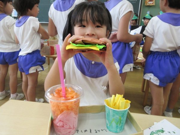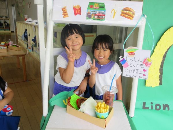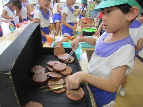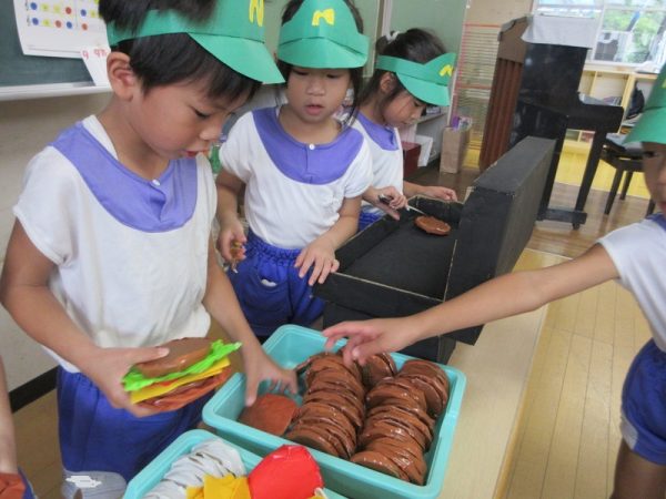 らいおんぐみは「ハンバーガー屋さん」ハンバーガーを作る人、ポテトを作る人と分担し、力を合わせてお客さんに出していましたよ!