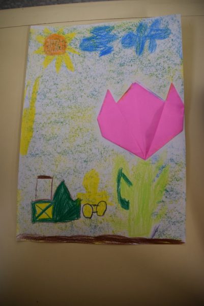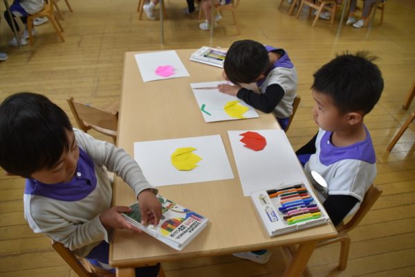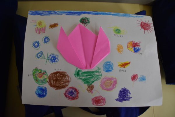 次の日には、折り紙で作ったチューリップから絵を完成させる活動を行いました。