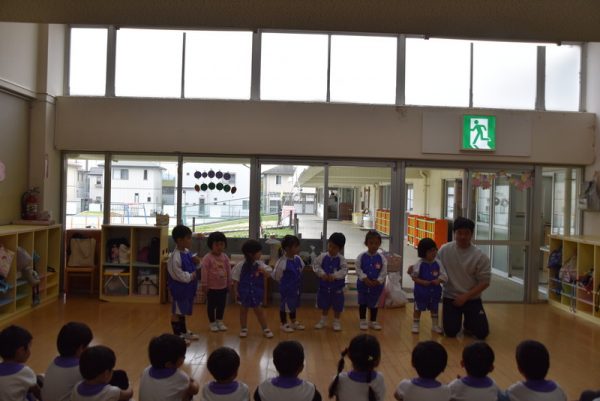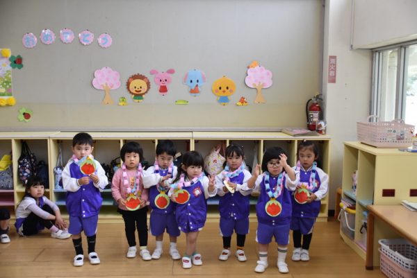 そして、4月13日にはどんぐり組の入級式をしました。どんぐり組に入った年少さんのAコースの子どもたちを紹介し、メダルのプレゼントをしましたよ。