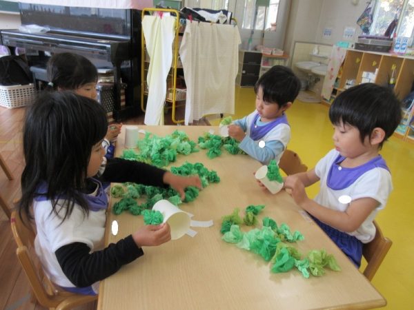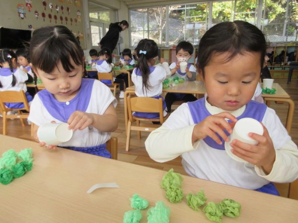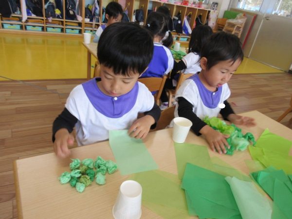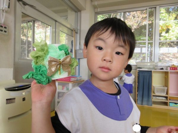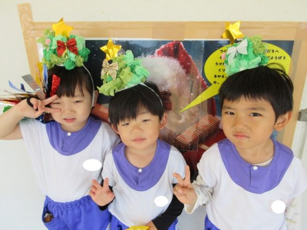 あっという間に師走ですね。12月は、子どもたちにとってワクワクするクリスマス。「お利口さんにしていたら、サンタさんがきてくれるよ。」と、楽しみにしてくれています。そして、あちこちにクリスマスのイルミネーションがあり、大人も心躍る気分にさせてもらっています。年少さんは、クリスマスツリーの冠を作りました。頭にのせると、さらにかわいくなる魔法のクリスマスツリーです。