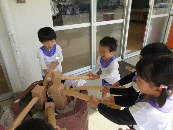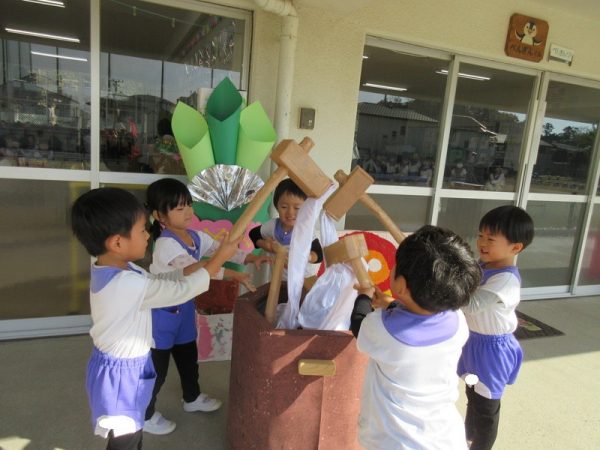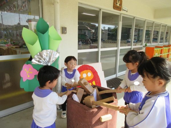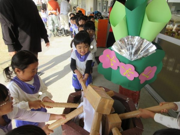 本当のもちつきを見学した後、このもちつきの遊びがさらに楽しくなった子どもたち。日本の伝統的な行事に触れ、興味・関心を高めることができましたね。