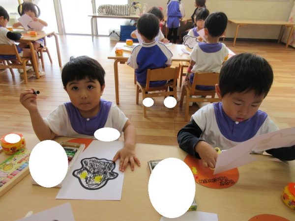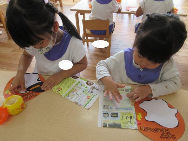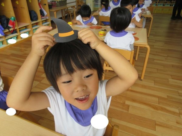 「ハロウィンって何?」から始まった年少さんでしたが、絵本を読んだり、話をしたりしていくうちに、ハロウィンをとても楽しみにしていましたよ。