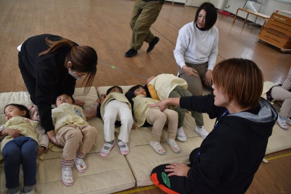 その後は、マットでの前回りに挑戦しました。「マット」「前転」の名前も教えてもらい、手をしっかりとつく練習をしました。